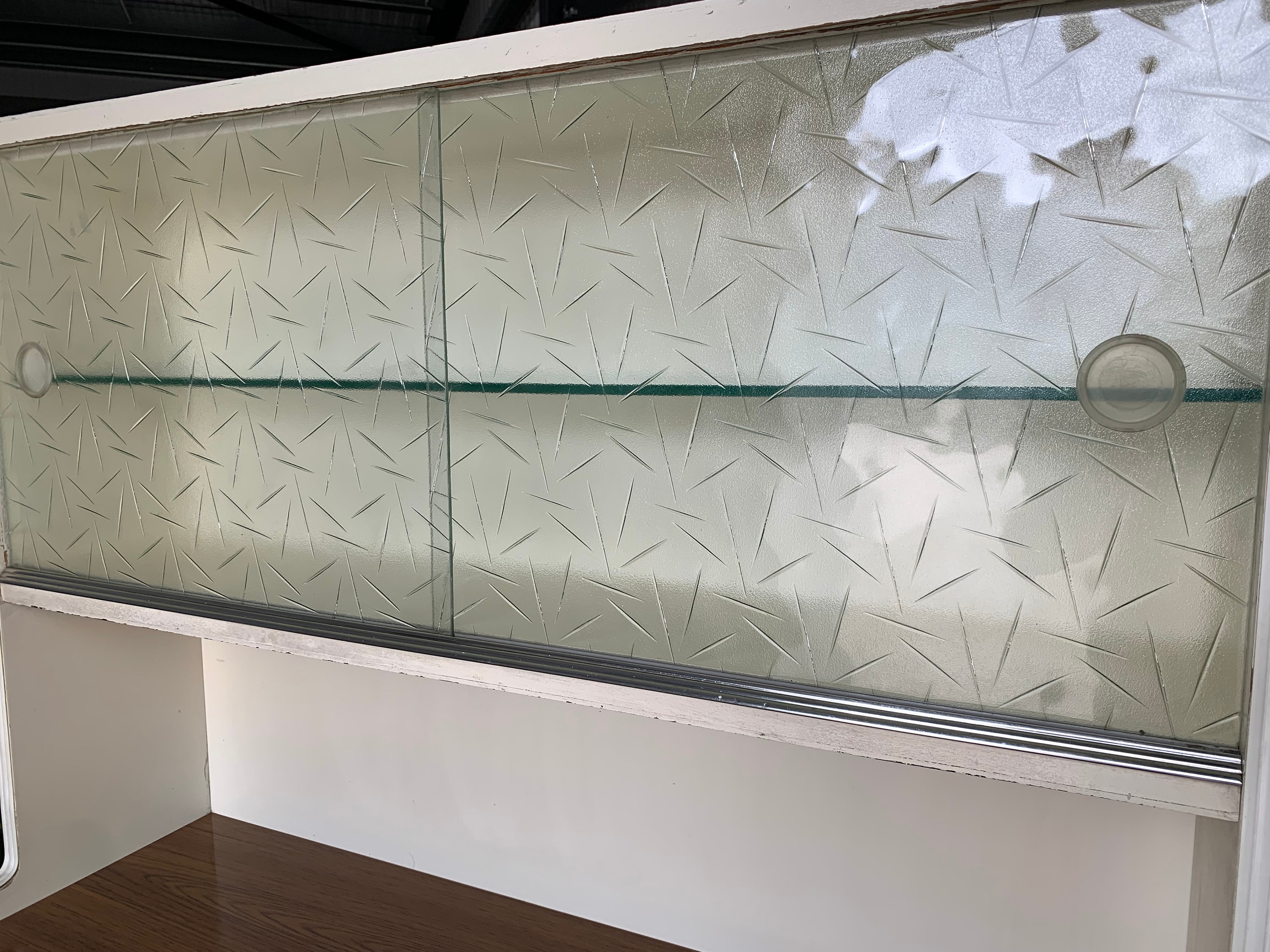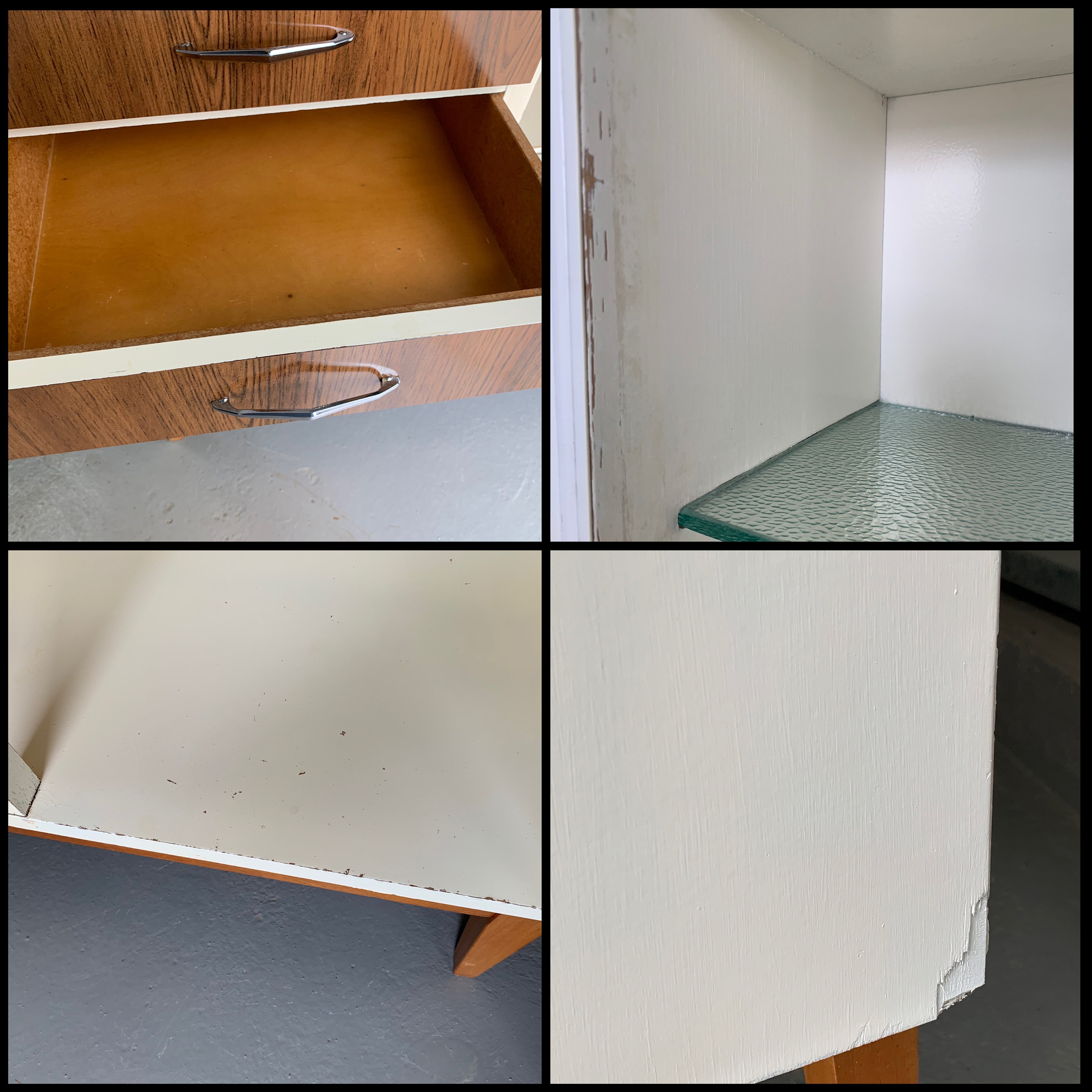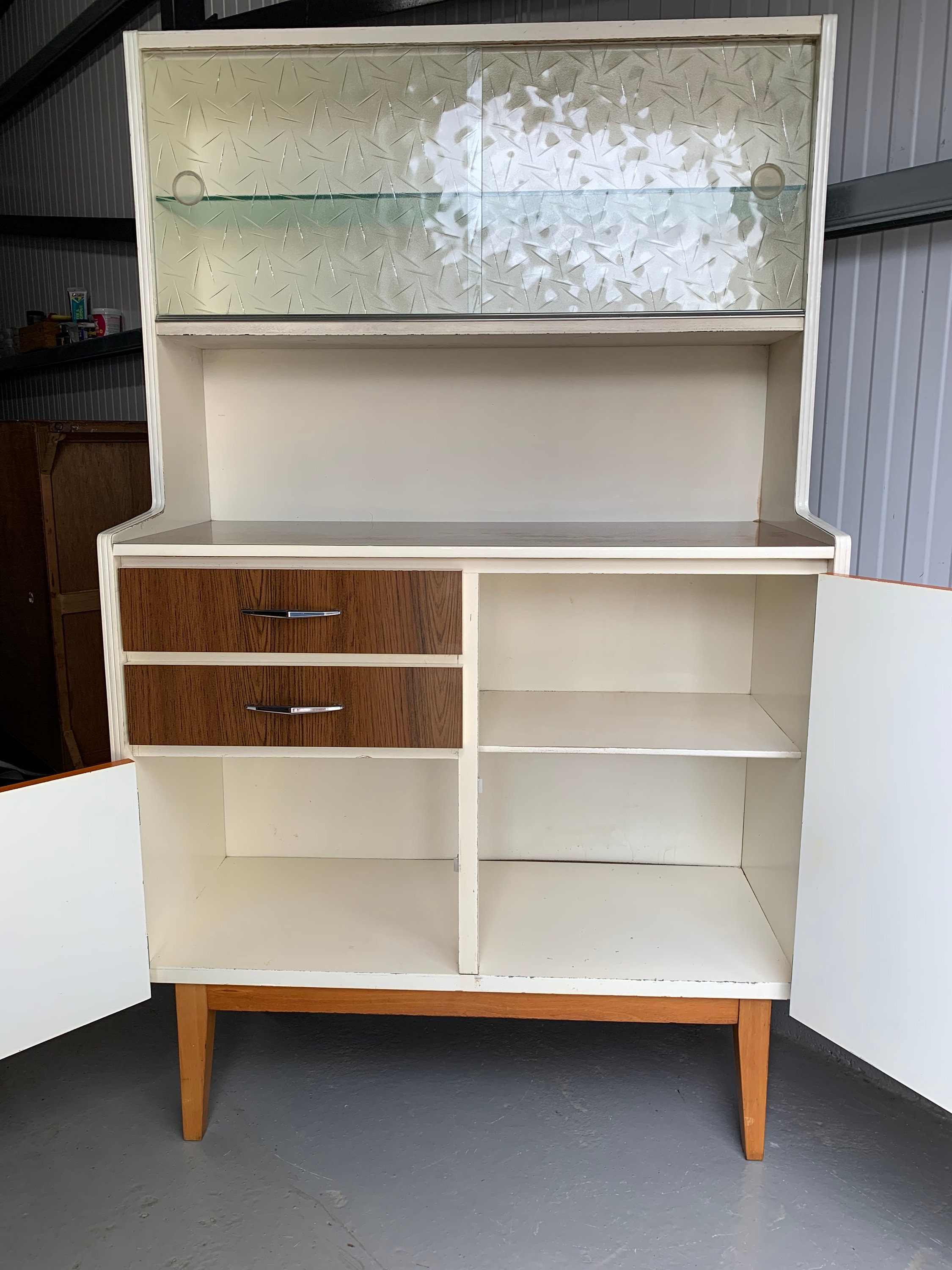 The unit has a top double height shelf cabinet with a textured fitted glass shelf and two glass sliding doors finished of with a metal trim. All glass is intact with no chips or cracks and the doors slide as they should. The glass doors have an attractive 60s style pattern on them and are slightly frosted;the handles are firmly fixed in place.