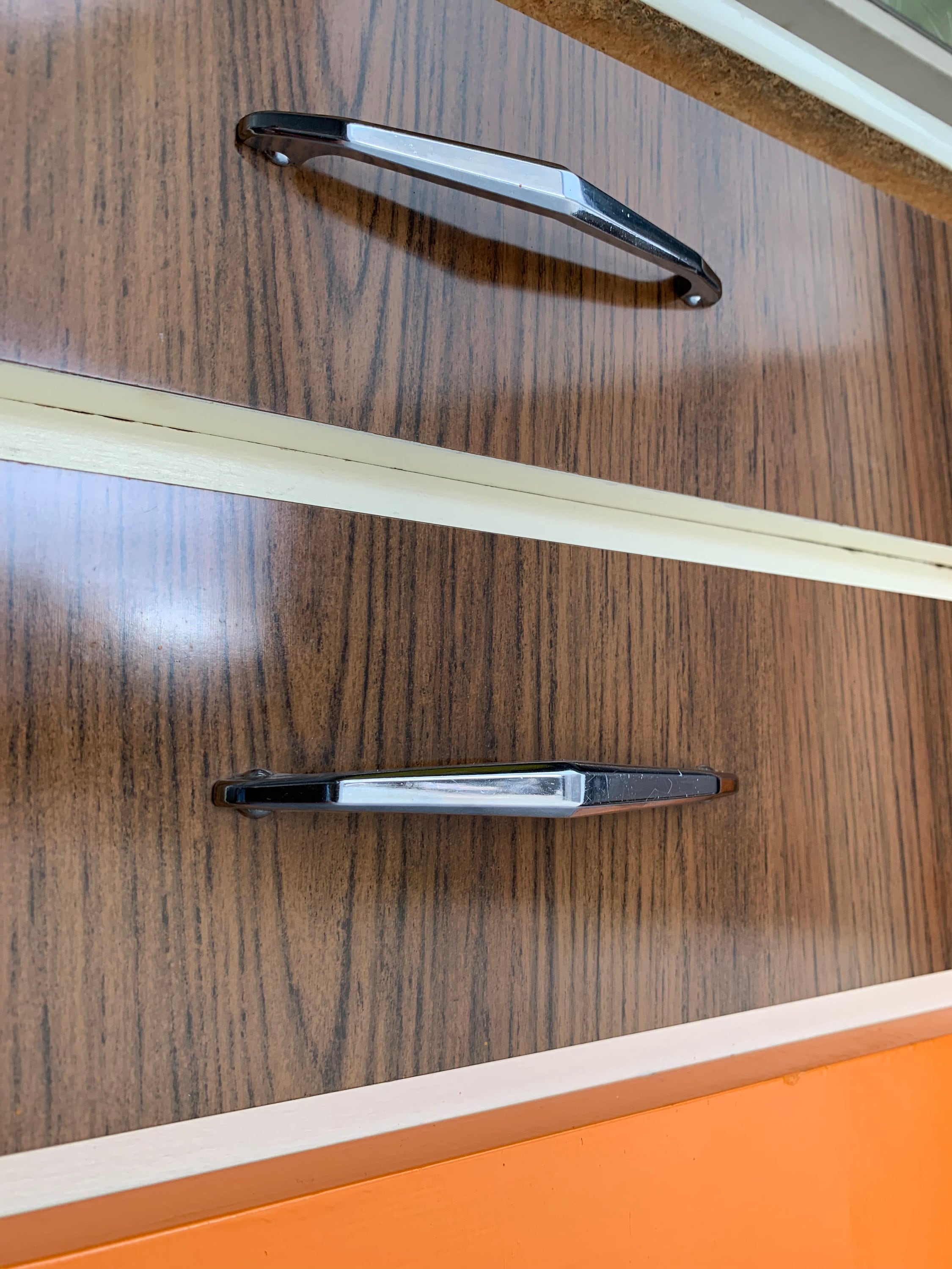 We have done our normal extensive cleaning job on this unit but felt a few areas could do with a little refreshing. So, as well as a repaint to the orange doors (the paint match colour name was Bengal Tiger from Valspa ), we refreshed the sides of the unit in a similar colour. There are also two chrome hooks for tea towels on the left hand side.