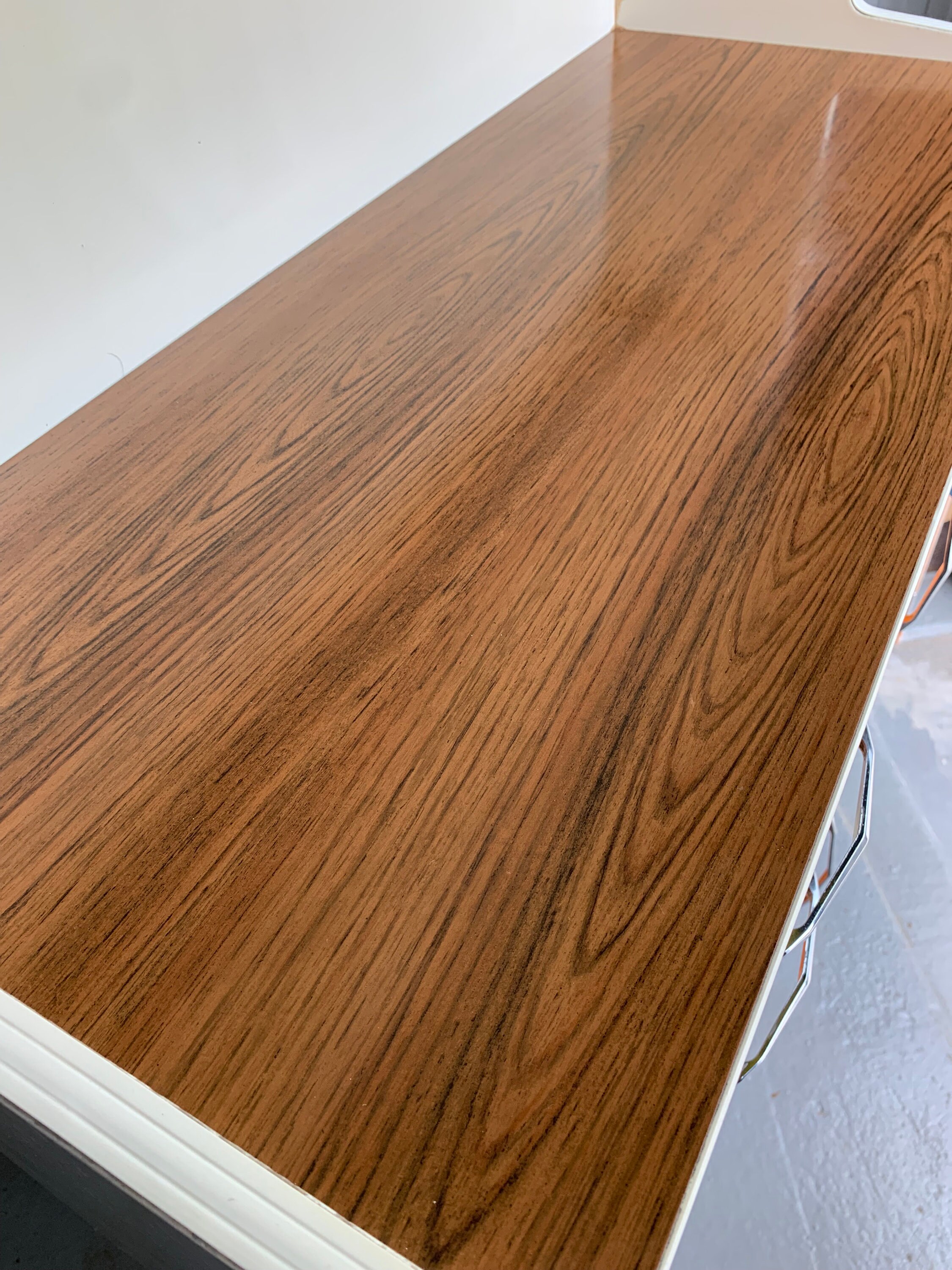Below the cabinet is a surface area to prep, this is in a brown teak grain effect formica. This surface in in remarkable condition considering its age - there is no lifting or chips and shows only light surface scratches.