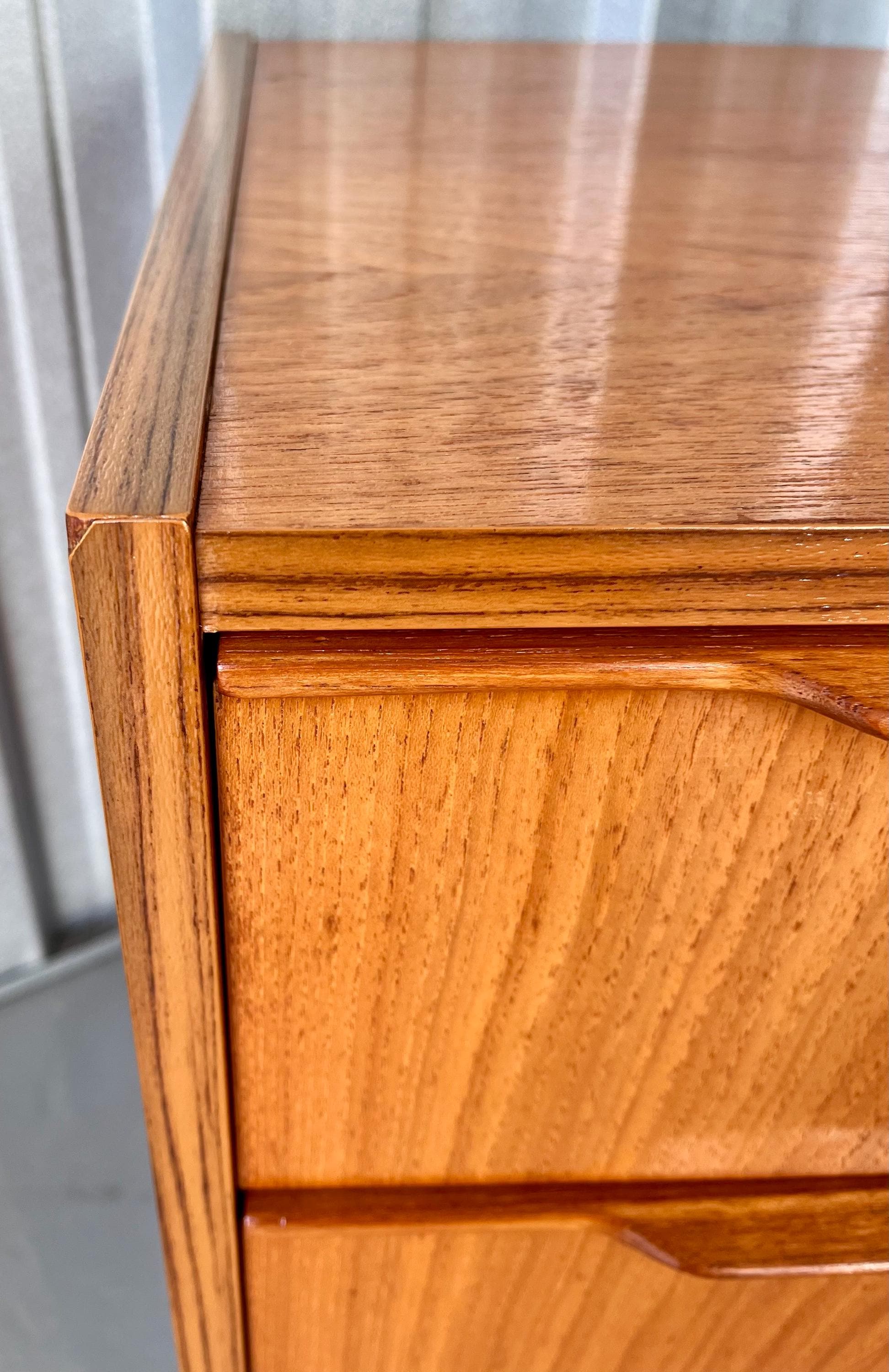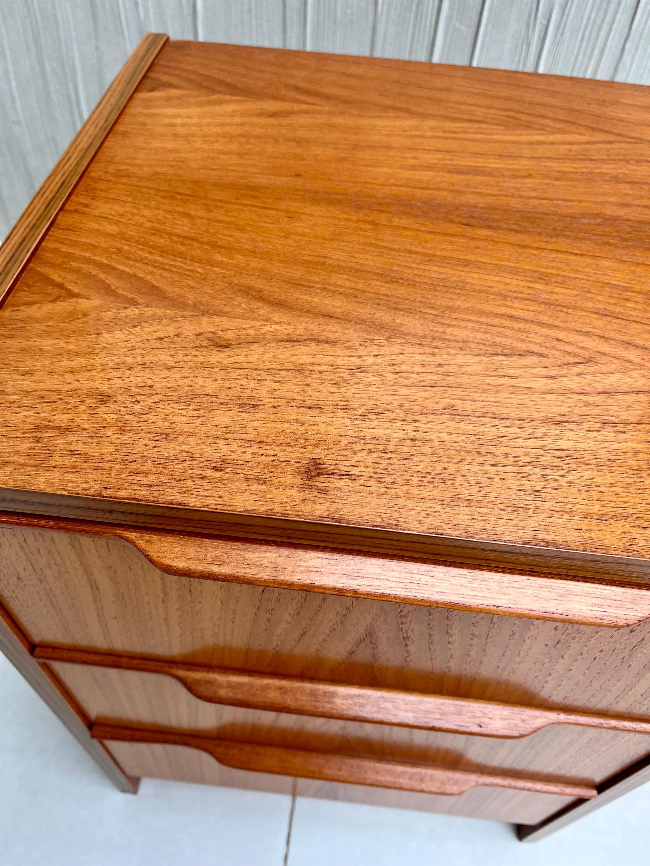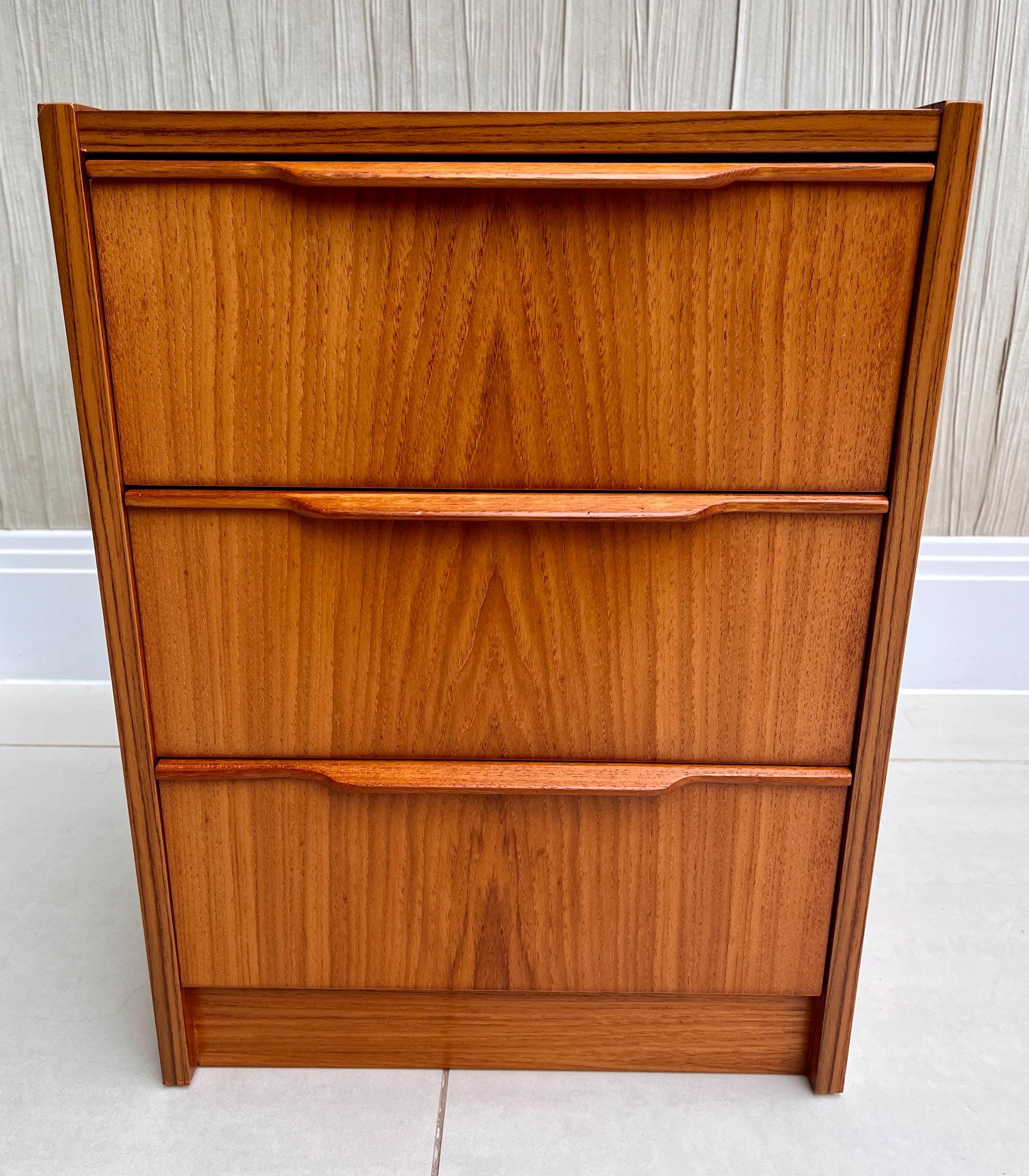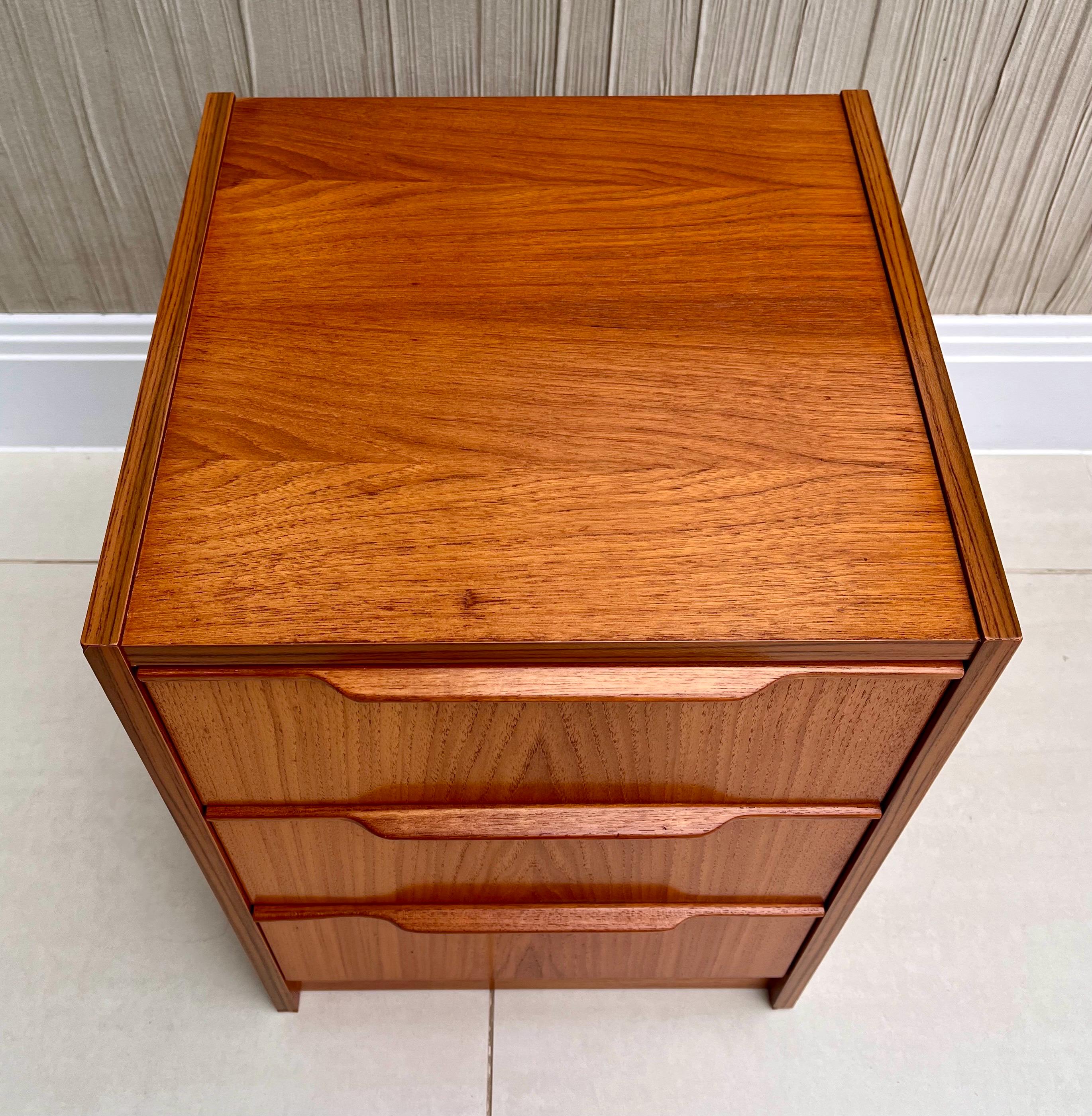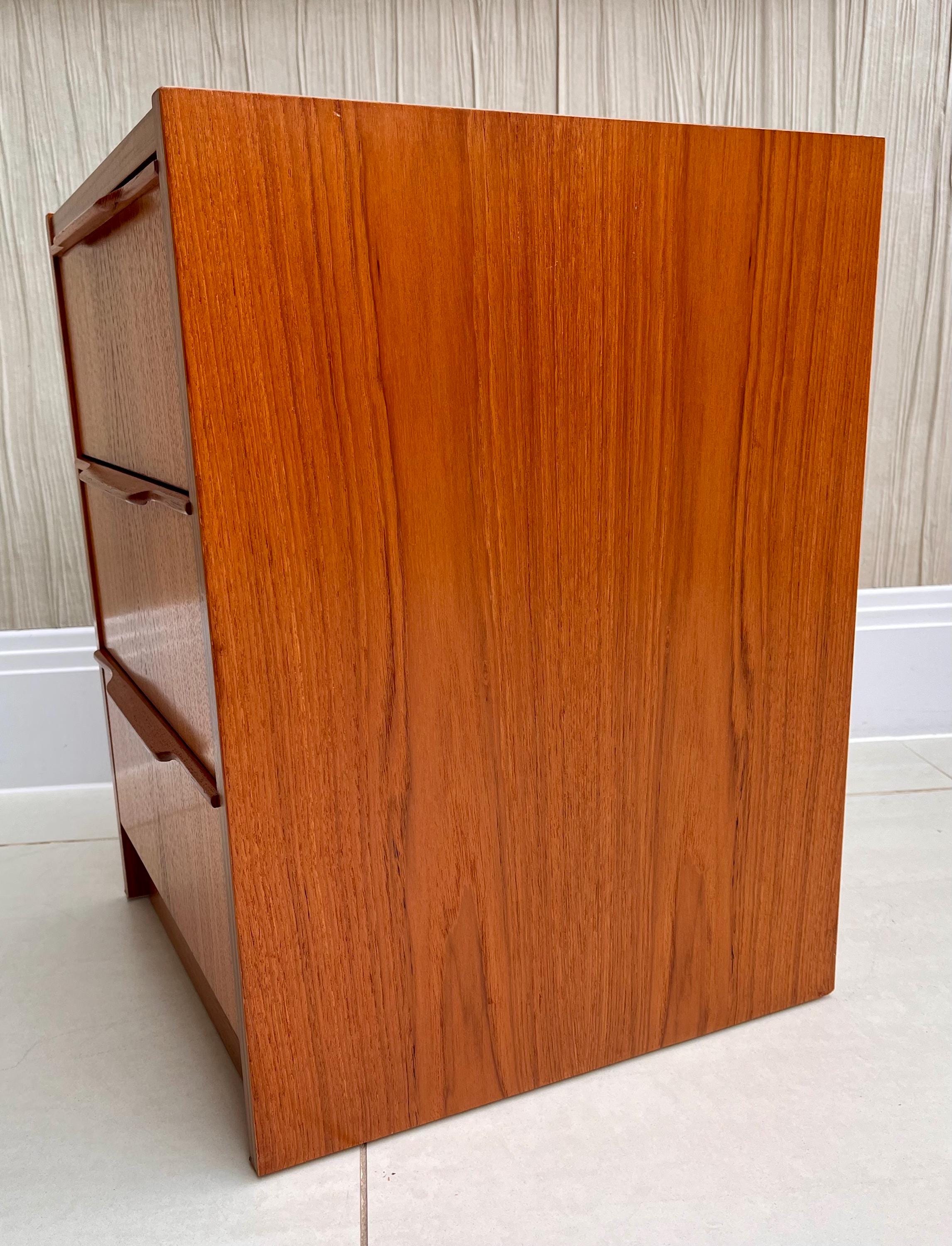 A beautifully crafted mid-century teak chest of drawers by Steens of Denmark, showcasing the refined simplicity and warmth that Scandinavian design is celebrated for. Compact yet practical, it features three smooth-gliding drawers with sculpted integrated handles and richly grained teak veneers that bring real depth and character.
