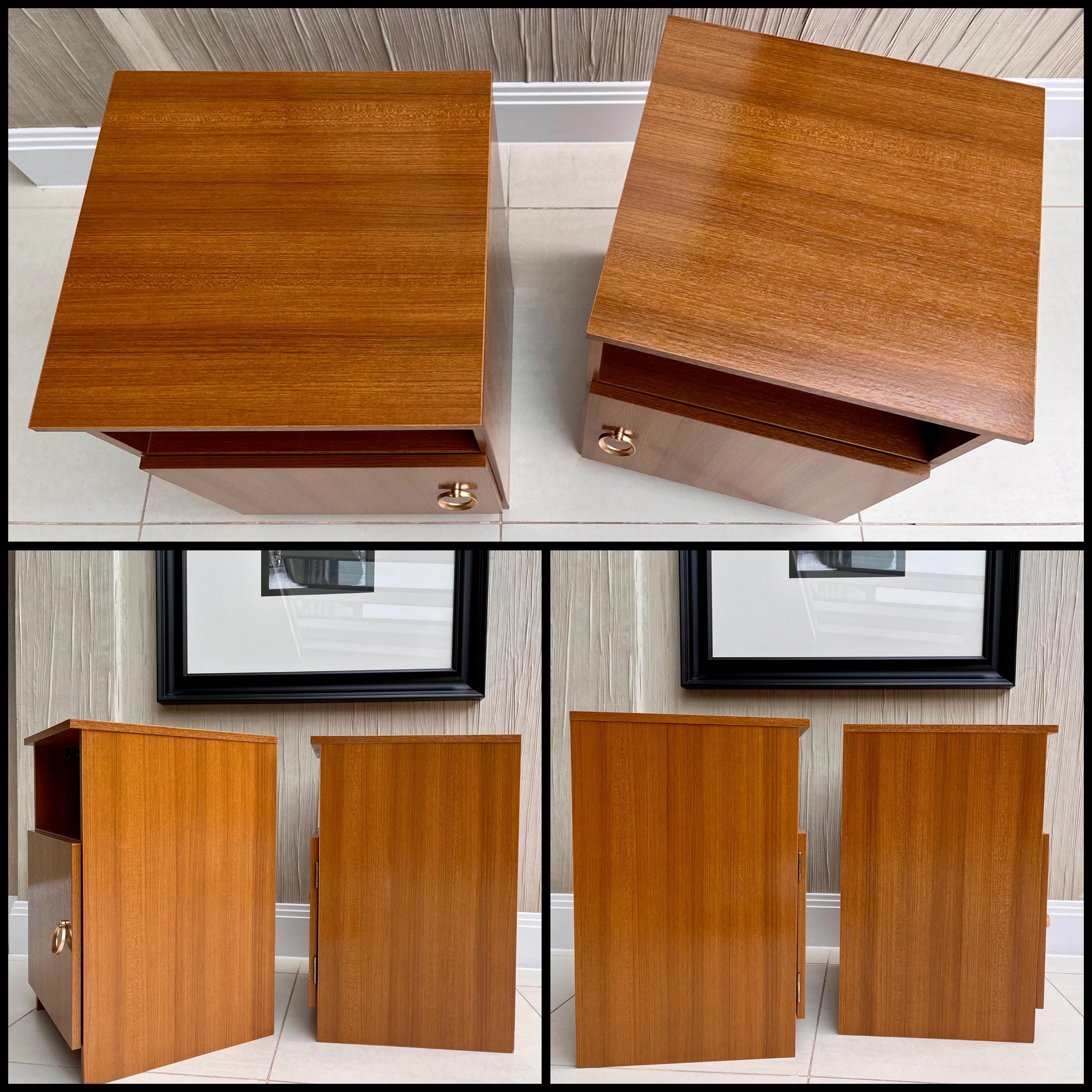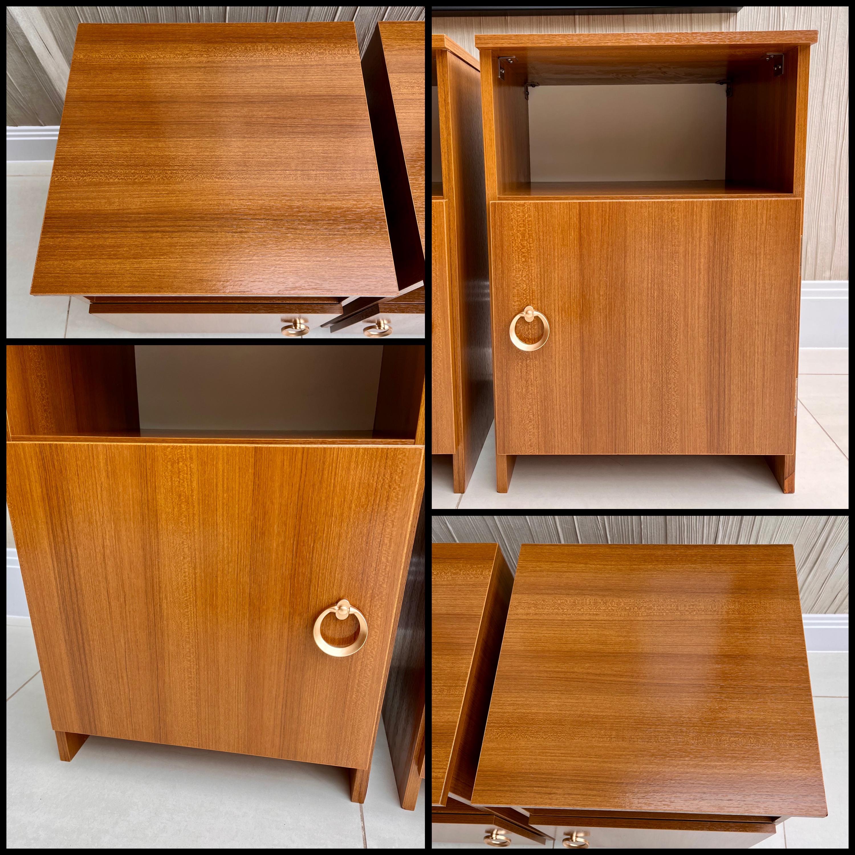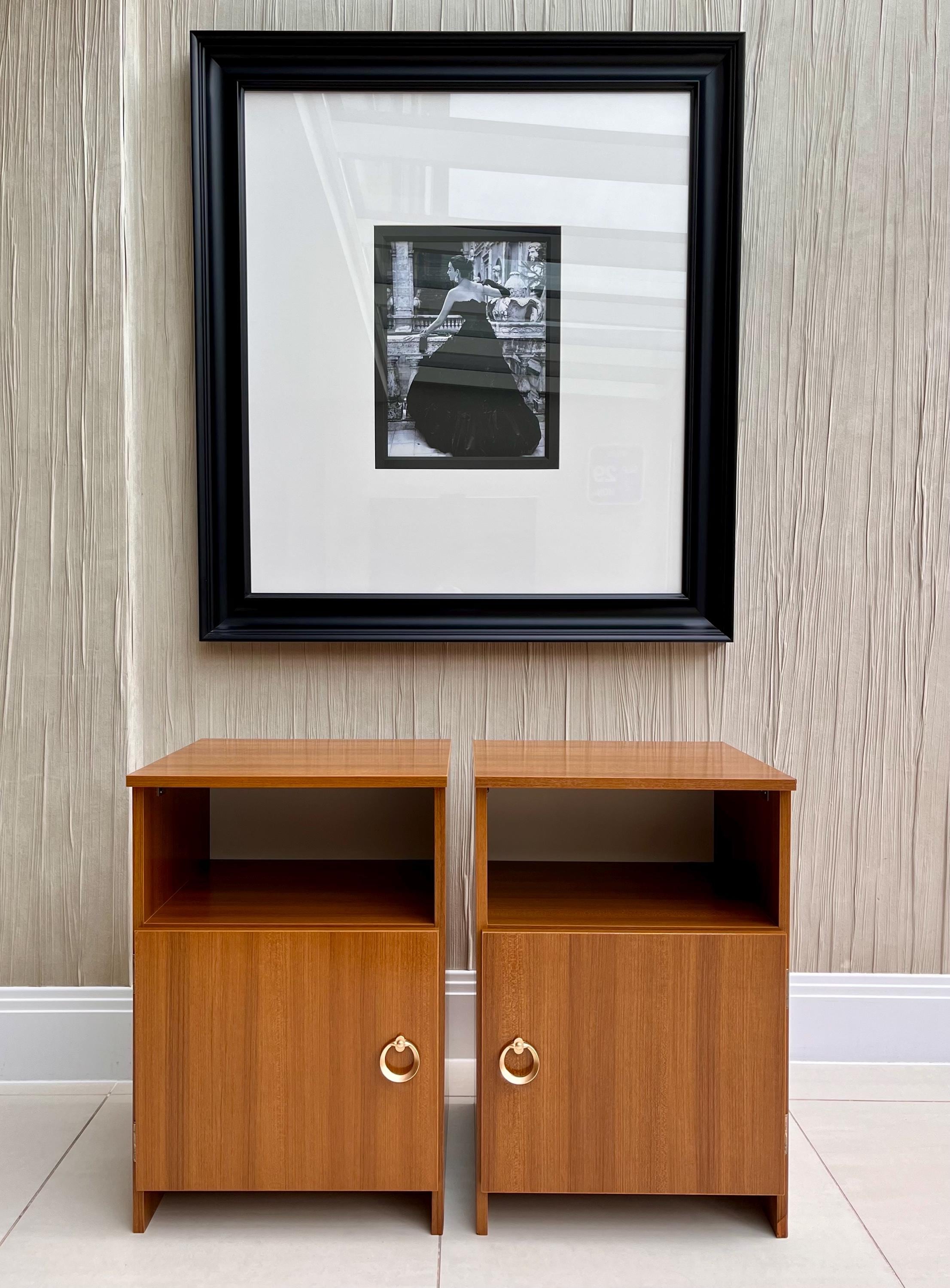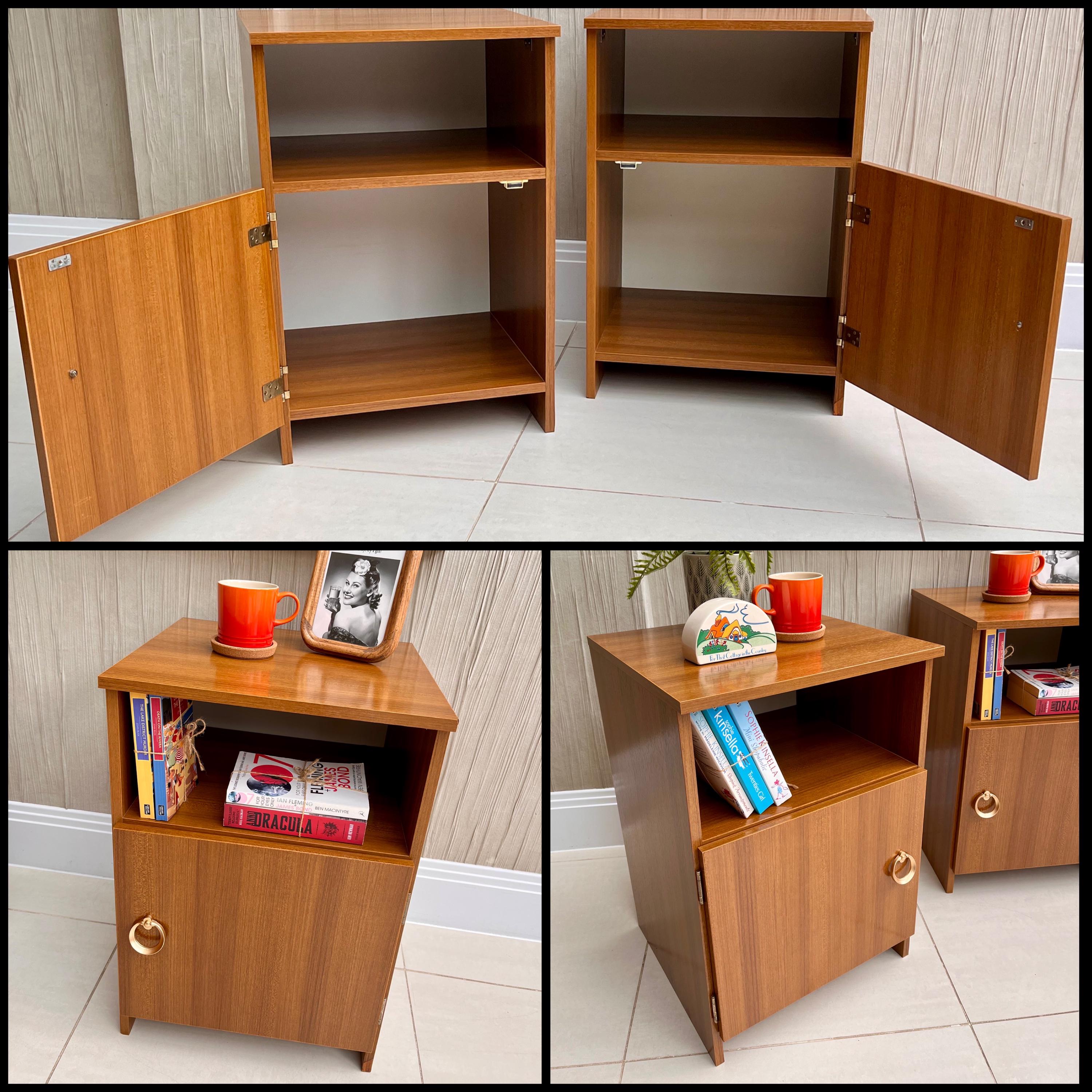 Each cabinet is finished in a warm teak-effect veneer with attractive natural grain, complemented by the original brass-tone ring pull handles. The pair is cleverly designed with one left-hand and one right-hand opening, making them ideal as a true set for either side of the bed.