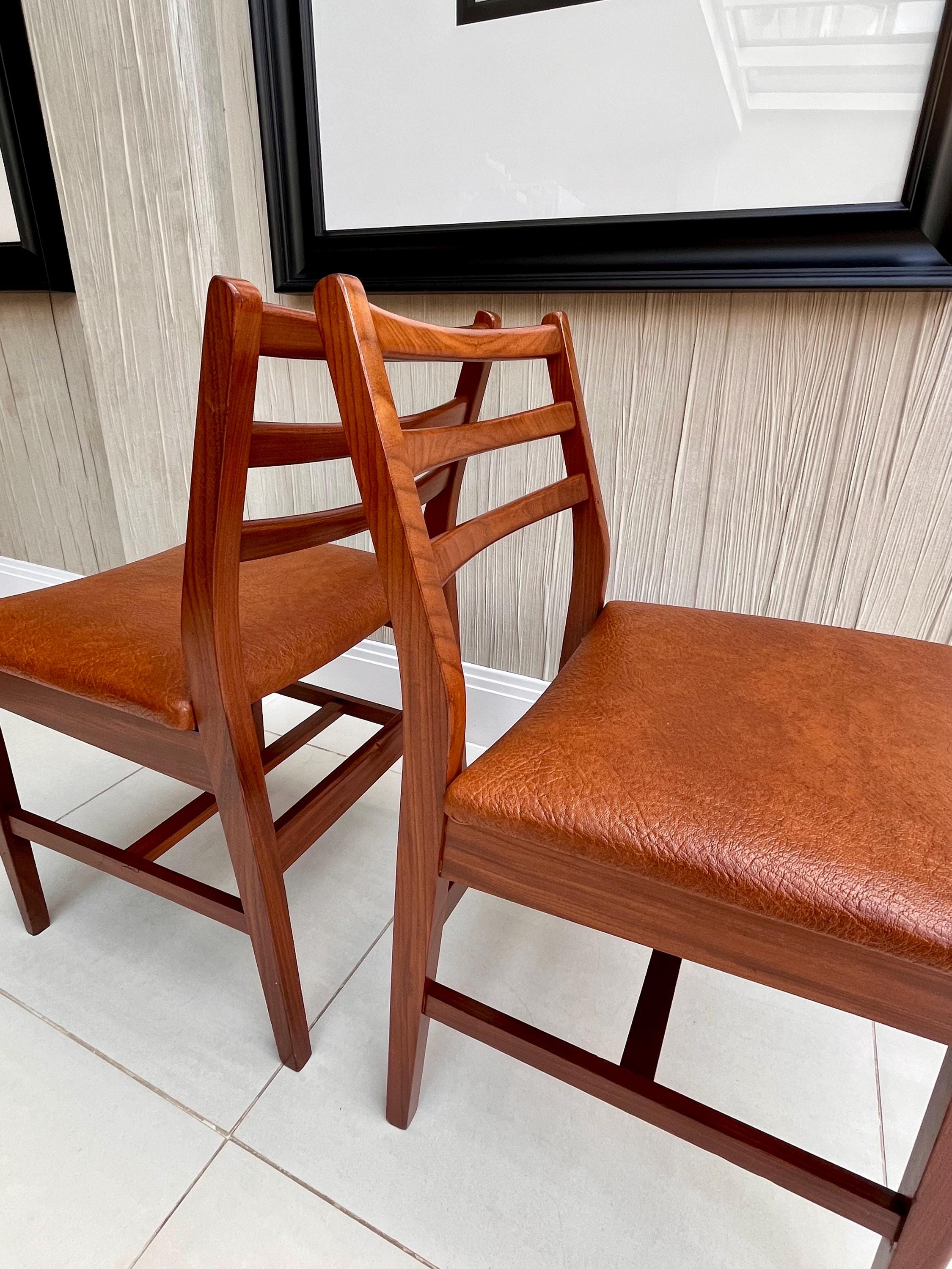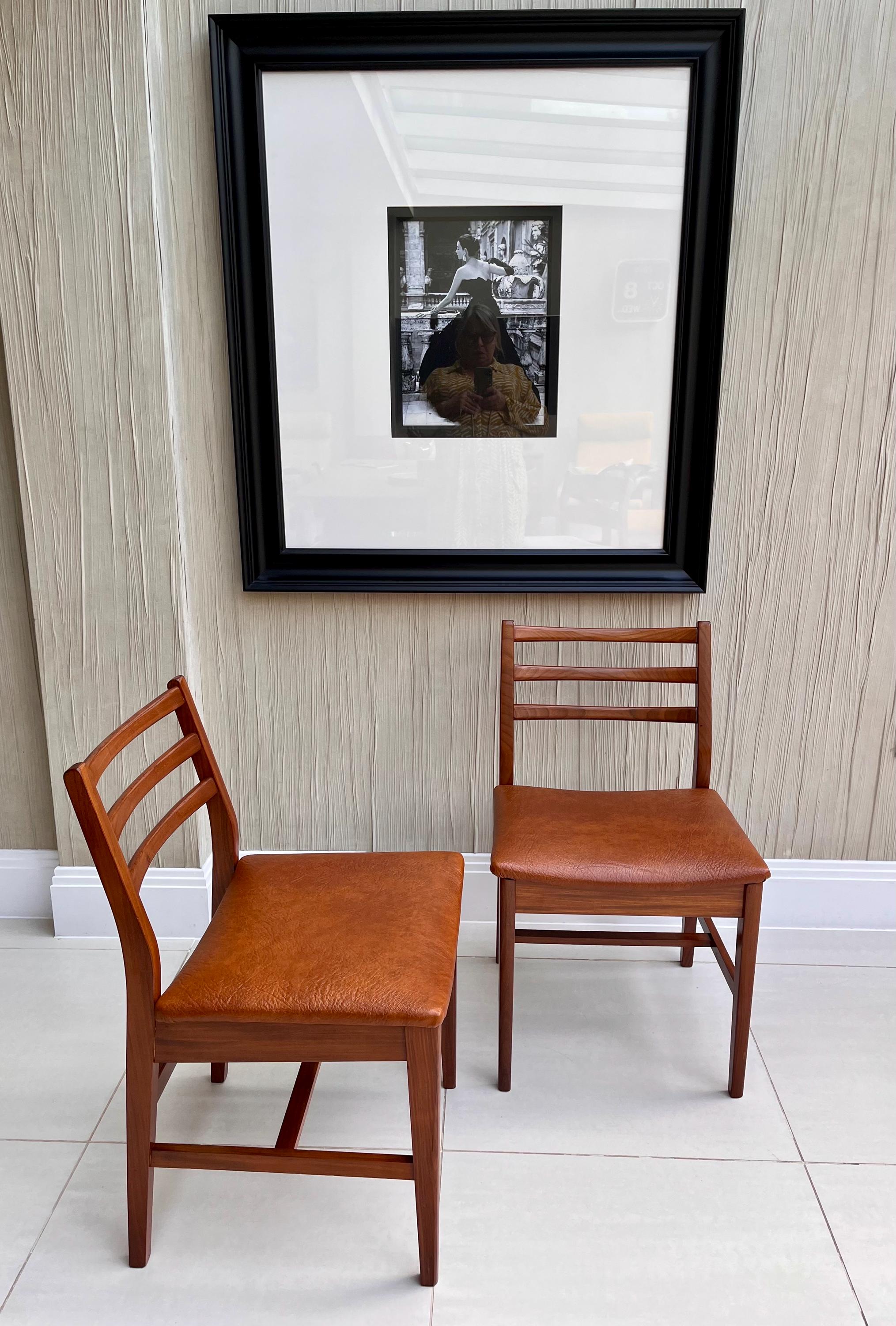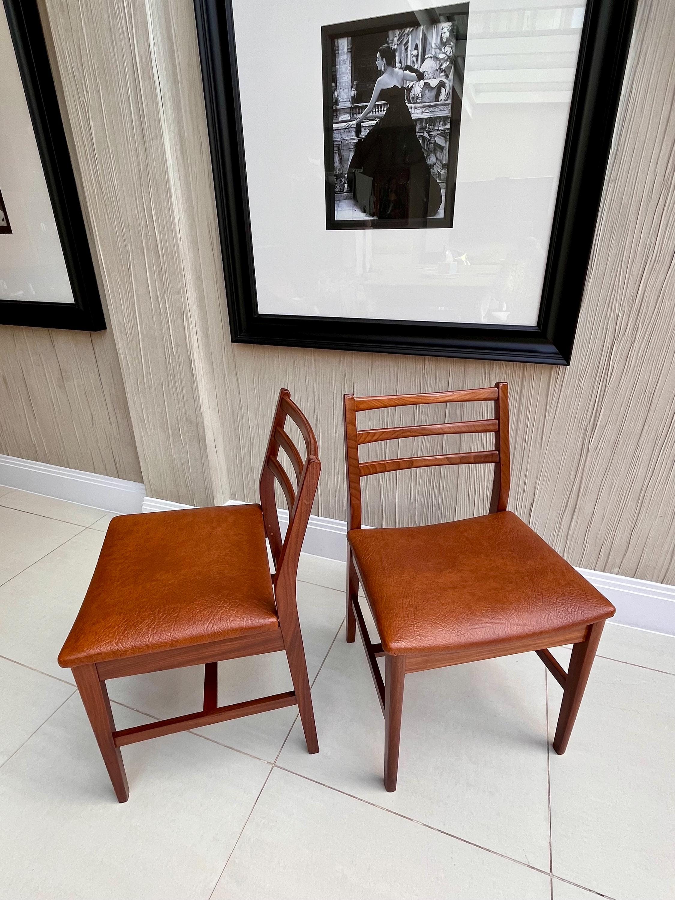 An elegant pair of mid-century dining chairs dating from the early 1970s, most likely Danish imports, reflecting the refined, minimal design language of the 1950s–60s when Scandinavian furniture was driving demand across Britain and Europe.