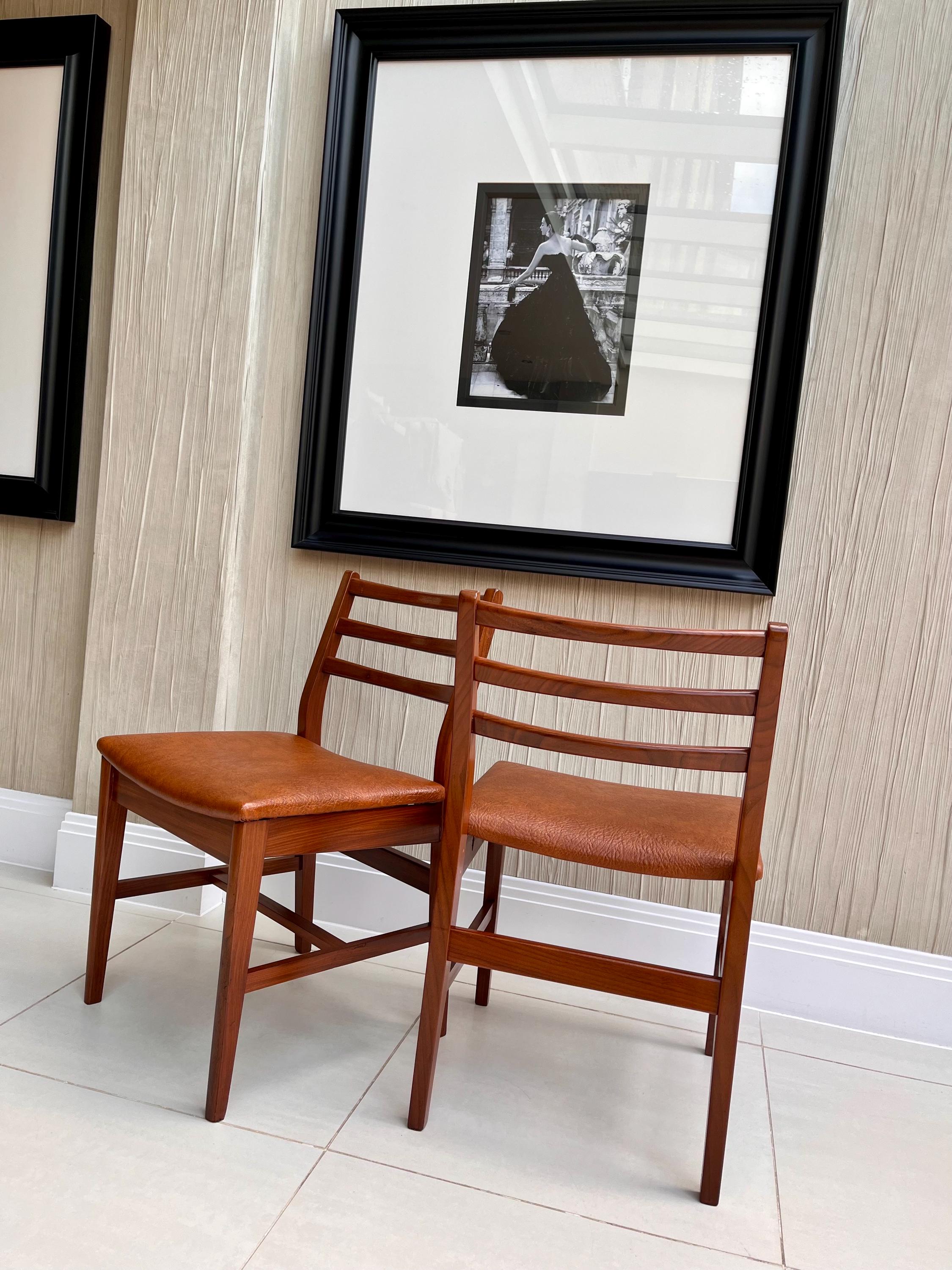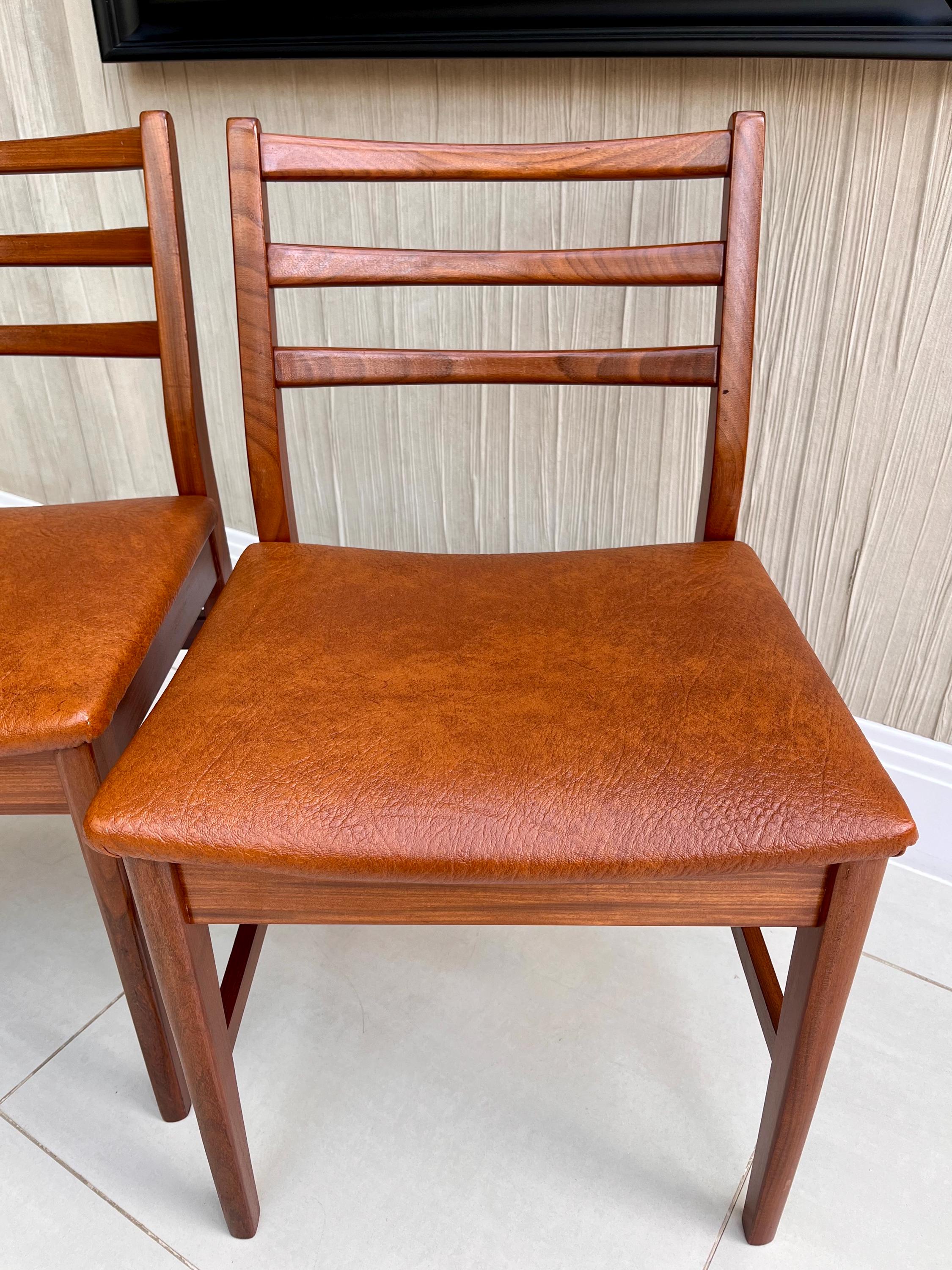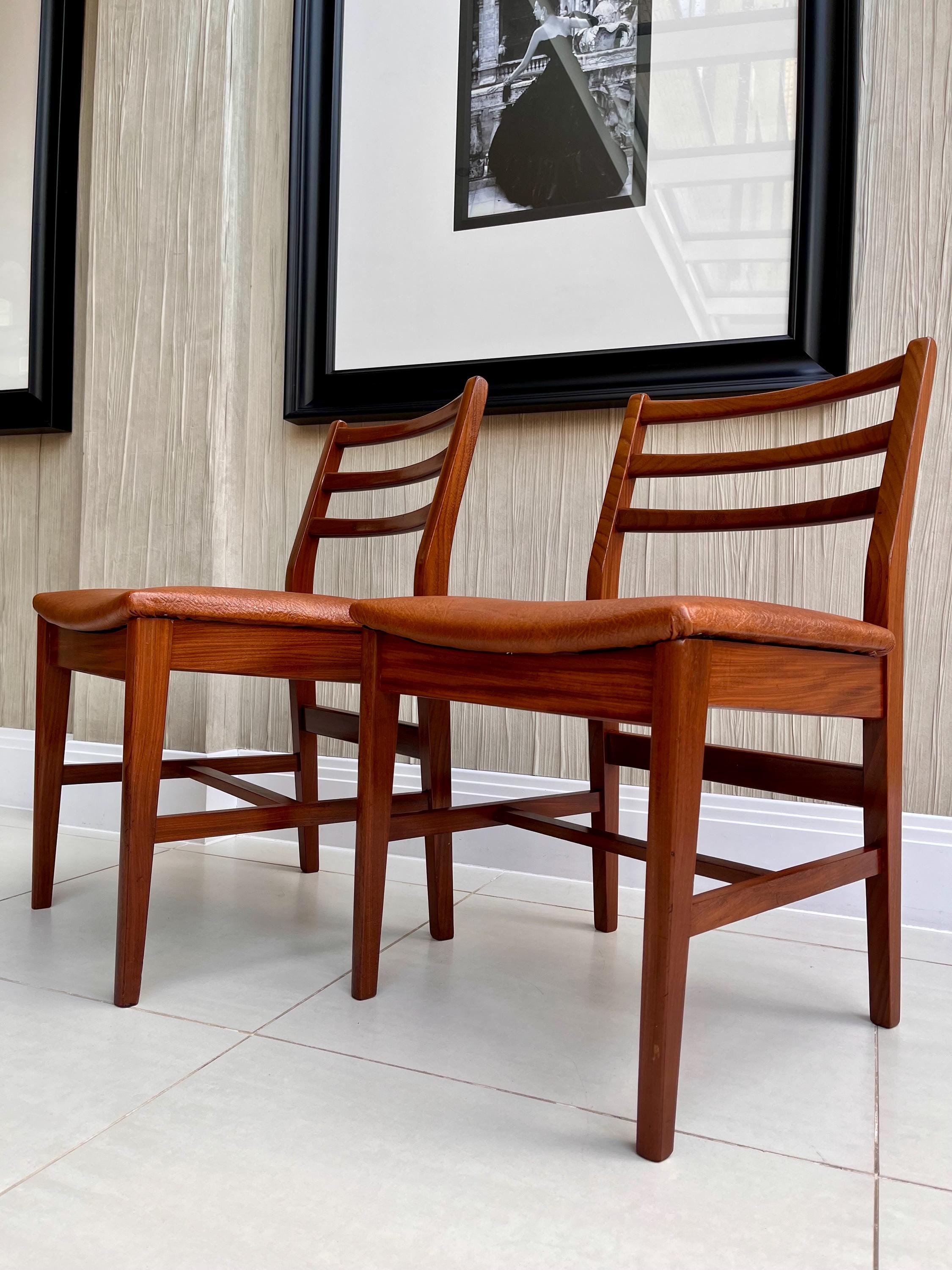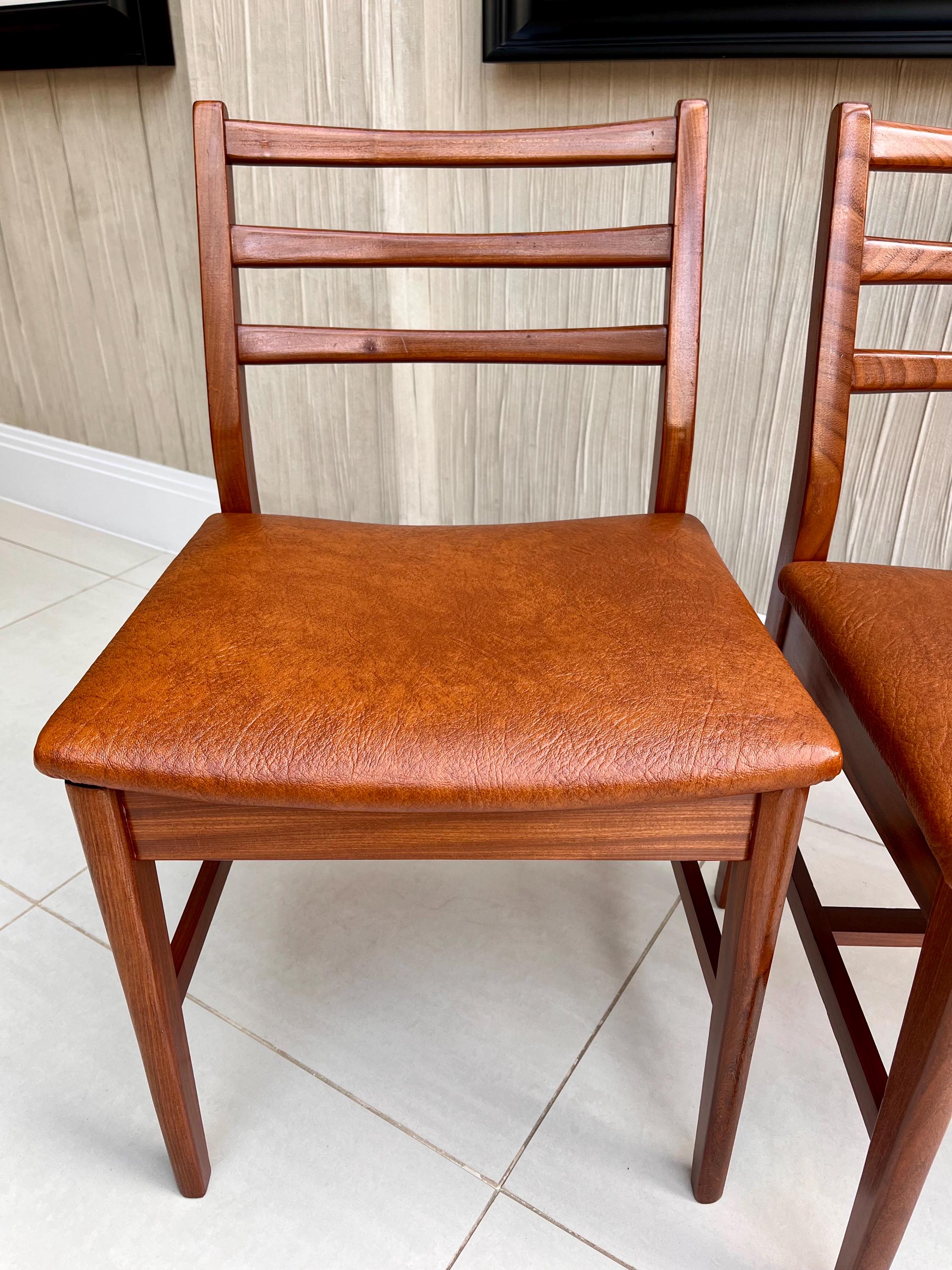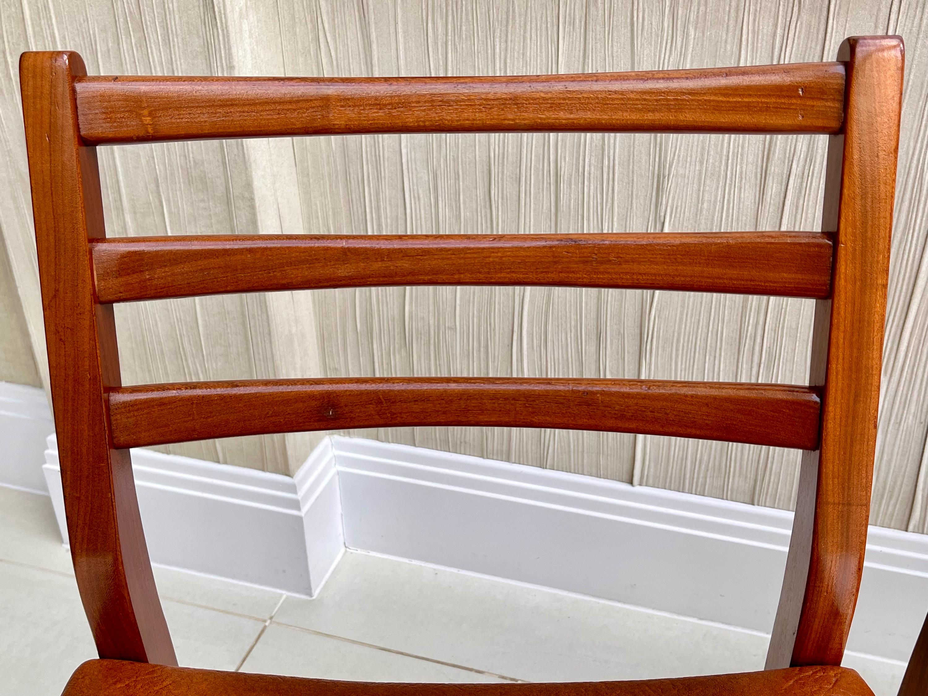 These chairs are characteristically Danish, featuring smooth, crisp curves, elegant ladder-back detailing and clean joinery. Crafted from what is most likely solid afrormosia (African teak), the frames display a beautiful grain pattern and warm tones typical of quality Scandinavian production of the period.