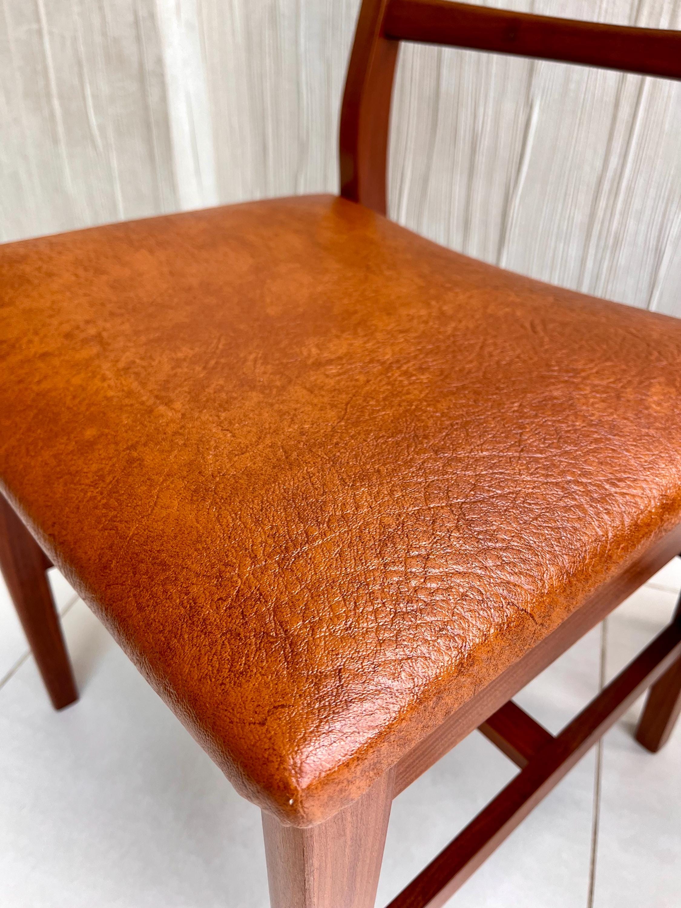 The generous seat pads appear to have been reupholstered at some point in a textured tan leatherette, which is in good vintage condition and complements the teak beautifully.
