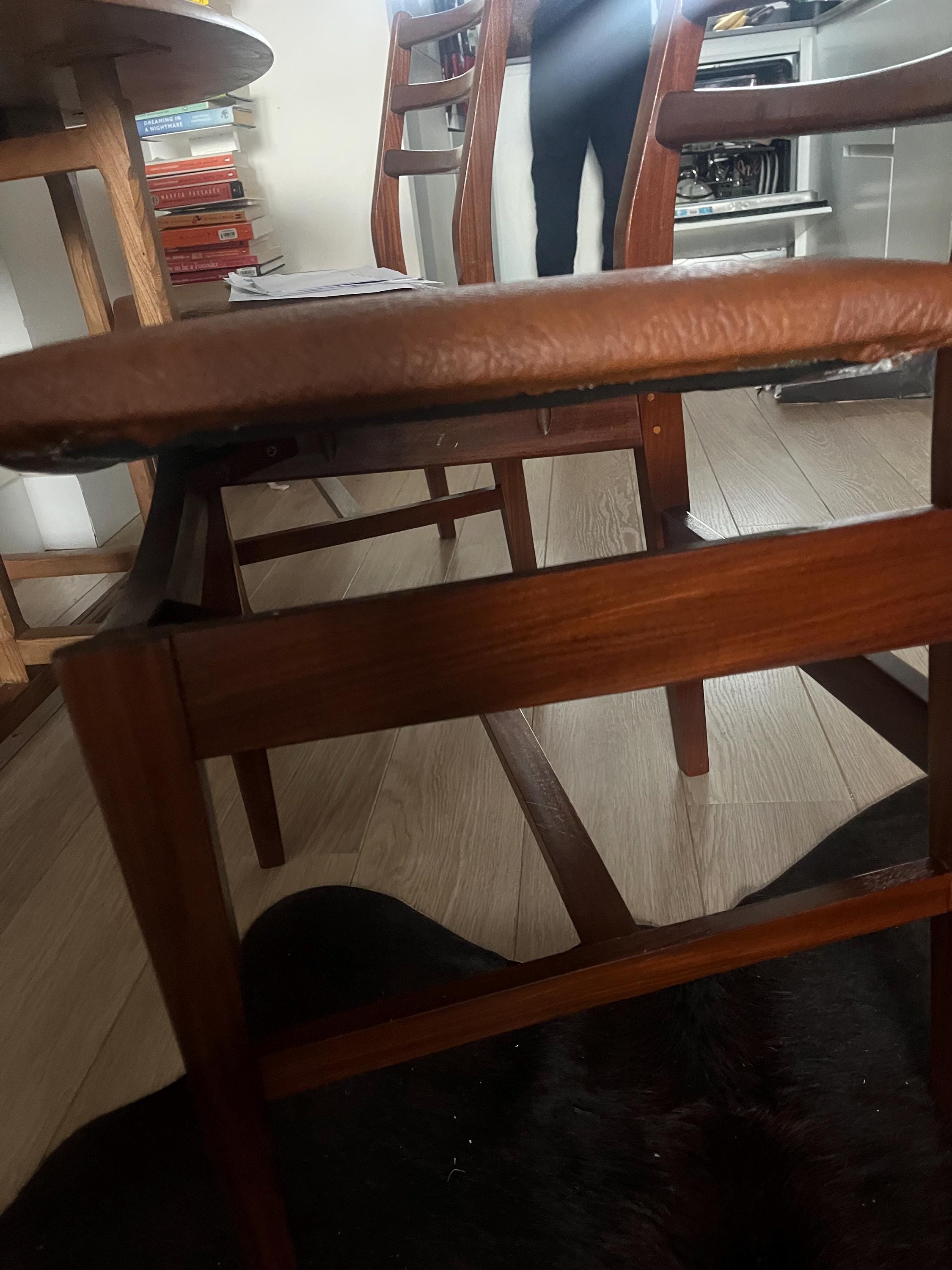 The three-slat ladder backs are gently sculpted and the legs are light and square-sectioned — a distinctive Scandinavian silhouette that feels both timeless and contemporary. There are no maker’s marks, which is common for Danish import pieces sold through UK retailers during this era.