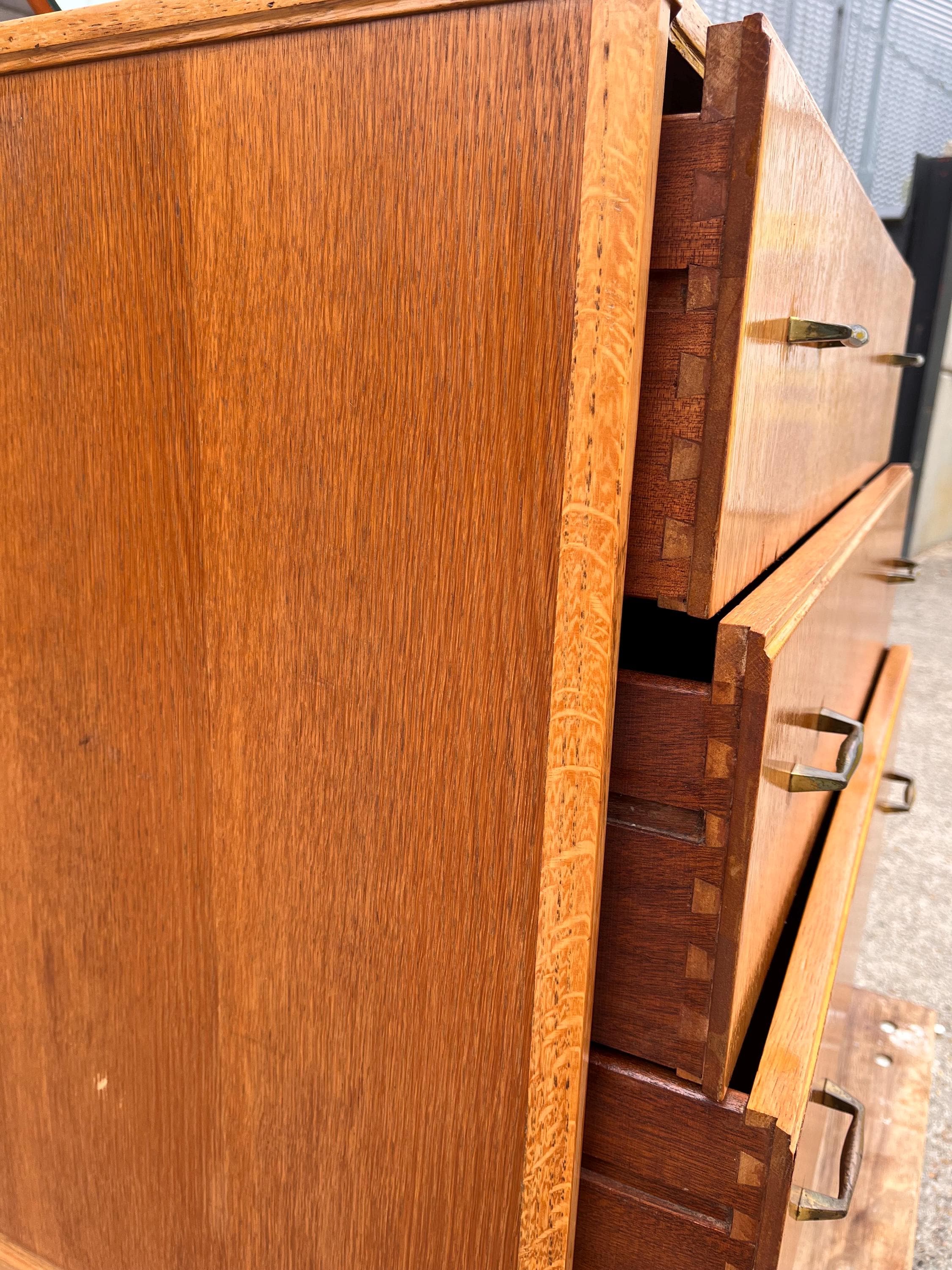 The piece features a solid wooden frame with well-crafted dovetail jointed drawers, wooden runners, and richly toned oak veneered drawer fronts displaying a warm, natural grain. The top drawer retains its original Lebus ‘Link’ label and includes a fitted divider for convenient storage, while the bottom drawer is extra-deep, offering generous capacity for larger items. The drawers run well and remain solid and clean inside.