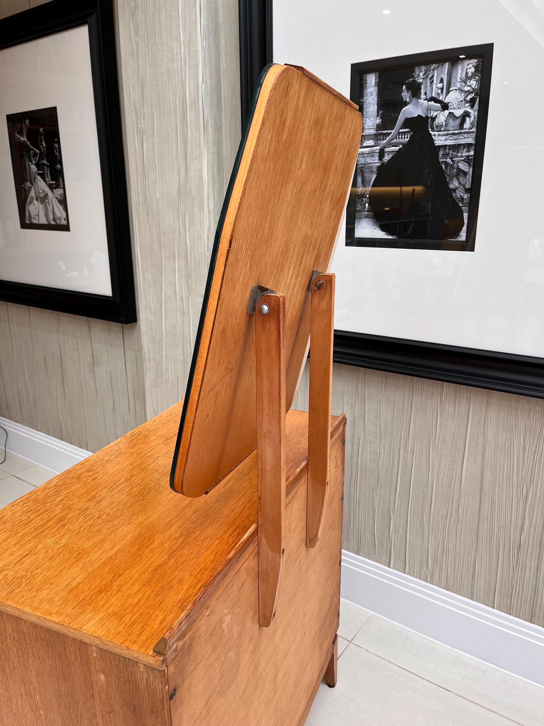 Above sits the original adjustable mirror, designed to tilt for use or be fully removed to create a simple chest of drawers. The mirror glass shows some expected age-related foxing and light surface marks but remains entirely intact and chip-free — a lovely patina that reflects its vintage charm. The mirror frame and fittings are sturdy, and the back retains the original working fixings.