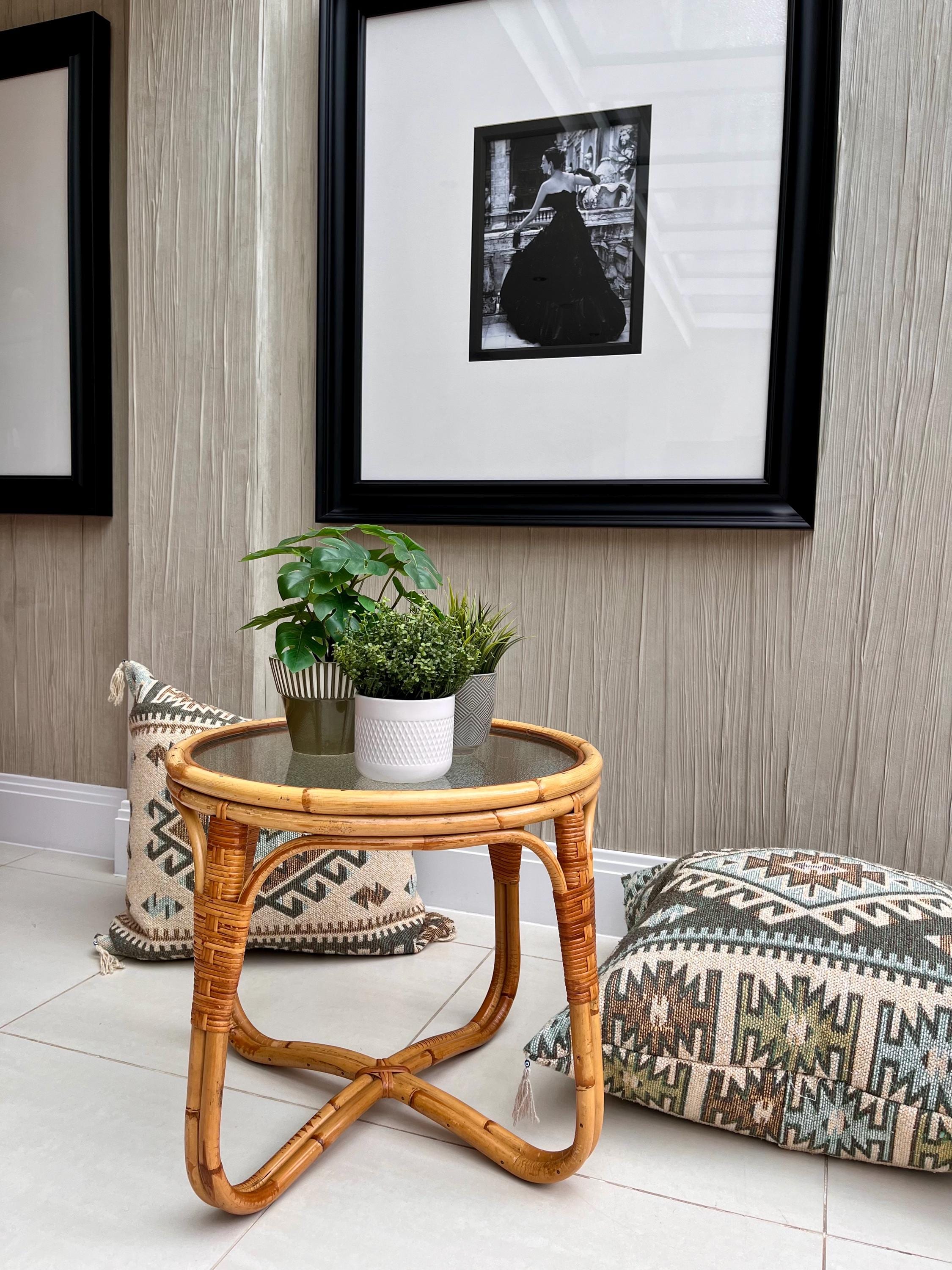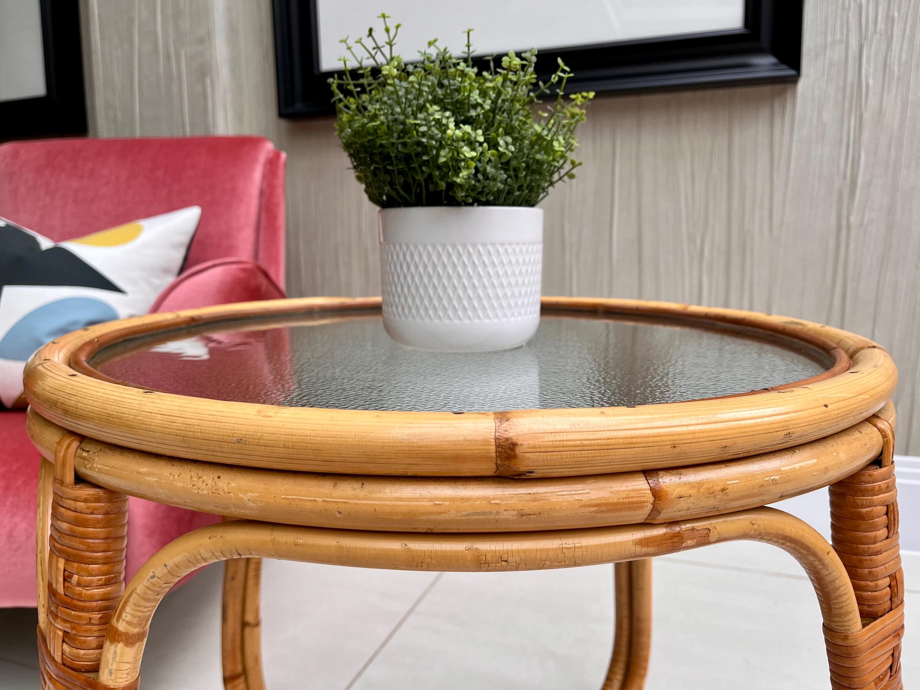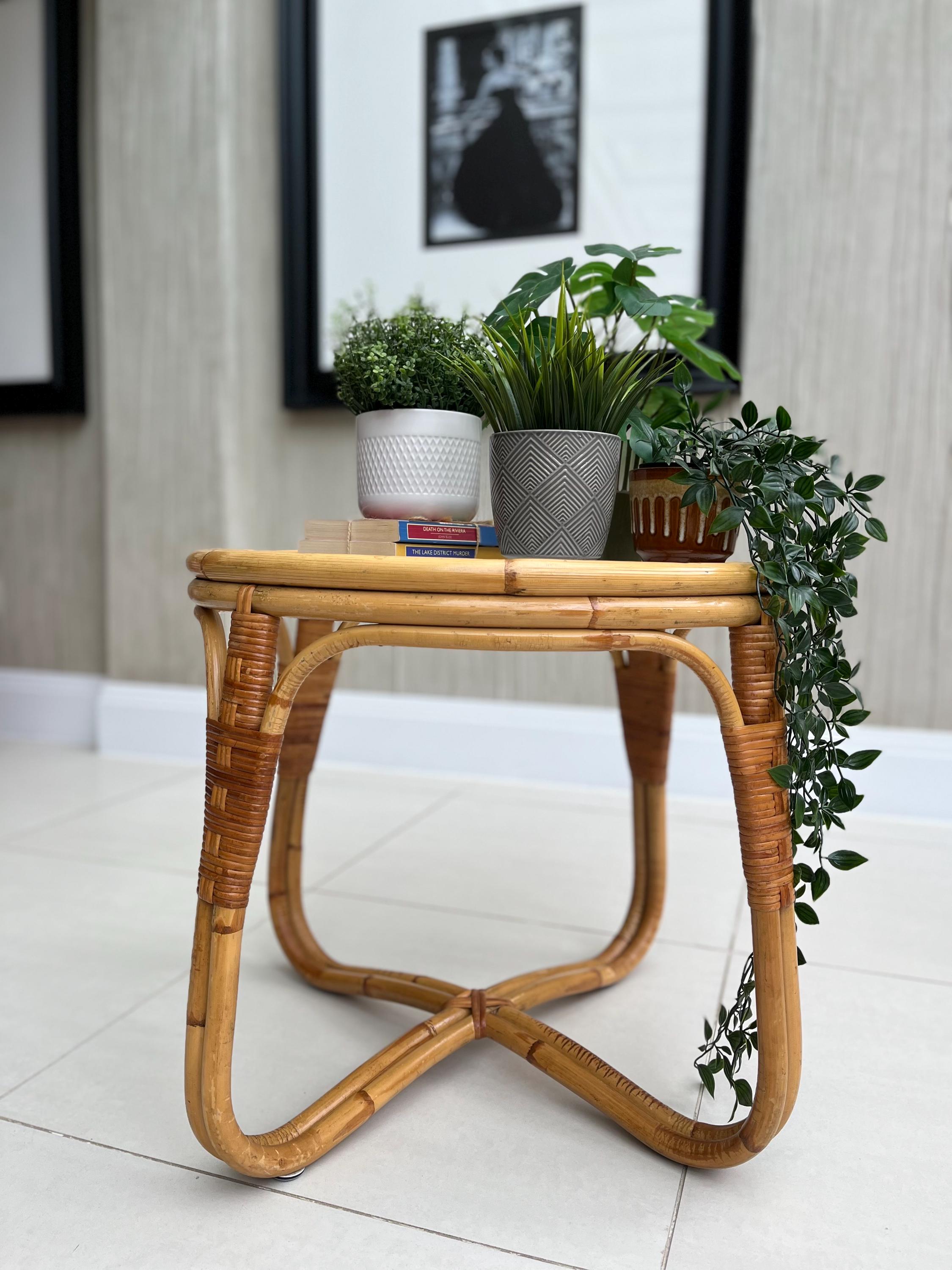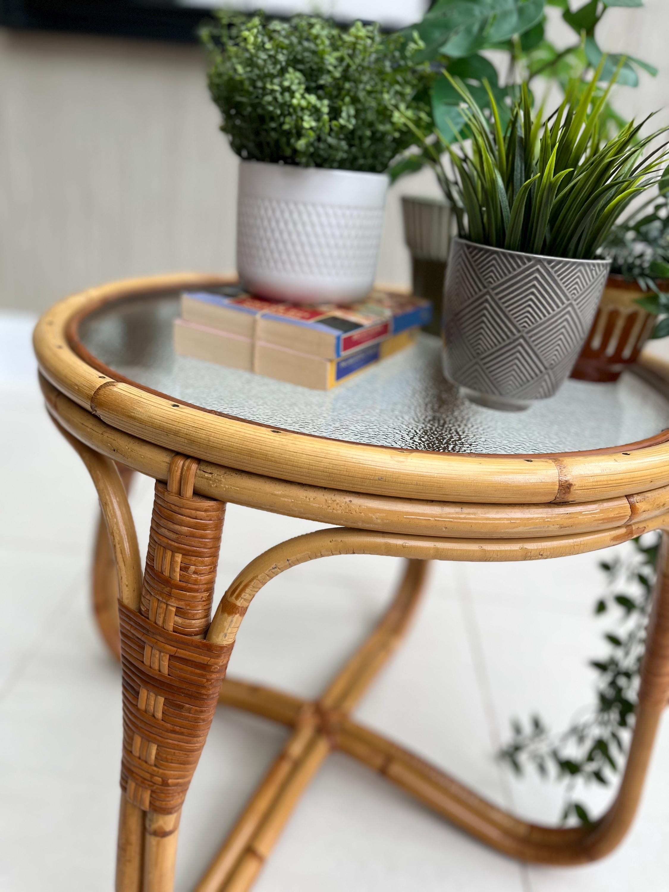 The table features a sturdy bamboo frame with tightly woven rattan bindings, all original and in excellent order. The textured safety glass top is heavy, clean and chip-free, adding a practical touch while maintaining that light, organic aesthetic Angraves is celebrated for. Its rounded form and cross-base design make it both elegant and sturdy — ideal as a coffee table, side table, or plant stand.