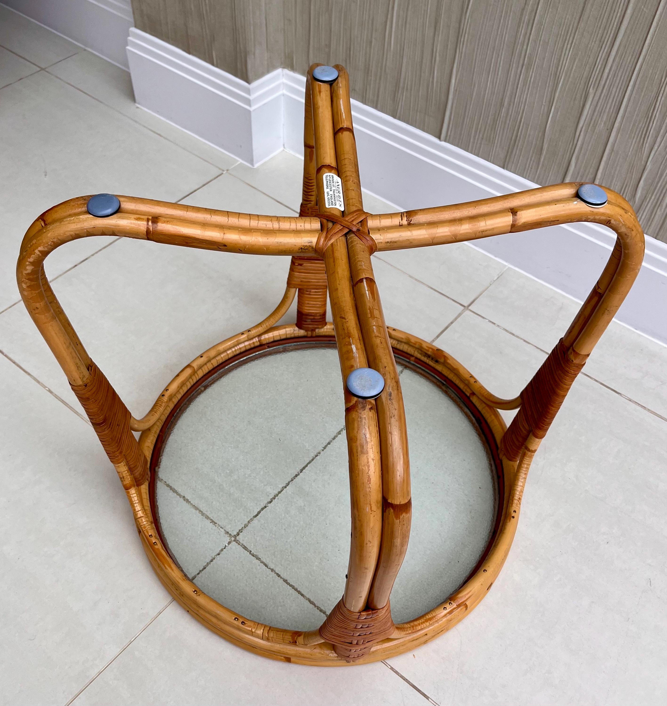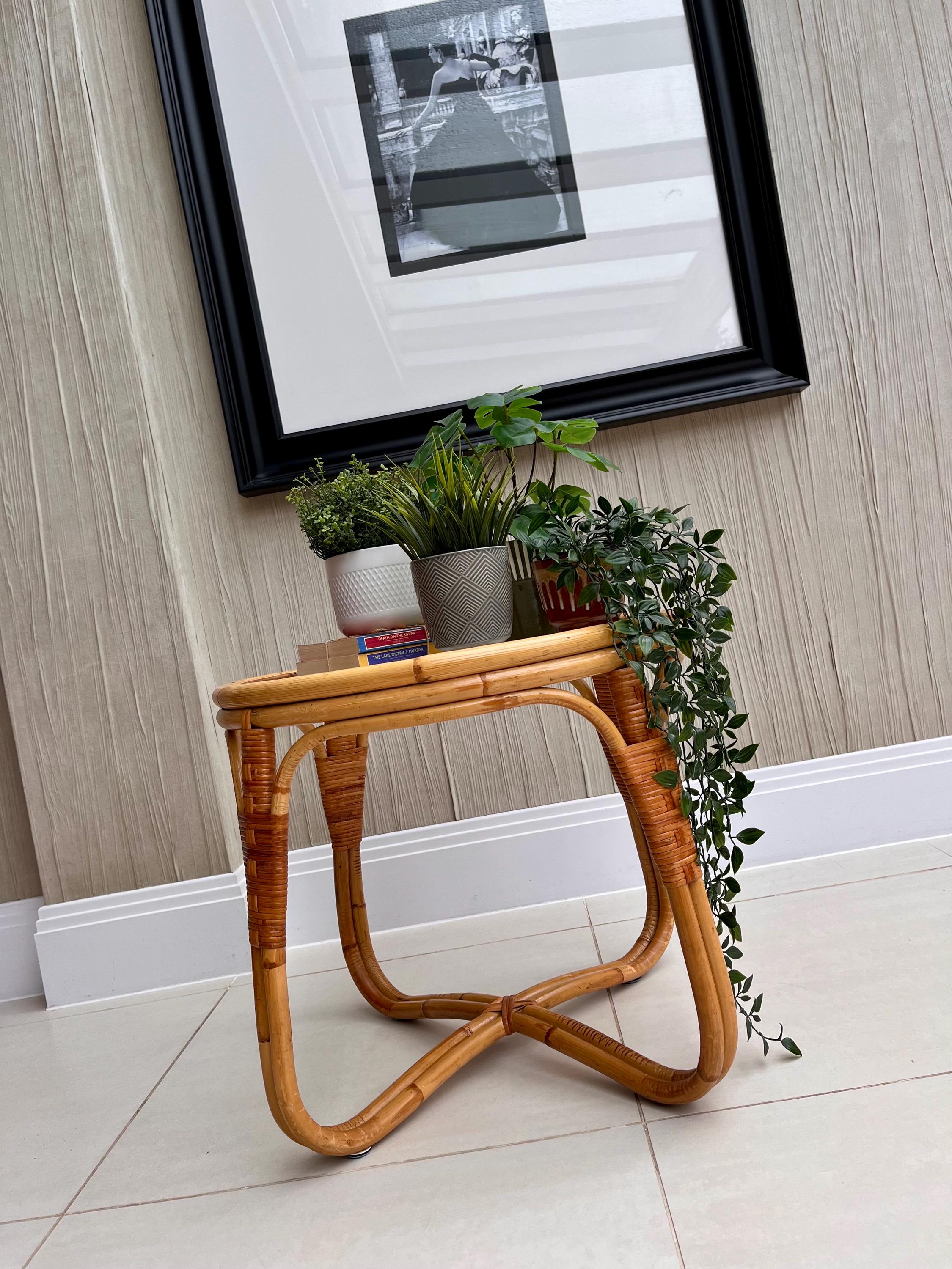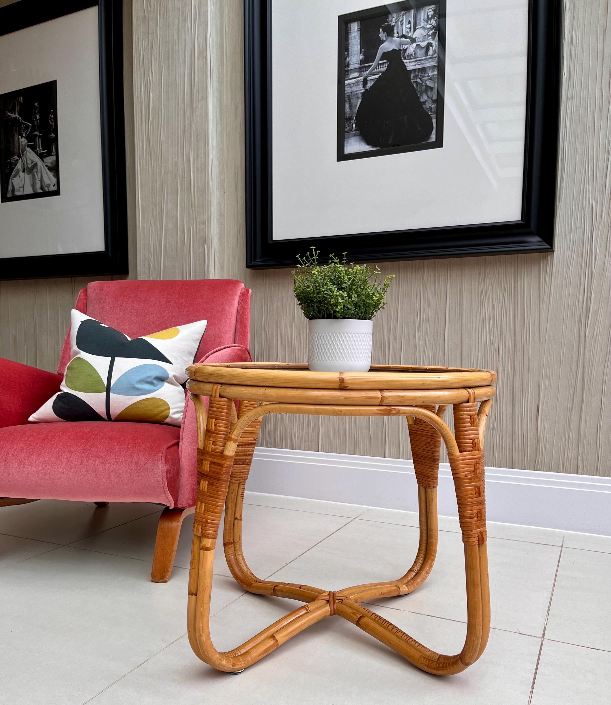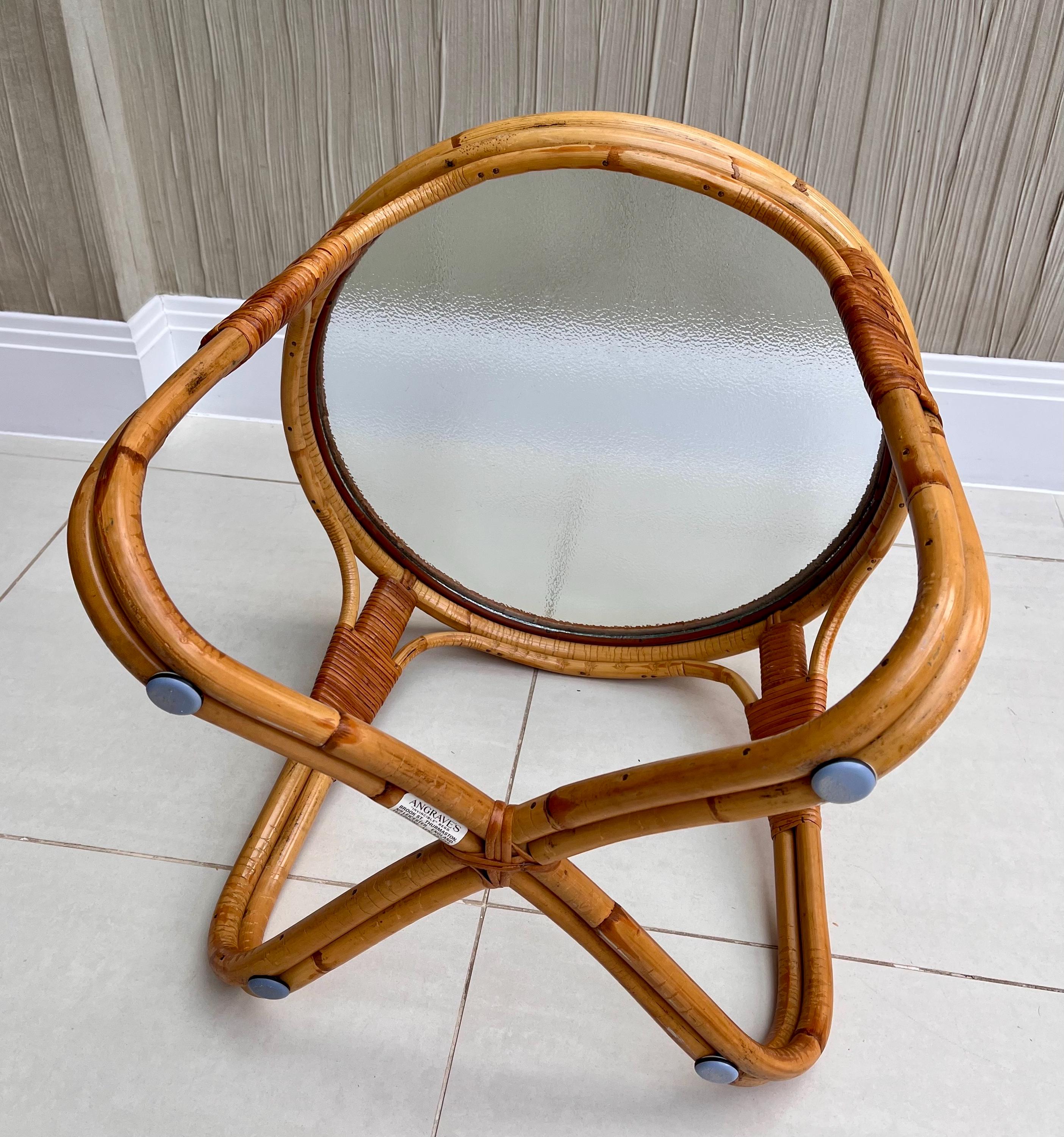 The table features a sturdy bamboo frame with tightly woven rattan bindings, all original and in excellent order. The textured safety glass top is heavy, clean and chip-free, adding a practical touch while maintaining that light, organic aesthetic Angraves is celebrated for. Its rounded form and cross-base design make it both elegant and sturdy — ideal as a coffee table, side table, or plant stand.