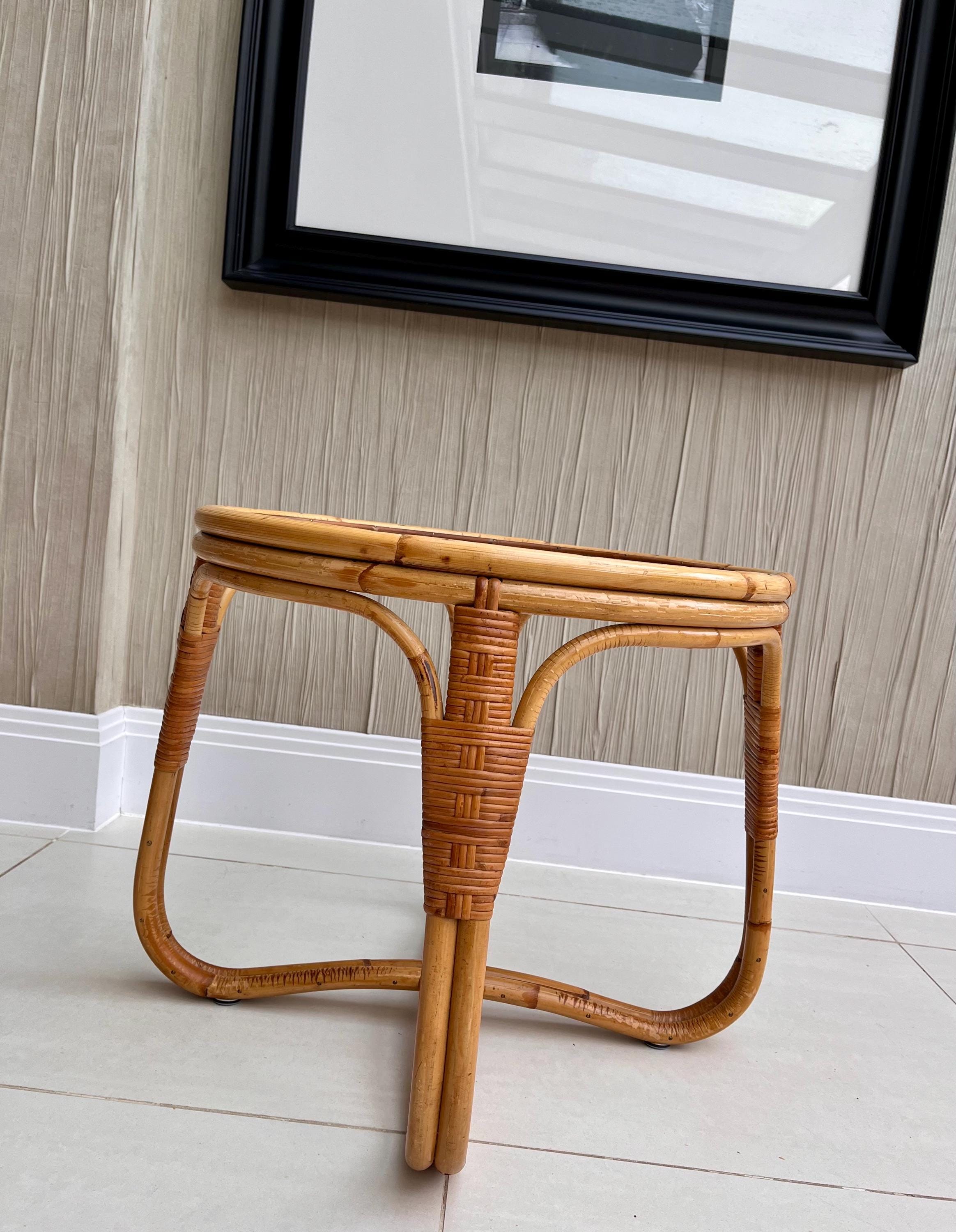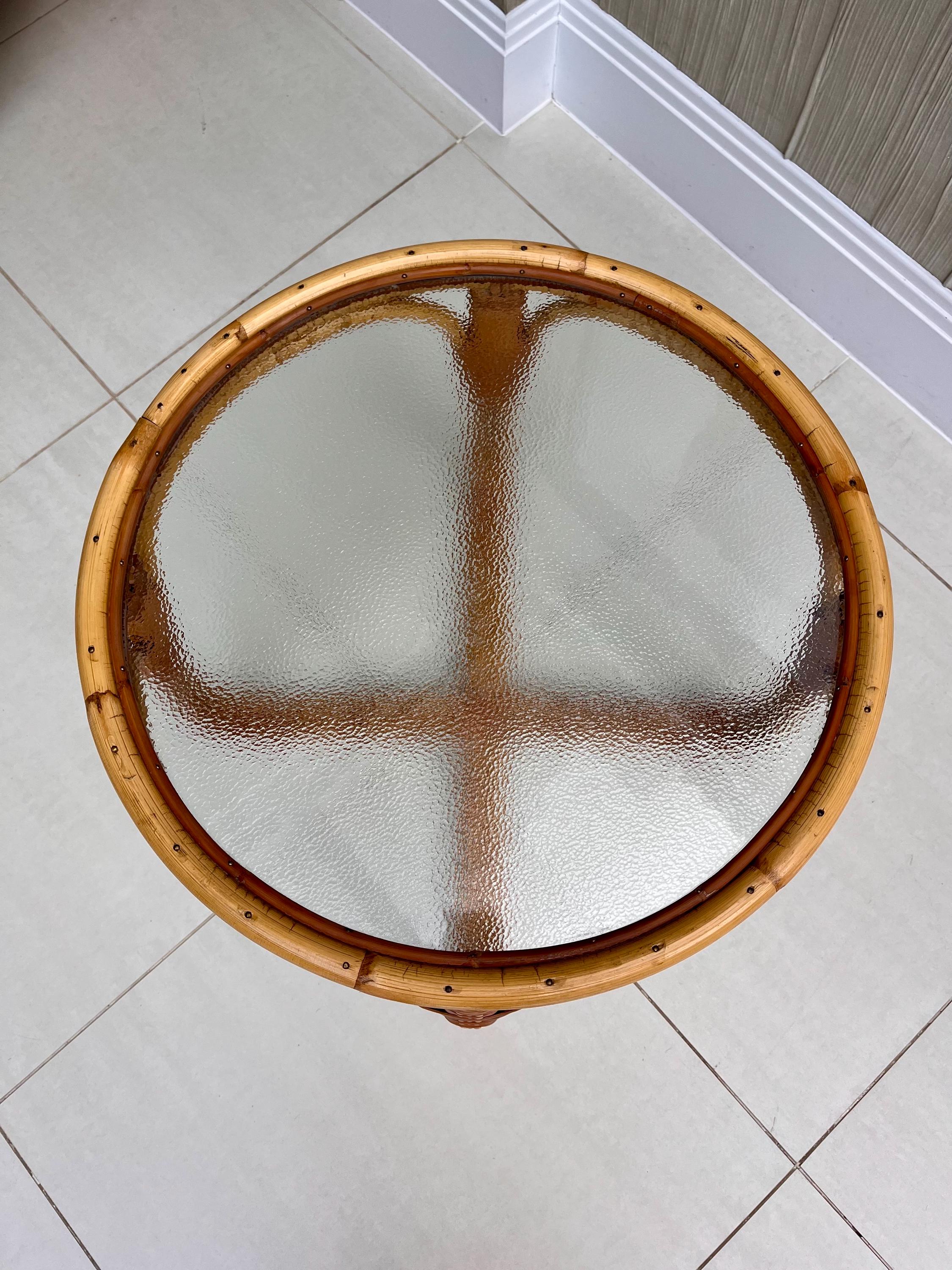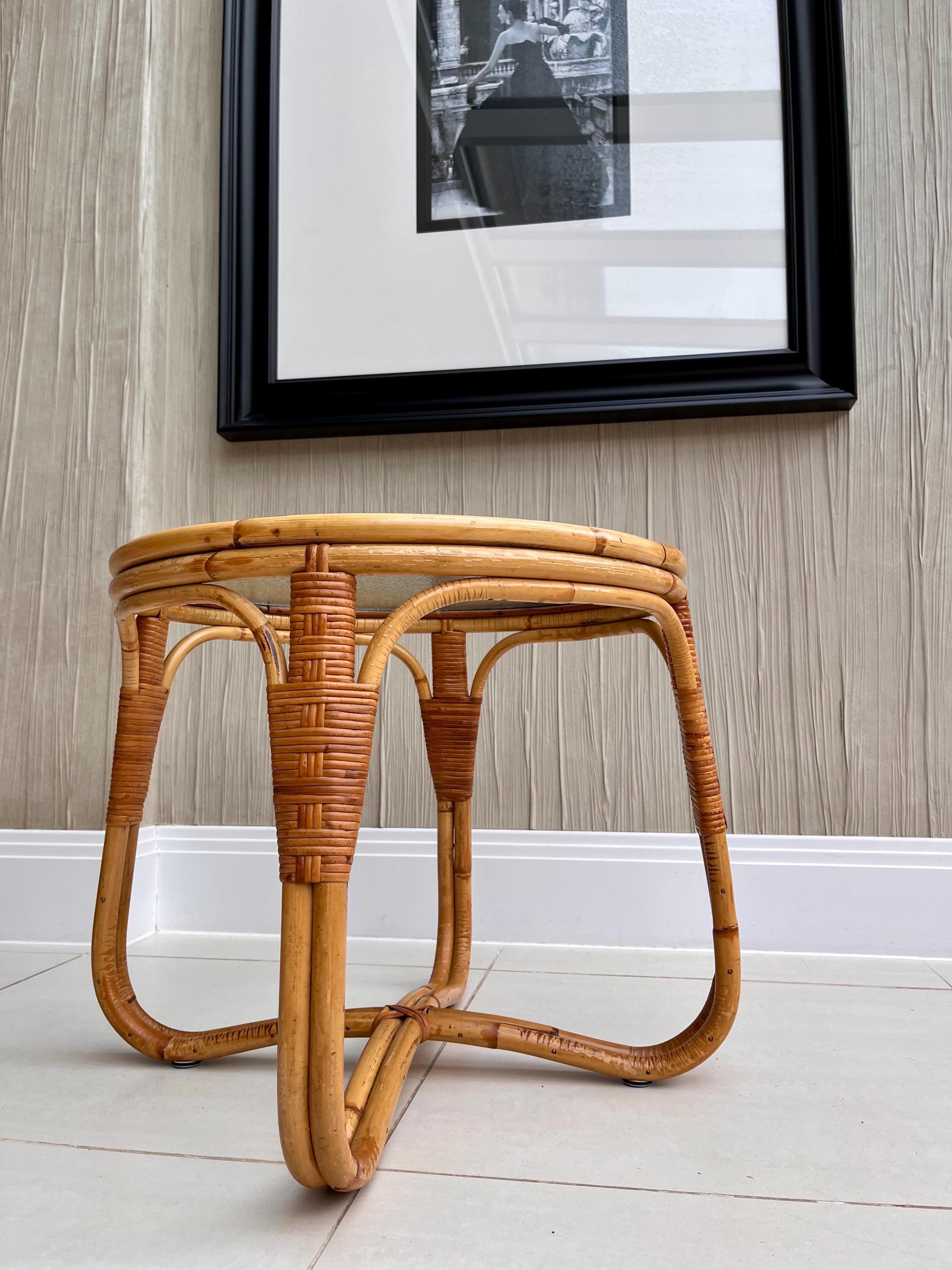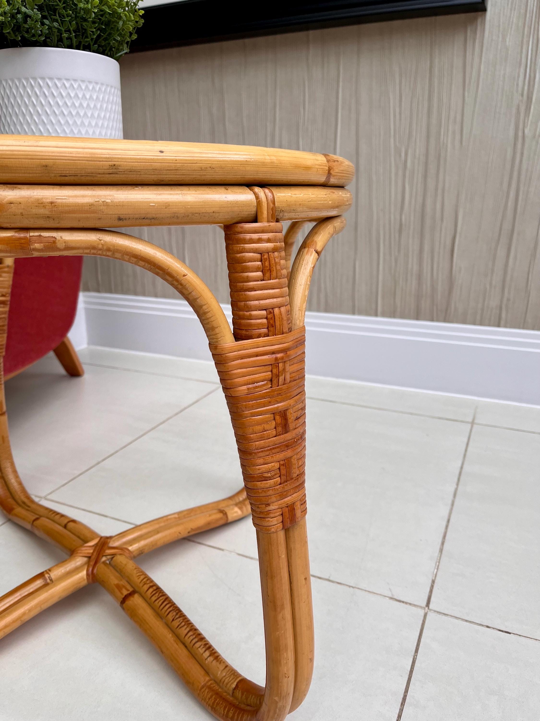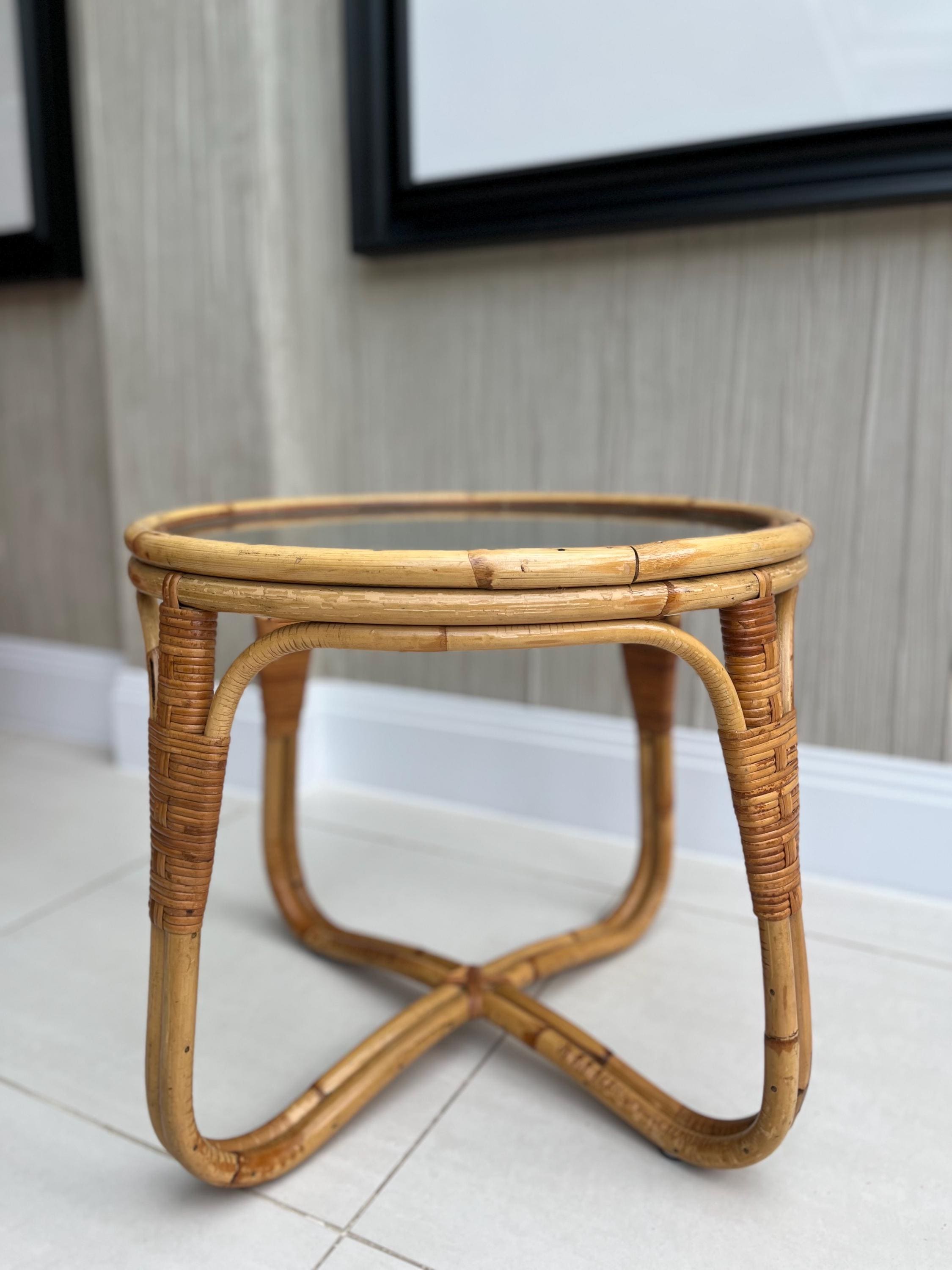 The table features a sturdy bamboo frame with tightly woven rattan bindings, all original and in excellent order. The textured safety glass top is heavy, clean and chip-free, adding a practical touch while maintaining that light, organic aesthetic Angraves is celebrated for. Its rounded form and cross-base design make it both elegant and sturdy — ideal as a coffee table, side table, or plant stand.