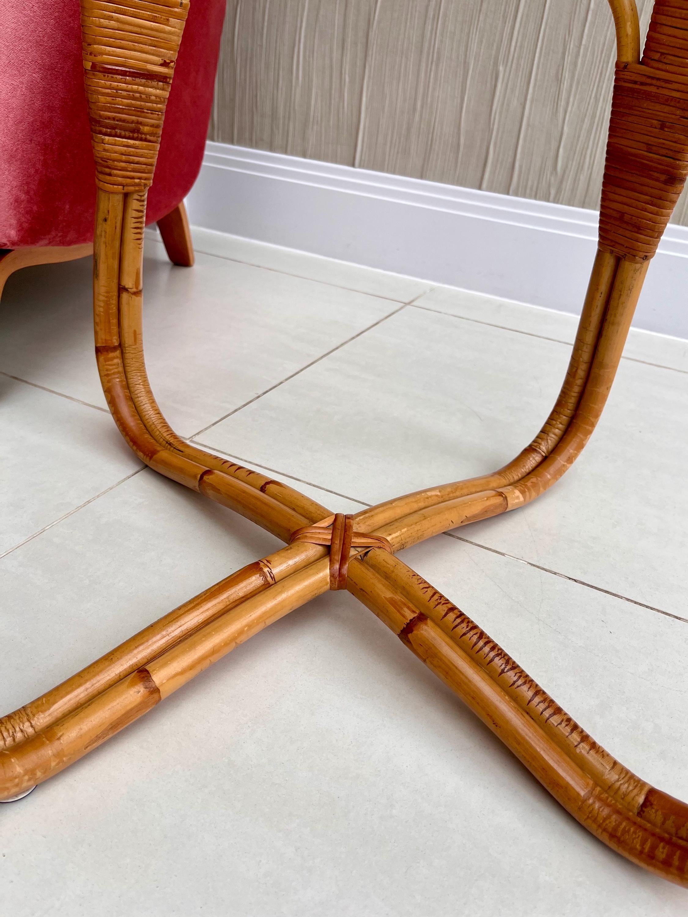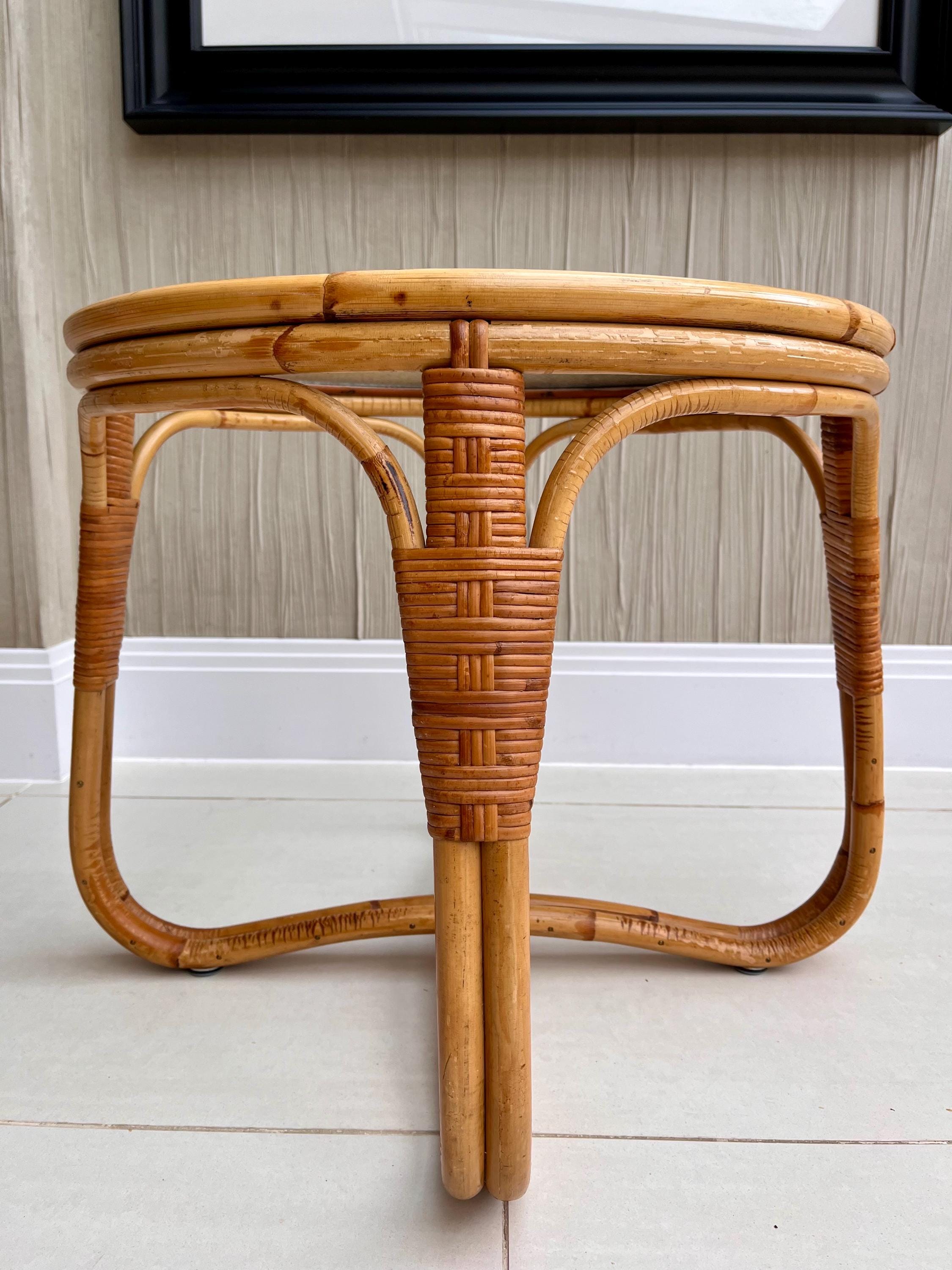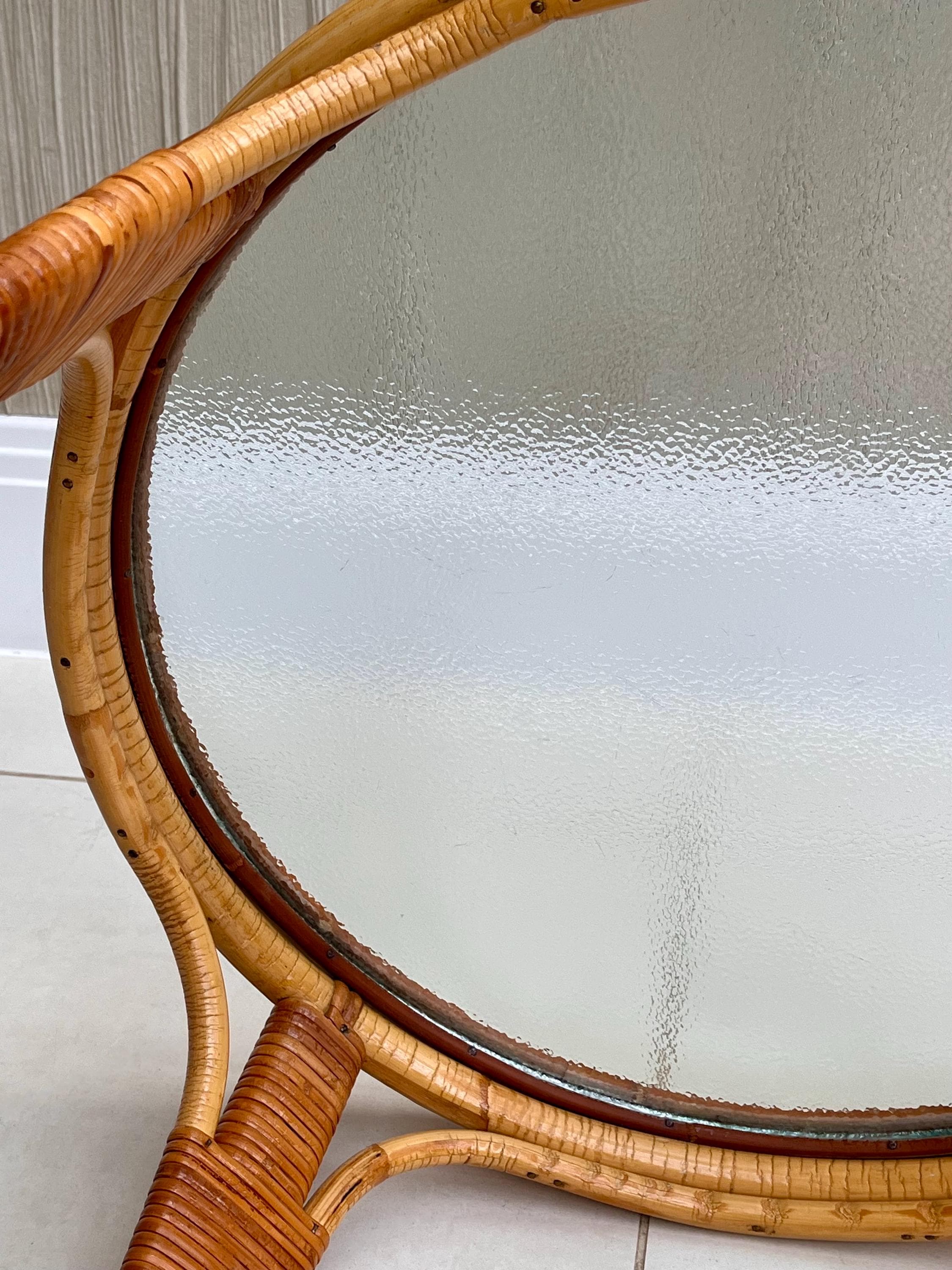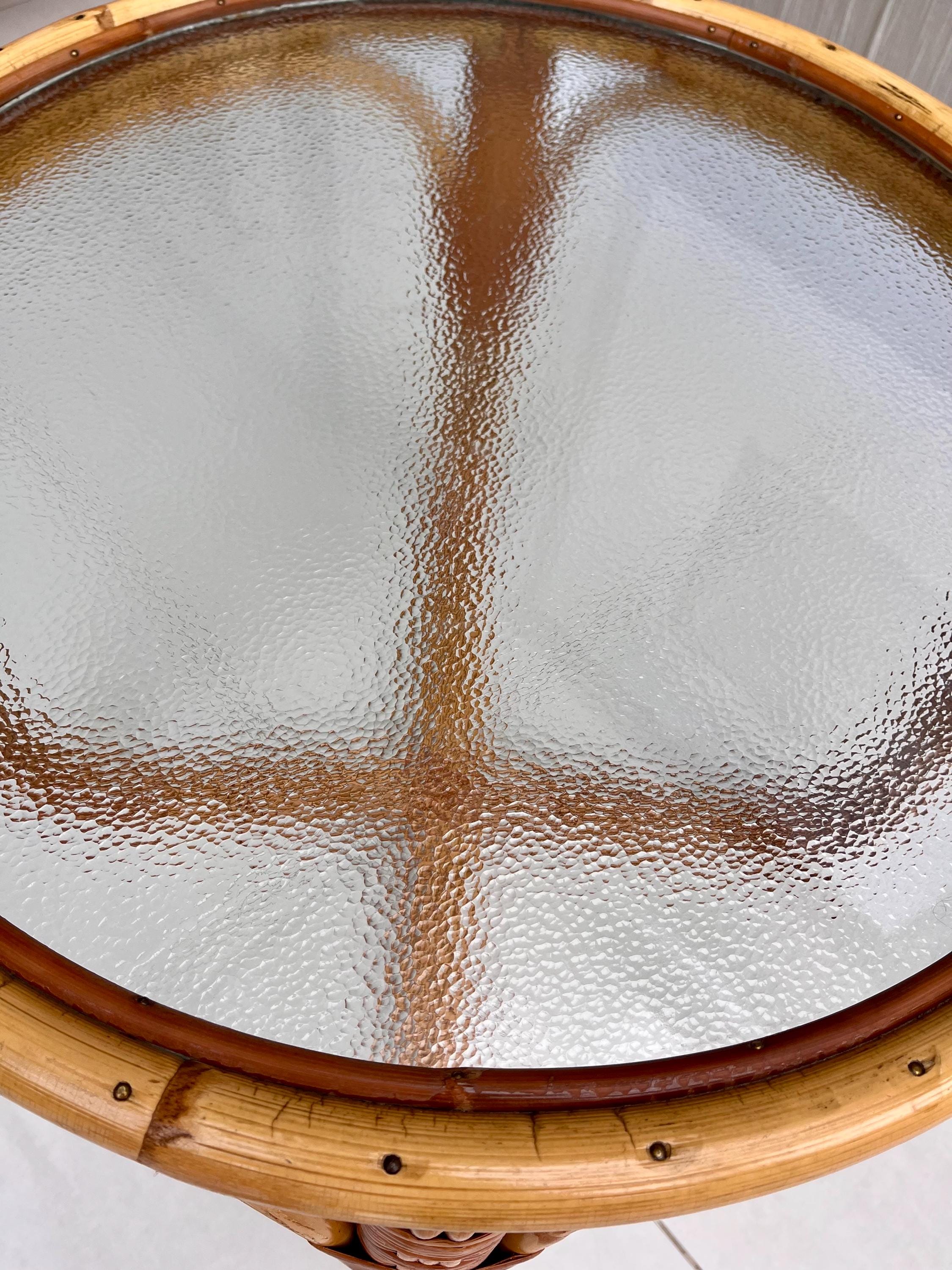 The table features a sturdy bamboo frame with tightly woven rattan bindings, all original and in excellent order. The textured safety glass top is heavy, clean and chip-free, adding a practical touch while maintaining that light, organic aesthetic Angraves is celebrated for. Its rounded form and cross-base design make it both elegant and sturdy — ideal as a coffee table, side table, or plant stand.
