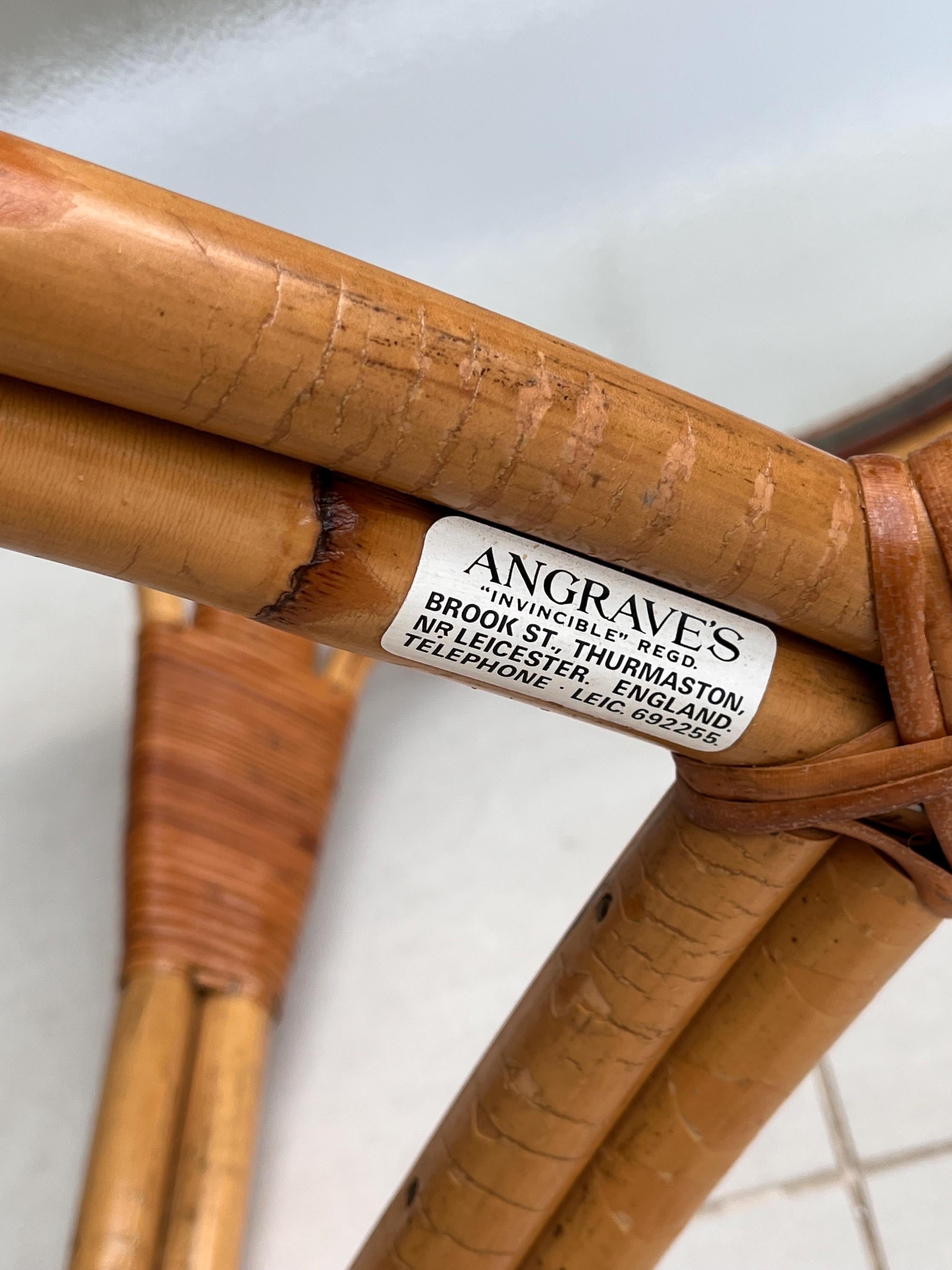 A beautifully crafted vintage bamboo and glass coffee table by Angraves of Leicester, one of the UK’s leading cane furniture makers throughout the mid-20th century.