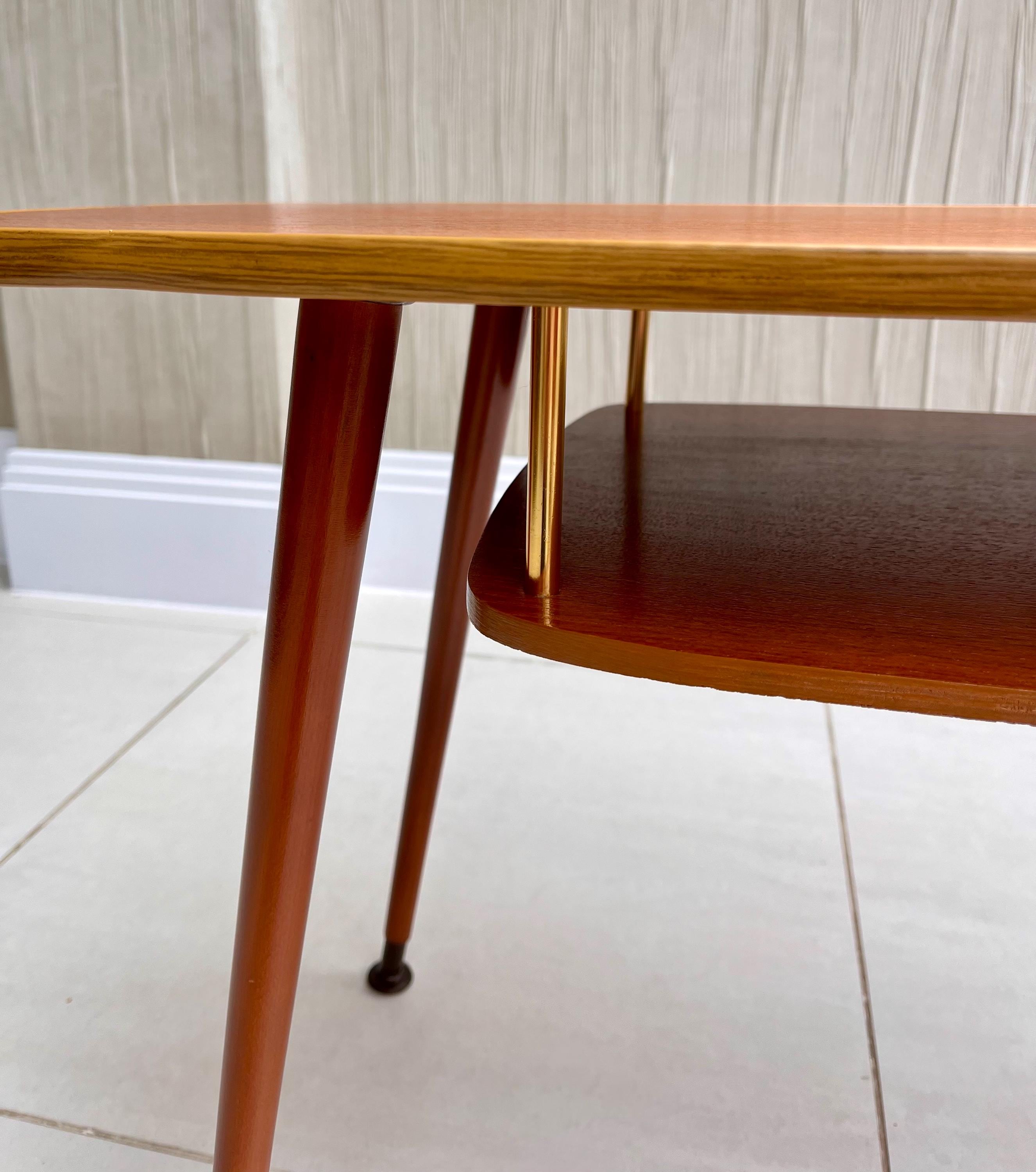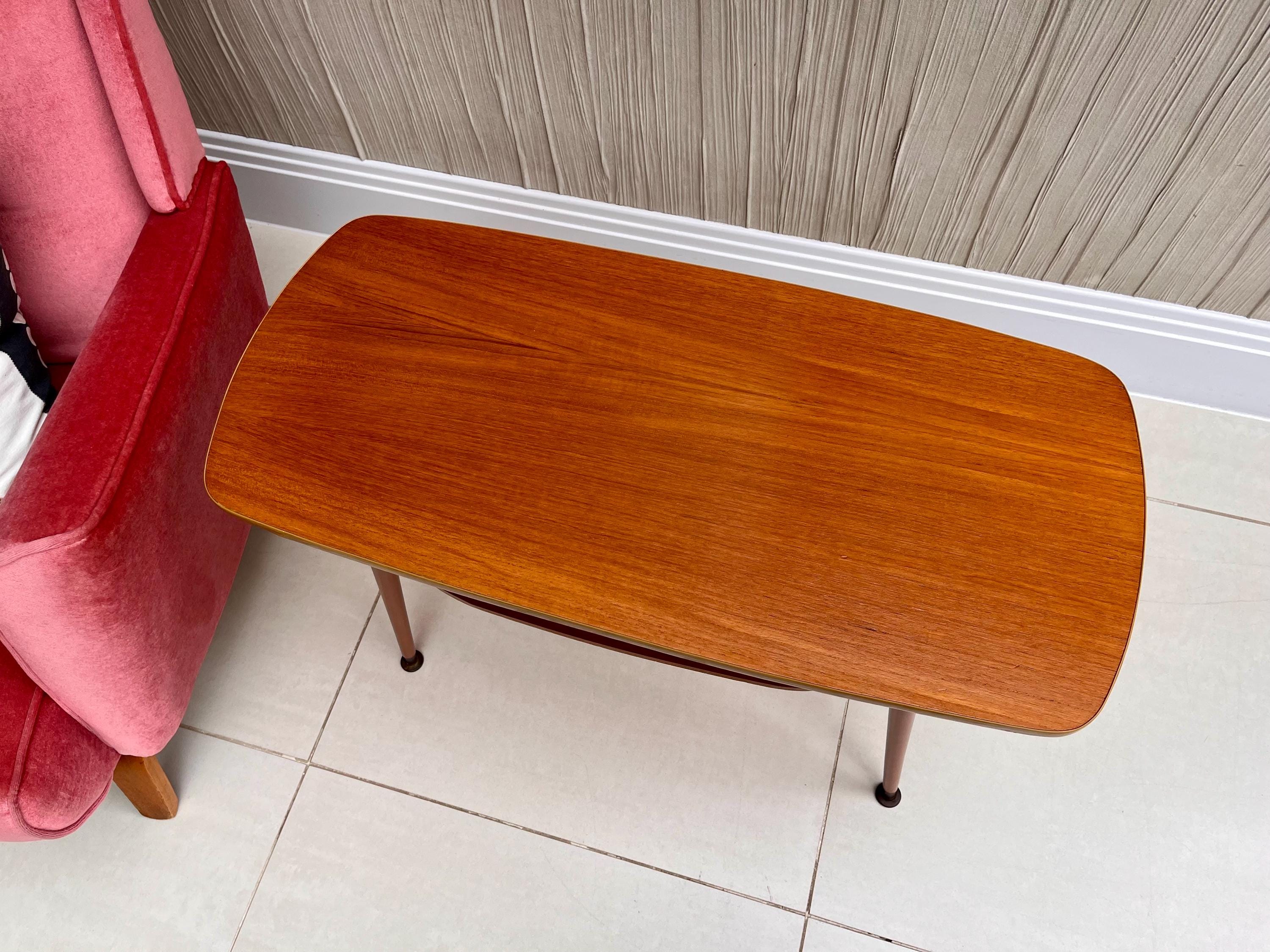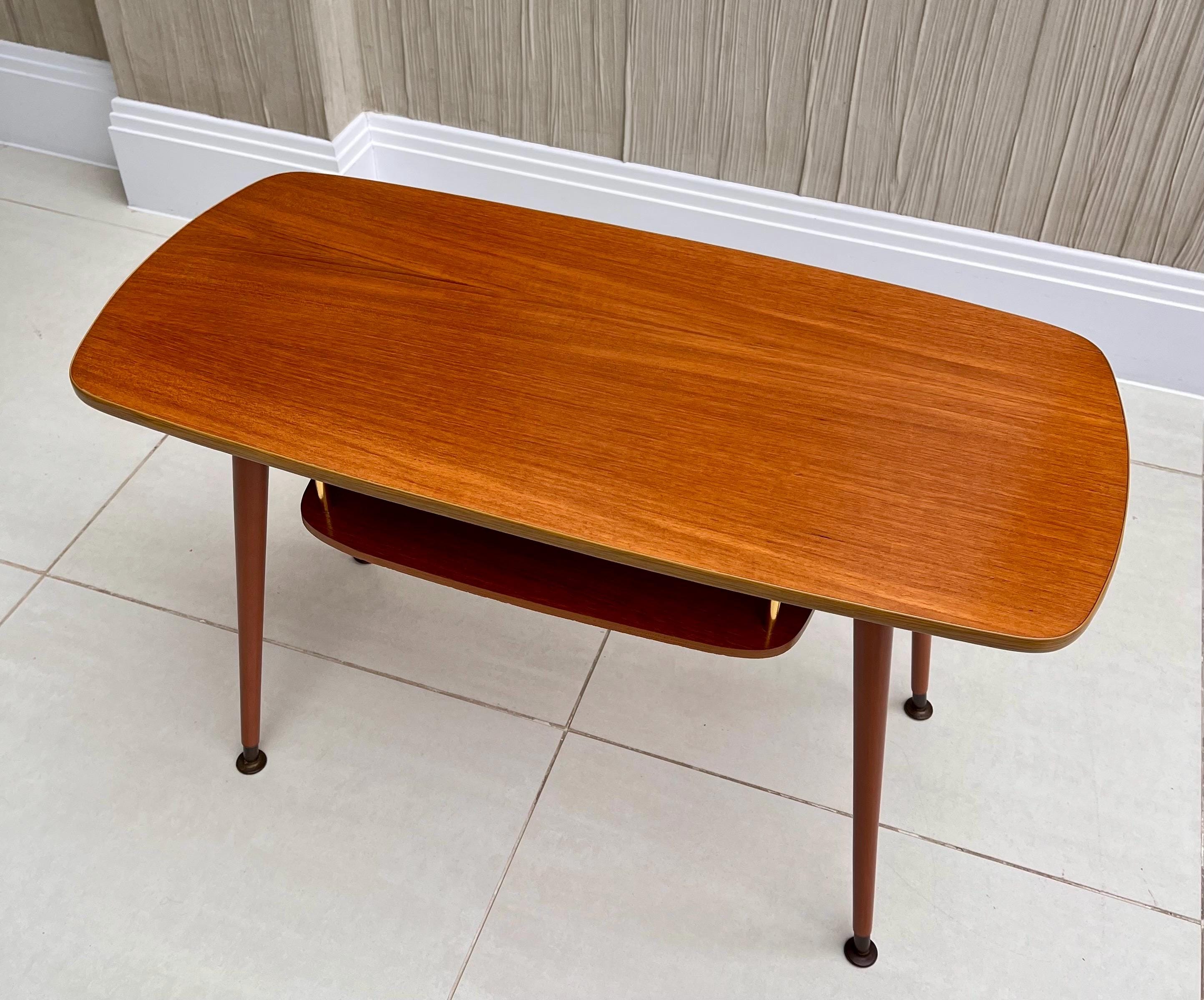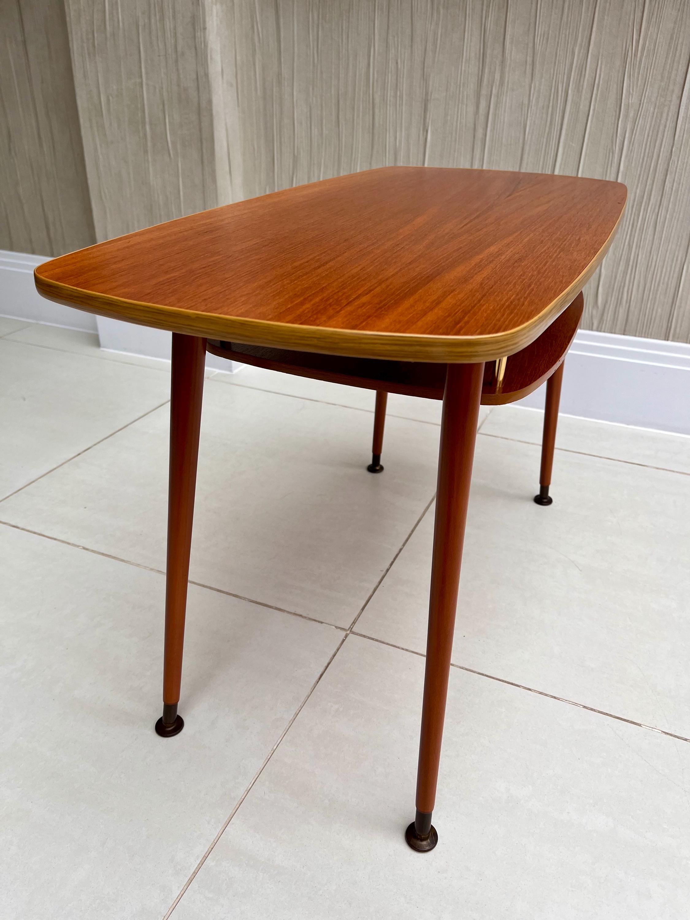 A beautifully designed compact mid-century style coffee or side table, perfect for modern living where space is at a premium. This is a later piece, inspired by classic 1950s–60s mid-century design, capturing that elegant vintage aesthetic with its clean lines, slender tapered legs, and warm wood tones.