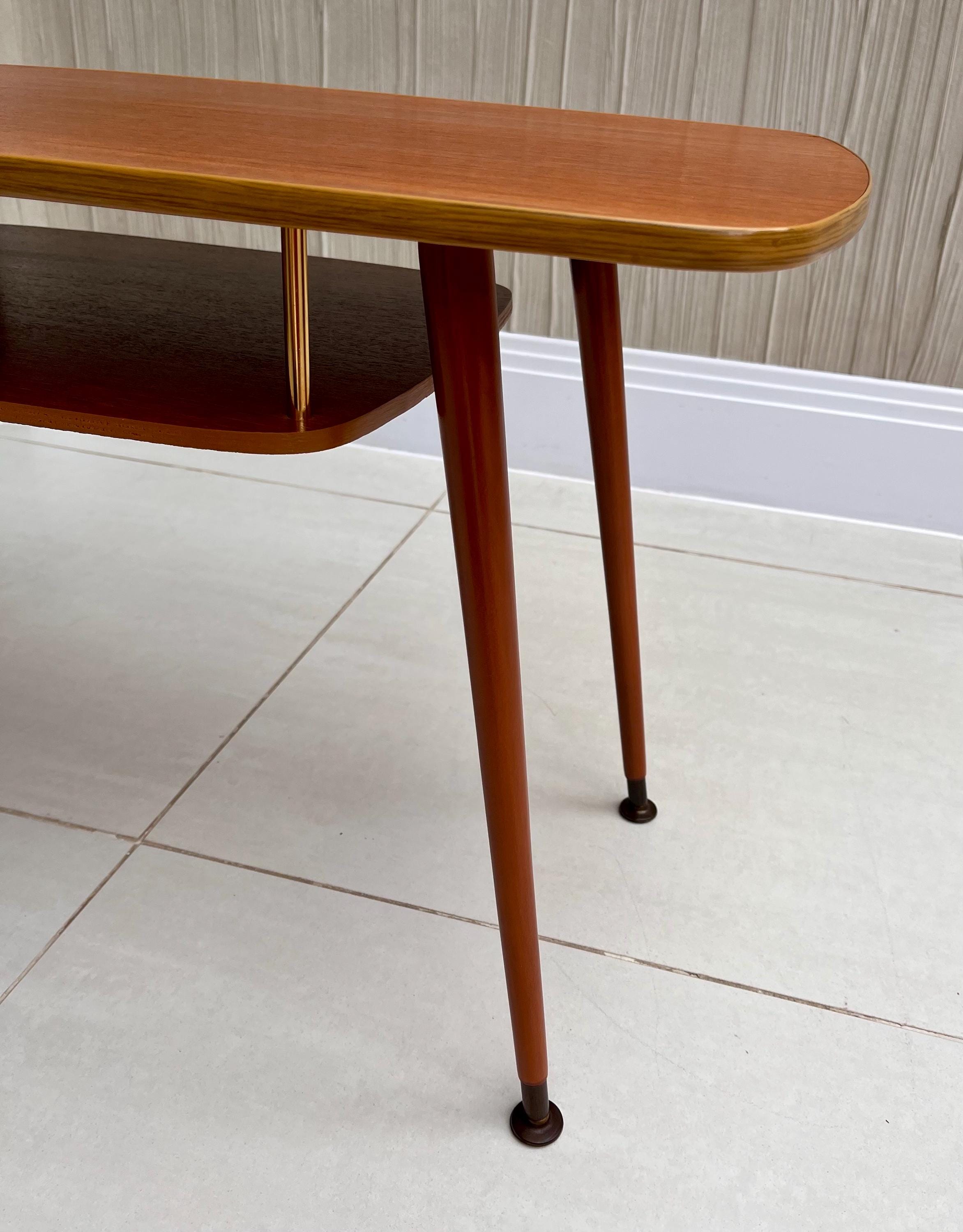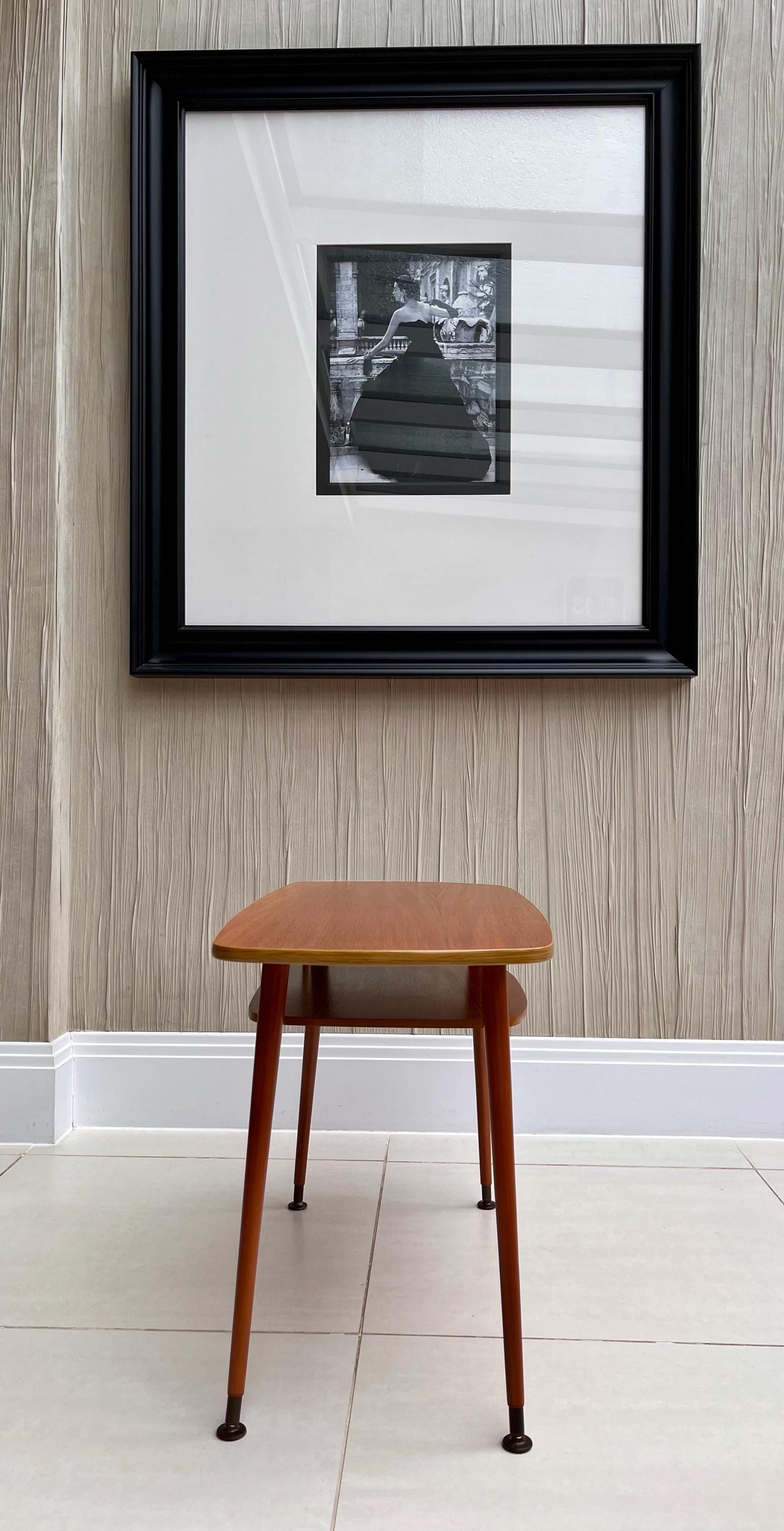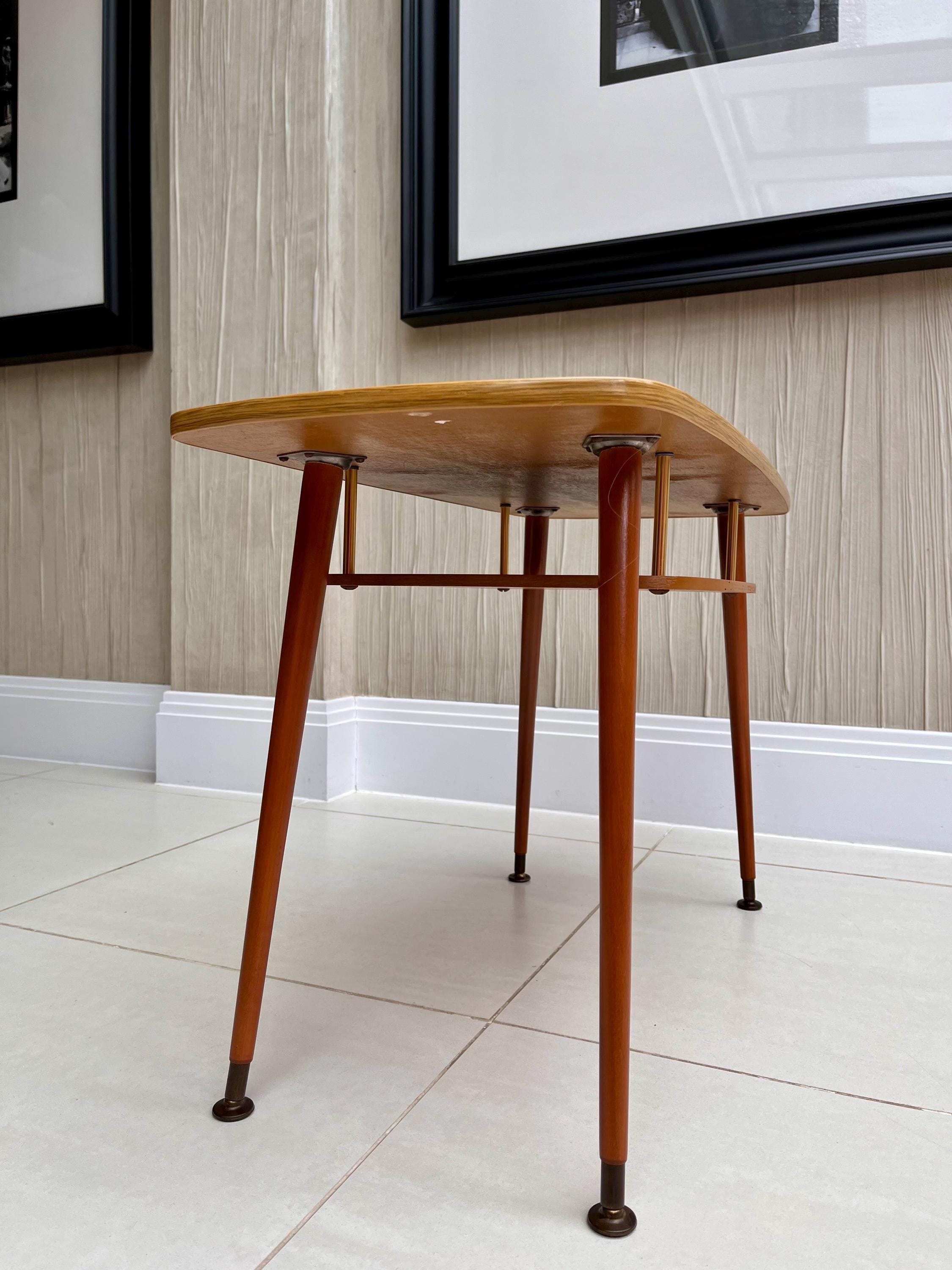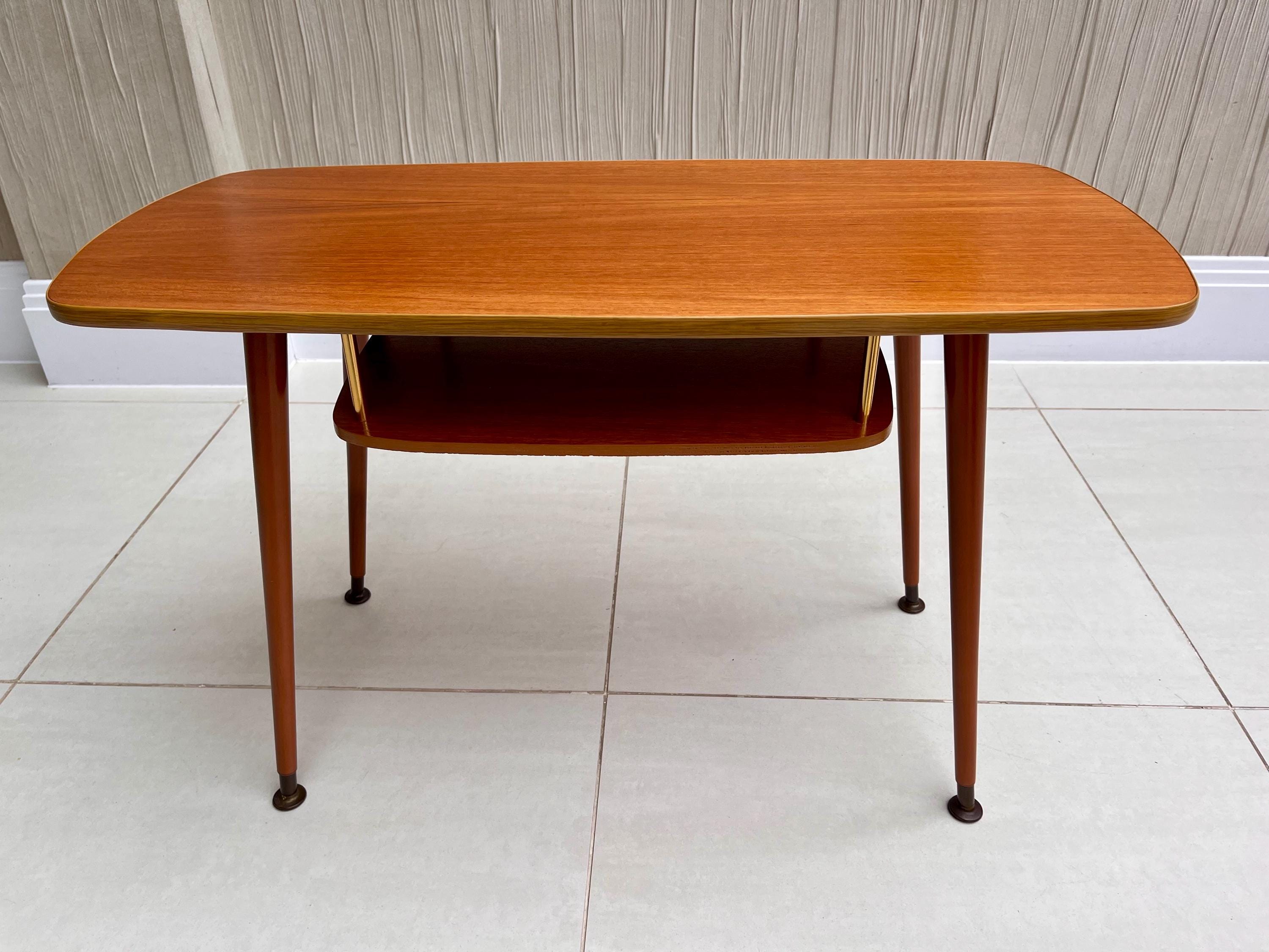 A beautifully designed compact mid-century style coffee or side table, perfect for modern living where space is at a premium. This is a later piece, inspired by classic 1950s–60s mid-century design, capturing that elegant vintage aesthetic with its clean lines, slender tapered legs, and warm wood tones.
