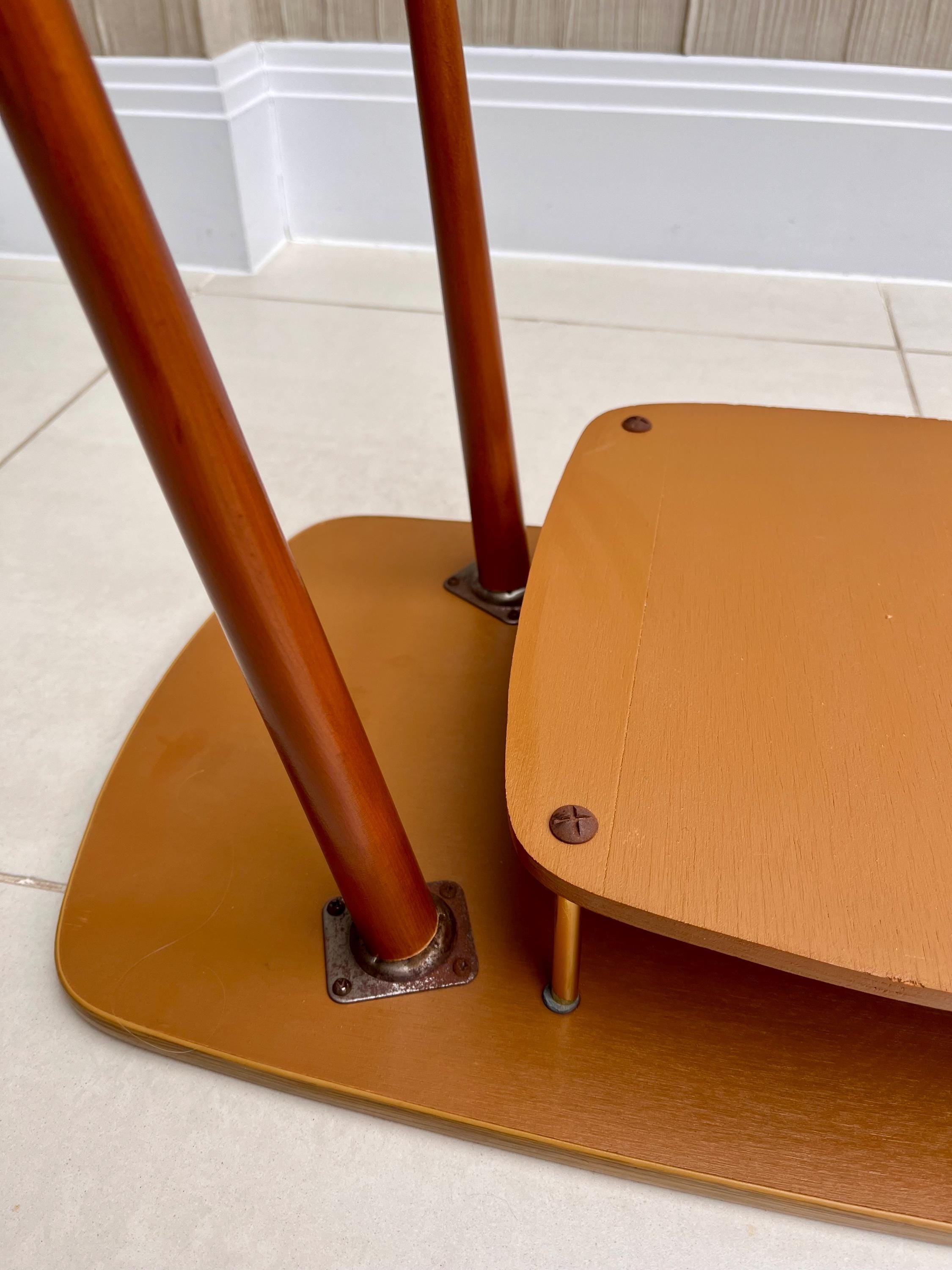 The rectangular top is finished in a rich wood-grained veneer, framed by durable wood-coloured edging that remains in excellent order. Beneath sits a shelf, supported by slim brass rods — ideal for books, magazines, or simply as a styling layer for plants, ceramics or décor.