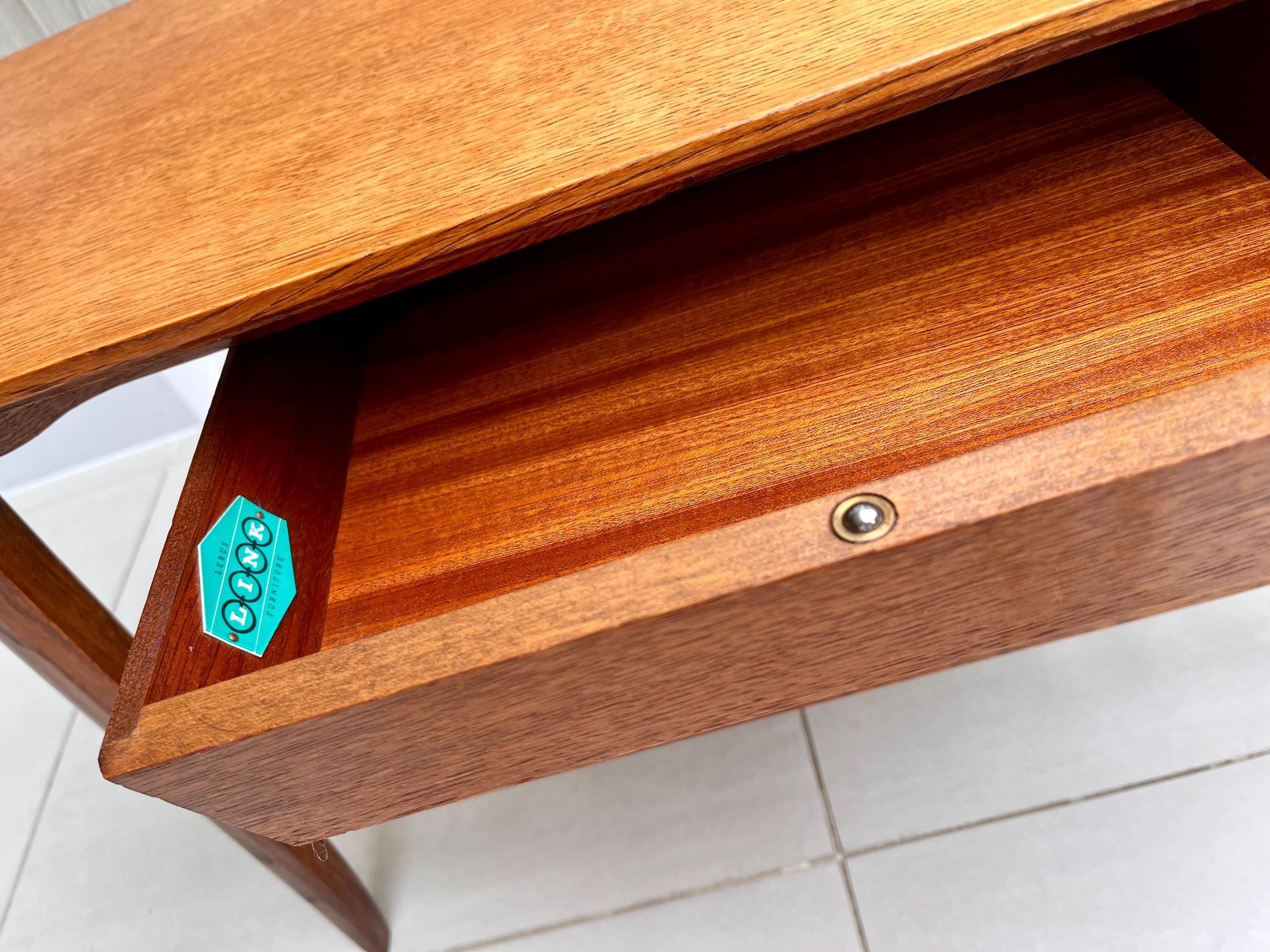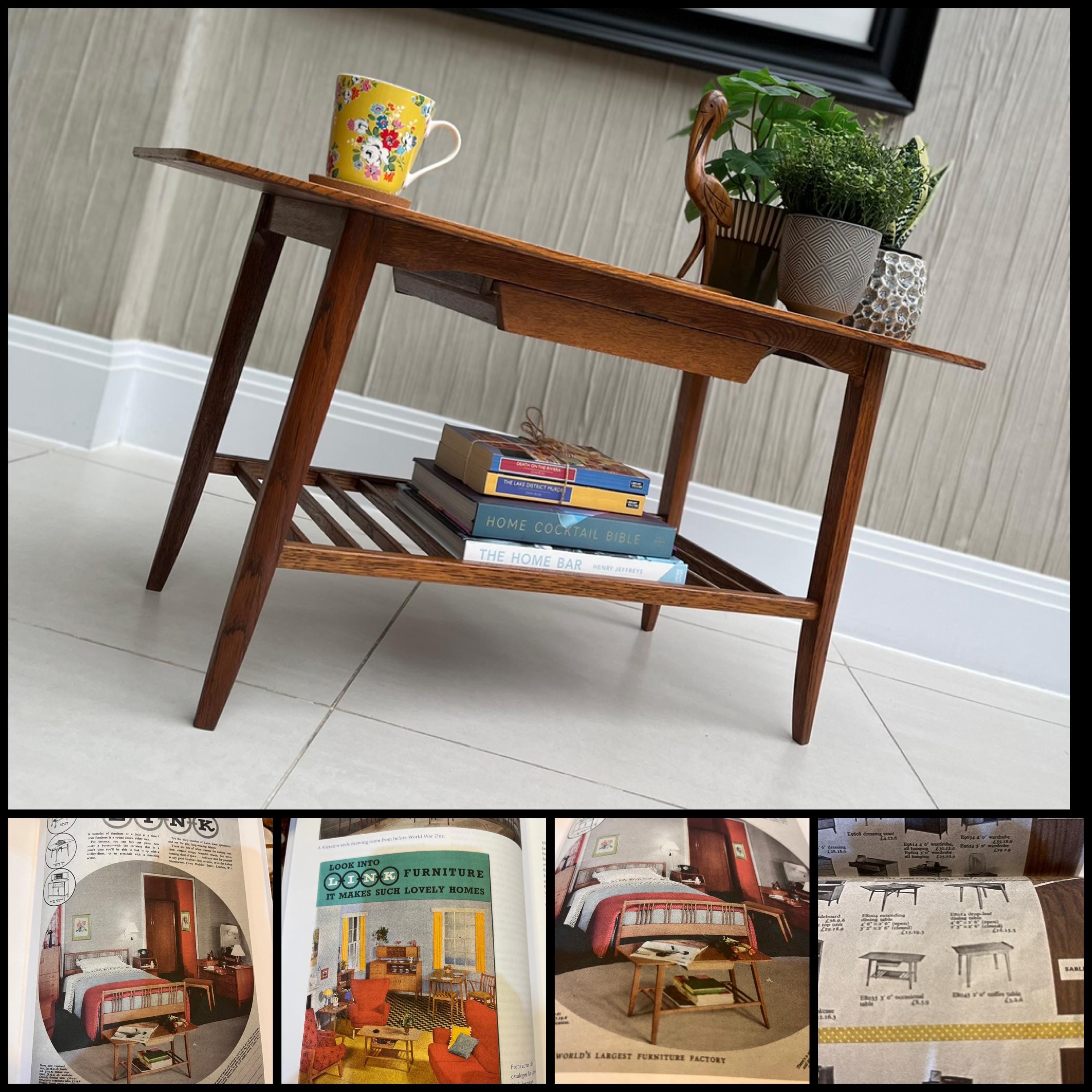What sets this example apart is its documented provenance. The exact model is shown in period advertising for the Lebus Links range, launched in 1956. Featured prominently in catalogues and magazine adverts under the campaign slogan “Look into Link Furniture – It makes such lovely homes,” this table was part of Lebus’s mission to bring stylish, affordable, and well-made furniture to British households.