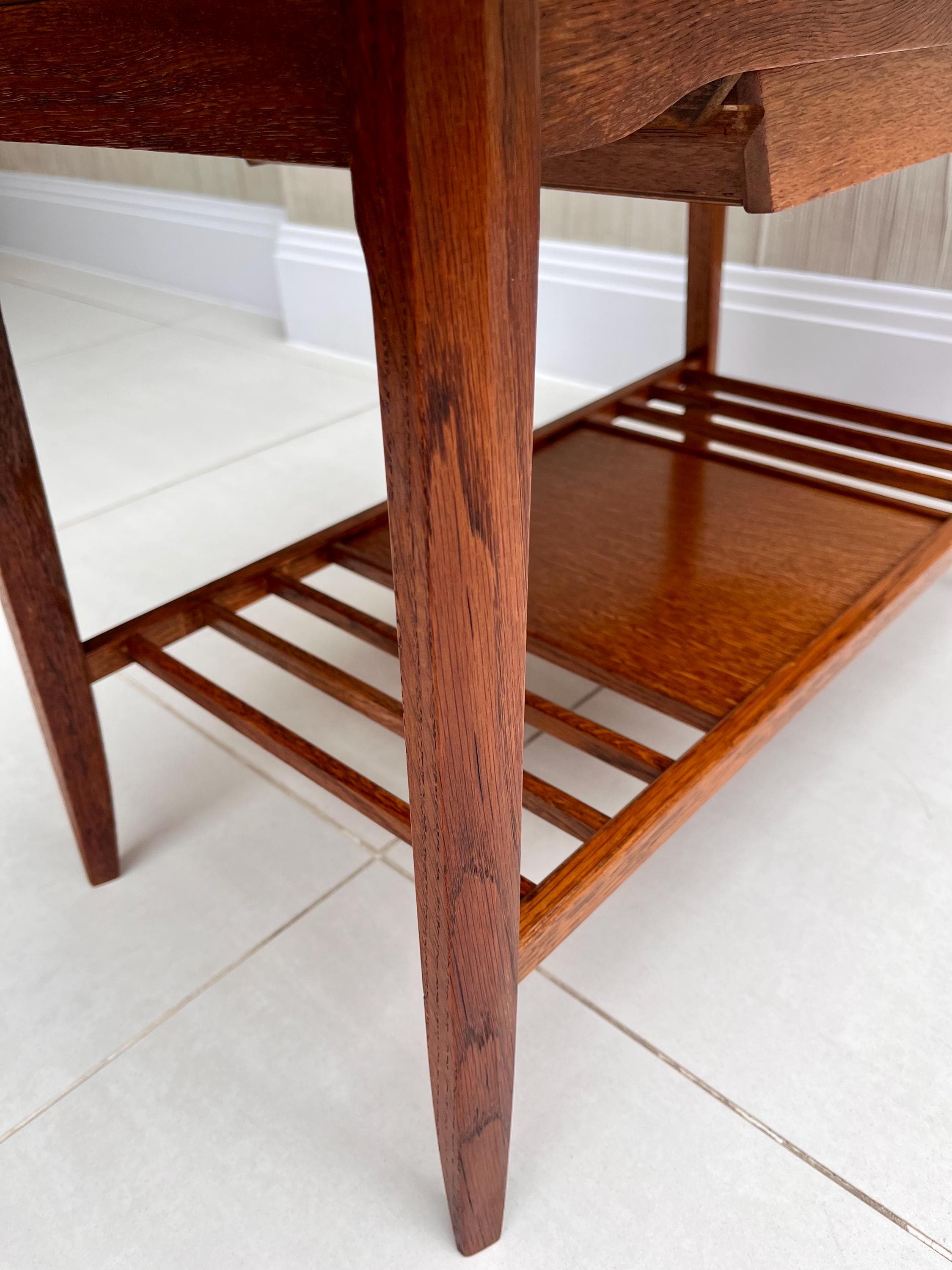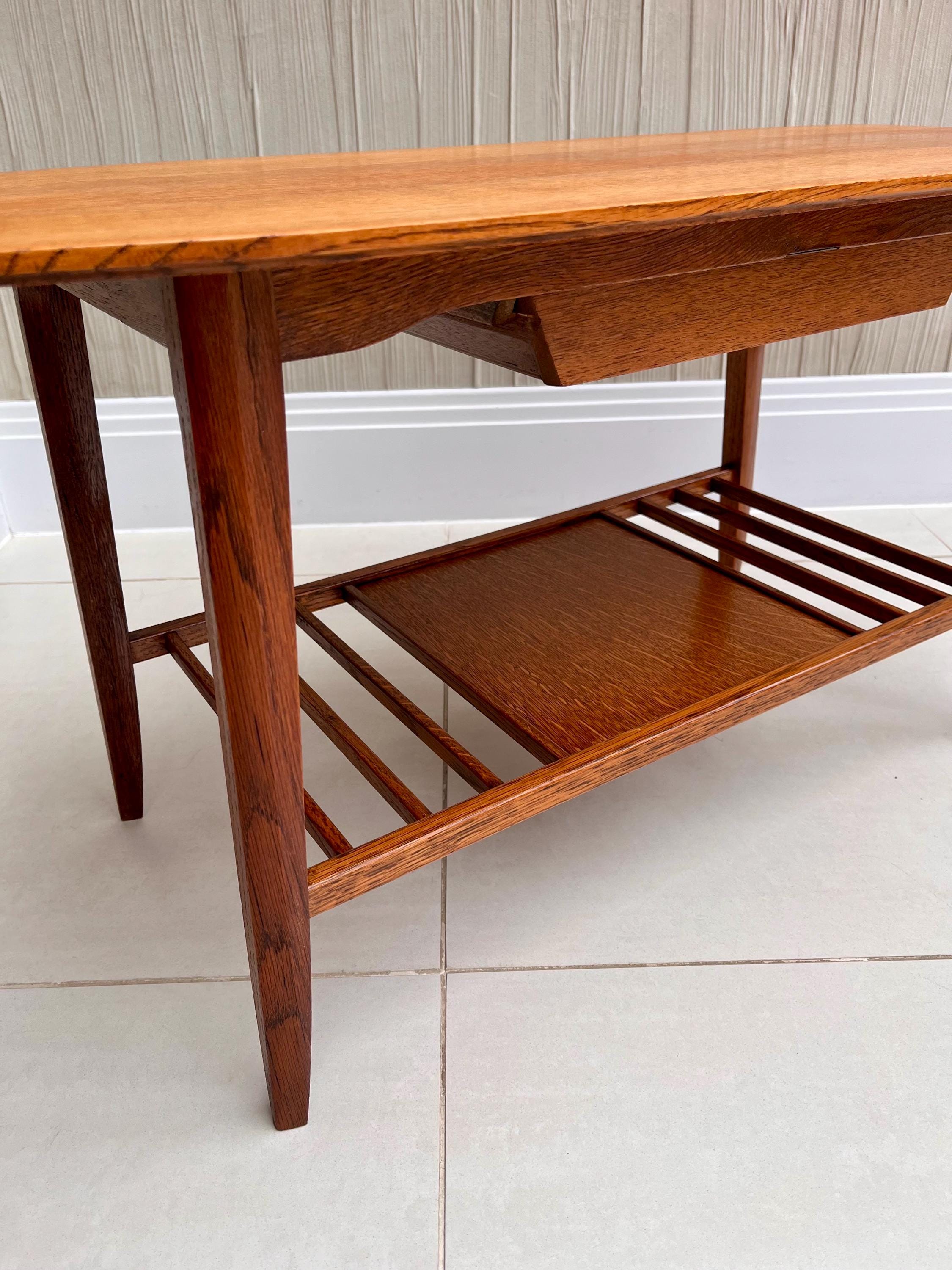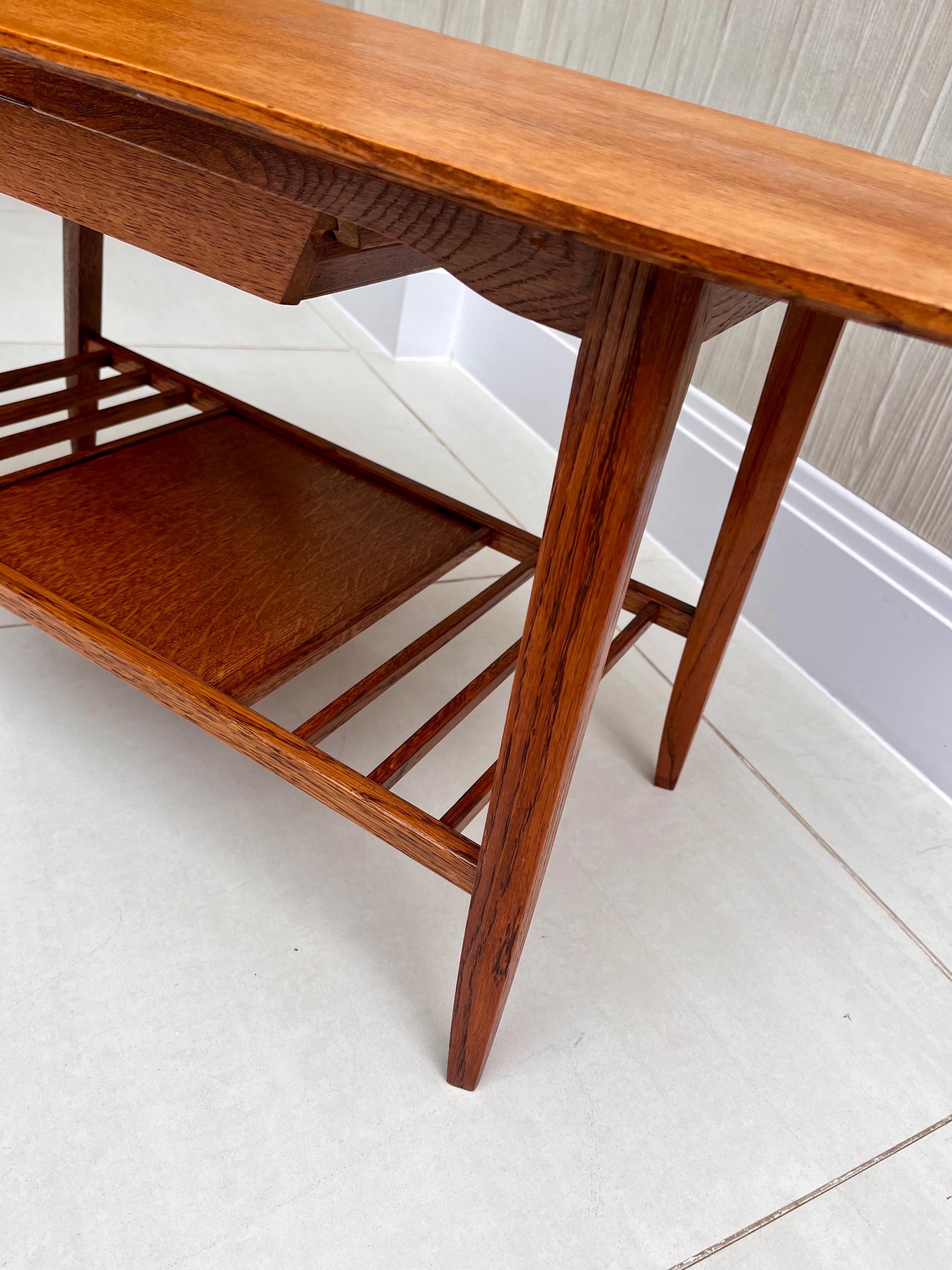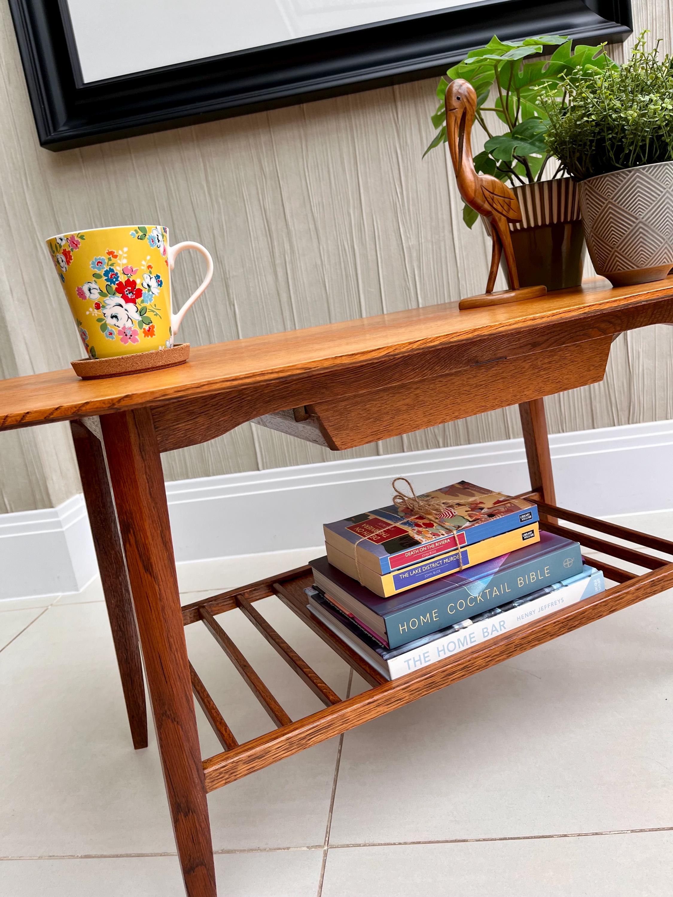 This elegant table, crafted in Sable Oak veneer, captures the spirit of the 1950s with its softly tapered legs, shaped top, and practical lower shelf — ideal for books, magazines, or display. Compact yet full of character, it perfectly reflects the functional, light-toned modernism of post-war design.