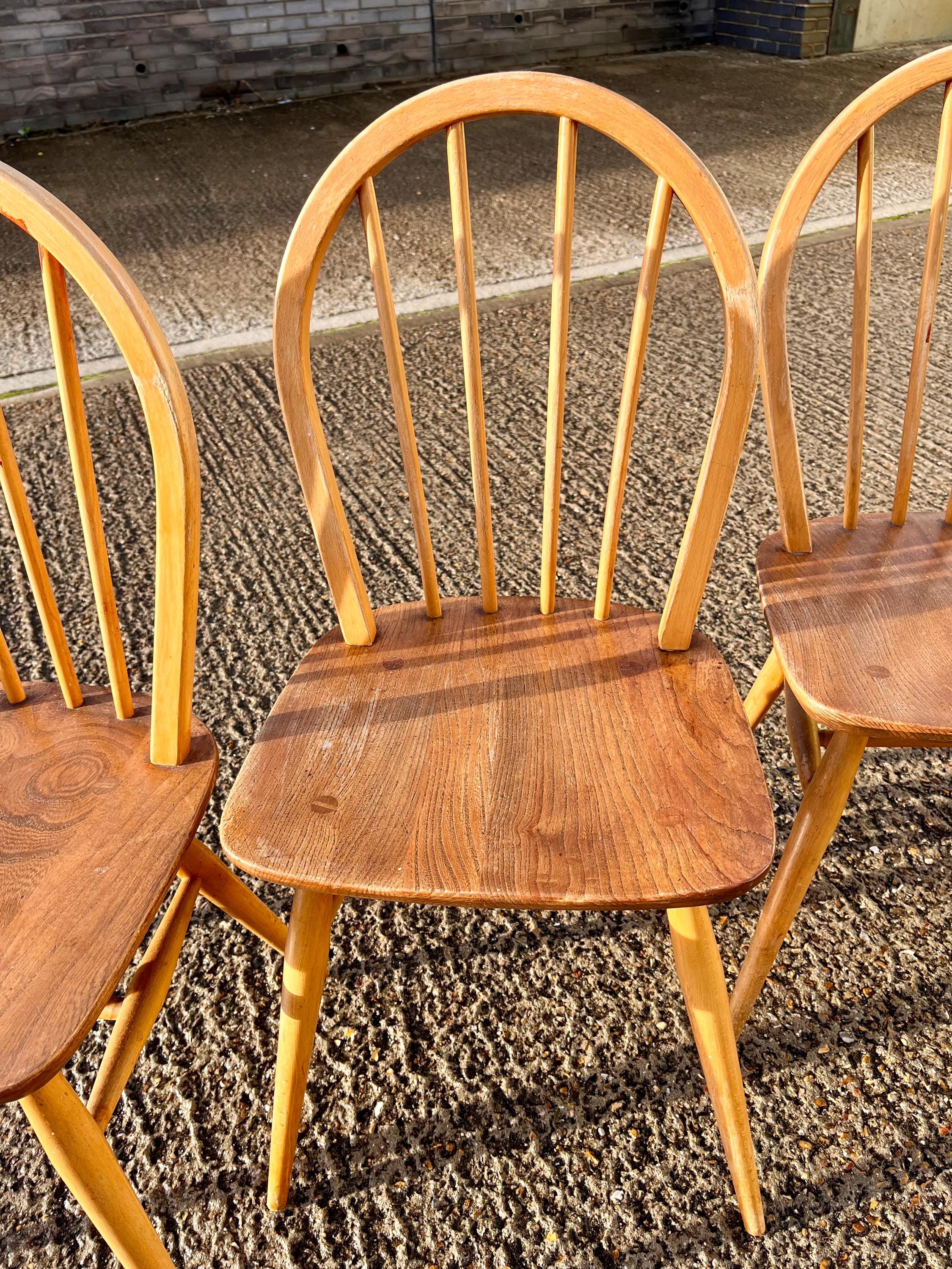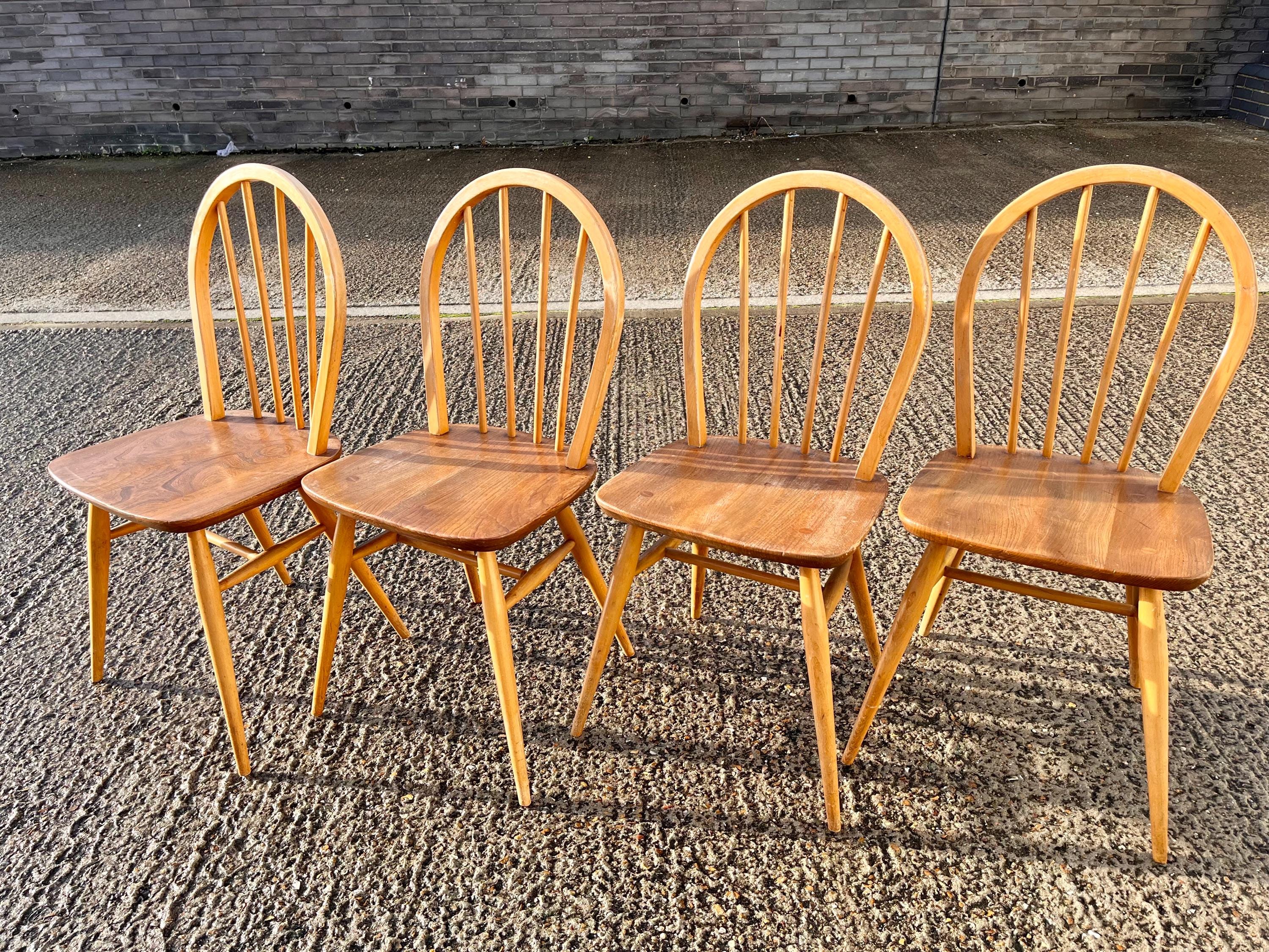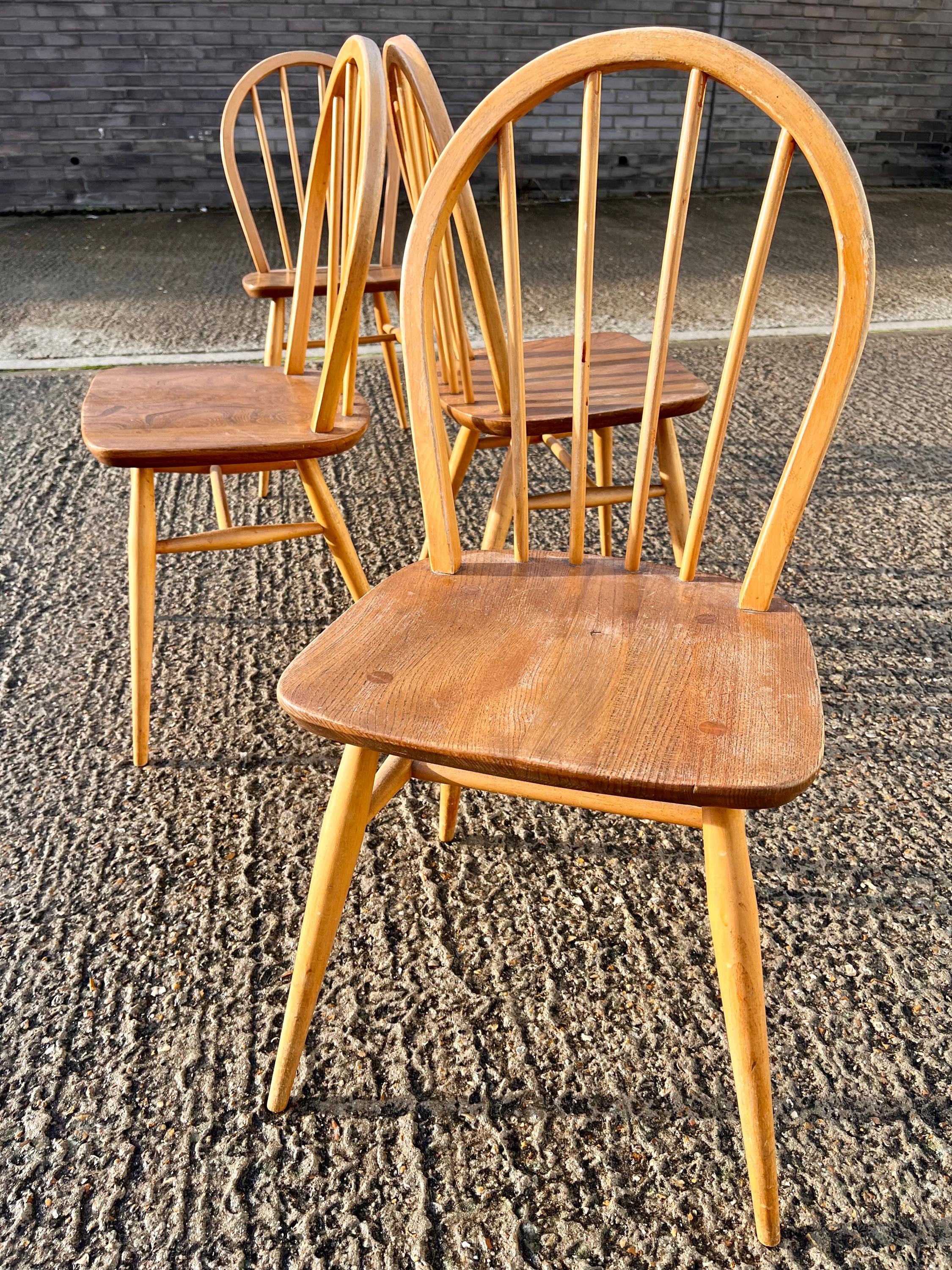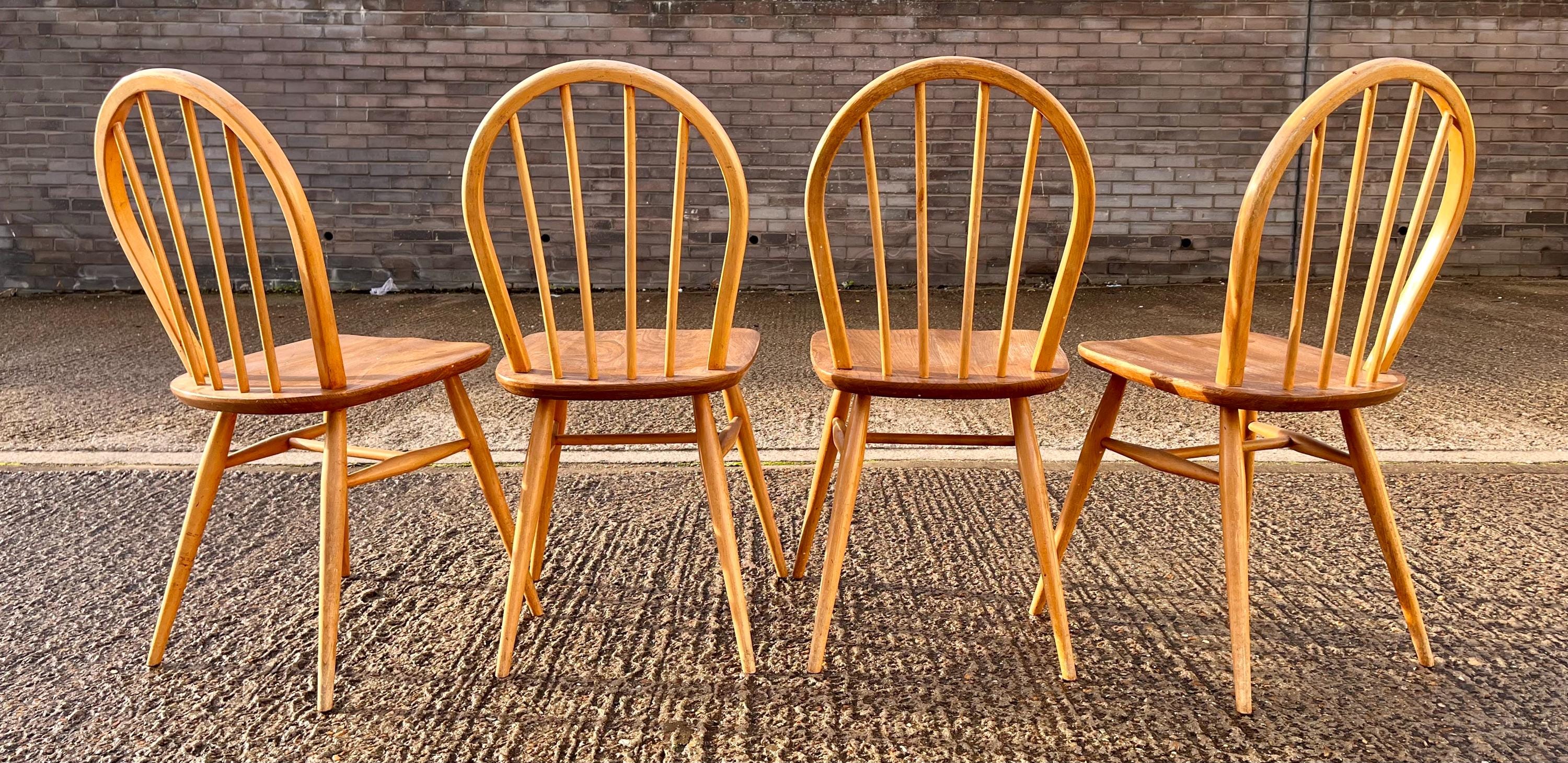 A wonderfully characterful set of four original Ercol Windsor dining chairs, one-owner from new and cherished for over six decades — a true testament to Ercol’s iconic craftsmanship and enduring comfort. Designed with the classic curved bow back and solid elm seats, these chairs have long been celebrated for their timeless blend of farmhouse warmth and modern mid-century simplicity, making them highly collectable and increasingly hard to find in honest, original condition. They are listed here exactly as found due to their popularity, showing their authentic, well-used patina and the gentle wear expected of genuine vintage Ercol pieces. All four are structurally sound and will undergo our usual Lightfoot & Lowe cleaning and oiling process over the next two weeks — not a full strip or refinishing, but a sympathetic refresh that preserves their original character and history. Updated photographs will be added once complete. A beautiful and versatile set that works effortlessly in Scandi, rustic, country, minimalist or MCM interiors, offering comfort, heritage and real craftsmanship. Please feel free to enquire about reserving the set or about any matching Ercol tables or additional chairs that may be available.