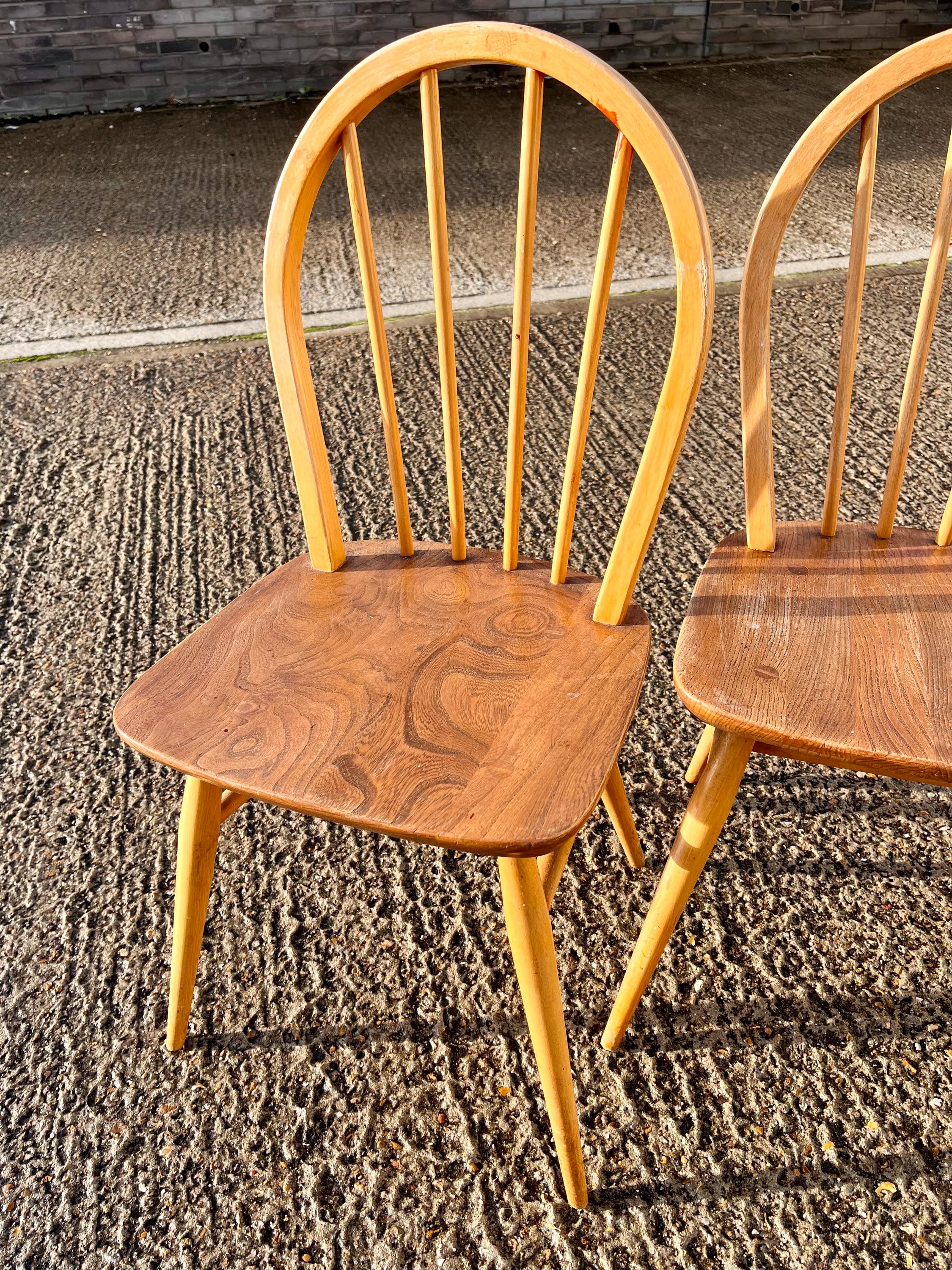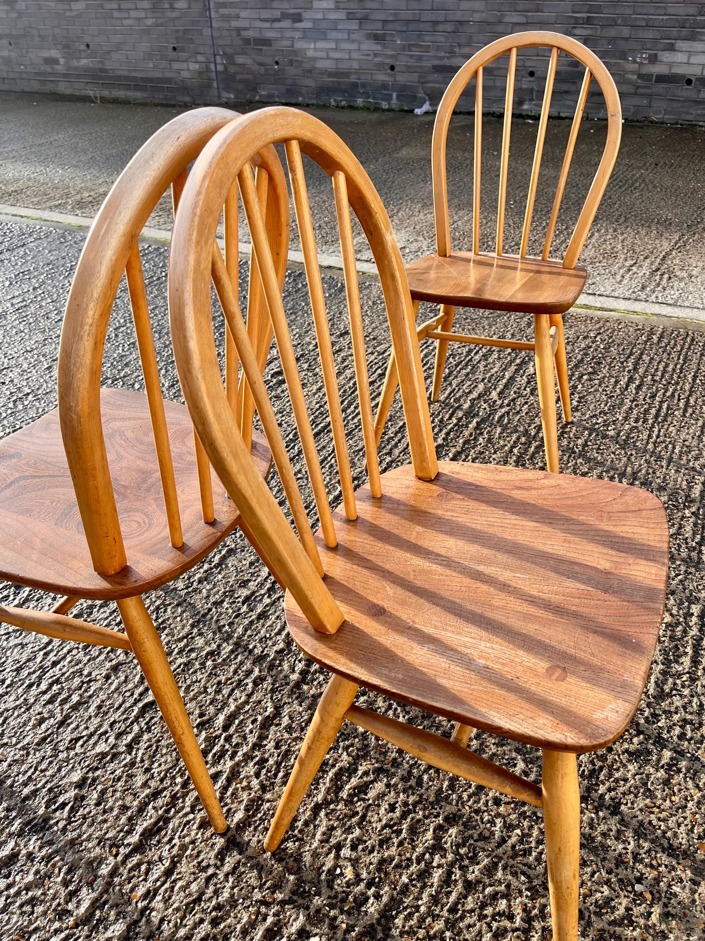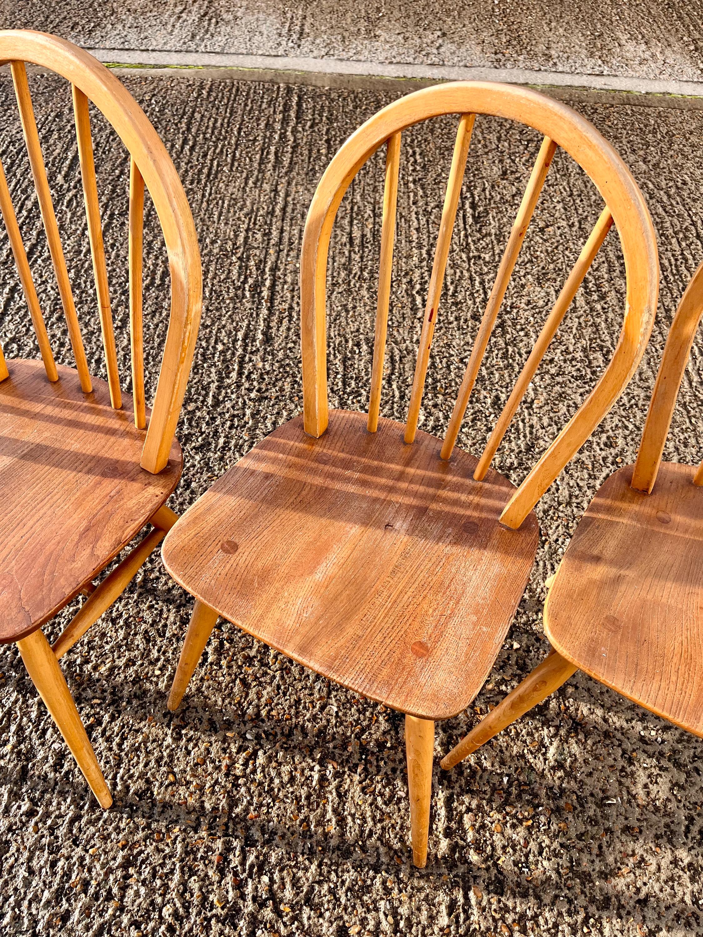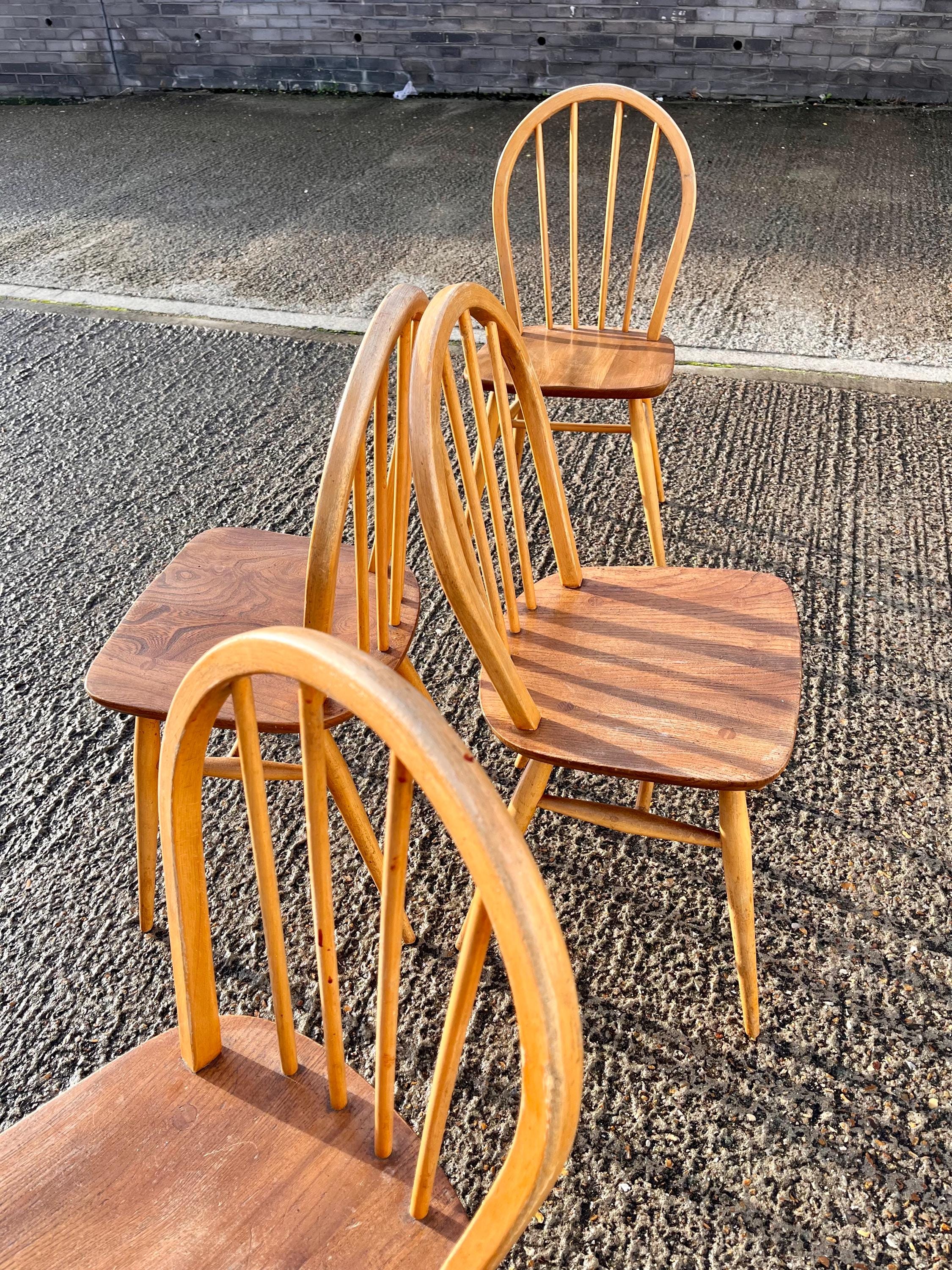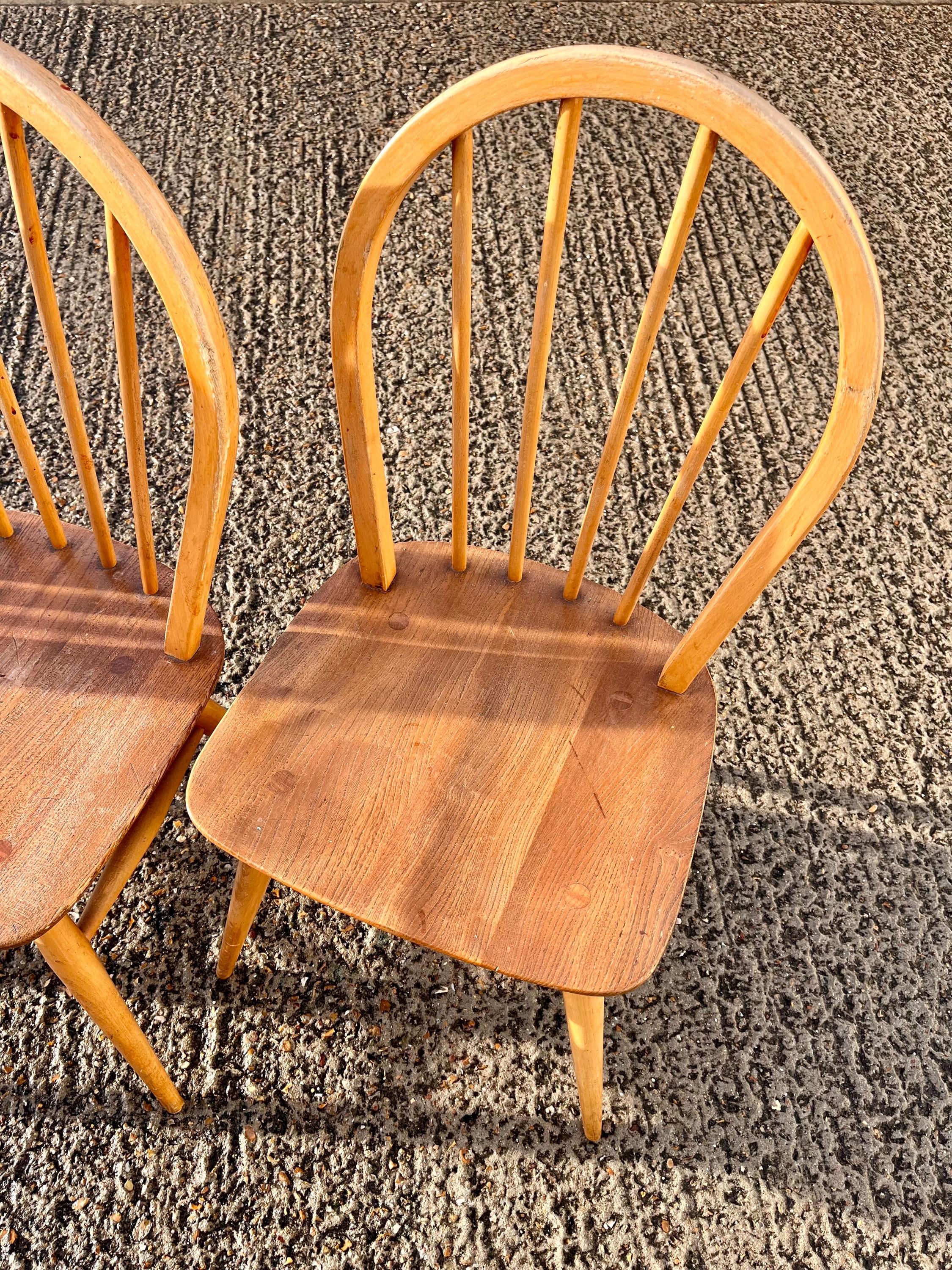 A wonderfully characterful set of four original Ercol Windsor dining chairs, one-owner from new and cherished for over six decades — a true testament to Ercol’s iconic craftsmanship and enduring comfort. Designed with the classic curved bow back and solid elm seats, these chairs have long been celebrated for their timeless blend of farmhouse warmth and modern mid-century simplicity, making them highly collectable and increasingly hard to find in honest, original condition. They are listed here exactly as found due to their popularity, showing their authentic, well-used patina and the gentle wear expected of genuine vintage Ercol pieces. All four are structurally sound and will undergo our usual Lightfoot & Lowe cleaning and oiling process over the next two weeks — not a full strip or refinishing, but a sympathetic refresh that preserves their original character and history. Updated photographs will be added once complete. A beautiful and versatile set that works effortlessly in Scandi, rustic, country, minimalist or MCM interiors, offering comfort, heritage and real craftsmanship. Please feel free to enquire about reserving the set or about any matching Ercol tables or additional chairs that may be available.