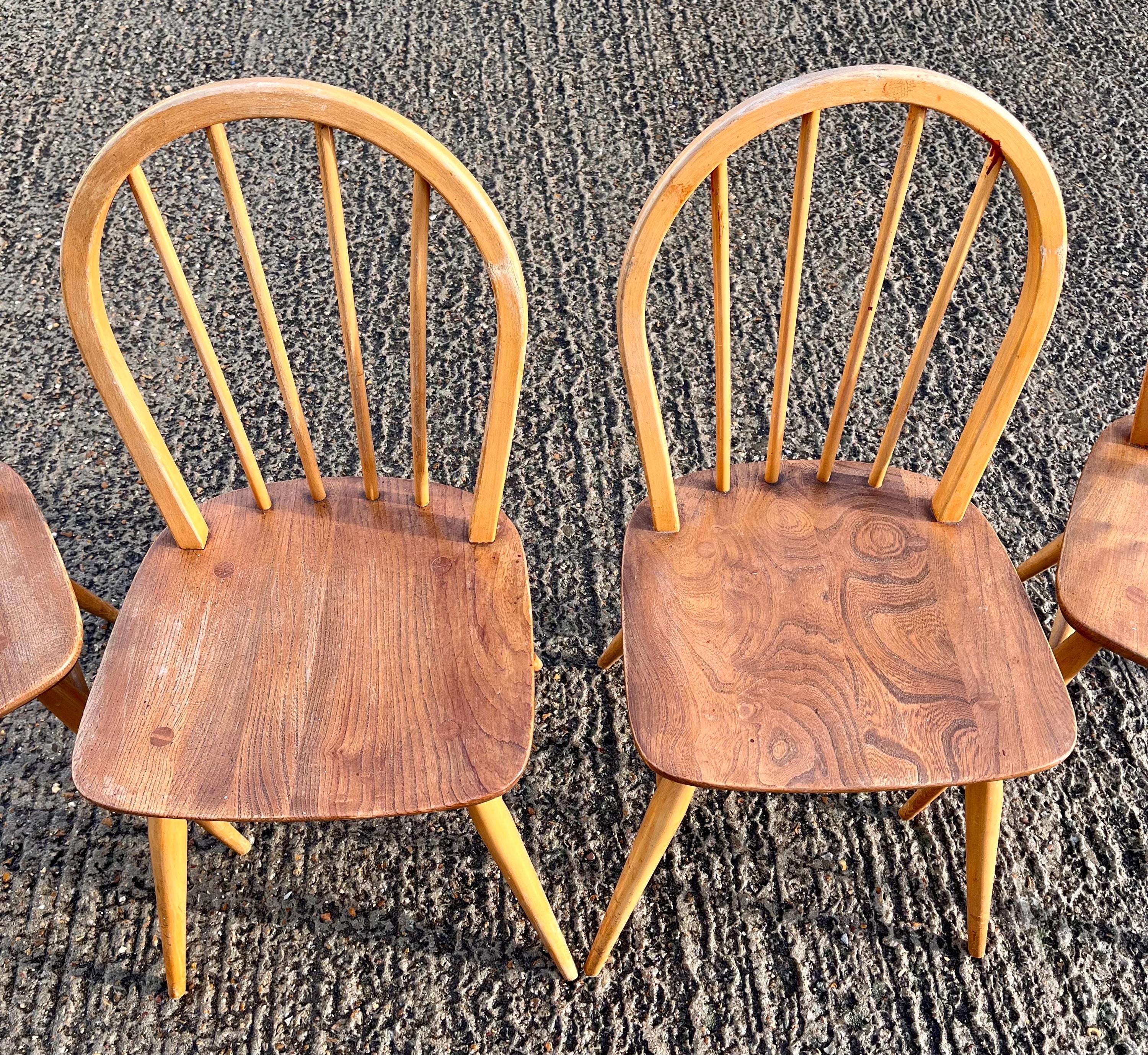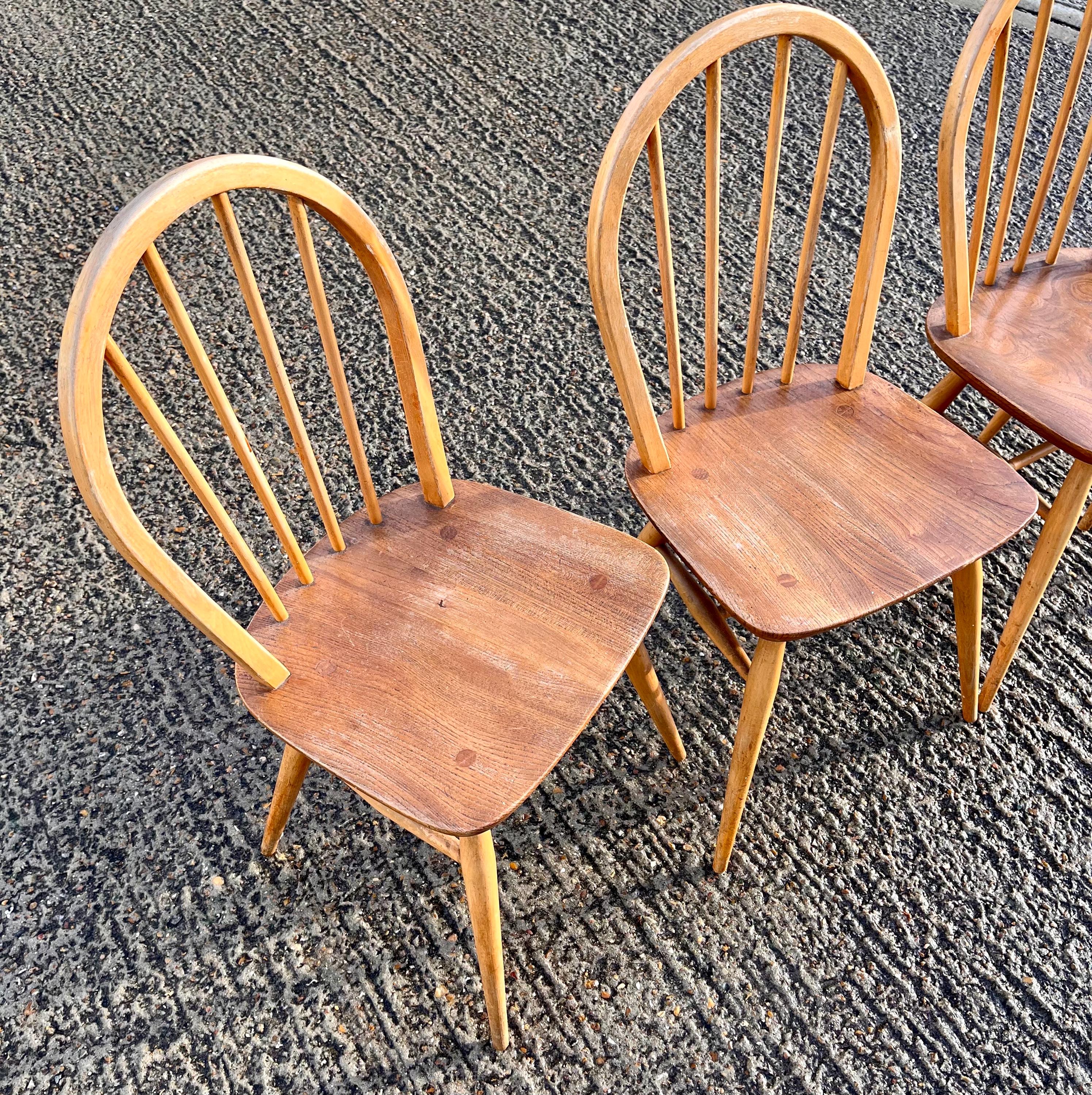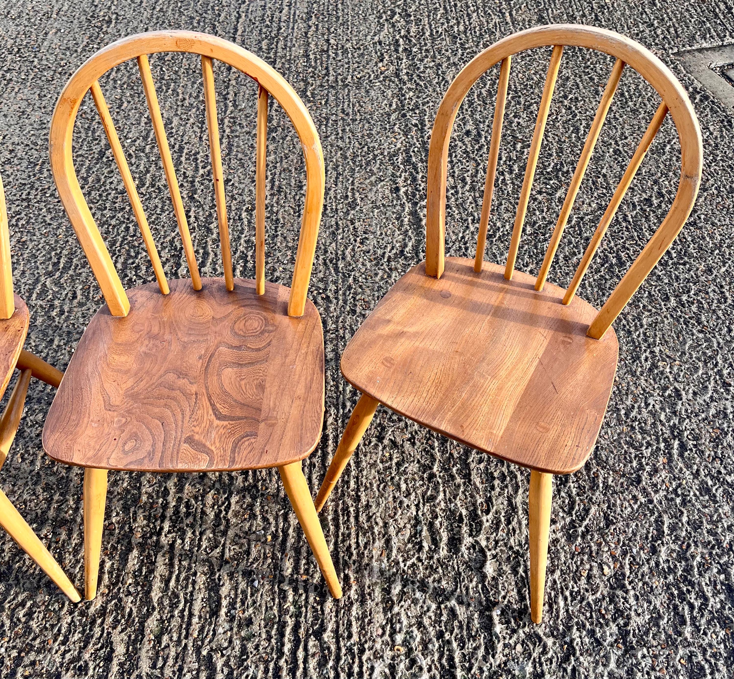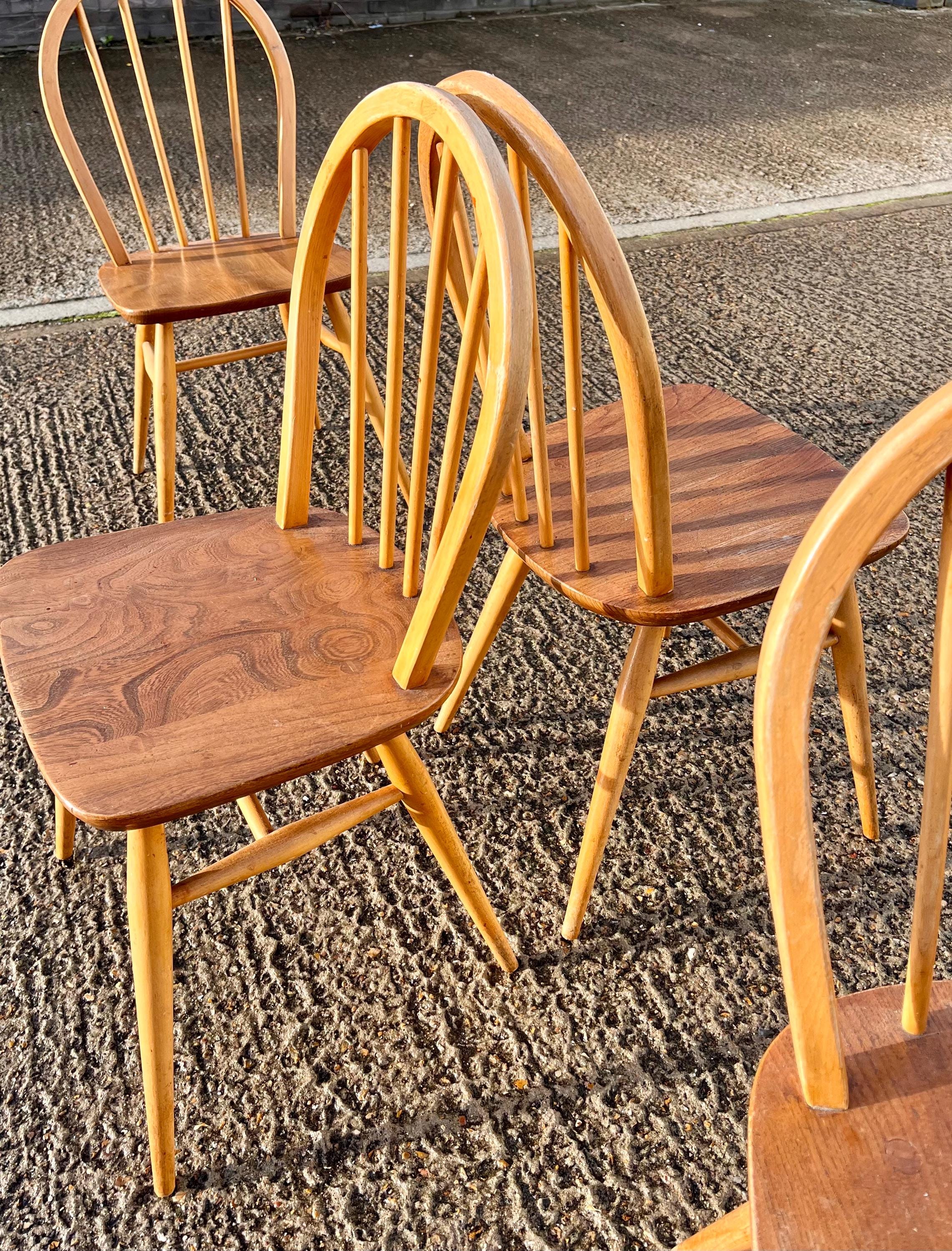 A wonderfully characterful set of four original Ercol Windsor dining chairs, one-owner from new and cherished for over six decades — a true testament to Ercol’s iconic craftsmanship and enduring comfort. Designed with the classic curved bow back and solid elm seats, these chairs have long been celebrated for their timeless blend of farmhouse warmth and modern mid-century simplicity, making them highly collectable and increasingly hard to find in honest, original condition. They are listed here exactly as found due to their popularity, showing their authentic, well-used patina and the gentle wear expected of genuine vintage Ercol pieces. All four are structurally sound and will undergo our usual Lightfoot & Lowe cleaning and oiling process over the next two weeks — not a full strip or refinishing, but a sympathetic refresh that preserves their original character and history. Updated photographs will be added once complete. A beautiful and versatile set that works effortlessly in Scandi, rustic, country, minimalist or MCM interiors, offering comfort, heritage and real craftsmanship. Please feel free to enquire about reserving the set or about any matching Ercol tables or additional chairs that may be available.