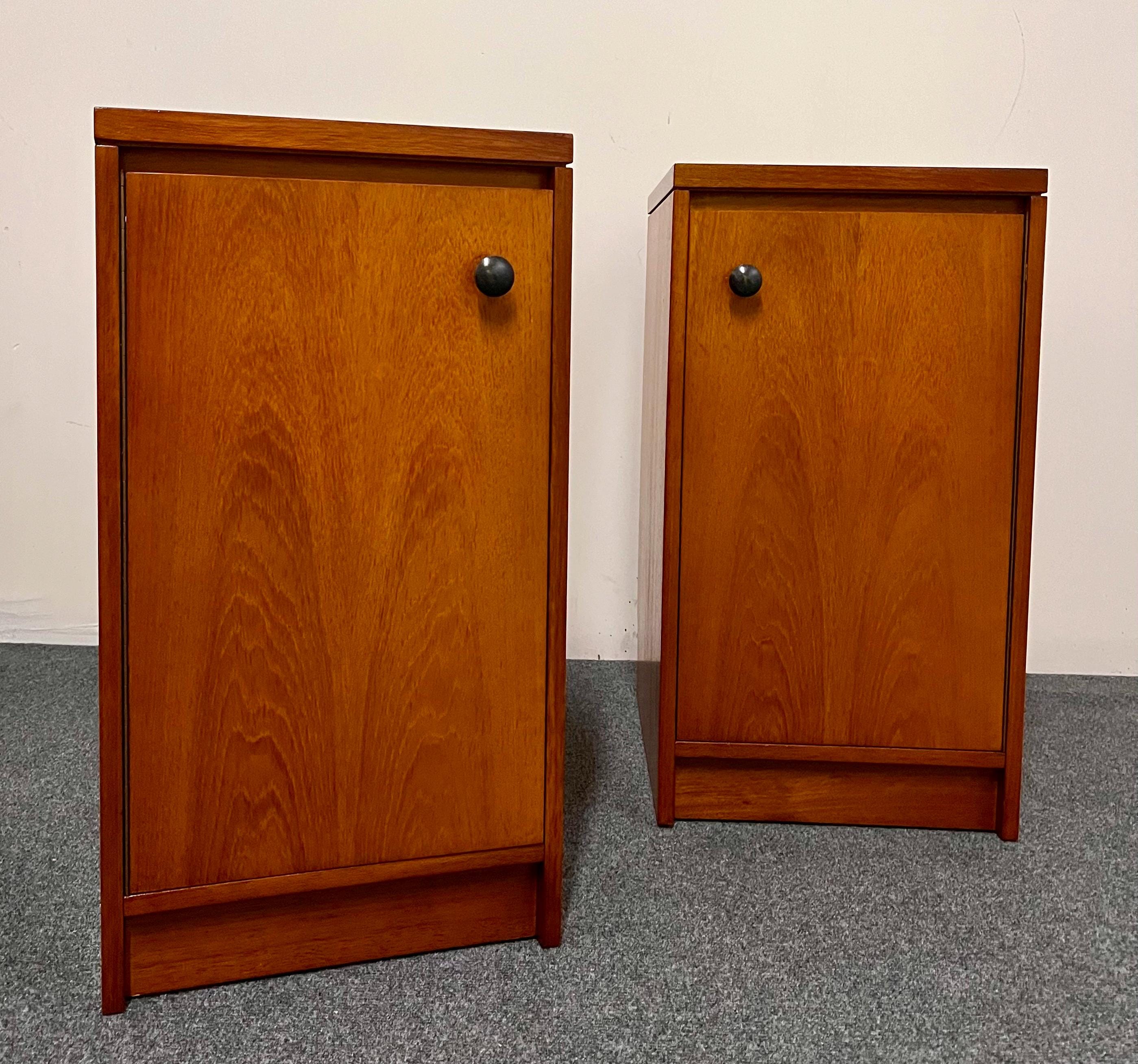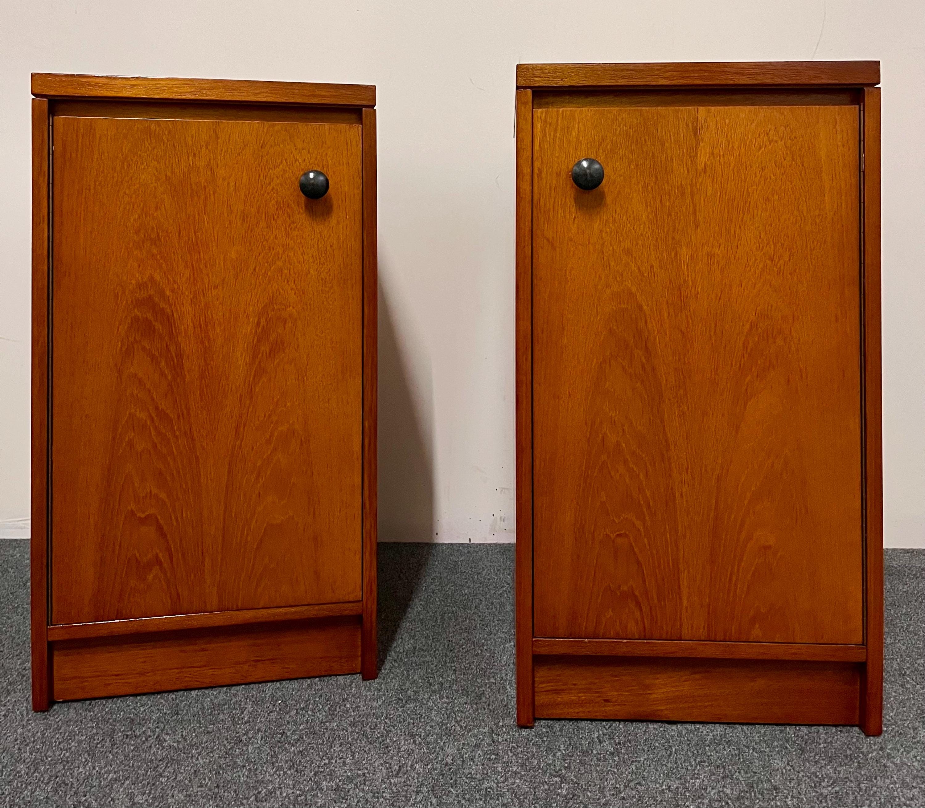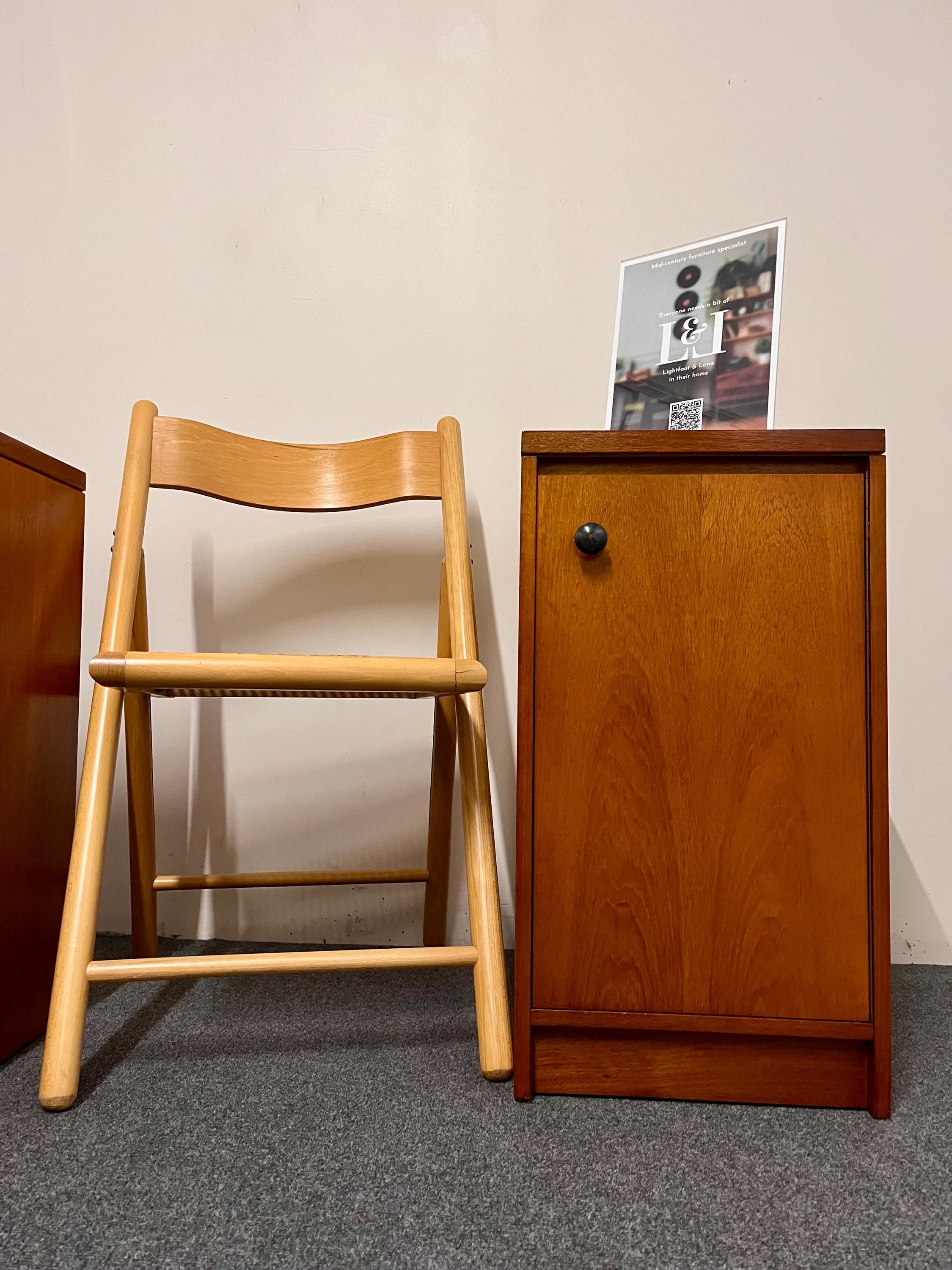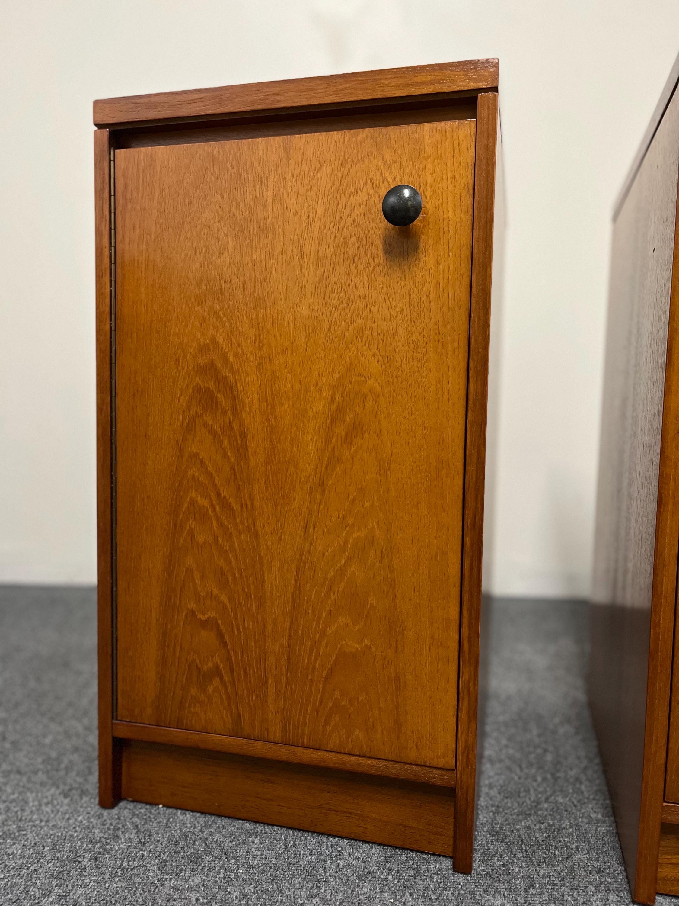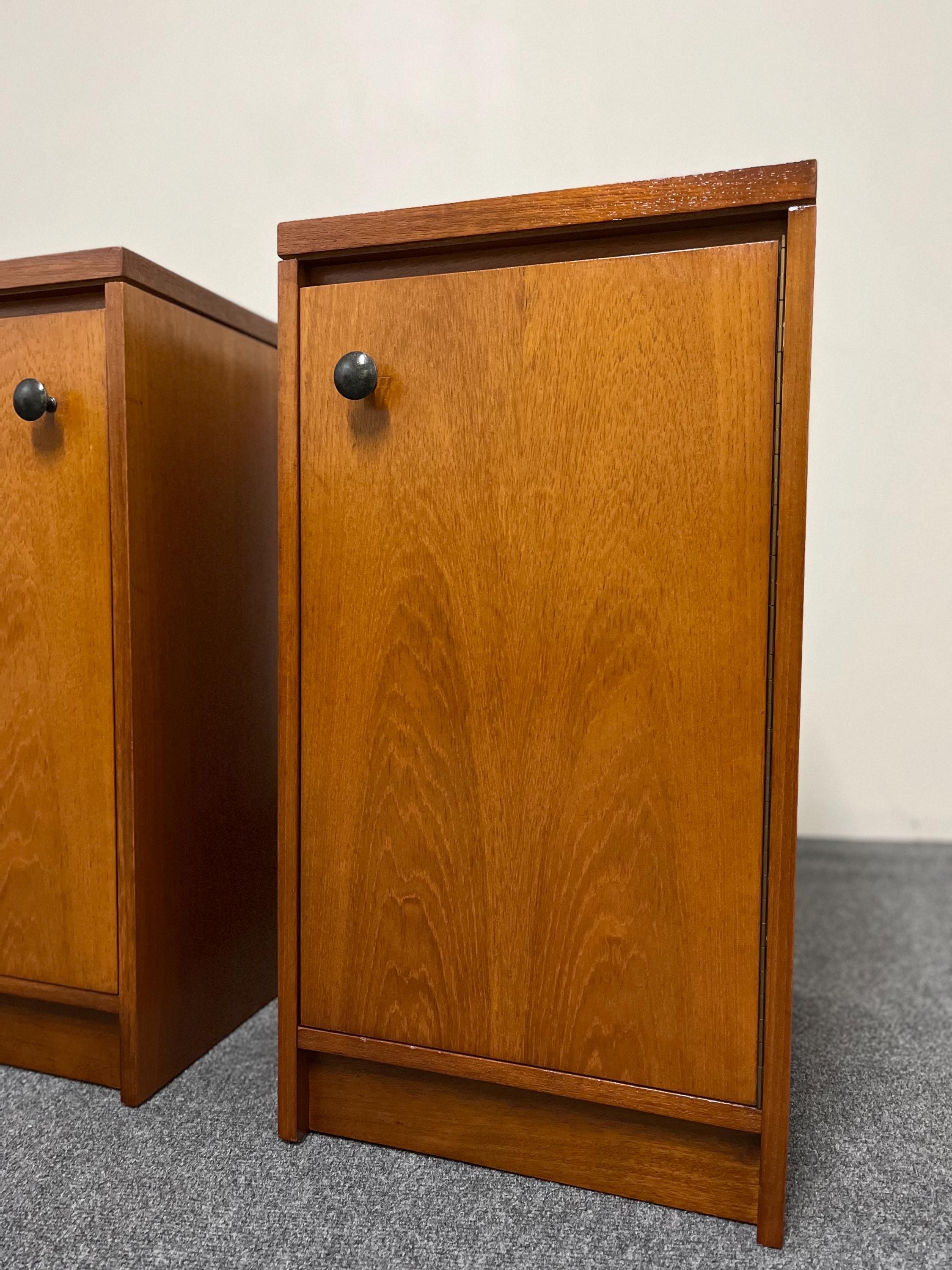 Thoughtful original details such as the skirting-board cut-outs at the rear bases allow the cabinets to sit neatly and flush against a wall, enhancing their practicality in modern homes. These cut-outs differ slightly between the two pieces—a typical feature of hand-finished or small-batch British production—but this is not visible once in place. Elegant, versatile and highly functional, this pair is ideal for both vintage collectors and contemporary interiors seeking authentic, well-crafted mid-century design presented in a compact footprint.