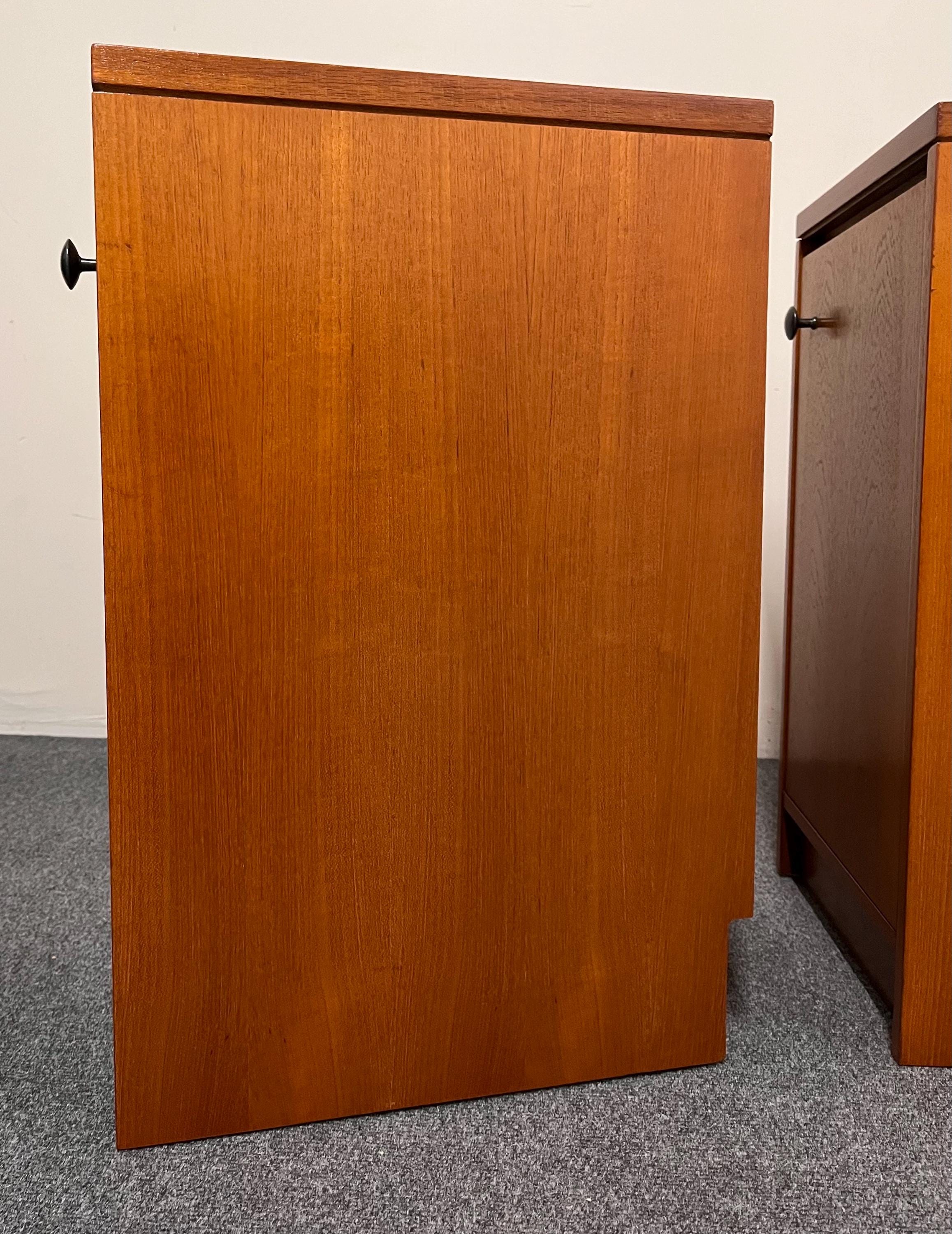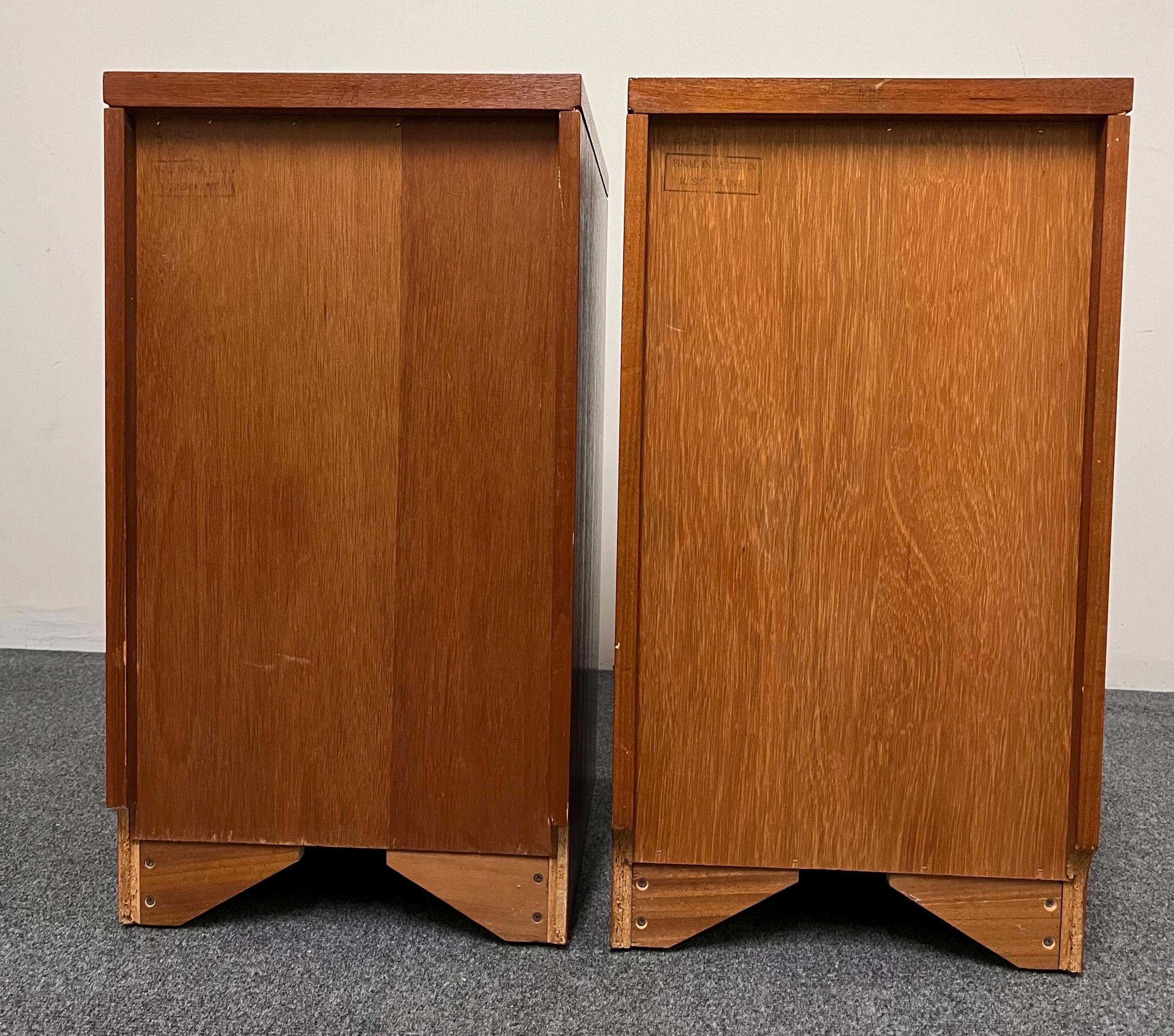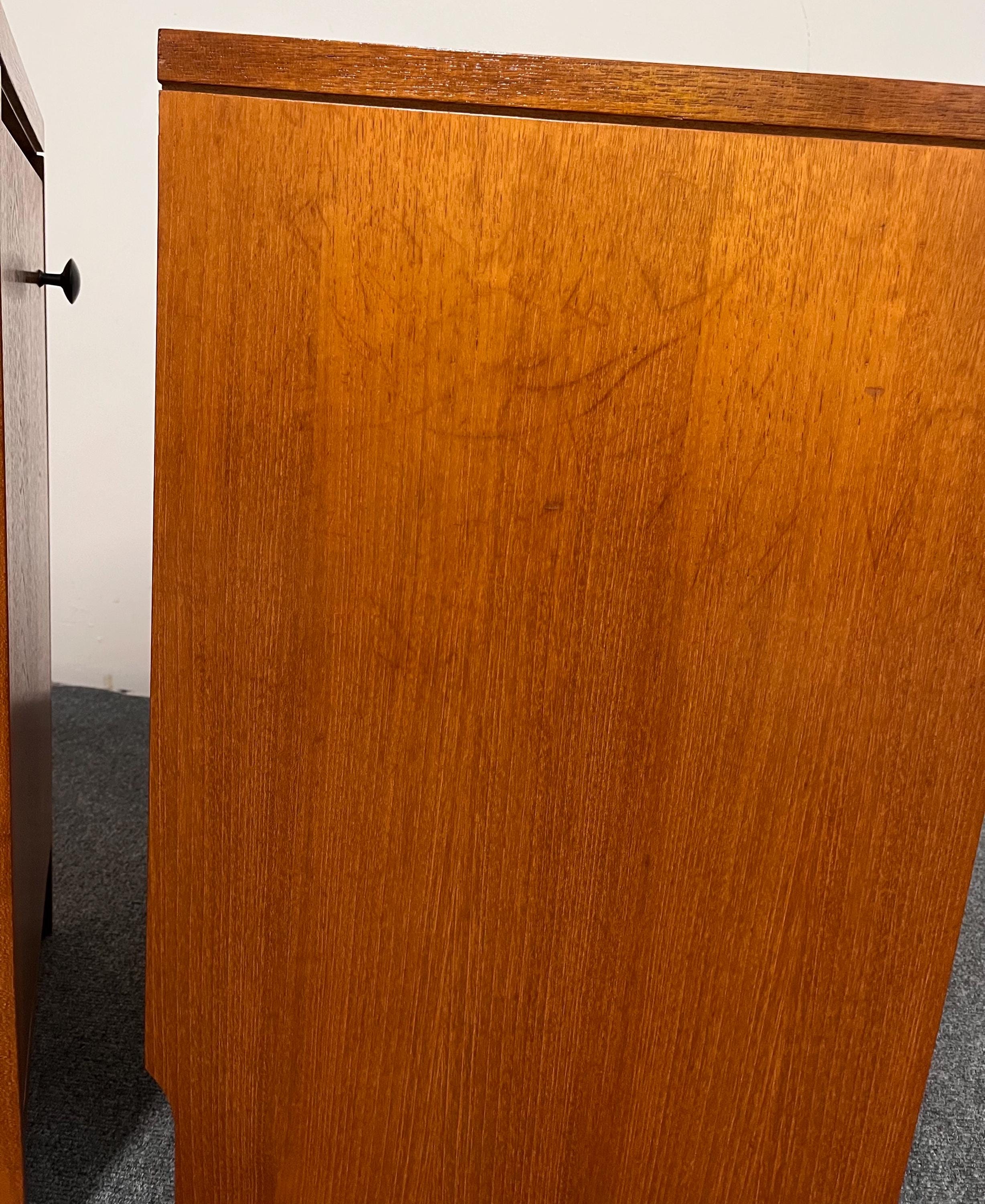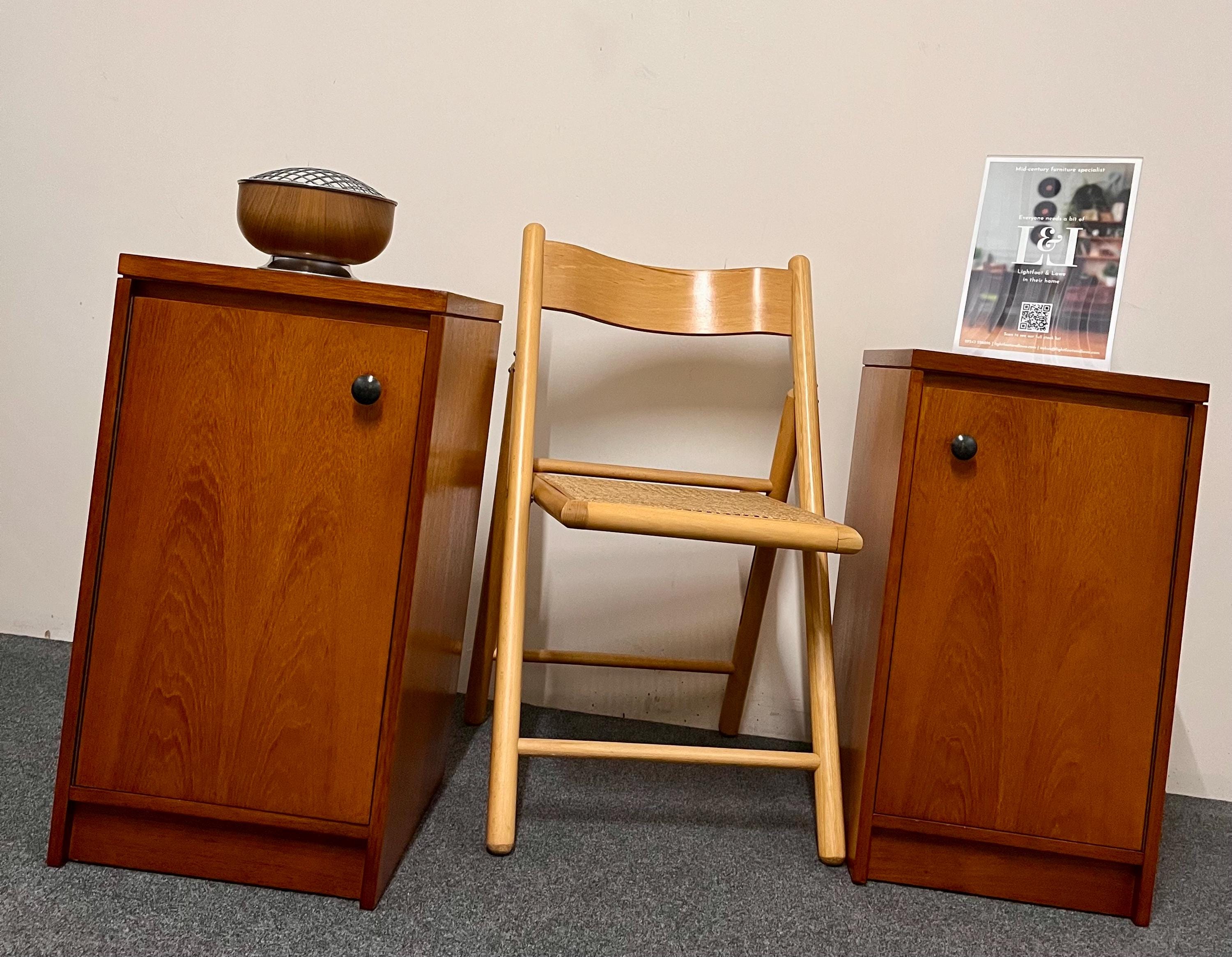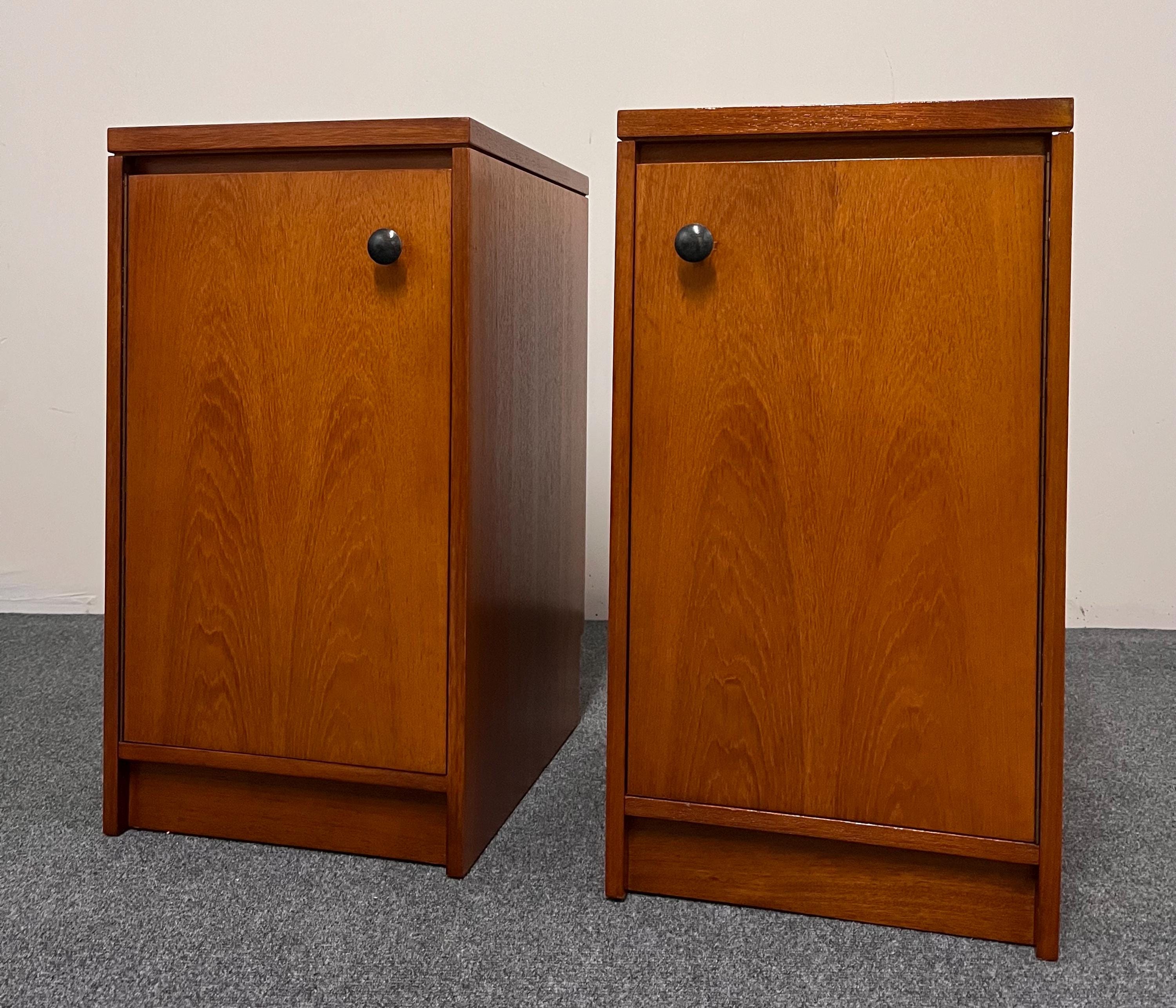 Thoughtful original details such as the skirting-board cut-outs at the rear bases allow the cabinets to sit neatly and flush against a wall, enhancing their practicality in modern homes. These cut-outs differ slightly between the two pieces—a typical feature of hand-finished or small-batch British production—but this is not visible once in place. Elegant, versatile and highly functional, this pair is ideal for both vintage collectors and contemporary interiors seeking authentic, well-crafted mid-century design presented in a compact footprint.