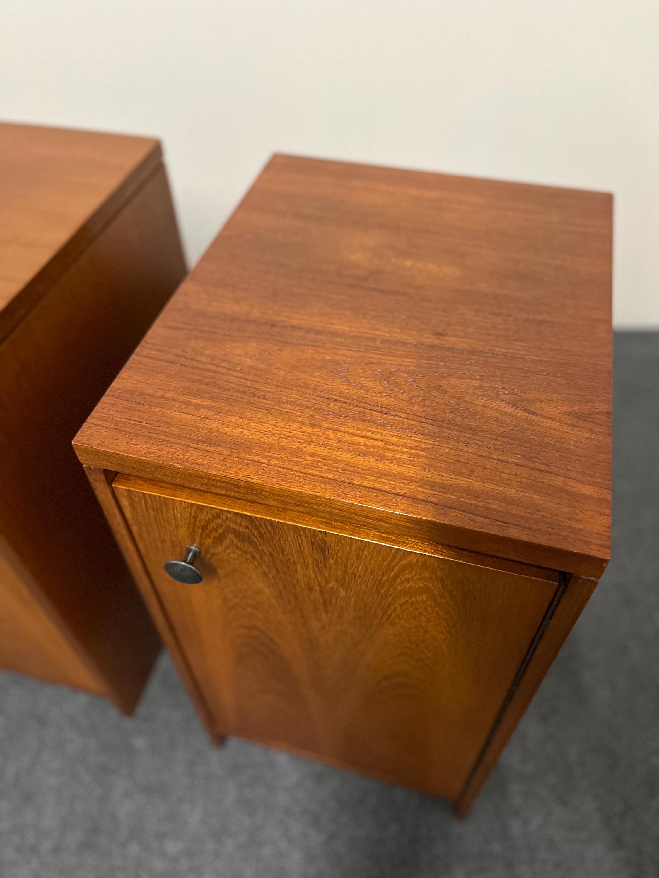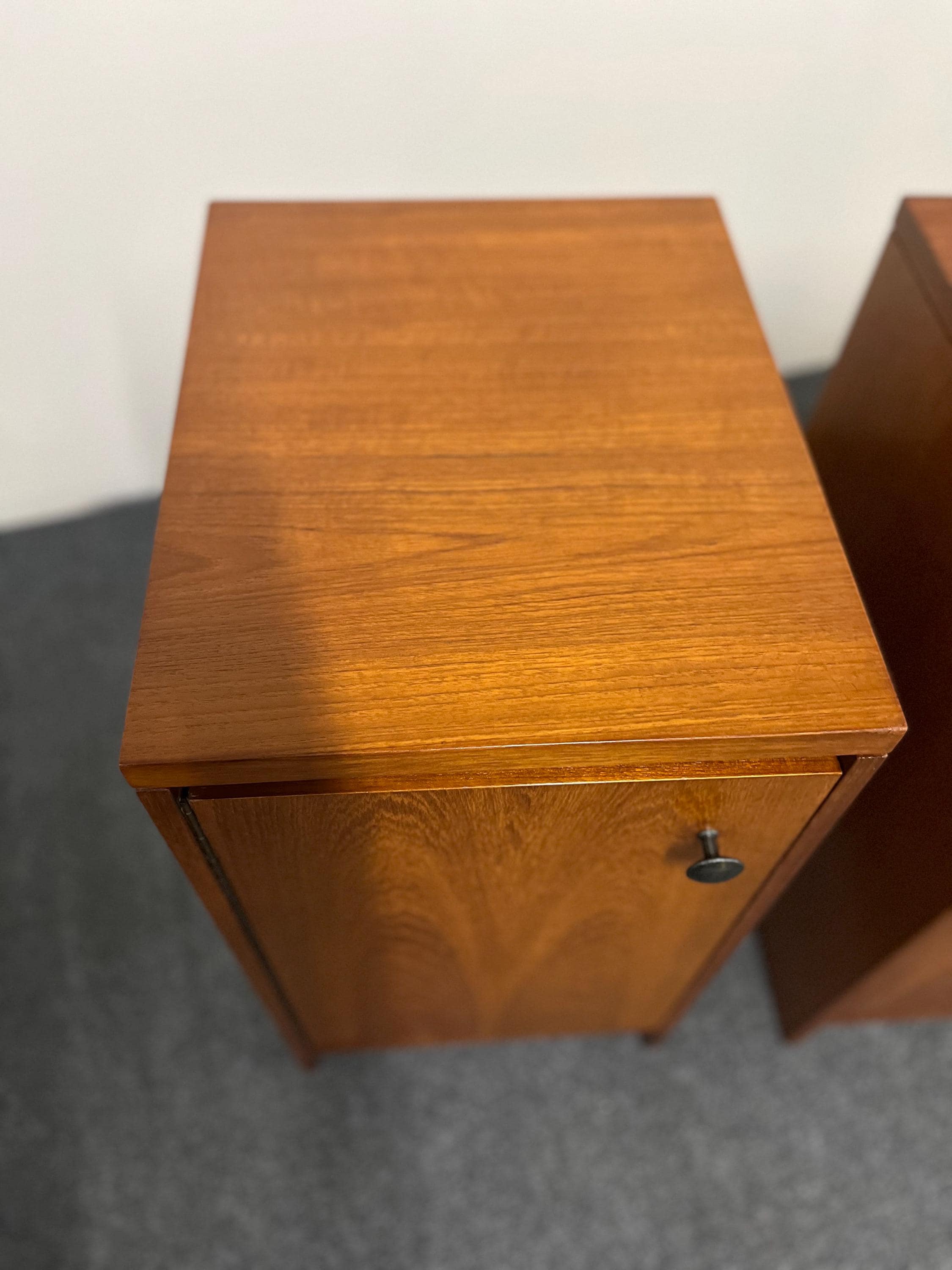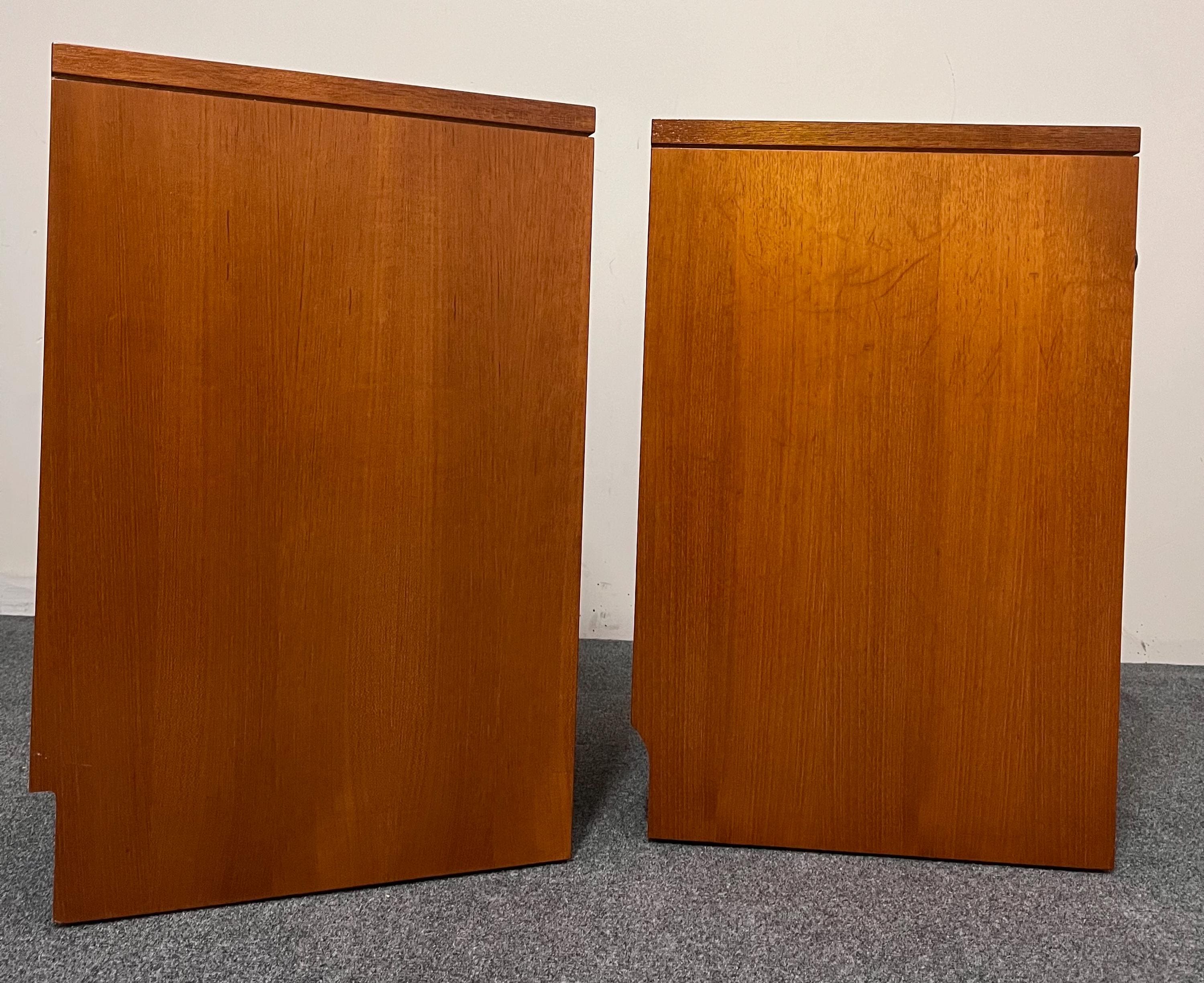 Inside, each cabinet provides excellent storage with a fully removable shelf that simply rests on wooden runners, allowing you to adapt the space to suit your needs. The interiors are clean and refreshed, with one showing a historic ring mark at the base. The doors open smoothly on their original brass hinges and close with a satisfying click, a hallmark of proper mid-century engineering. One door opens to the left and the other to the right, making these the perfect, intentional pair for either side of a bed. Their weight and solidity immediately set them apart from mass-produced cabinets of the time, giving them a premium feel that is increasingly hard to find.