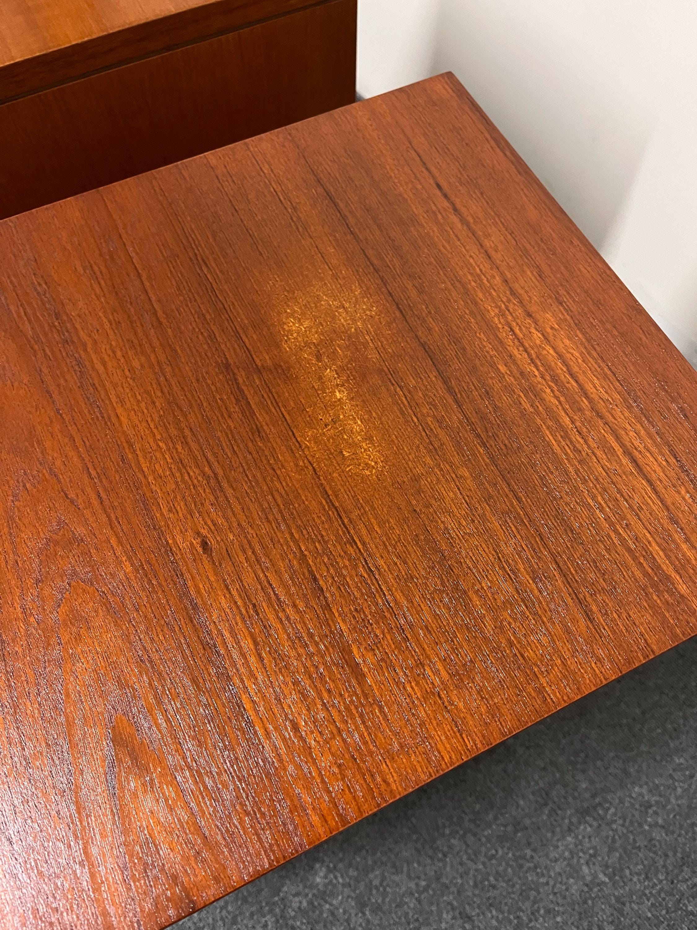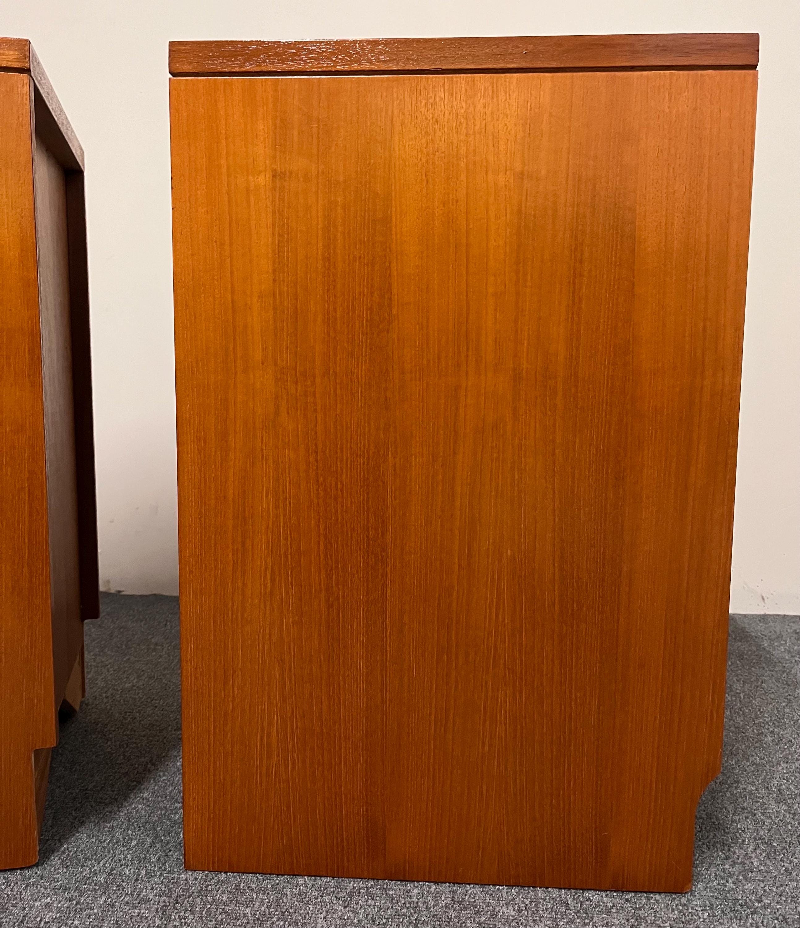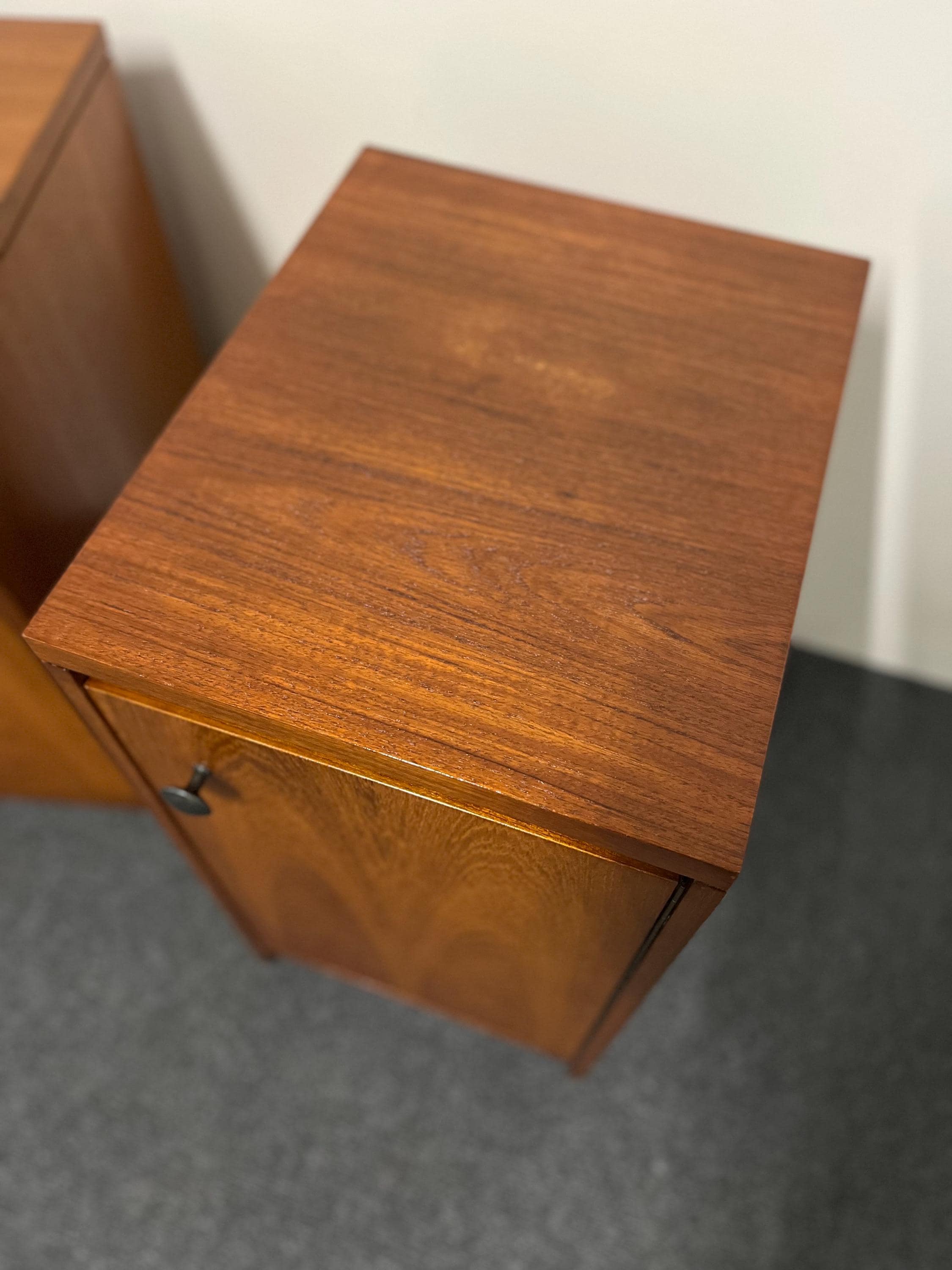 Inside, each cabinet provides excellent storage with a fully removable shelf that simply rests on wooden runners, allowing you to adapt the space to suit your needs. The interiors are clean and refreshed, with one showing a historic ring mark at the base. The doors open smoothly on their original brass hinges and close with a satisfying click, a hallmark of proper mid-century engineering. One door opens to the left and the other to the right, making these the perfect, intentional pair for either side of a bed. Their weight and solidity immediately set them apart from mass-produced cabinets of the time, giving them a premium feel that is increasingly hard to find.