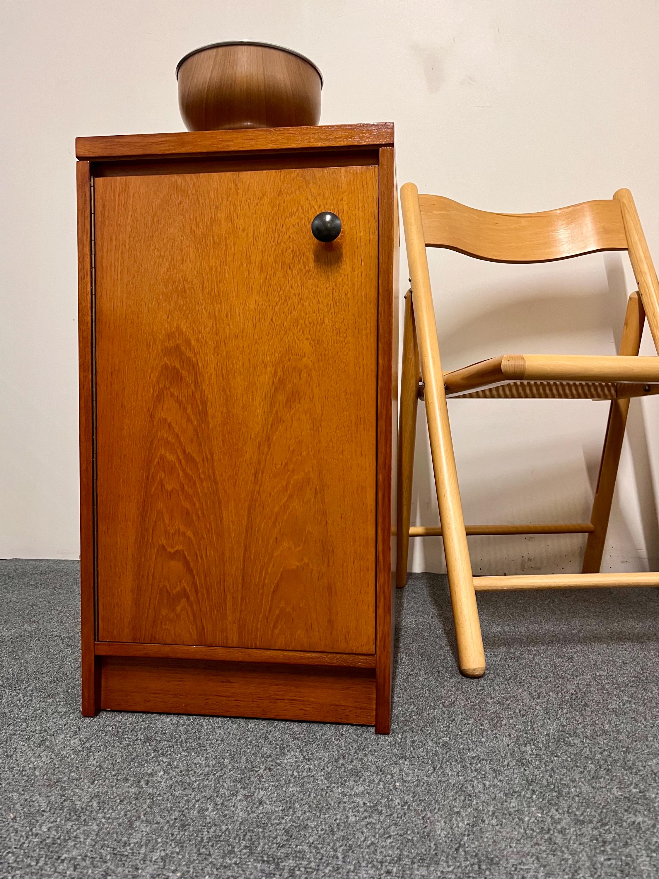 William Lawrence furniture was sold as quality modern bedroom and living room suites across the UK and sits comfortably in the same bracket as makers like Nathan, Stonehill, Meredew and other good British manufacturers of the 1960s and 70s. Matching left and right opening lockers are becoming a rarity and are a great find when they appear on the market - this set demonstrates exactly why William Lawrence pieces remain so sought after: heavy, robust frames, full-length brass hinges, and a clean, architectural silhouette that suits both masculine and minimalist modern interiors. Compact, stylish and practical, they offer true mid-century quality with a timeless presence.