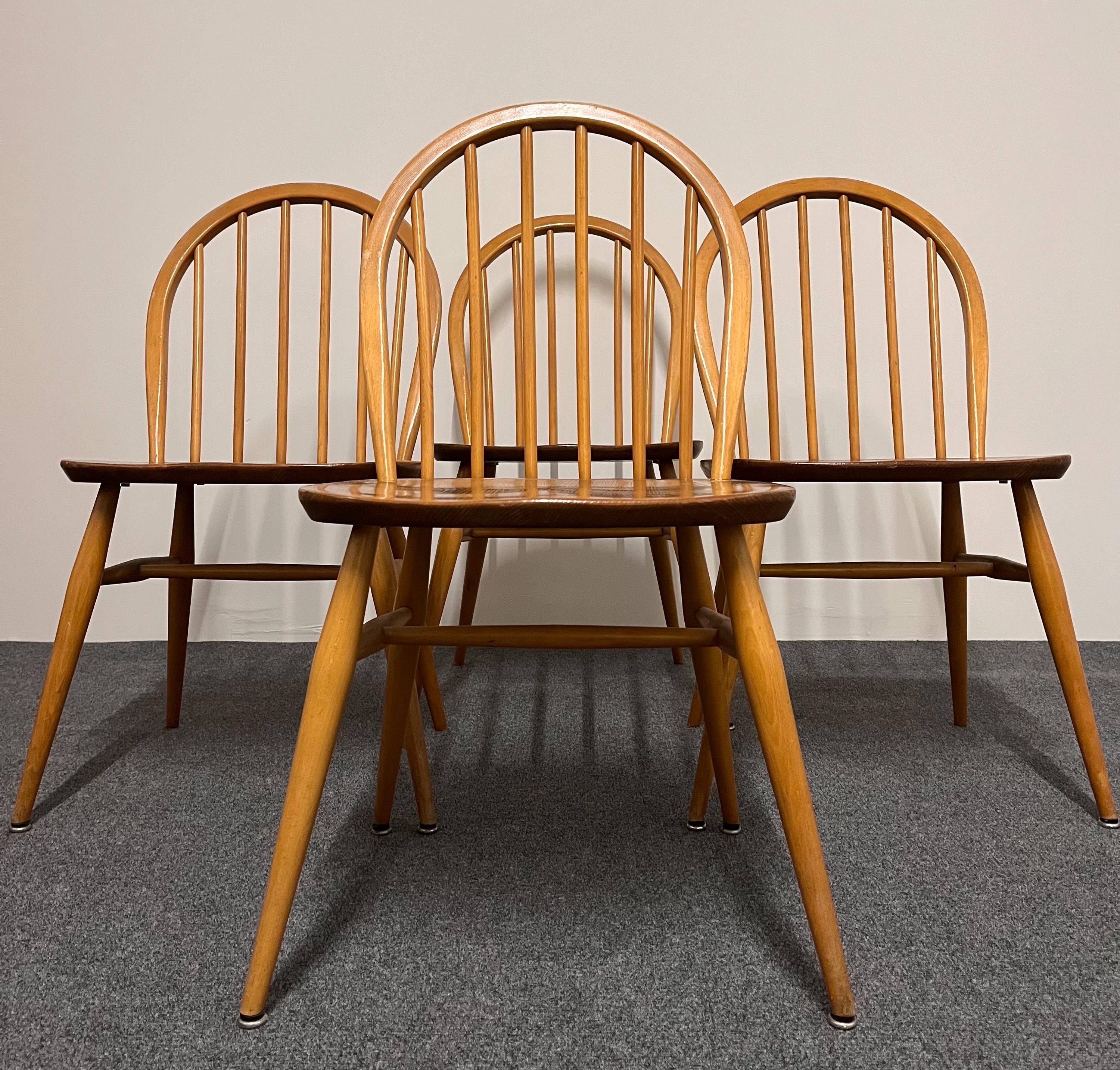 Becoming increasingly difficult to source, this original set of four Ercol Windsor Model 370 dining chairs has been owned by one family since new. Crafted in High Wycombe from solid English elm and beech, the set most likely dates from the late 1970s to early 1980s and retains its original factory finish. The Model 370 features Ercol’s later six-spindle back and the wider, oyster-shaped seat—an evolution from the earlier four-spindle design—offering noticeably greater comfort and support. Each chair also carries its original Ercol gold label underneath, confirming authenticity.