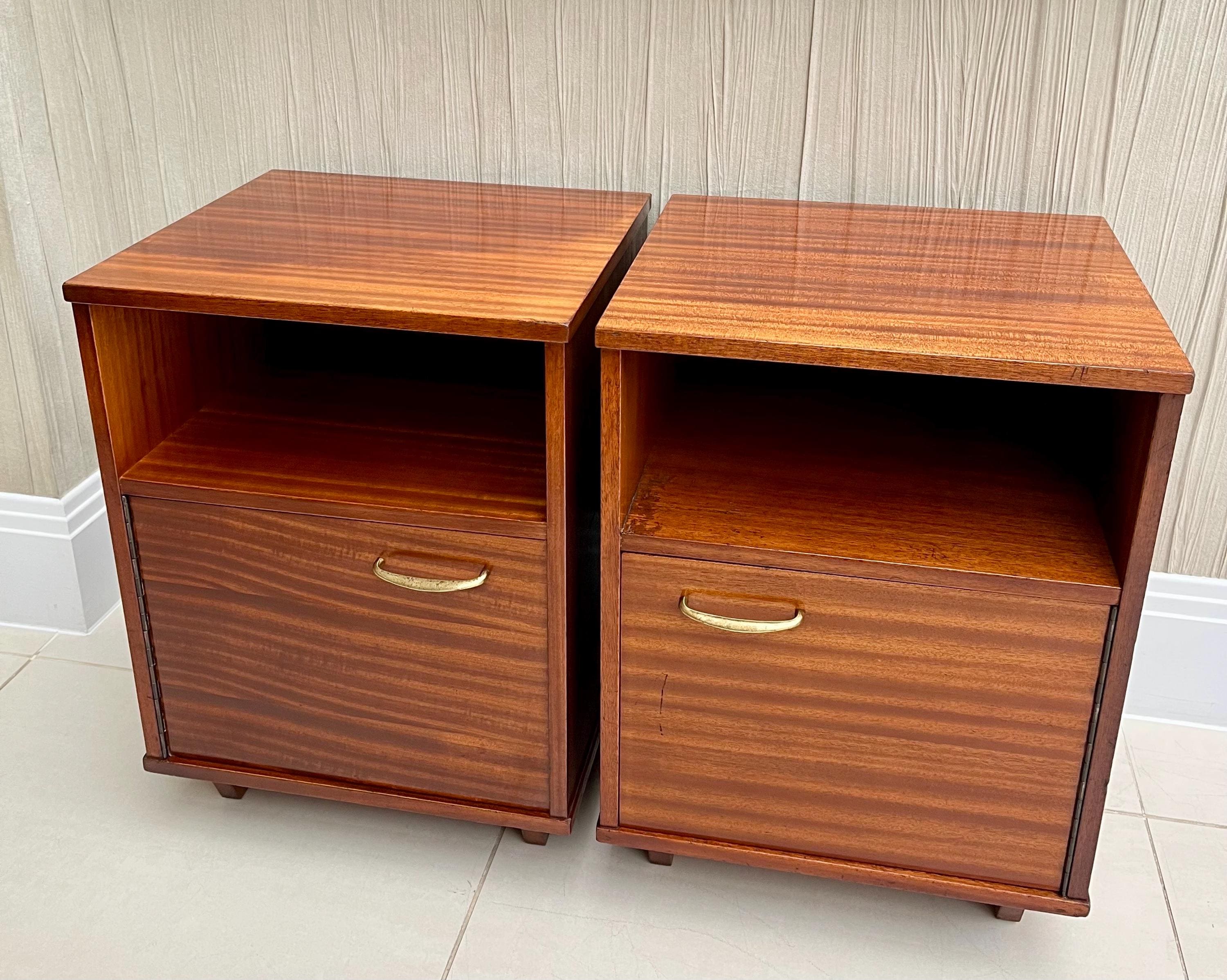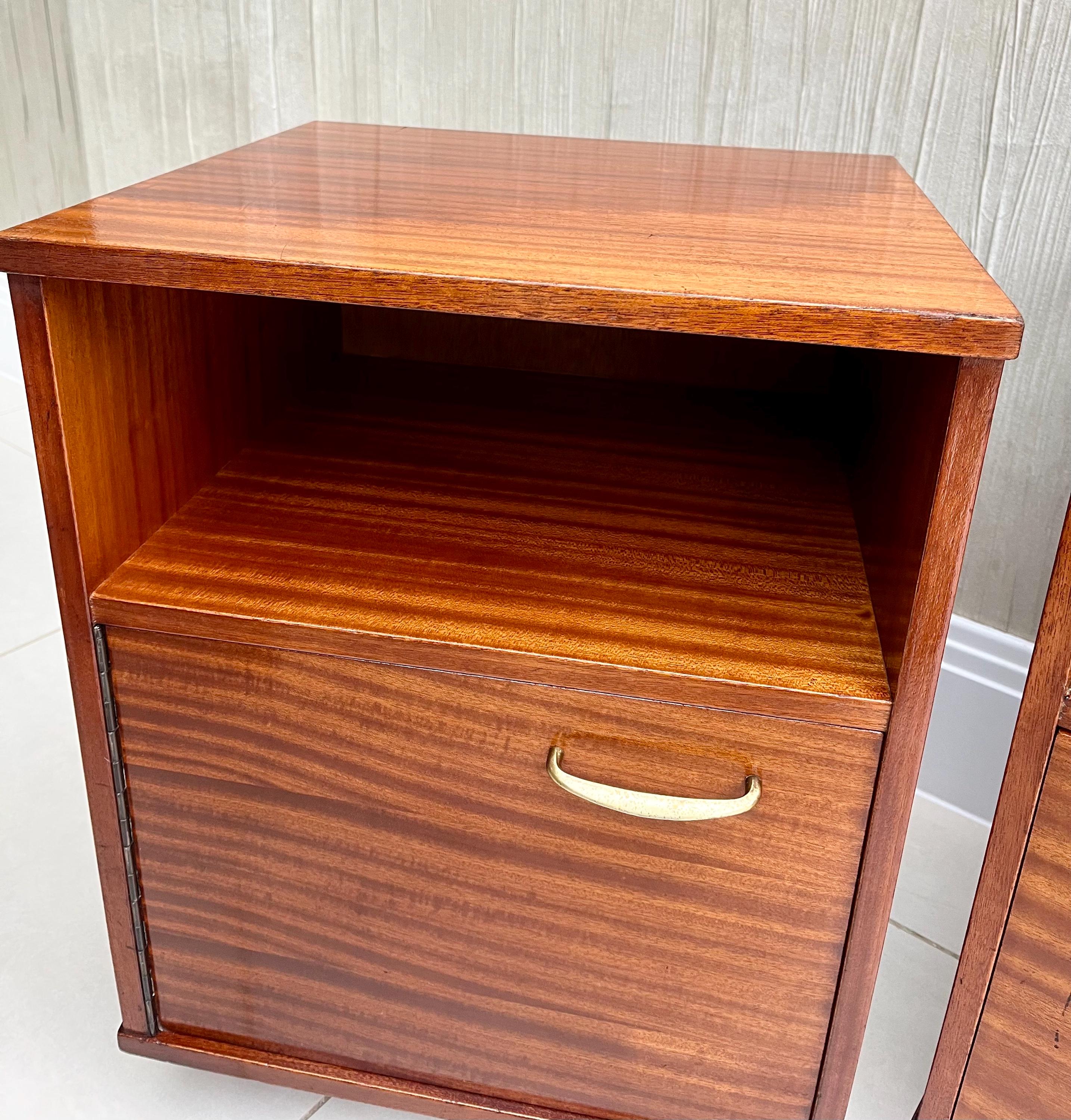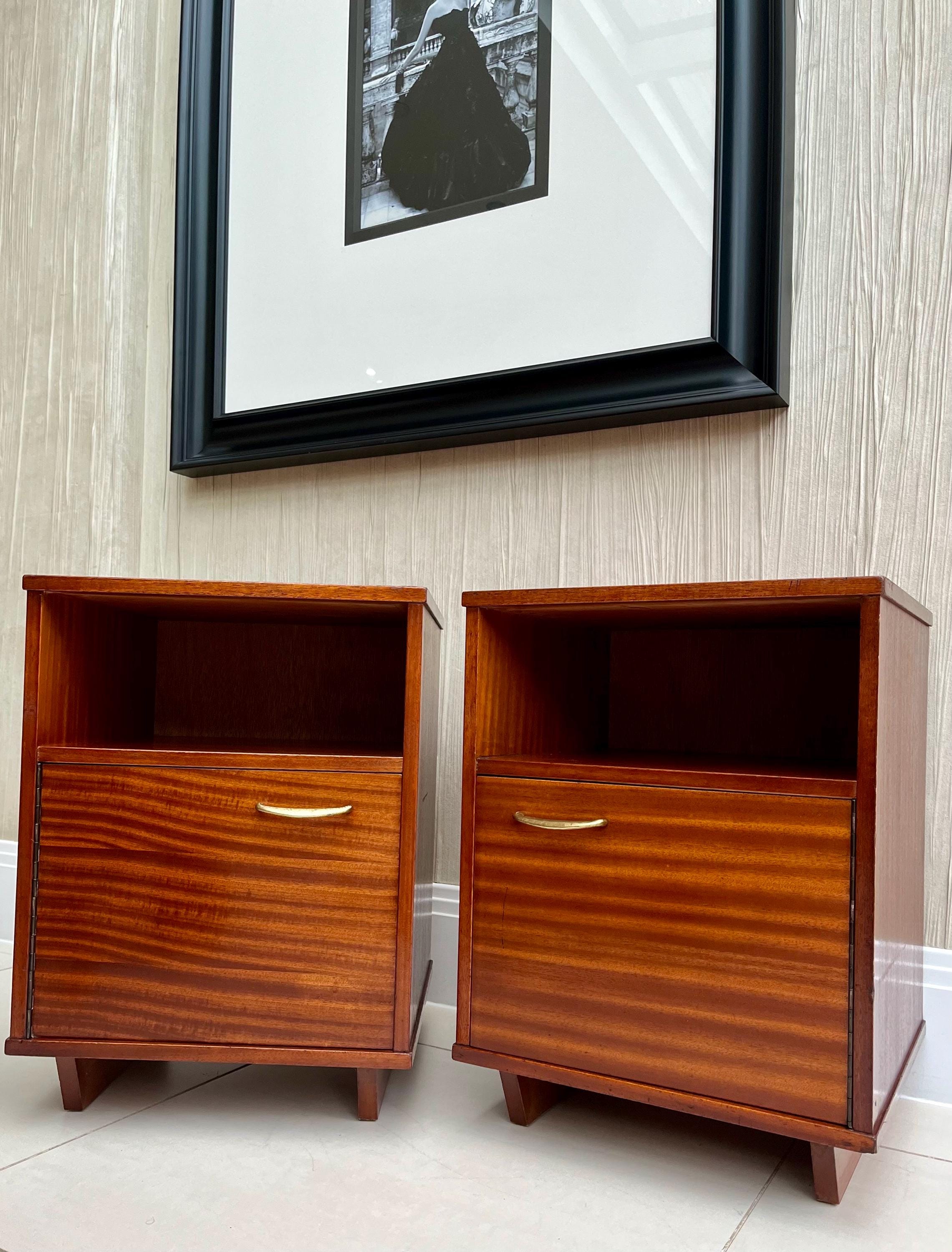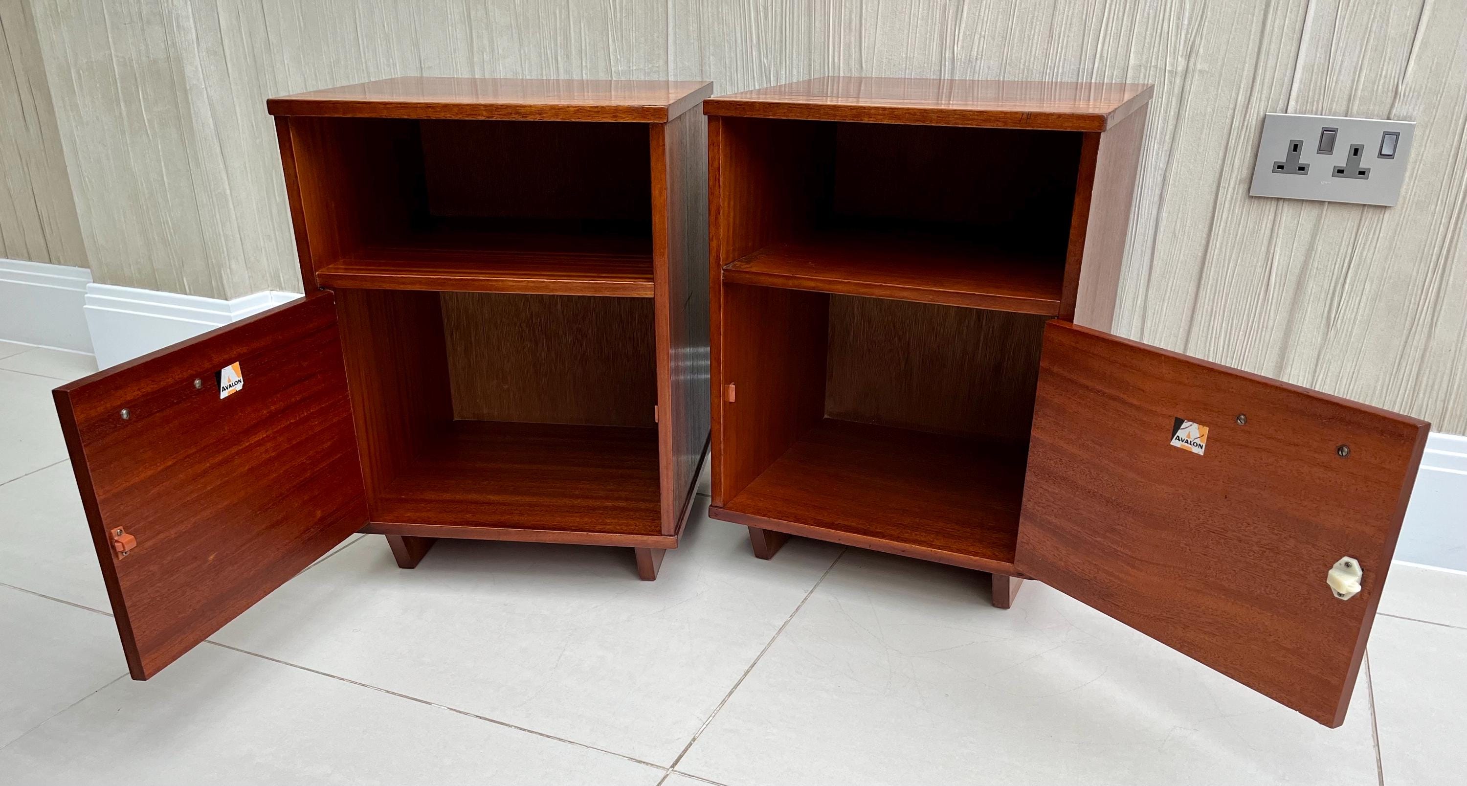 Each cabinet is finished in a warm rich teak veneer with attractive natural grain detail, complemented by the original brass handles. Designed as a true pair, one cabinet opens to the left and the other to the right, making them ideal for either side of the bed. The layout is practical and visually balanced, with an open upper shelf for books, lamps or display, and a lower cupboard providing generous enclosed storage. The cabinets sit on distinctive side plinth feet, giving them a strong, architectural stance that works particularly well in modern homes.