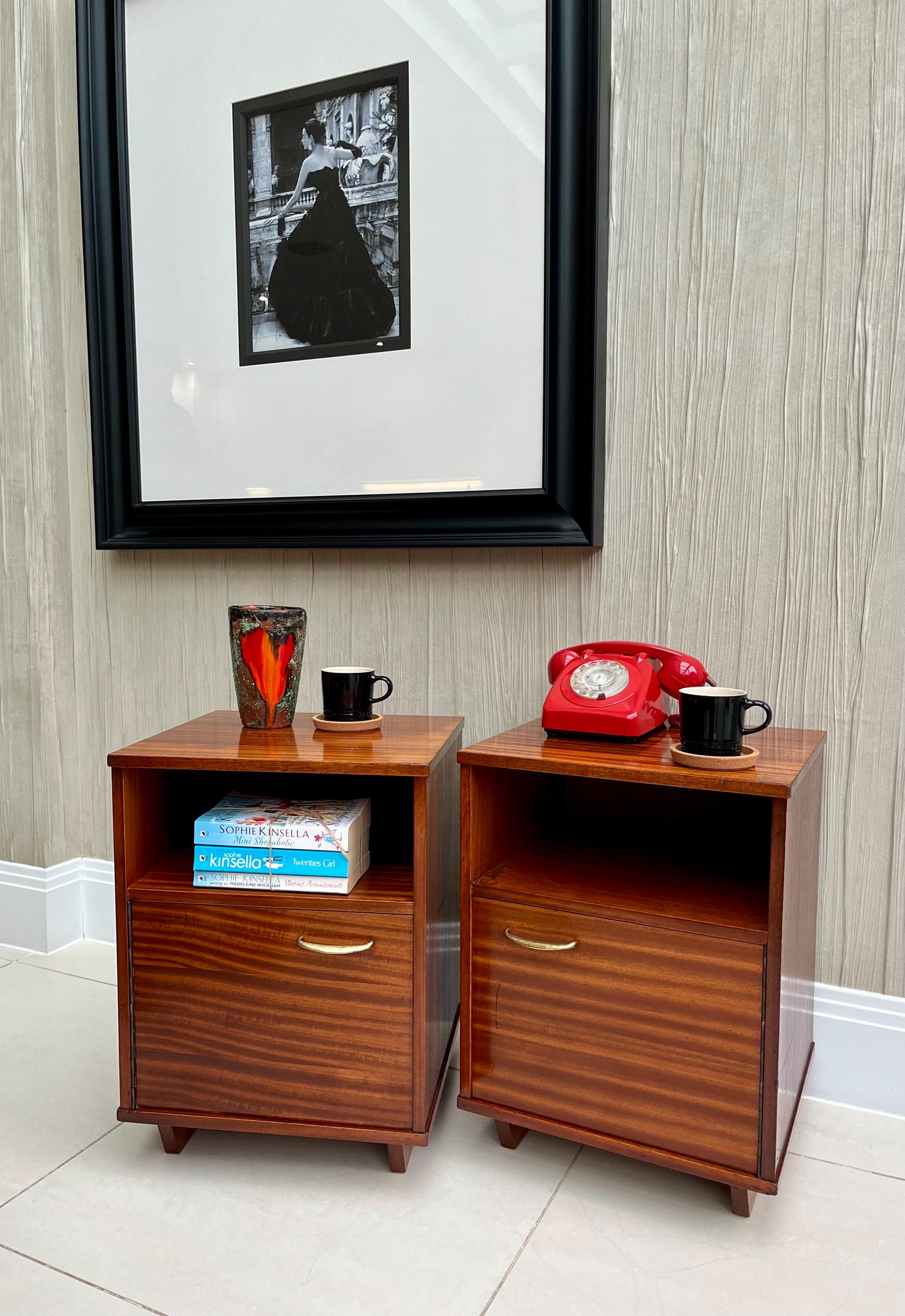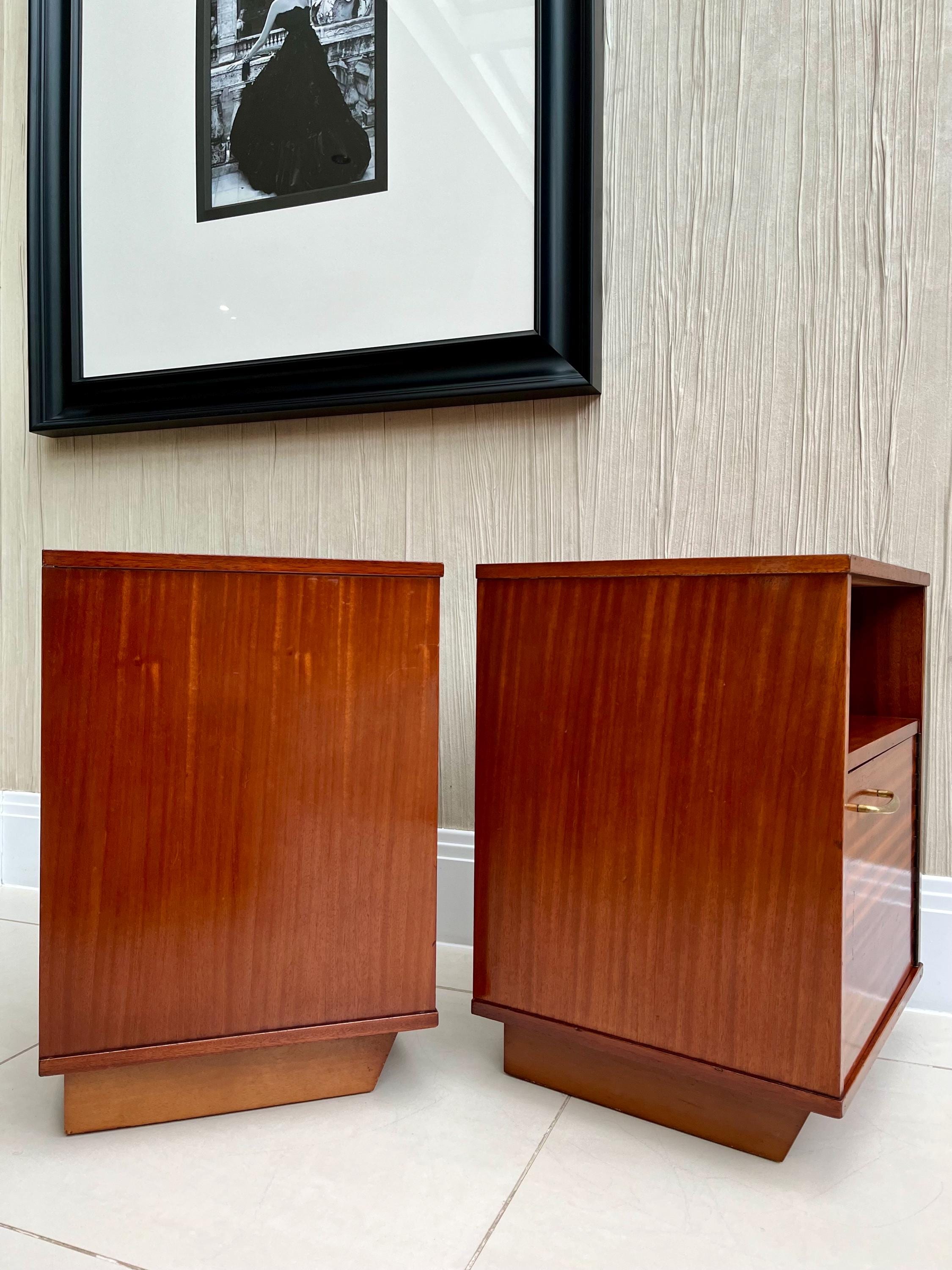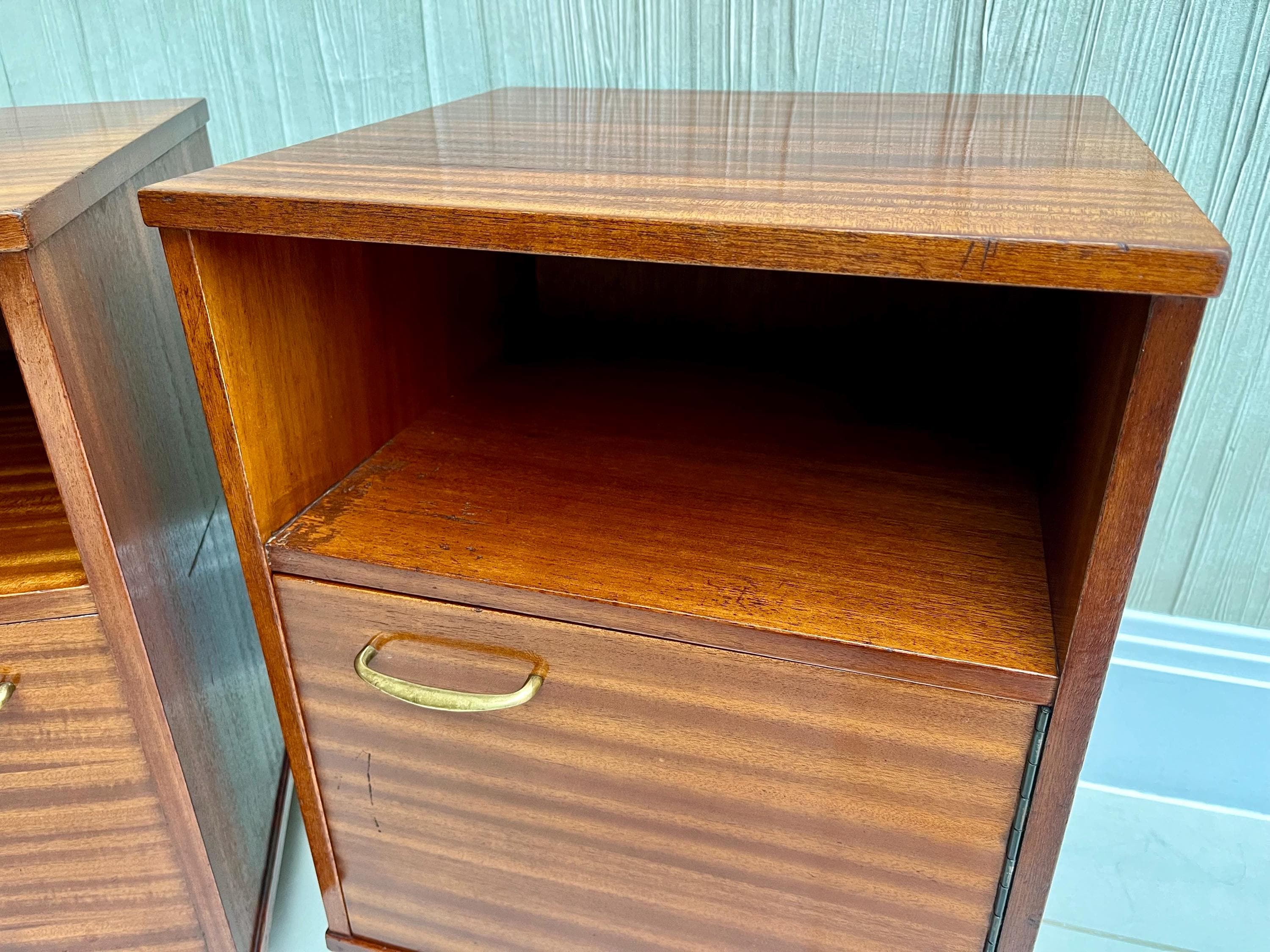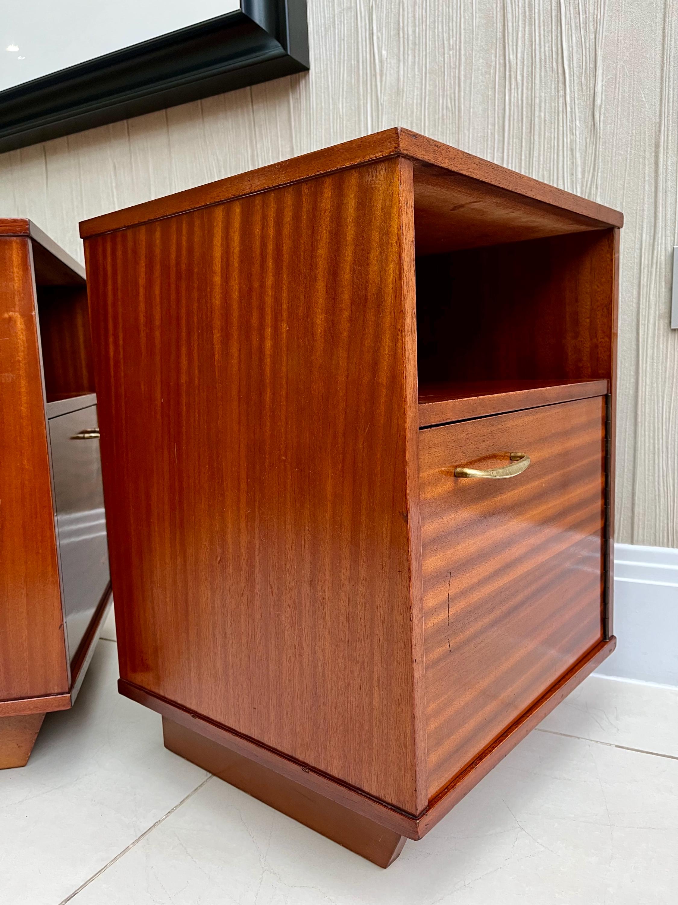 Each cabinet is finished in a warm rich teak veneer with attractive natural grain detail, complemented by the original brass handles. Designed as a true pair, one cabinet opens to the left and the other to the right, making them ideal for either side of the bed. The layout is practical and visually balanced, with an open upper shelf for books, lamps or display, and a lower cupboard providing generous enclosed storage. The cabinets sit on distinctive side plinth feet, giving them a strong, architectural stance that works particularly well in modern homes.