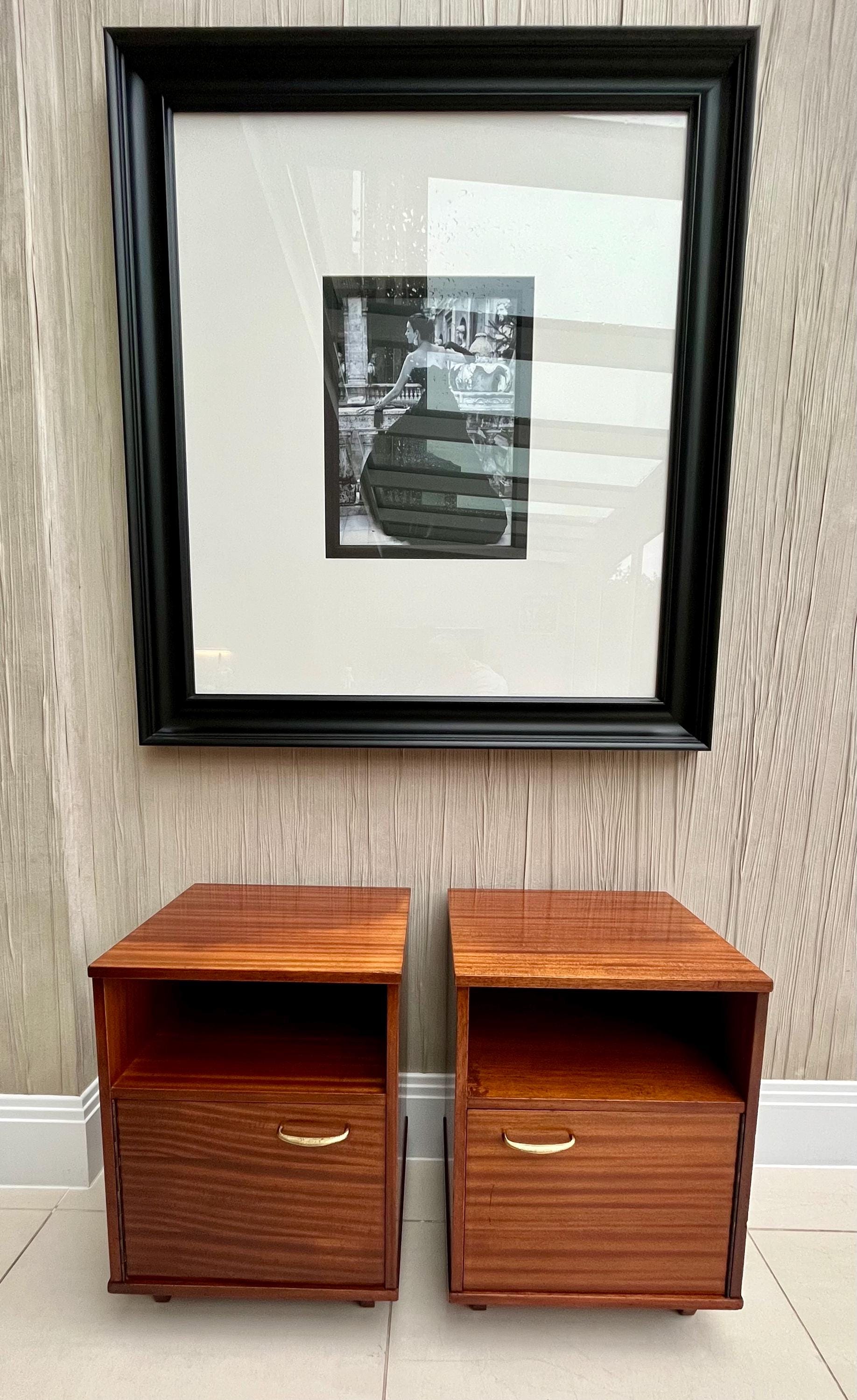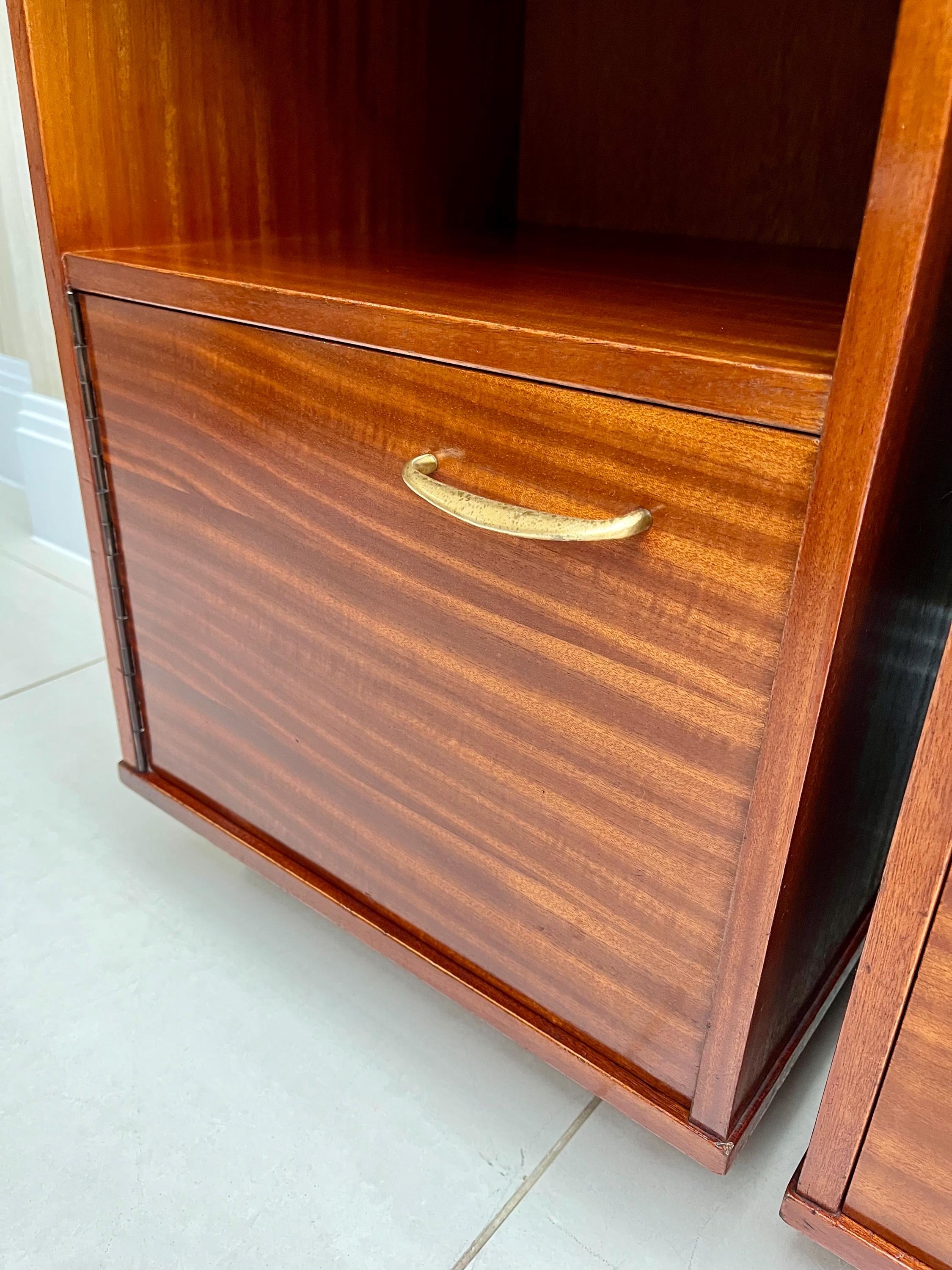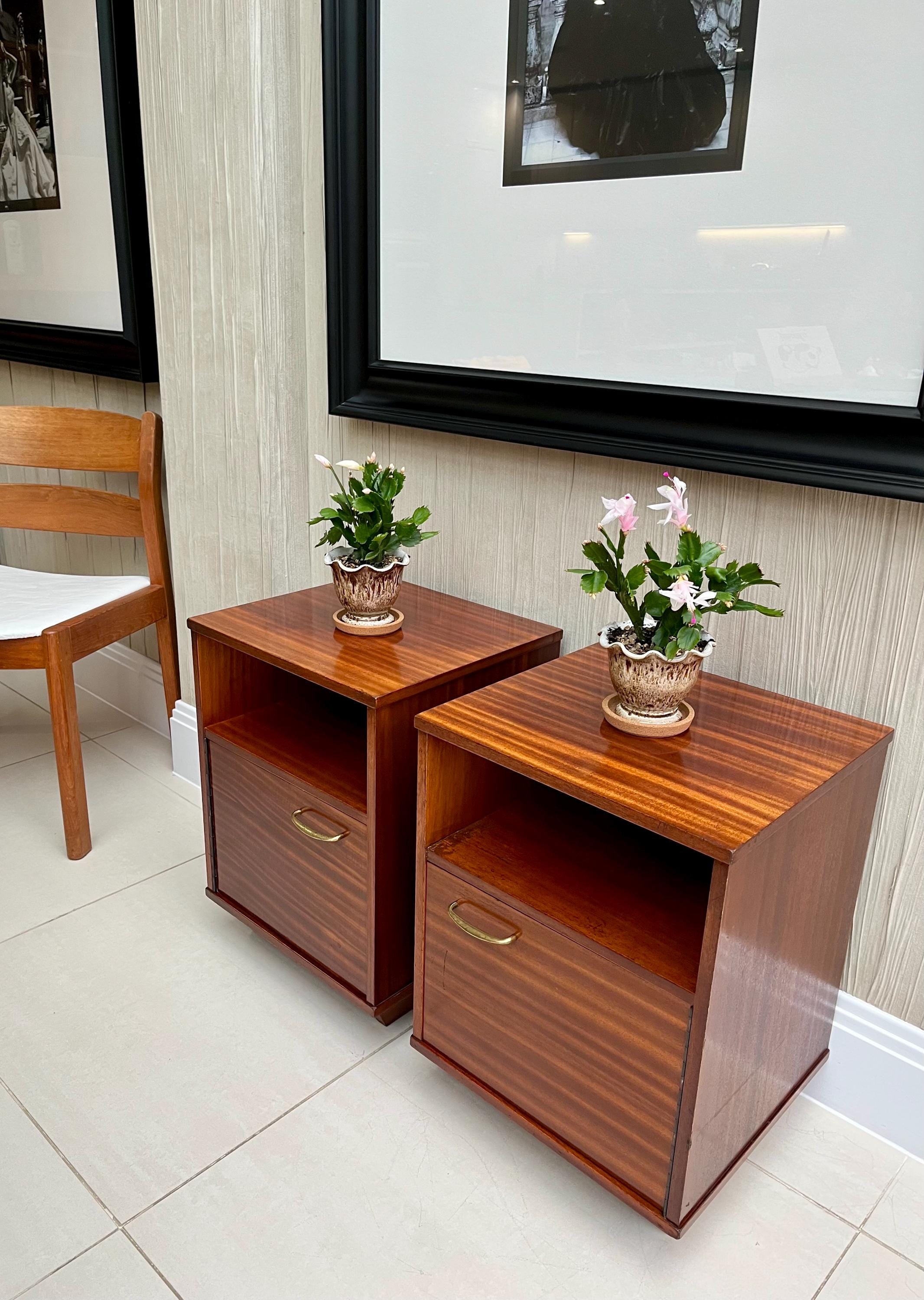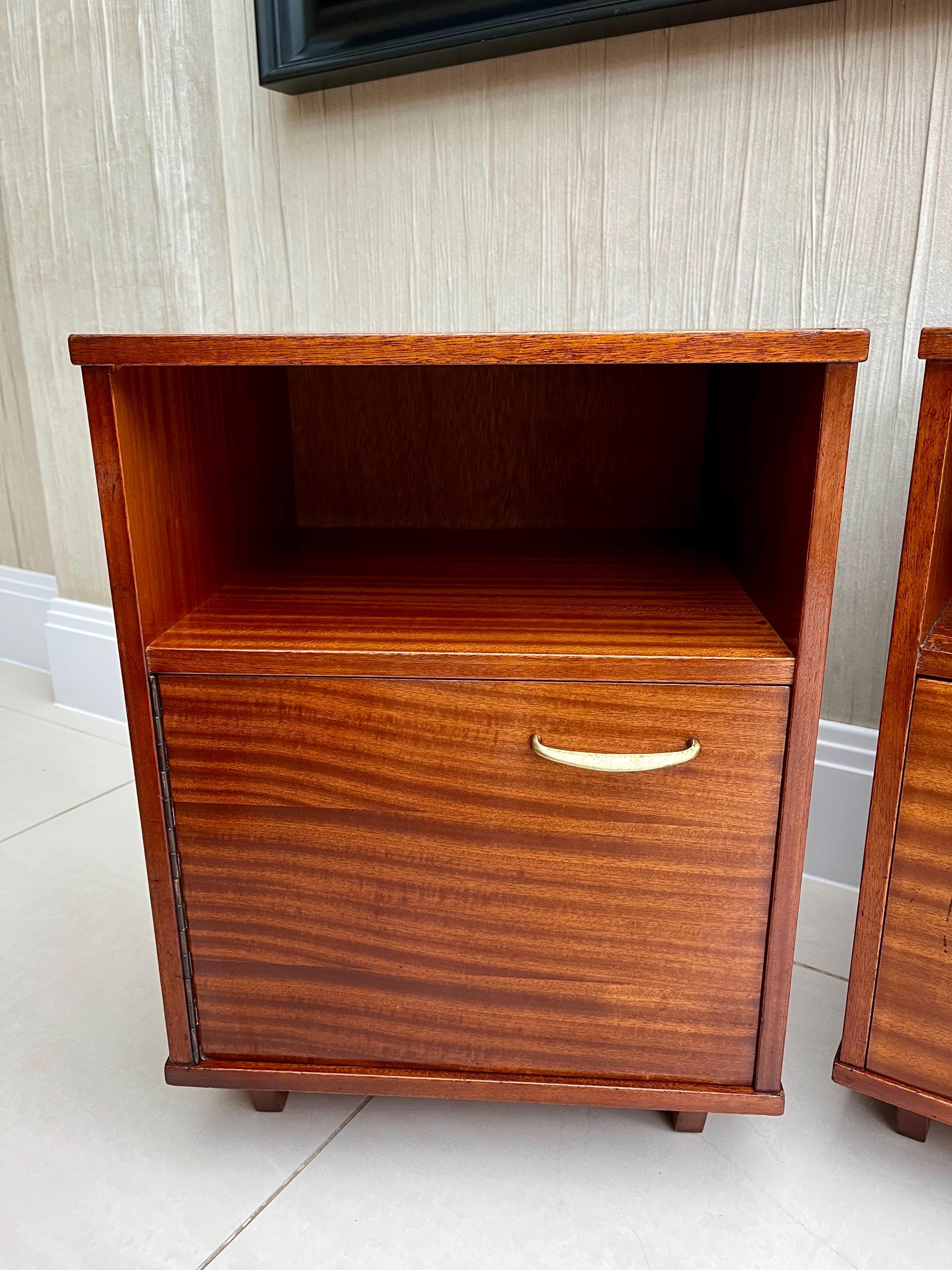 Each cabinet is finished in a warm rich teak veneer with attractive natural grain detail, complemented by the original brass handles. Designed as a true pair, one cabinet opens to the left and the other to the right, making them ideal for either side of the bed. The layout is practical and visually balanced, with an open upper shelf for books, lamps or display, and a lower cupboard providing generous enclosed storage. The cabinets sit on distinctive side plinth feet, giving them a strong, architectural stance that works particularly well in modern homes.