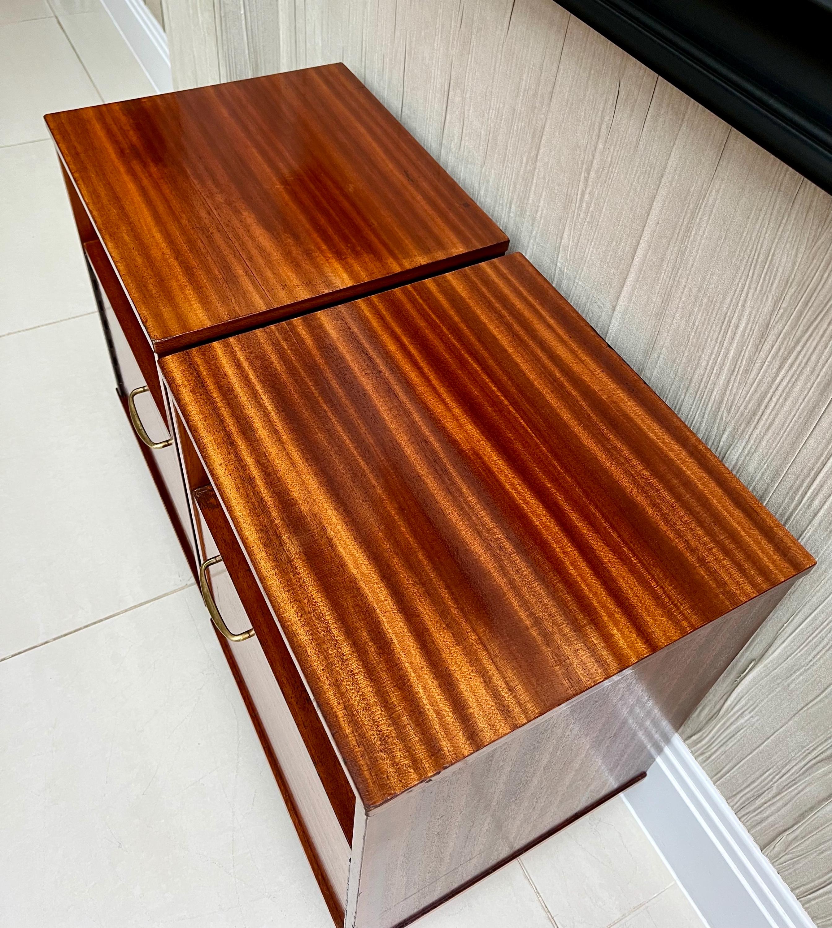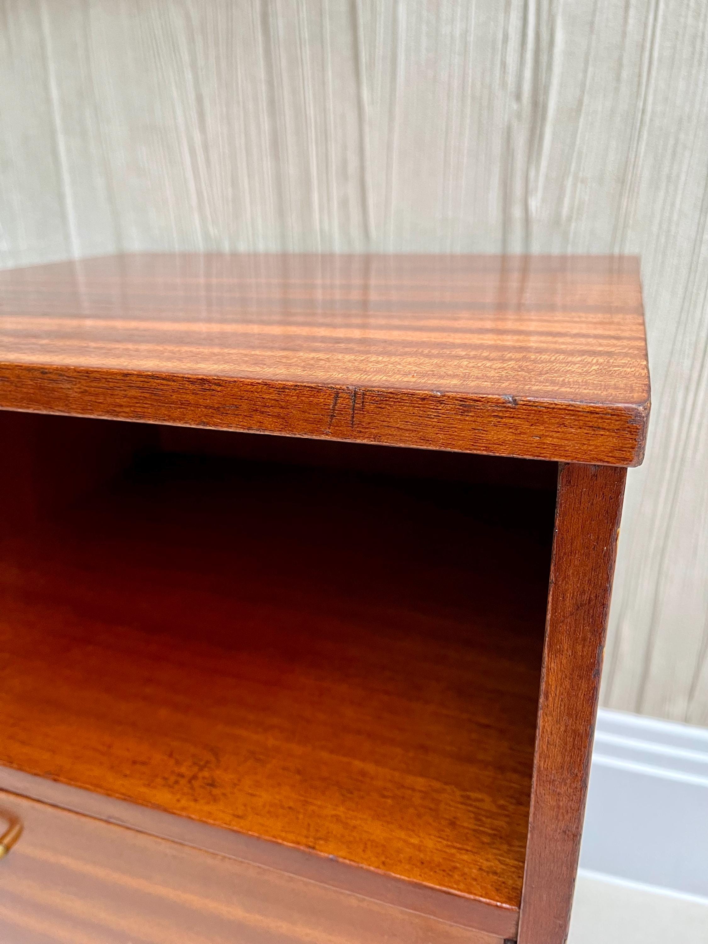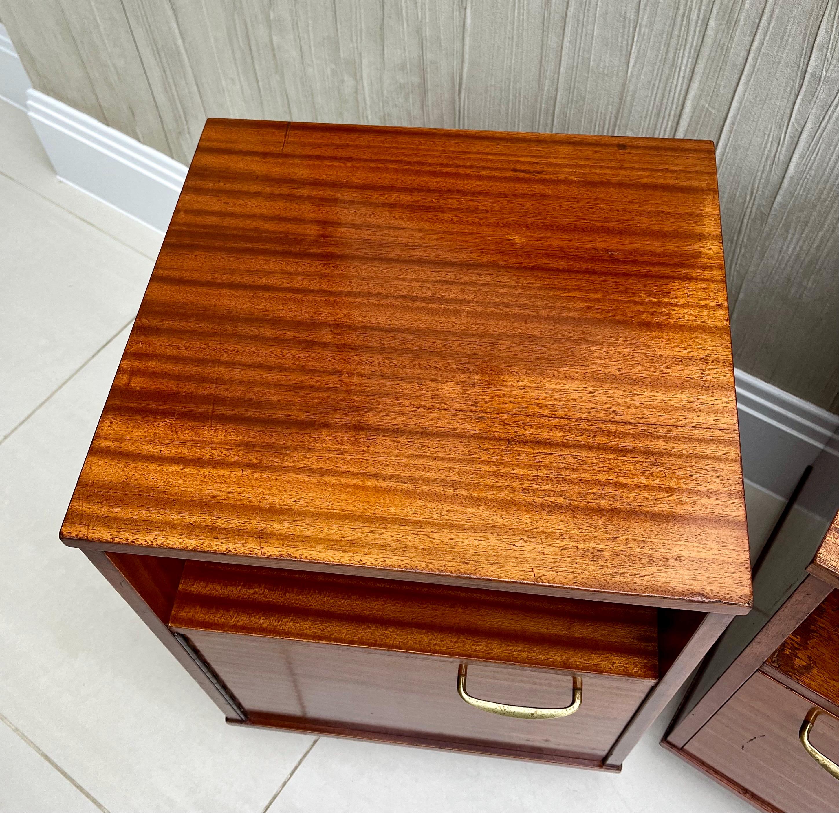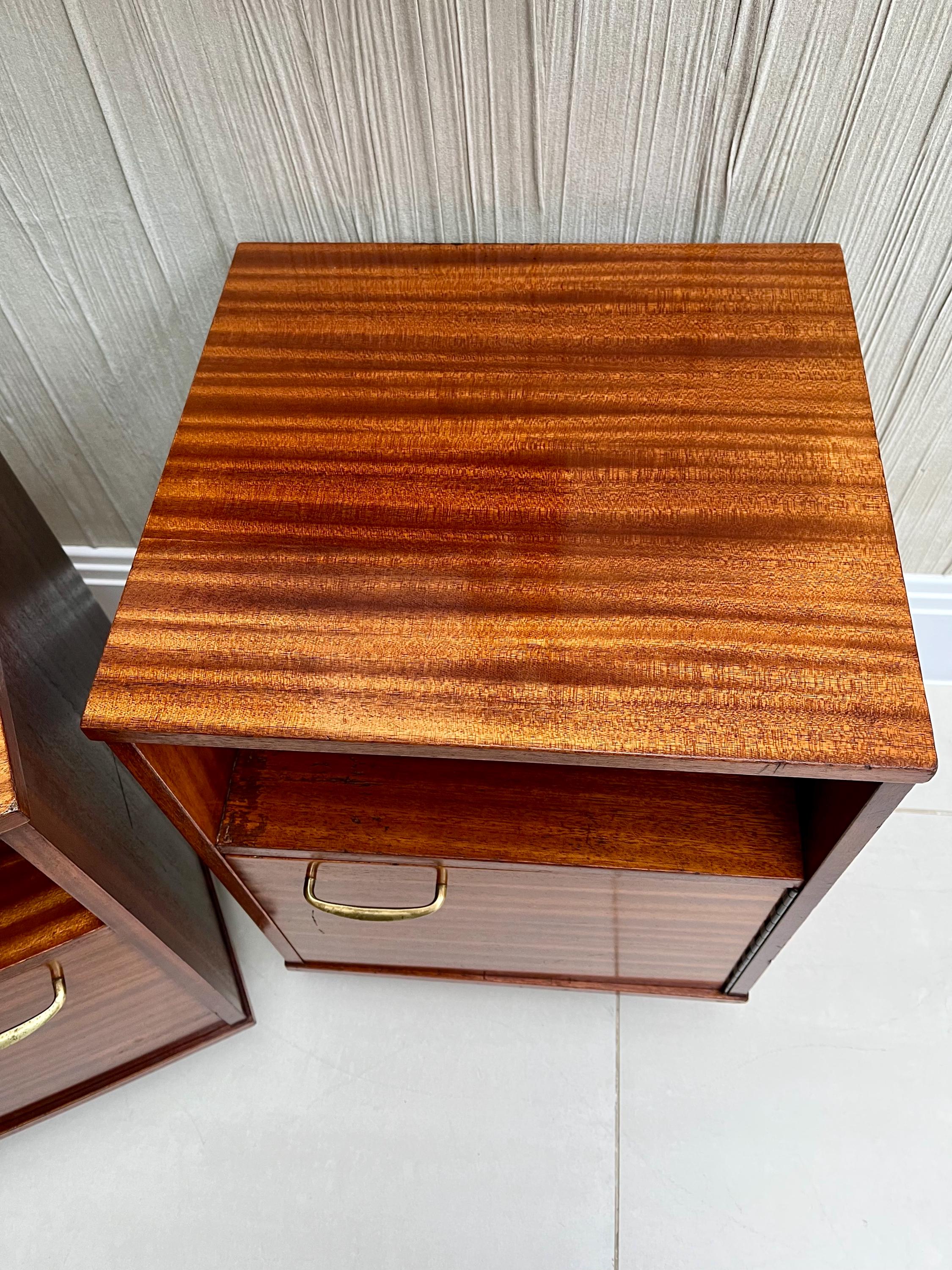 Each cabinet is finished in a warm rich teak veneer with attractive natural grain detail, complemented by the original brass handles. Designed as a true pair, one cabinet opens to the left and the other to the right, making them ideal for either side of the bed. The layout is practical and visually balanced, with an open upper shelf for books, lamps or display, and a lower cupboard providing generous enclosed storage. The cabinets sit on distinctive side plinth feet, giving them a strong, architectural stance that works particularly well in modern homes.