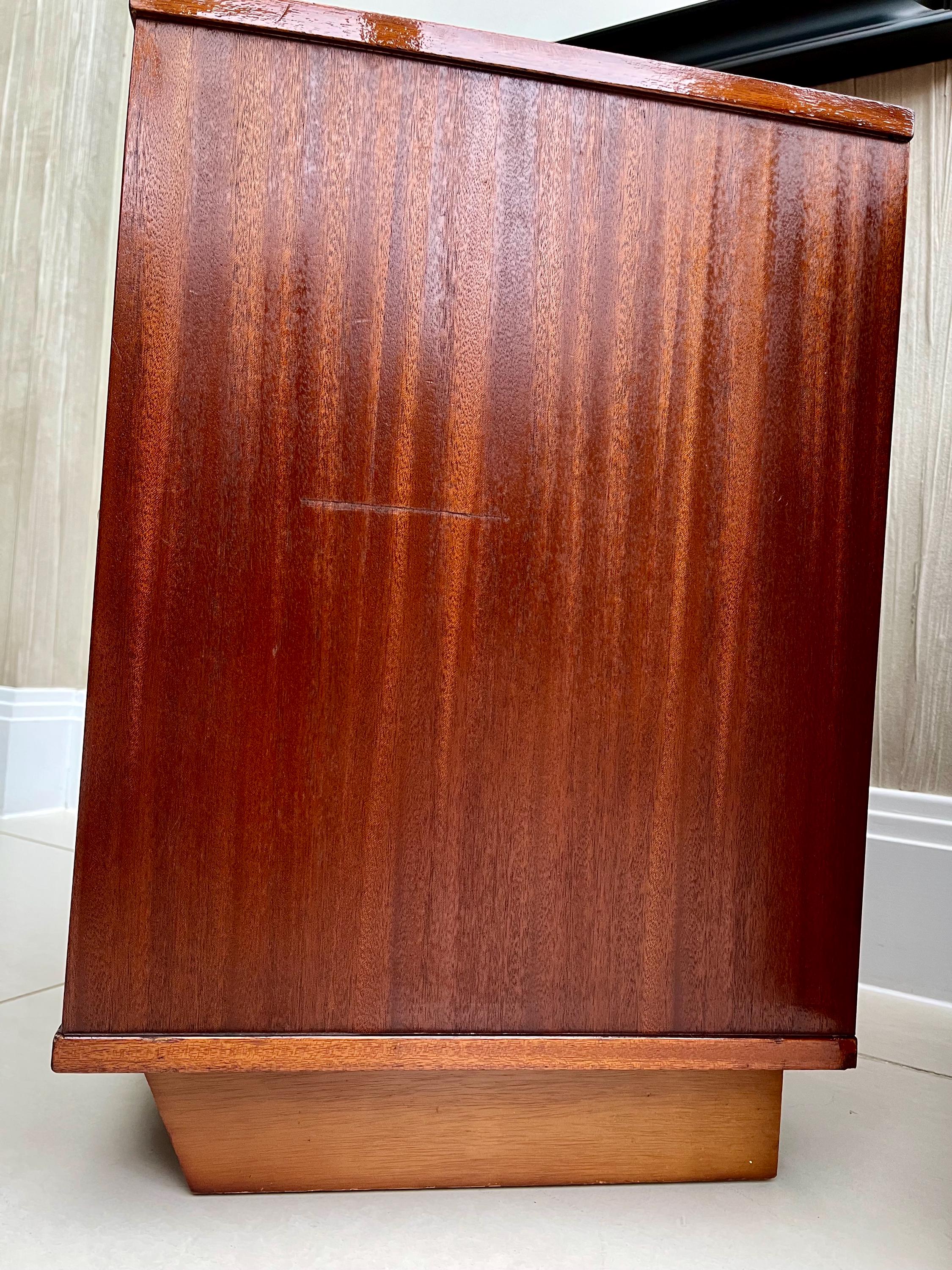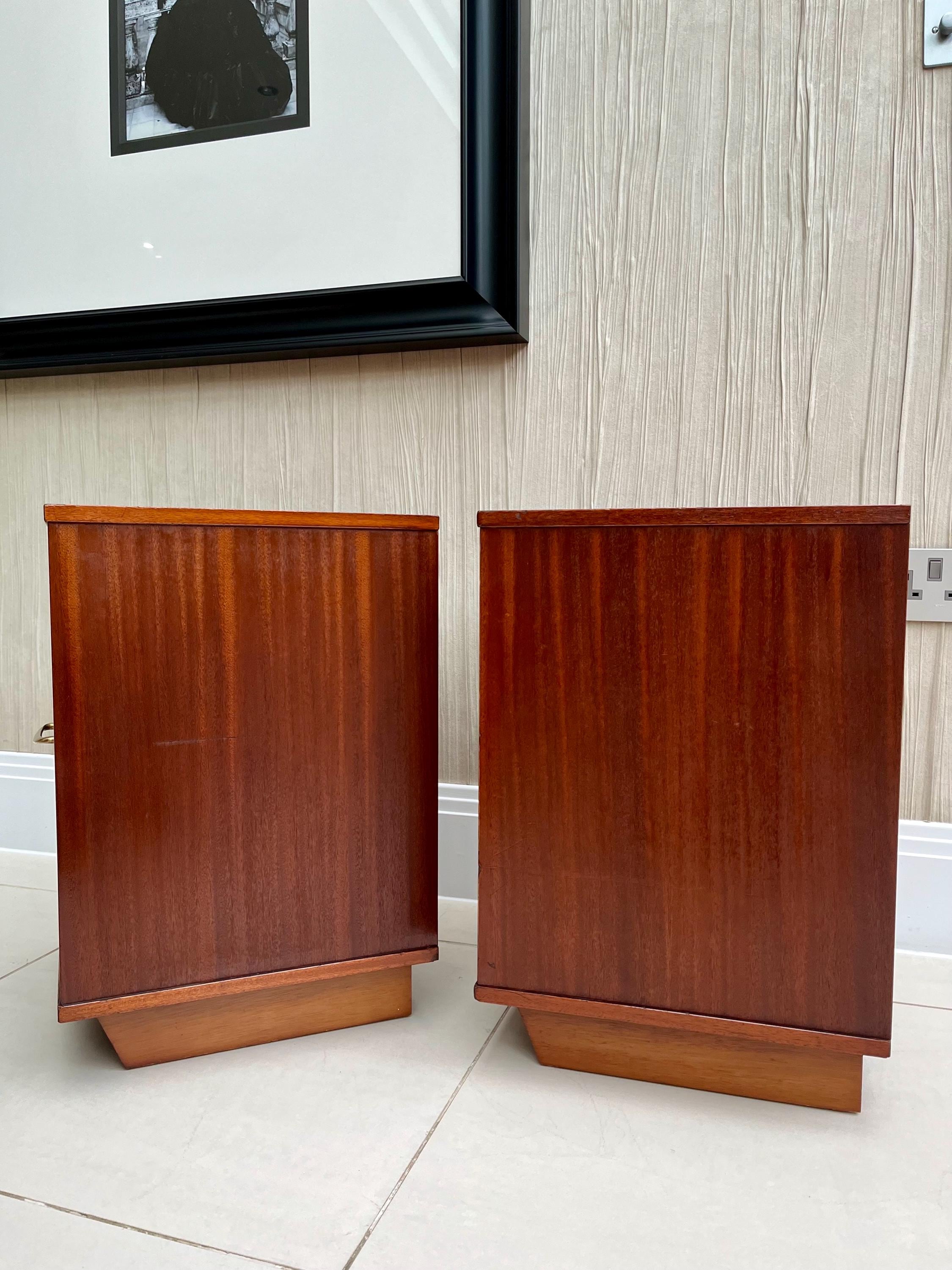The pair is in great vintage condition overall, fully cleaned and sympathetically presented. As photographed, the most noticeable imperfections include scratches to the top inside shelf on one cabinet, a replacement door catch to one unit, along with sun fading and surface wear to the tops and a noticeable scratch to one door. These marks are consistent with age and use and are clearly shown in the images; otherwise, only age-appropriate wear is present. Structurally sound and well-proportioned, this is a versatile and sustainable pair that works equally well as bedside cabinets, side tables or compact storage units — a highly affordable way to introduce authentic British mid-century design into both vintage-inspired and contemporary interiors.