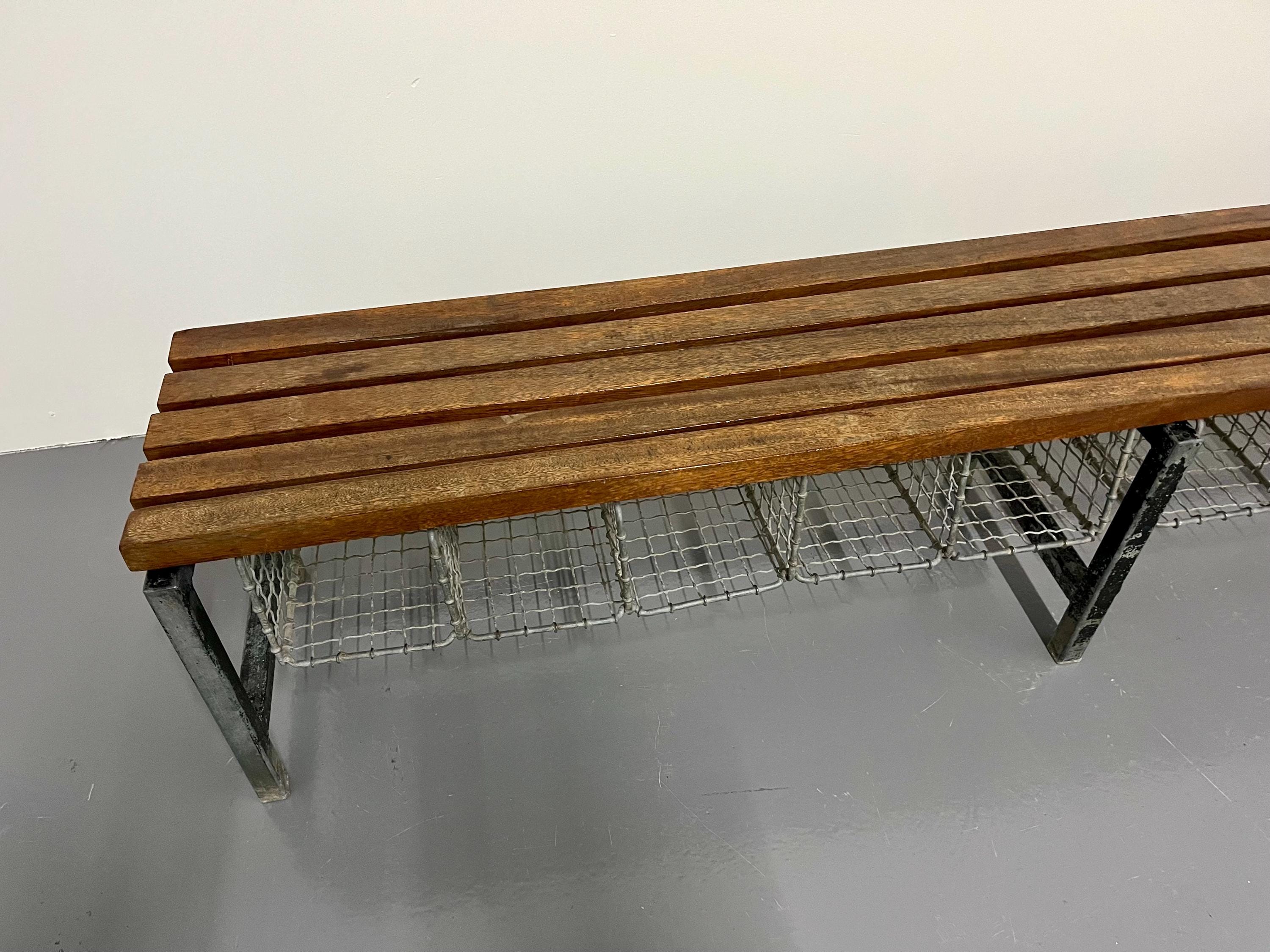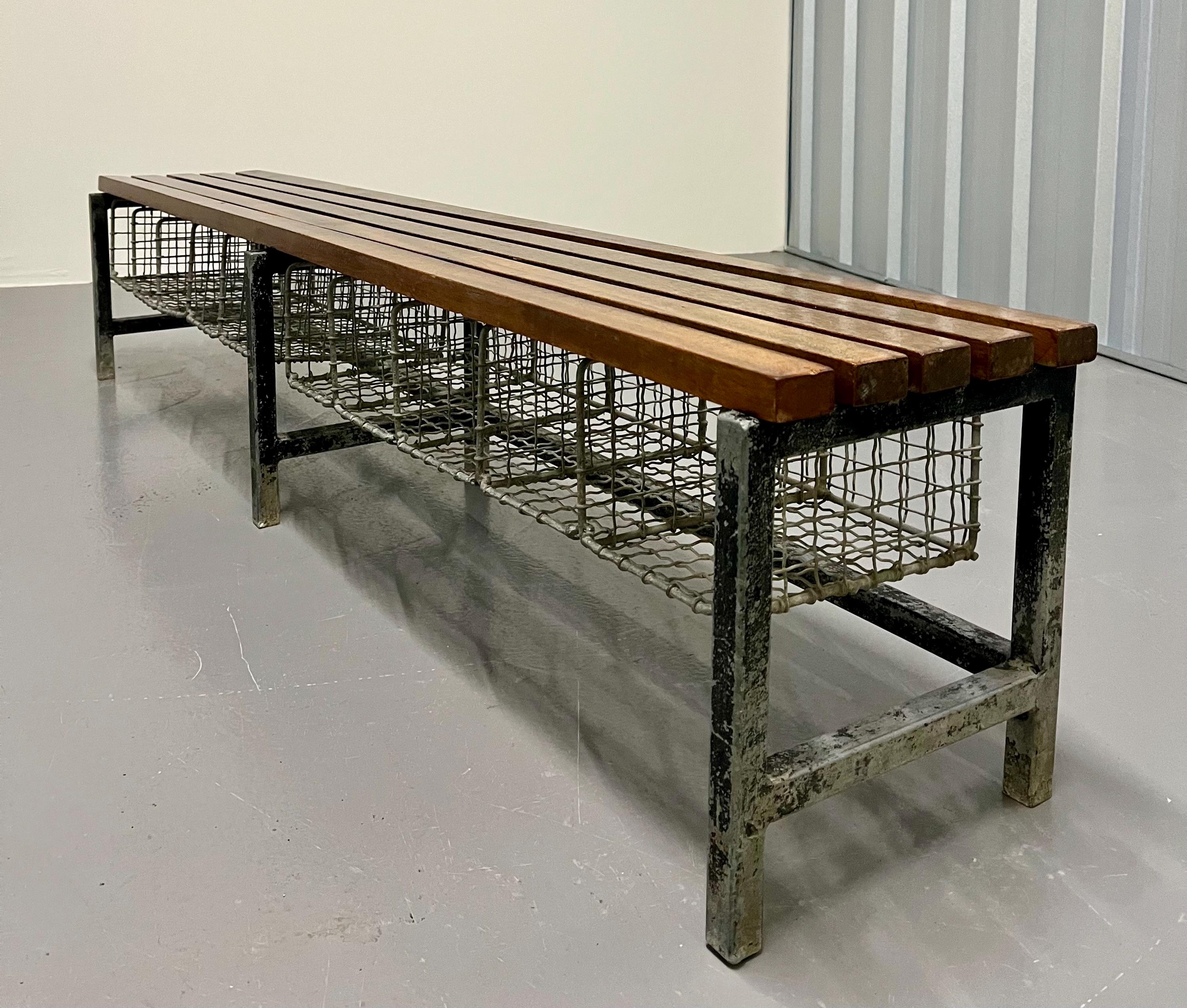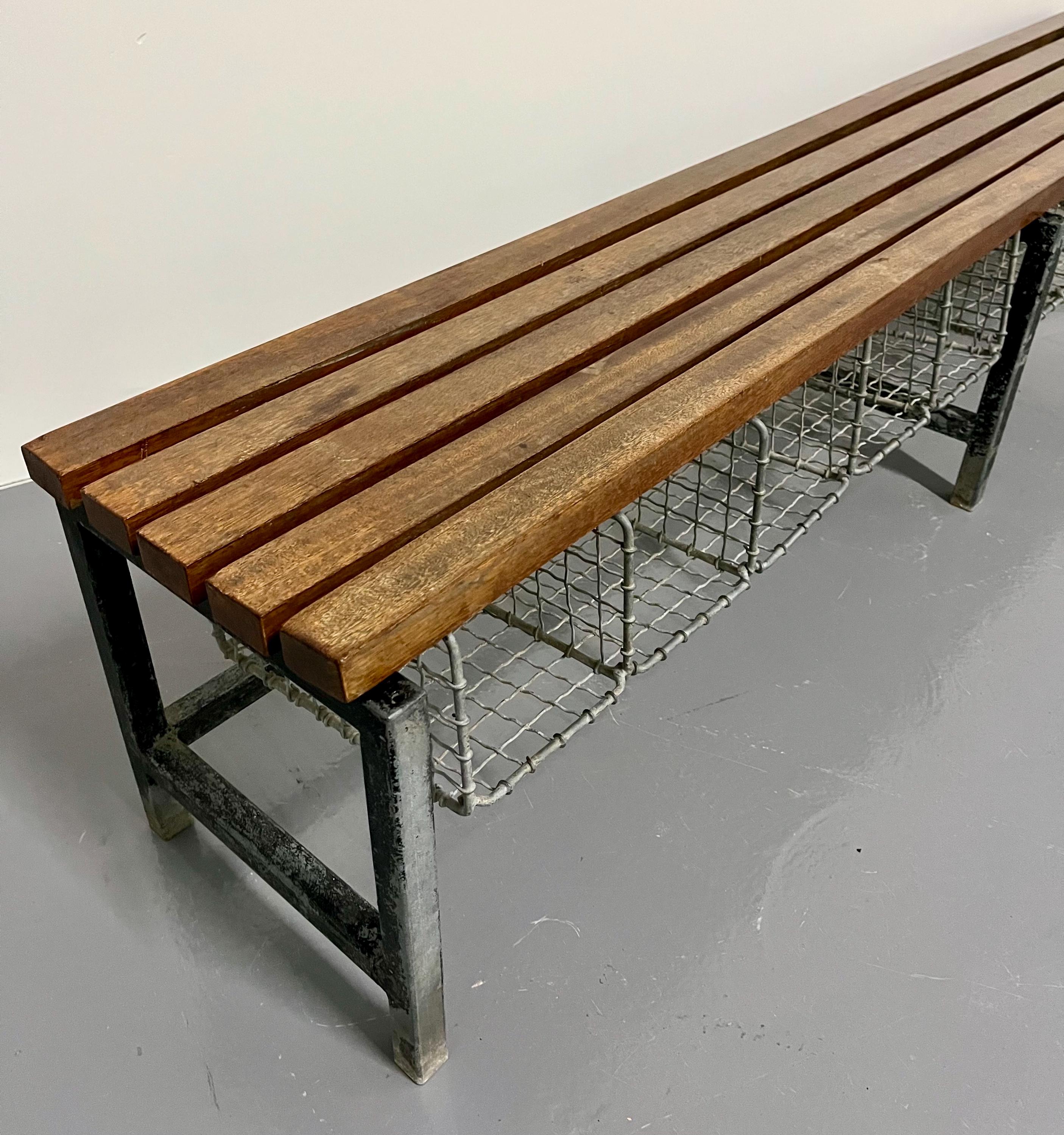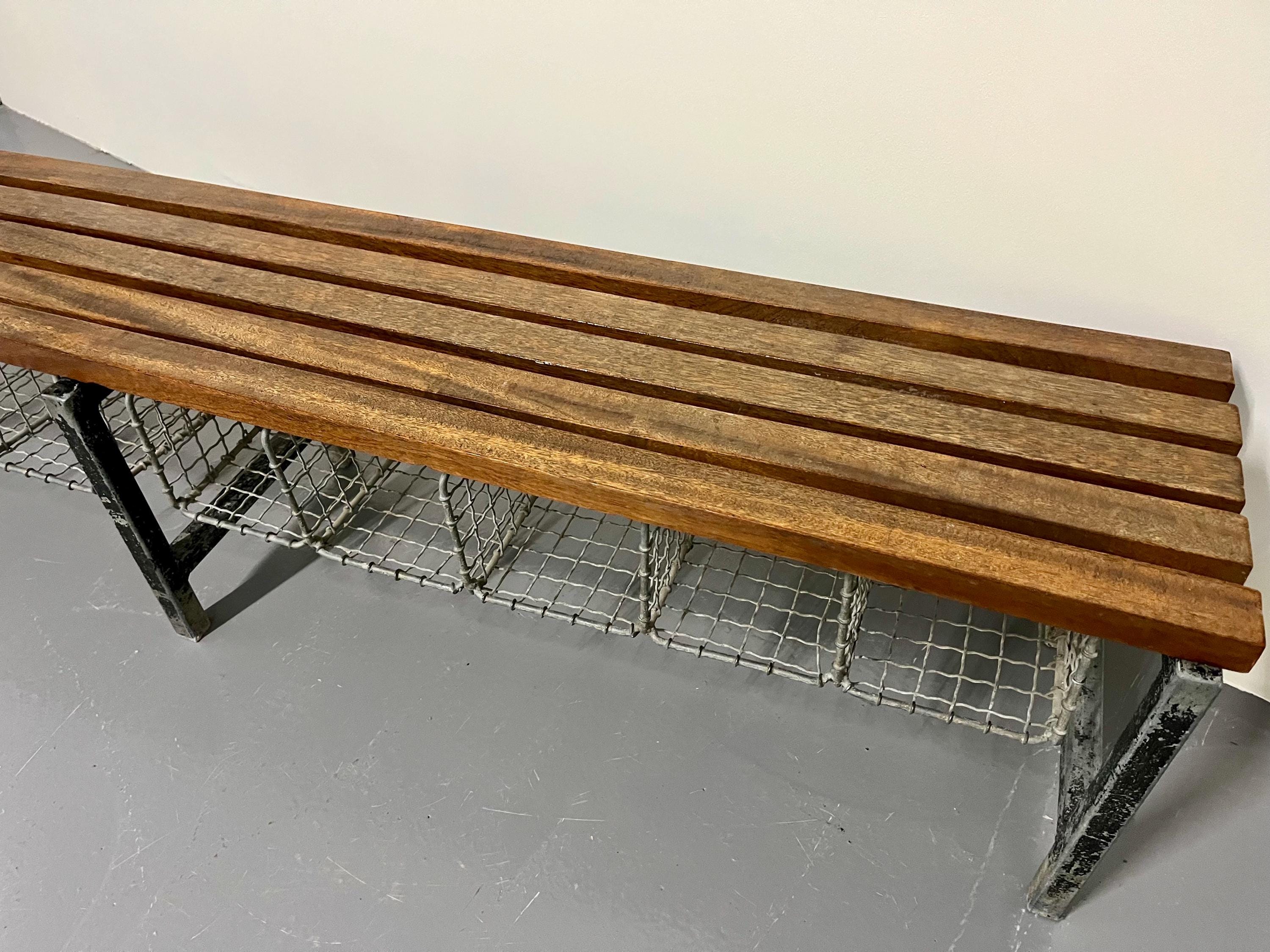 Long benches of this type are increasingly hard to find complete, as many are adapted or separated for shelving or reclaimed wood projects. This example remains intact, retaining its original proportions and practical lower storage. The wire storage shows slight natural movement, which is typical of how these were originally fitted using screw eyes and does not affect stability or everyday use.