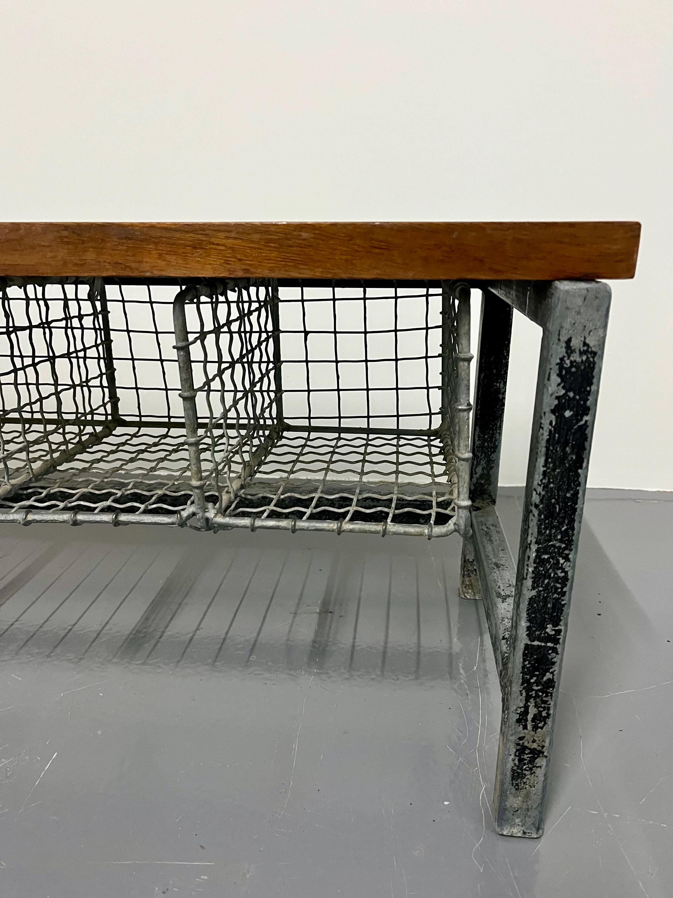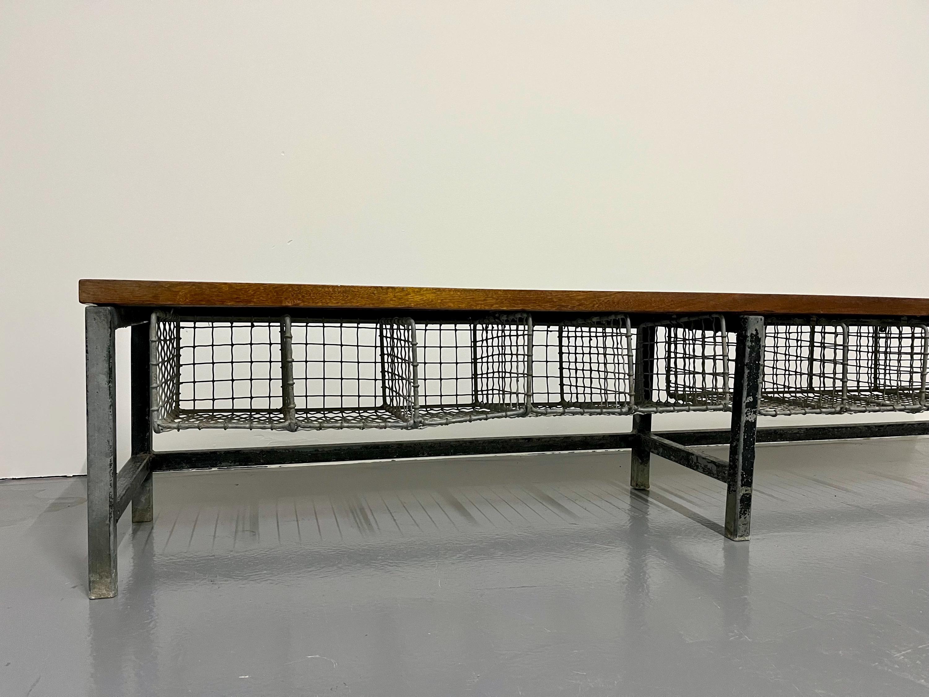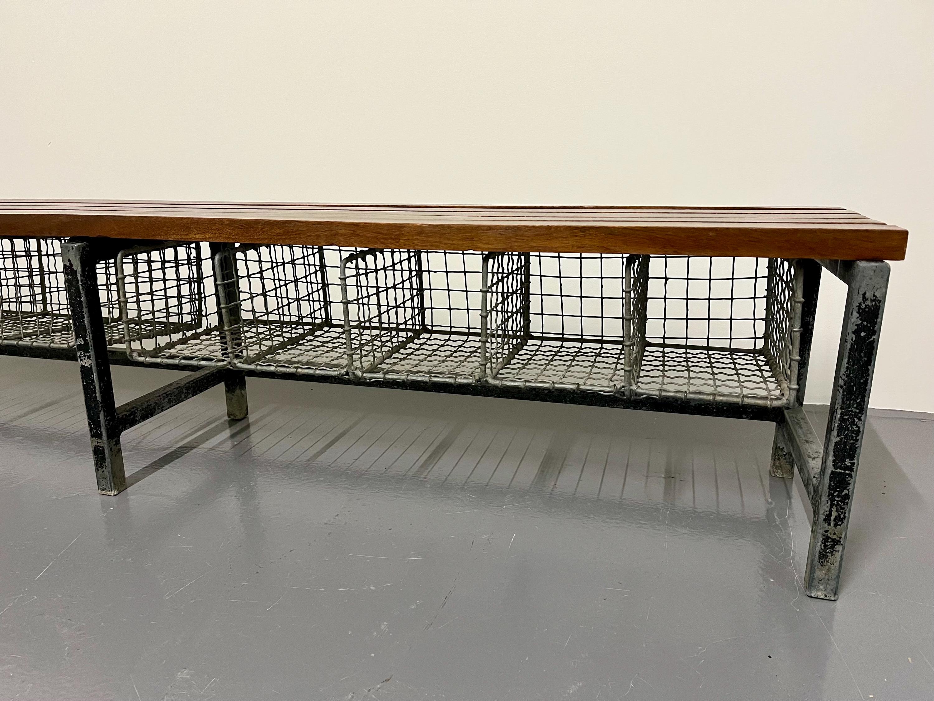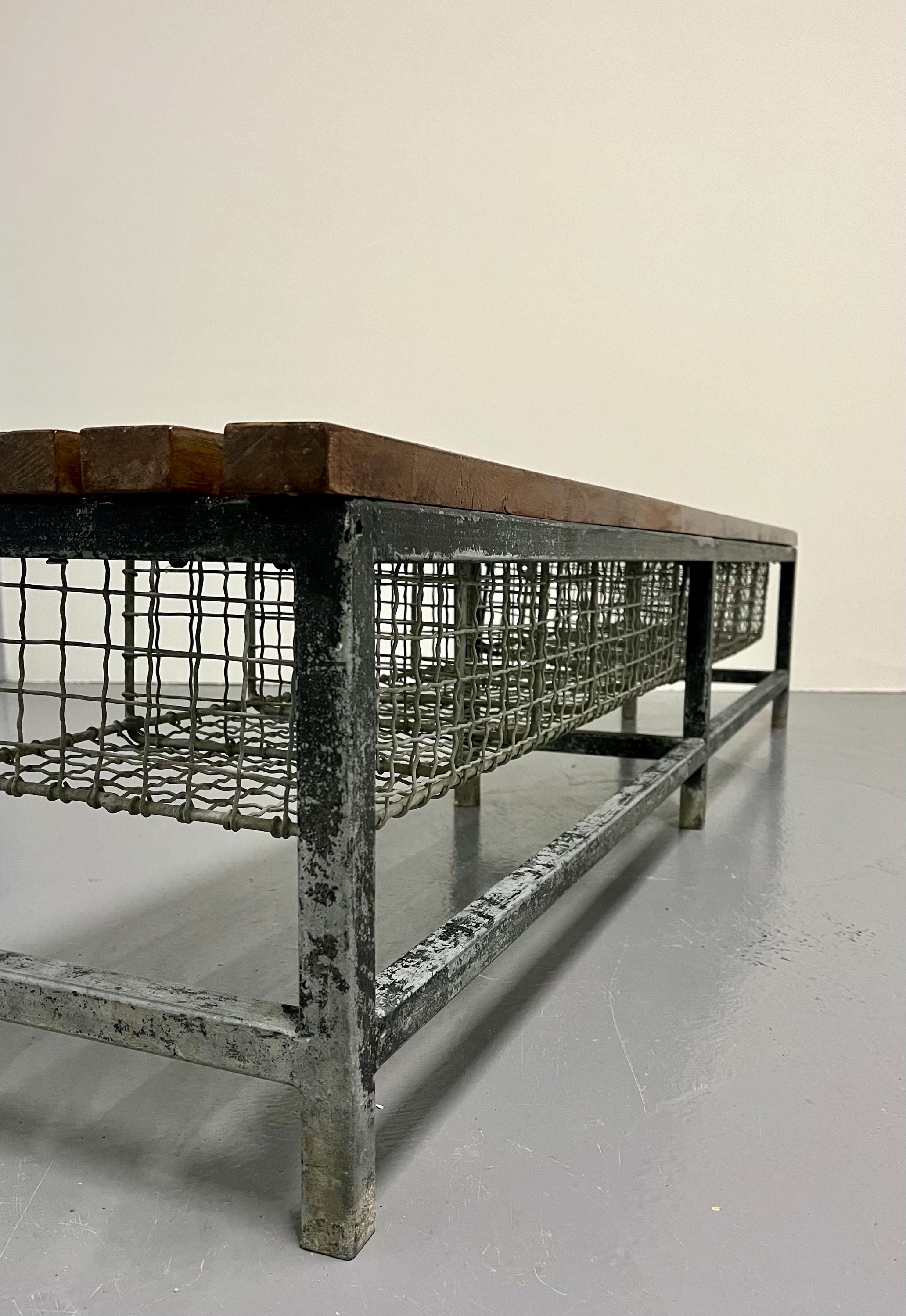 Long benches of this type are increasingly hard to find complete, as many are adapted or separated for shelving or reclaimed wood projects. This example remains intact, retaining its original proportions and practical lower storage. The wire storage shows slight natural movement, which is typical of how these were originally fitted using screw eyes and does not affect stability or everyday use.