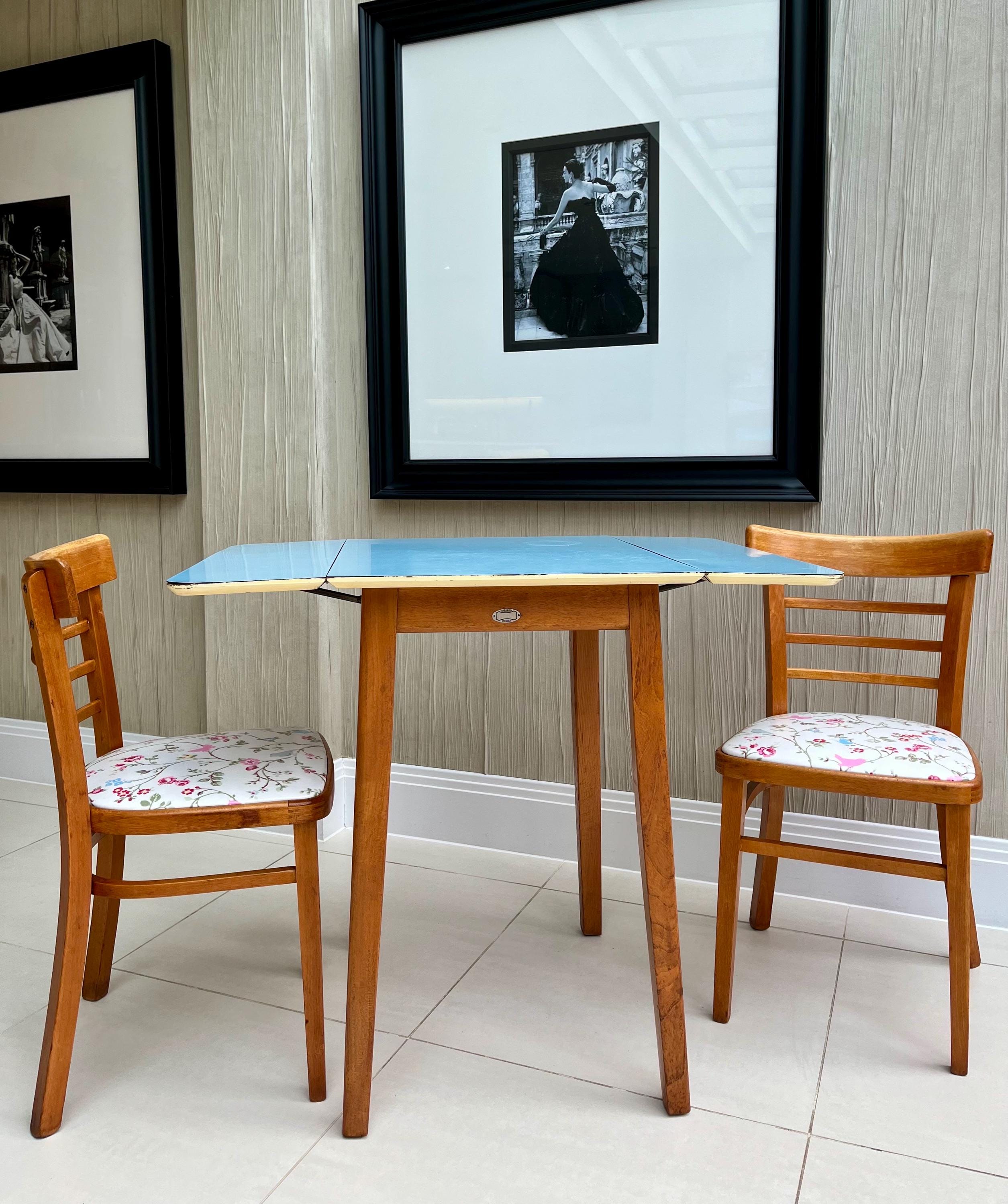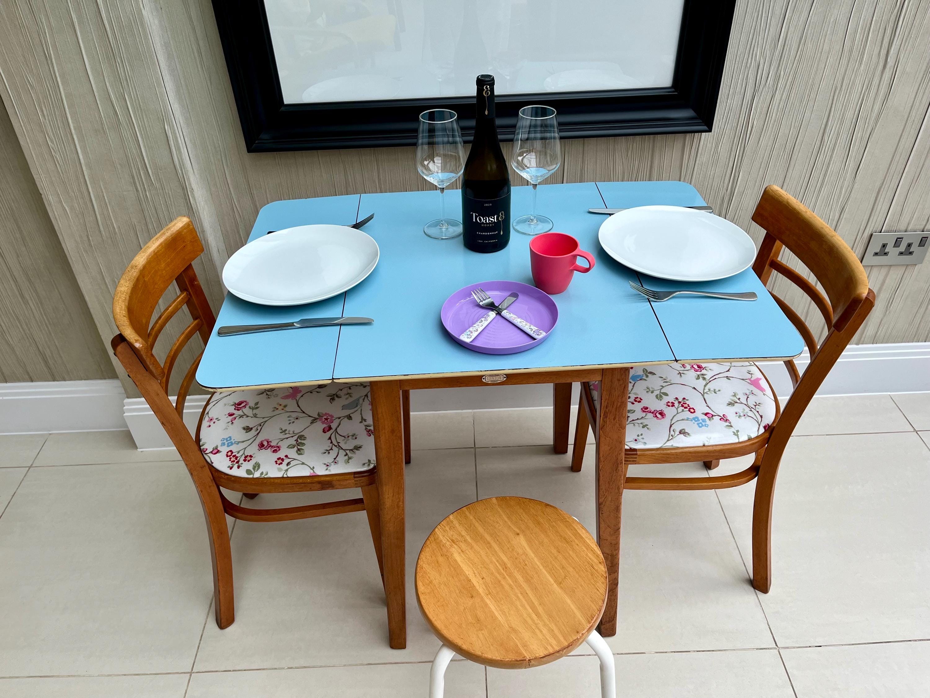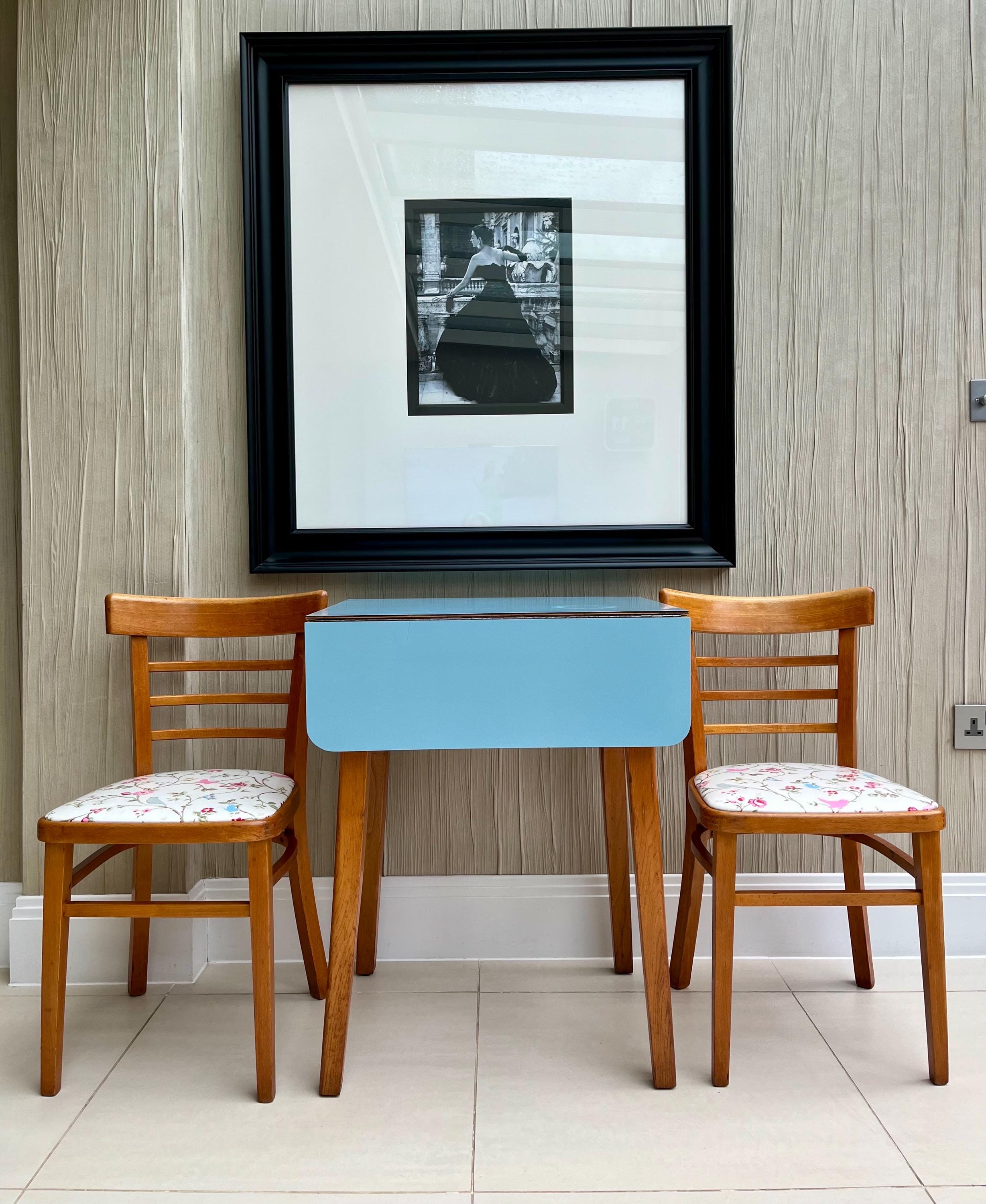 A charming and highly usable vintage kitchen set by Gunton, dating from the early to mid-1960s and featuring its original blue Formica drop-leaf table paired with two complementary mid-century wooden dining chairs.