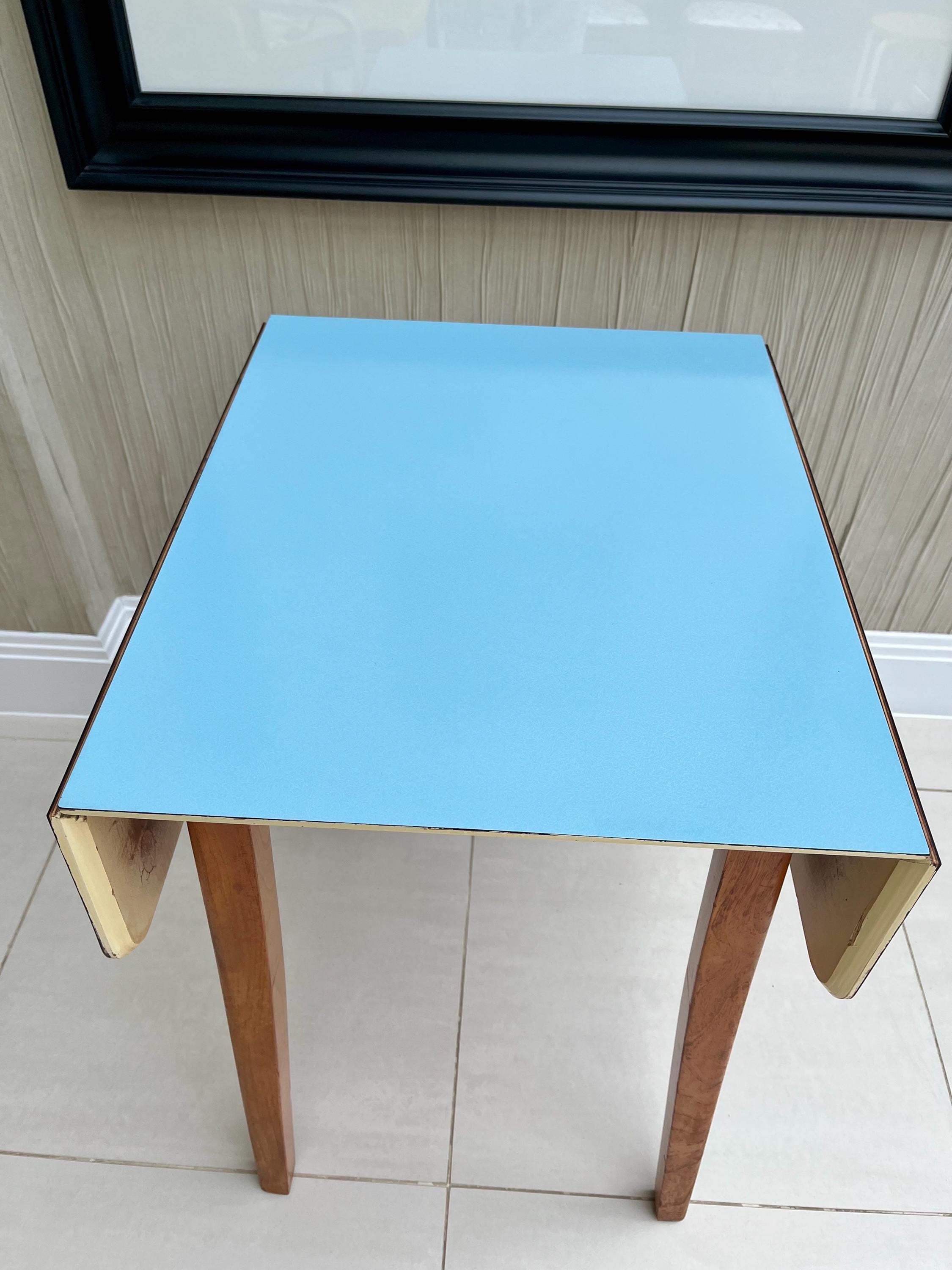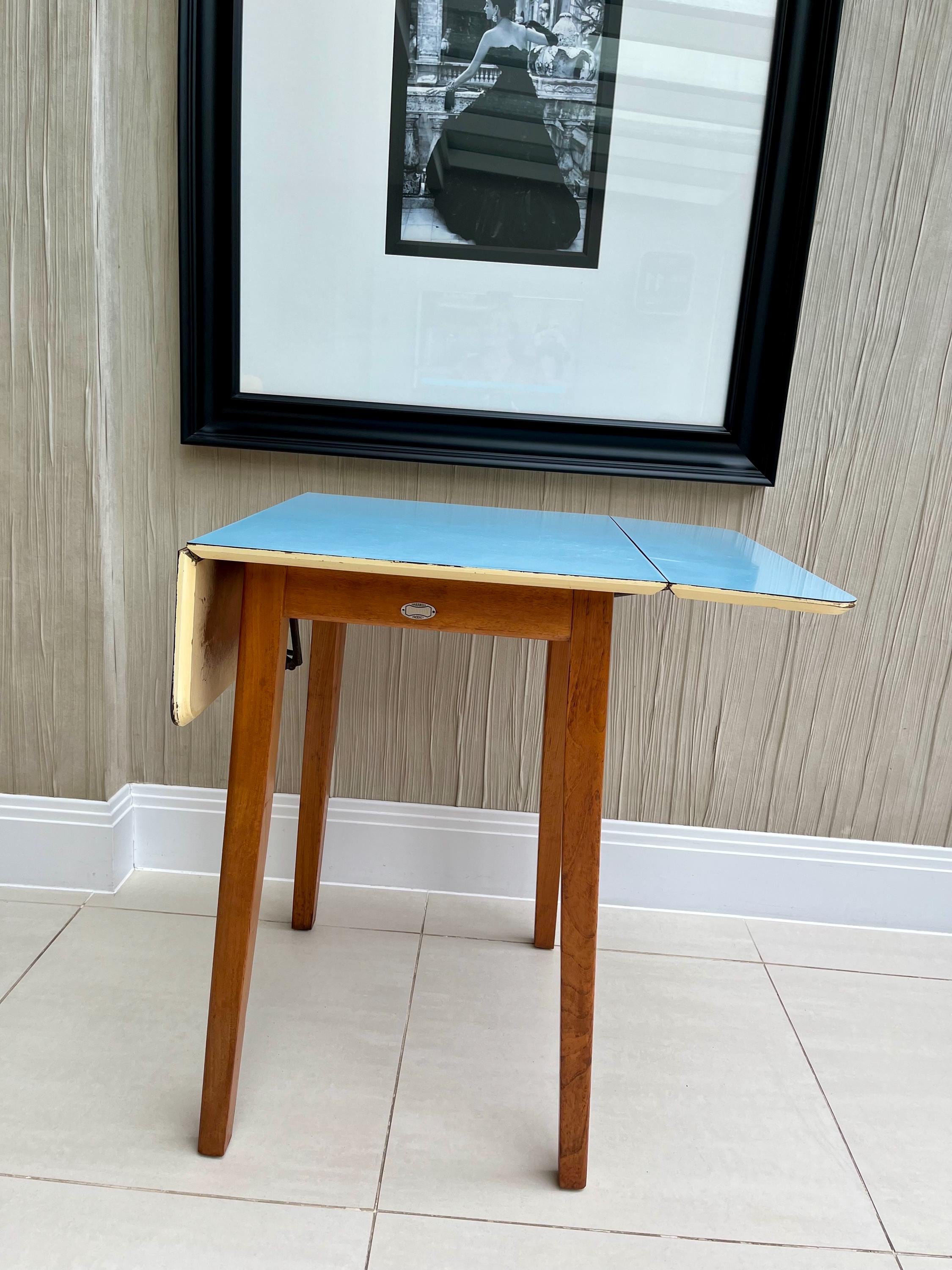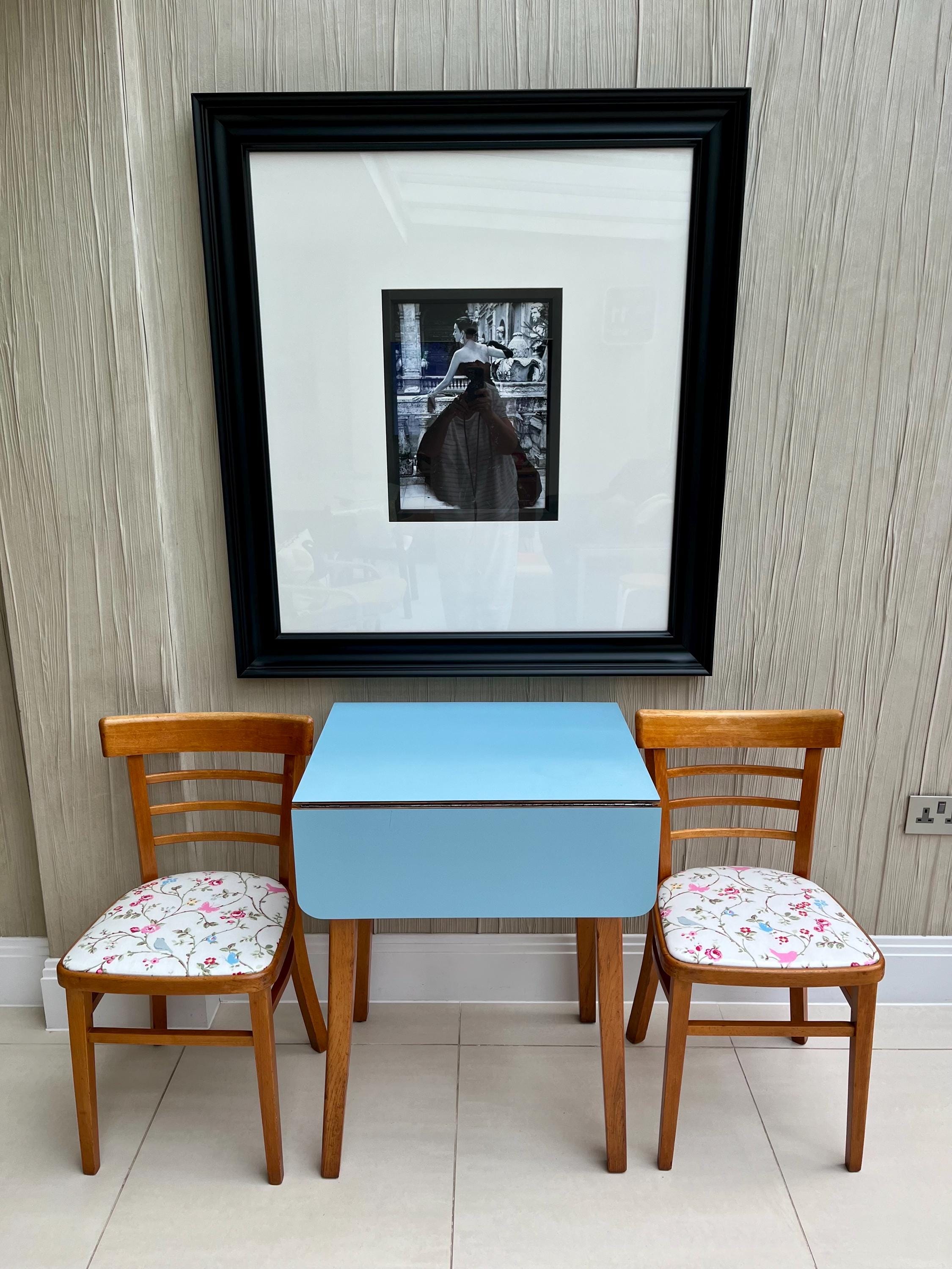 A charming and highly usable vintage kitchen set by Gunton, dating from the early to mid-1960s and featuring its original blue Formica drop-leaf table paired with two complementary mid-century wooden dining chairs.