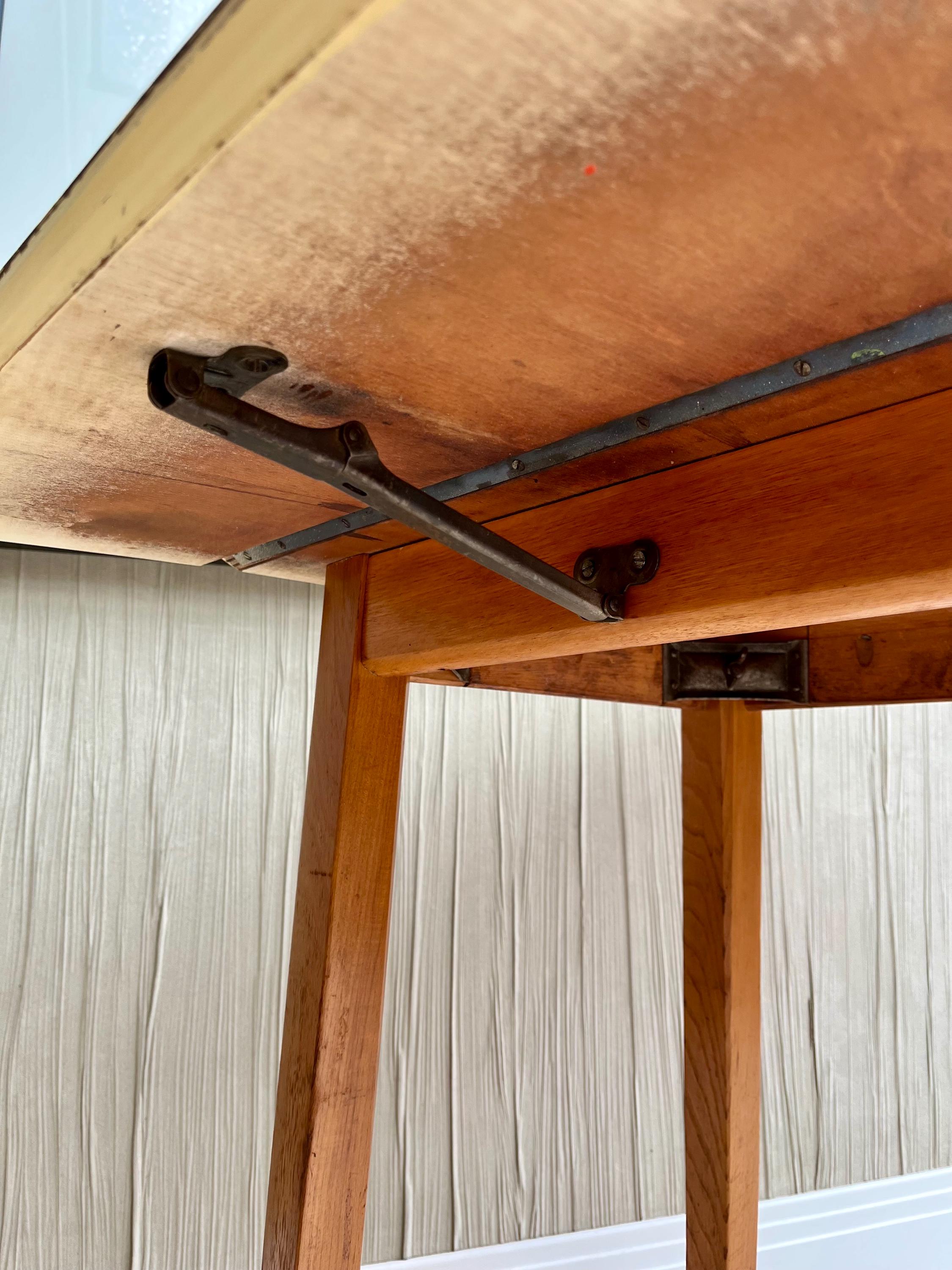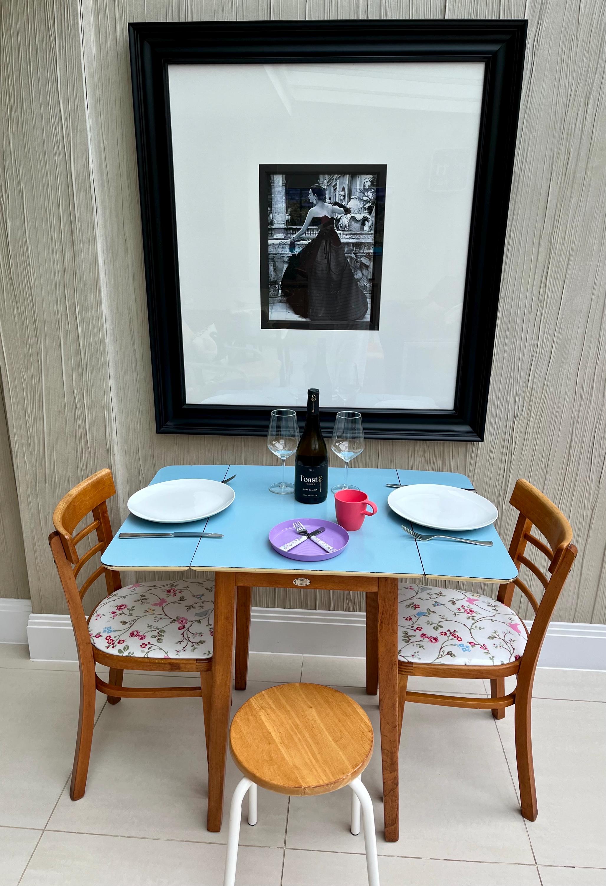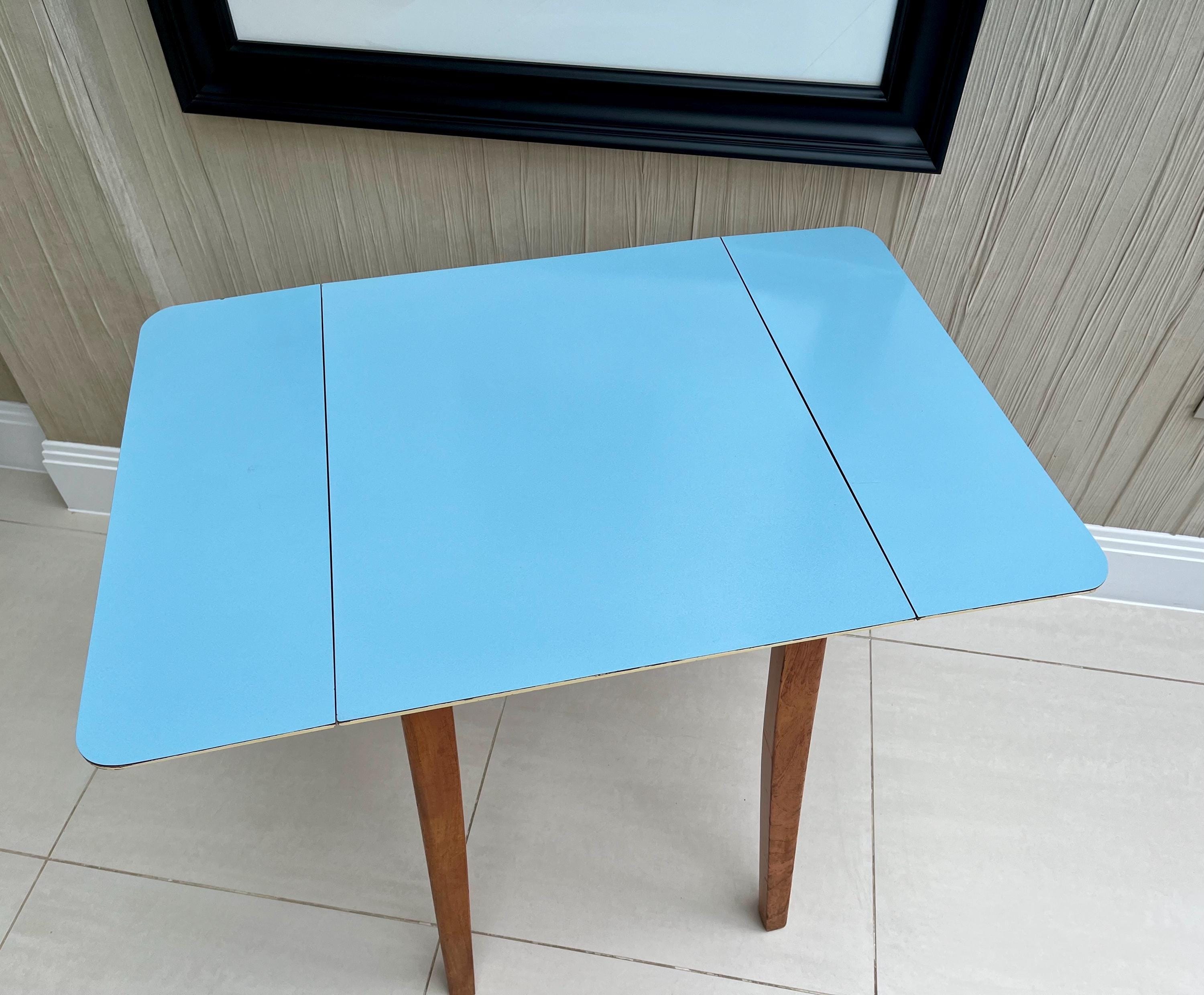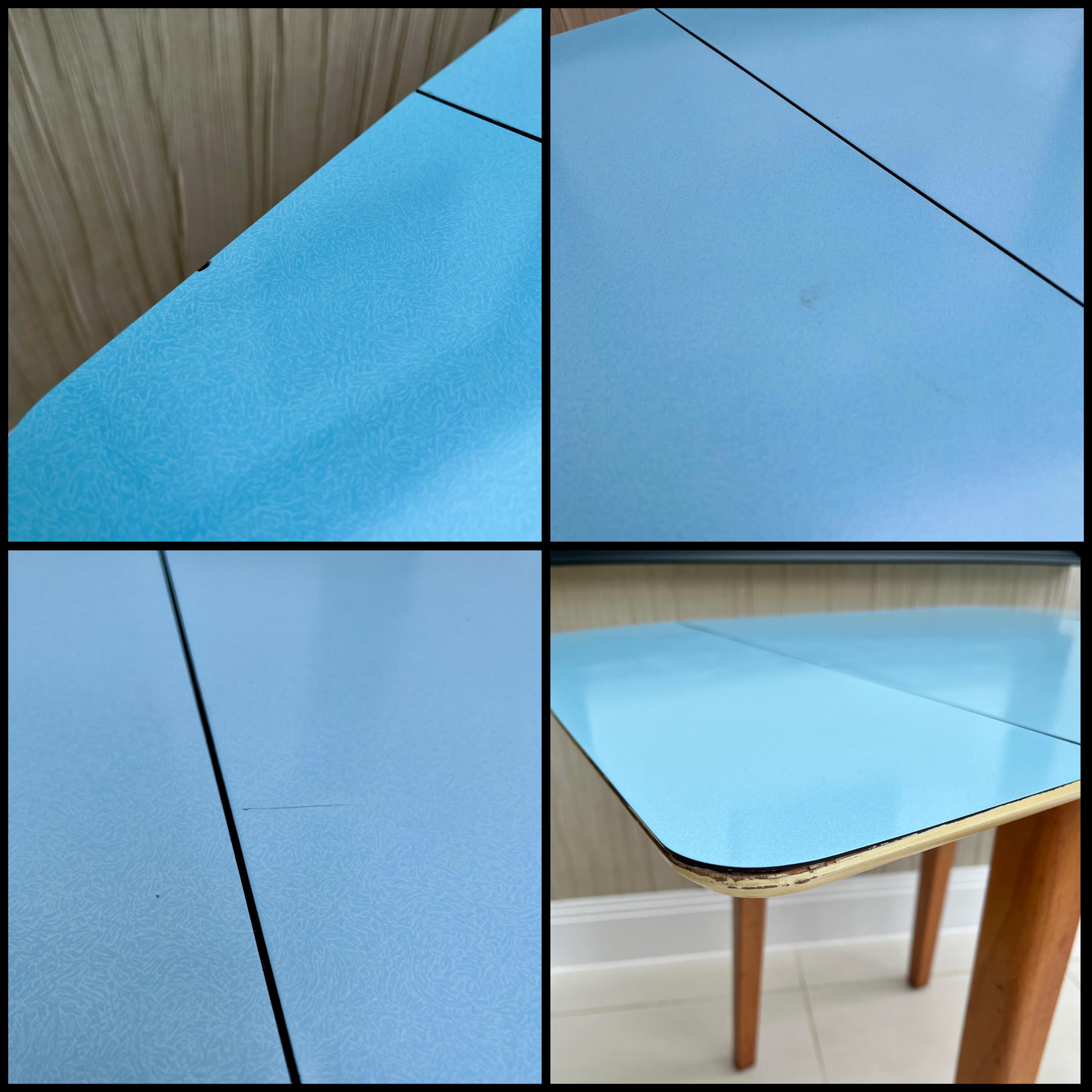 Designed with practicality at its heart, the GUNTON table showcases authentic British utility modernism — simple, well-made and quietly stylish. The original blue Formica surface remains clean and vibrant with no lifting or bubbling, while the spring-loaded drop-leaf mechanism has been lightly oiled and works smoothly, allowing the table to adapt easily between compact and fully open positions. We have also taken some photos of the worst of the damage to the top surface, only a few nibbles, a scratch and a feint mark.