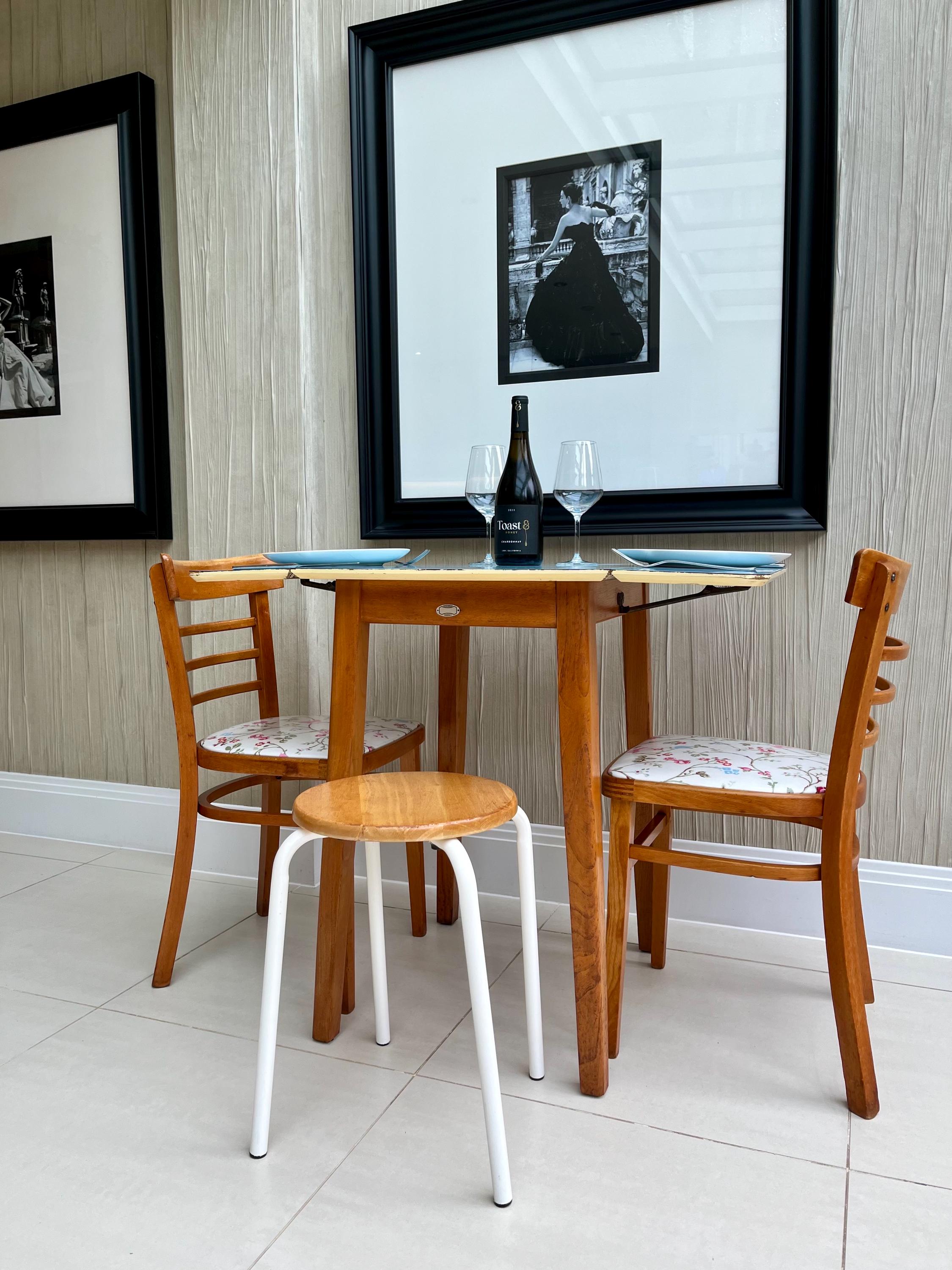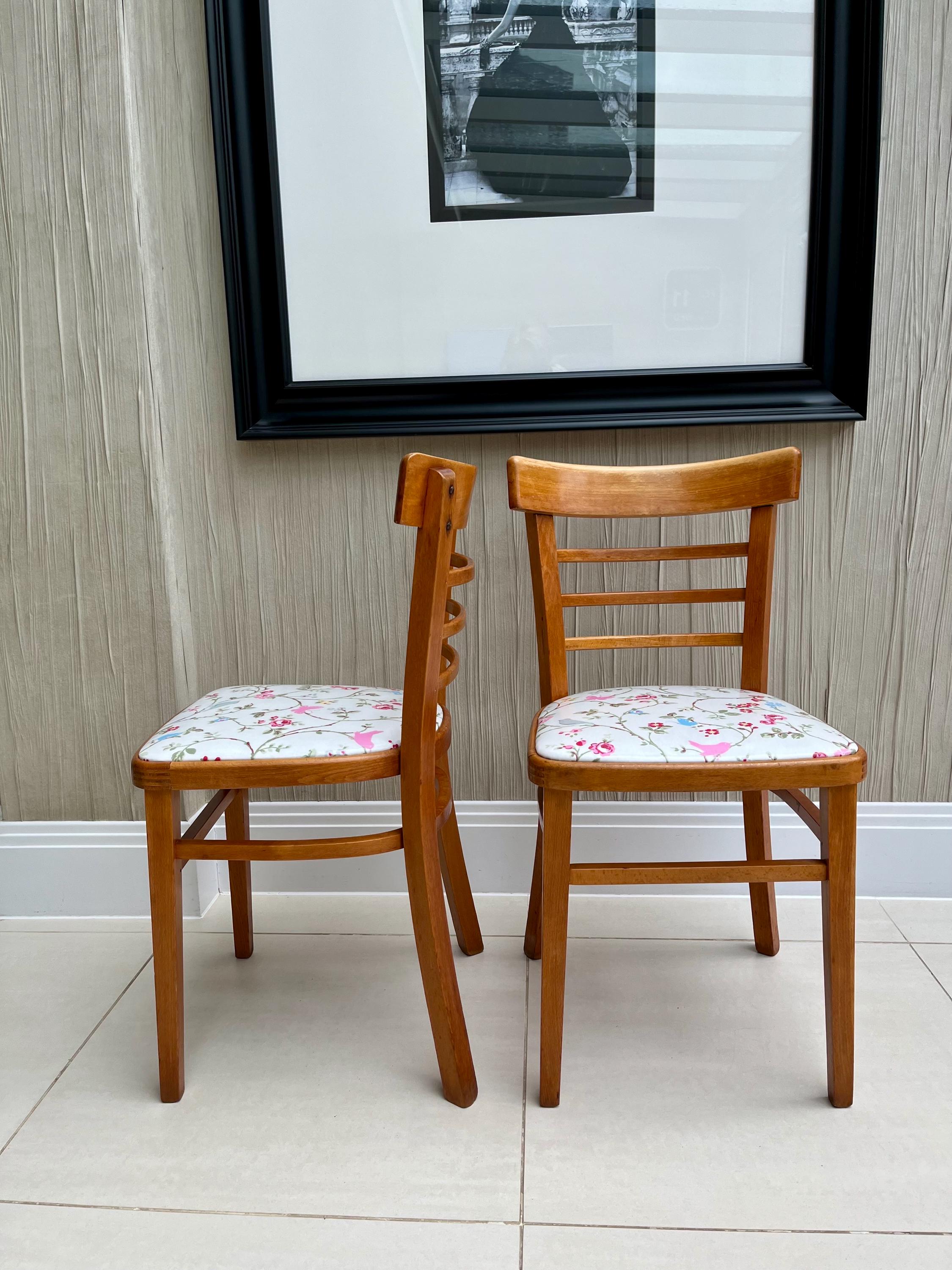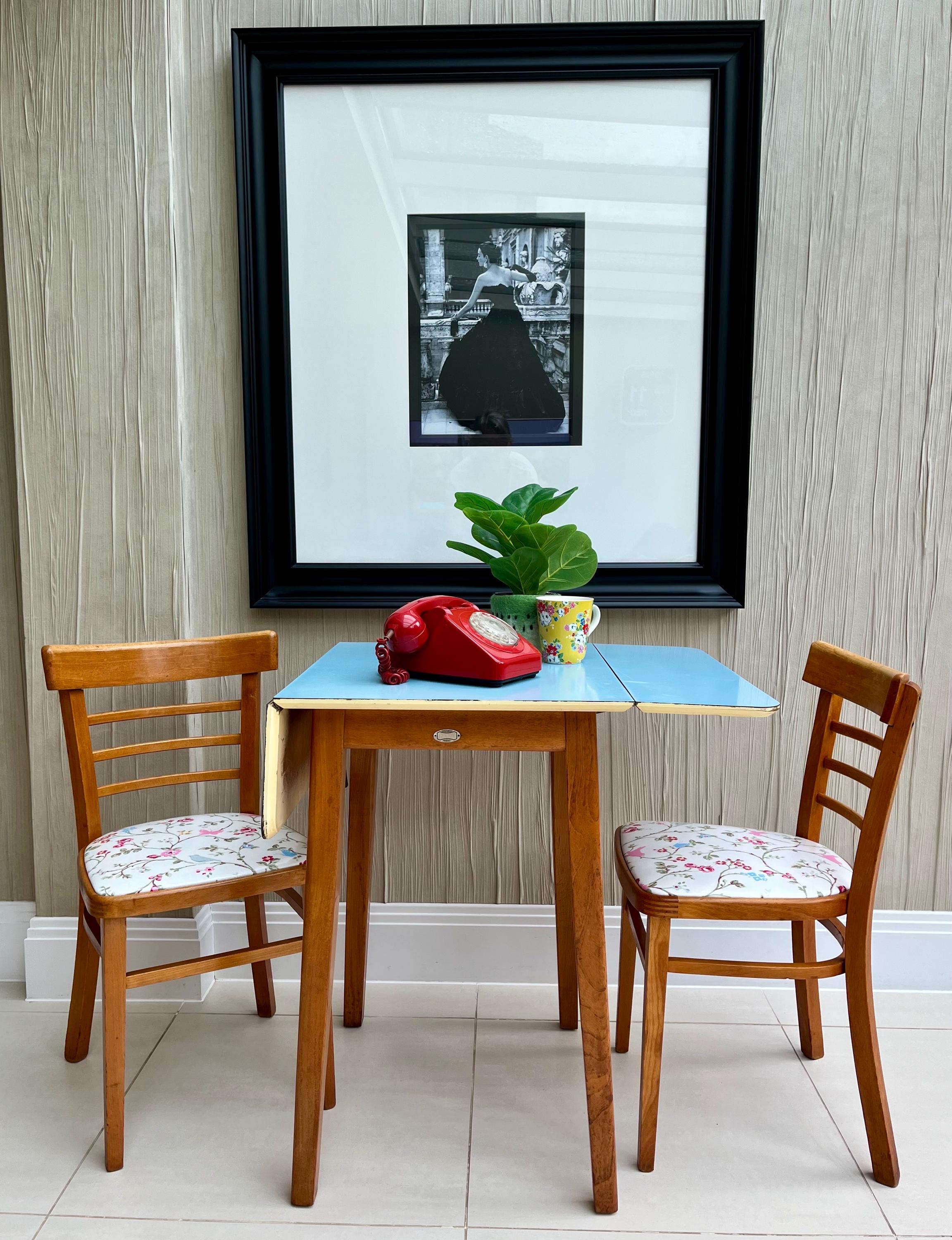Included in the sale is a pair of mid-century ladder-back dining chairs with curved slats and newly upholstered floral seats. Their proportions complement the table perfectly, creating a cohesive and characterful kitchen or breakfast-room set that feels both nostalgic and practical for modern living.