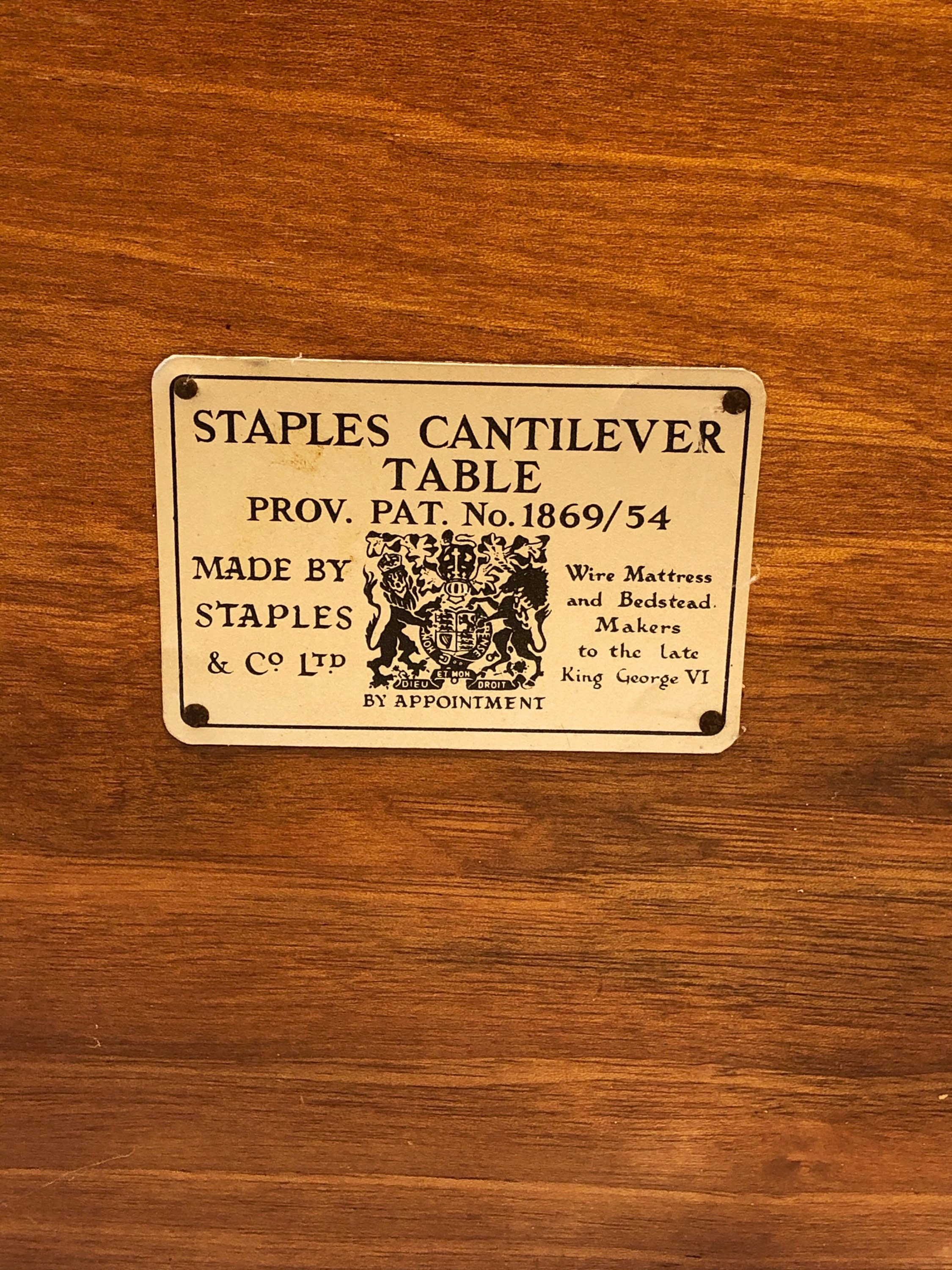 Made from a strong metal cantilever frame with a shaped plywood veneered teak top. Made by Staples & Co Ltd, with the label still intact underneath the table