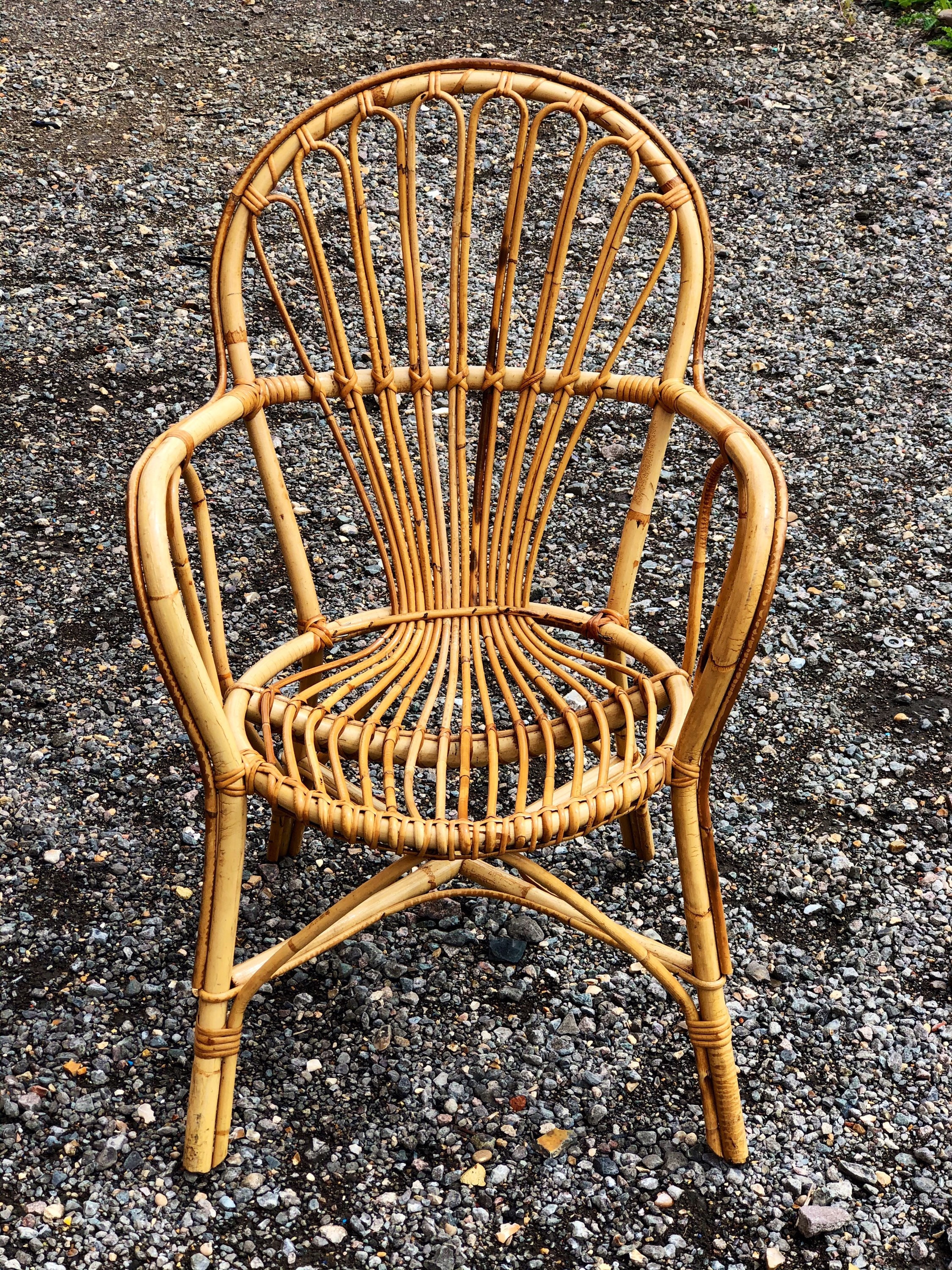 We have sold a few of these chairs in lots of different styles but this one features beautifully intertwined round hoop shapes and a fanned spoke back rest with interesting criss cross bindings; we do have another similar chair that we acquired at the same time, which is slightly taller. The two chairs along with a round coffee table are photographed together.