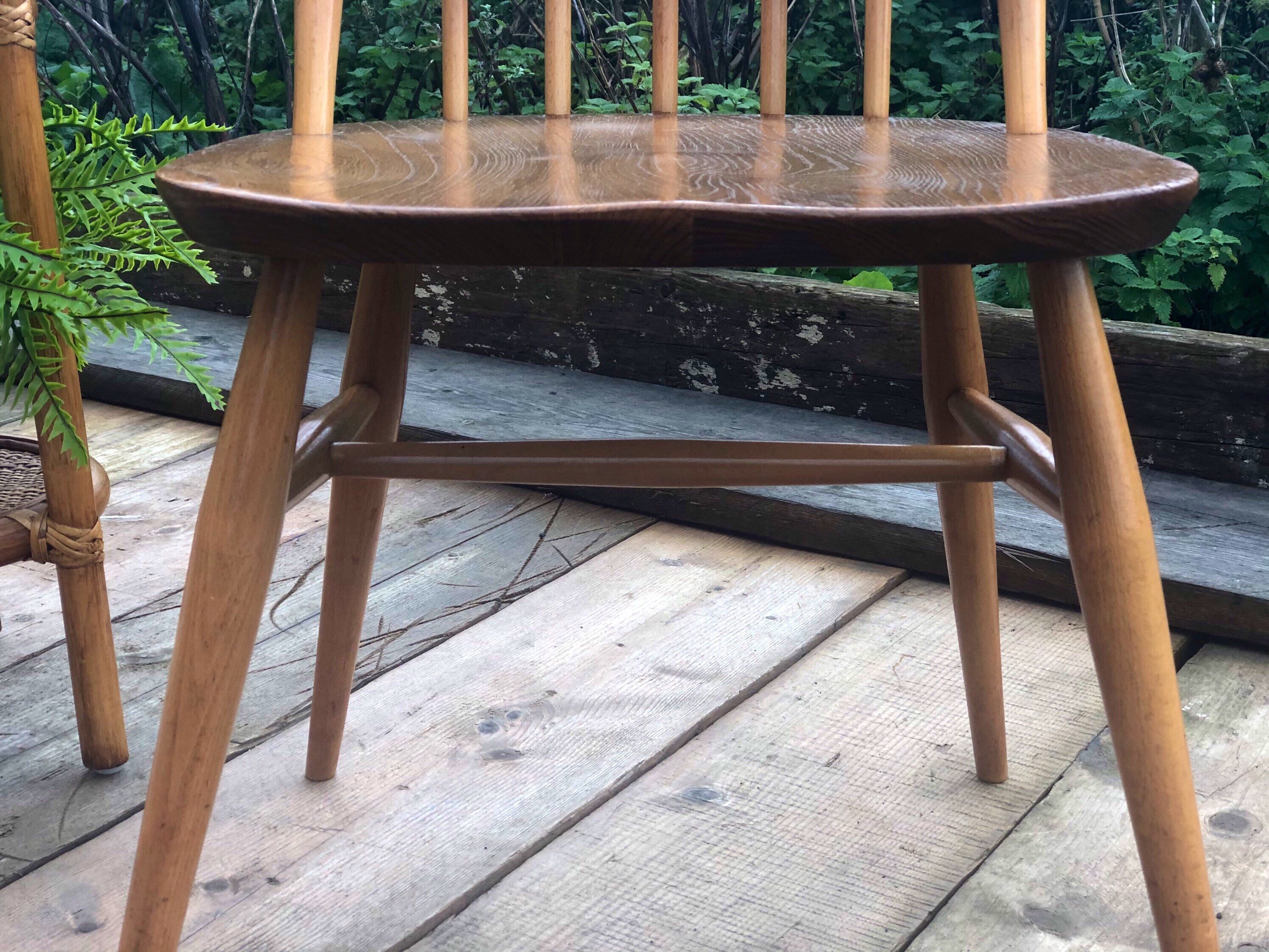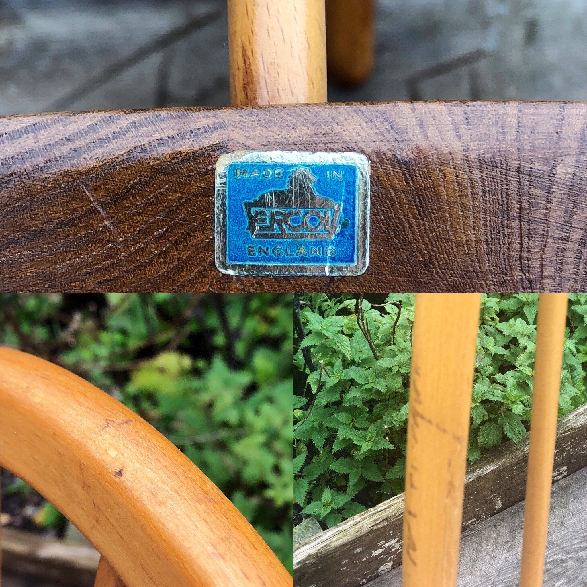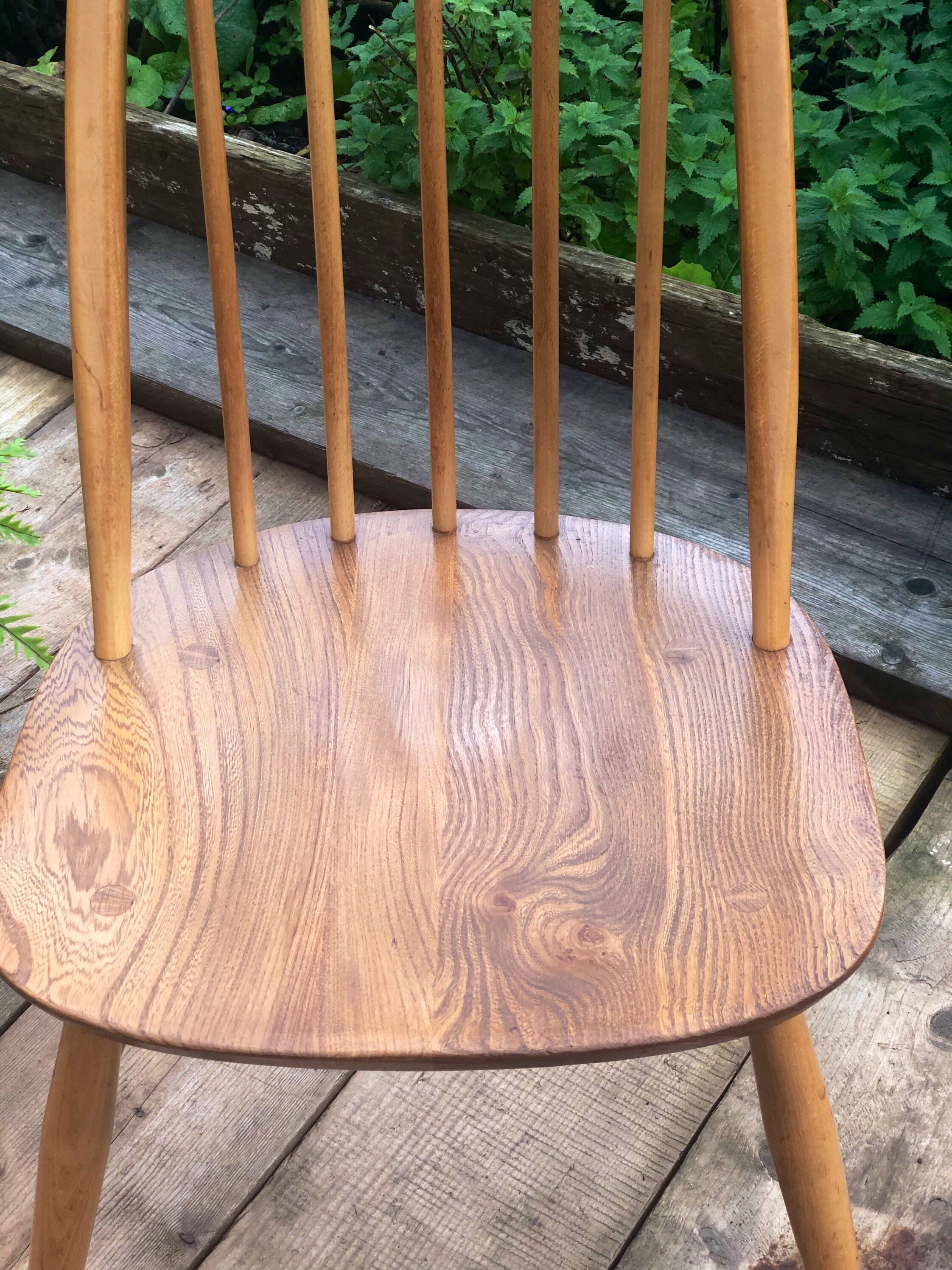 In great condition, these vintage chairs are structurally sound and sturdy, with only minor wear commensurate with age. I have cleaned and degreased the chairs and have then applied a couple of coats of a Danish oil to nourish and help blend the scratches and scuffs acquired over their lifetime; this, I feel, only enhances the natural original patina and colouring. All the chairs retain part of the Ercol blue badge and have the utility stamp underneath; the studs for cushion pads are also still intact under the seat and each chair has its original cushion, all in good vintage condition, no rips or tears and no staining.