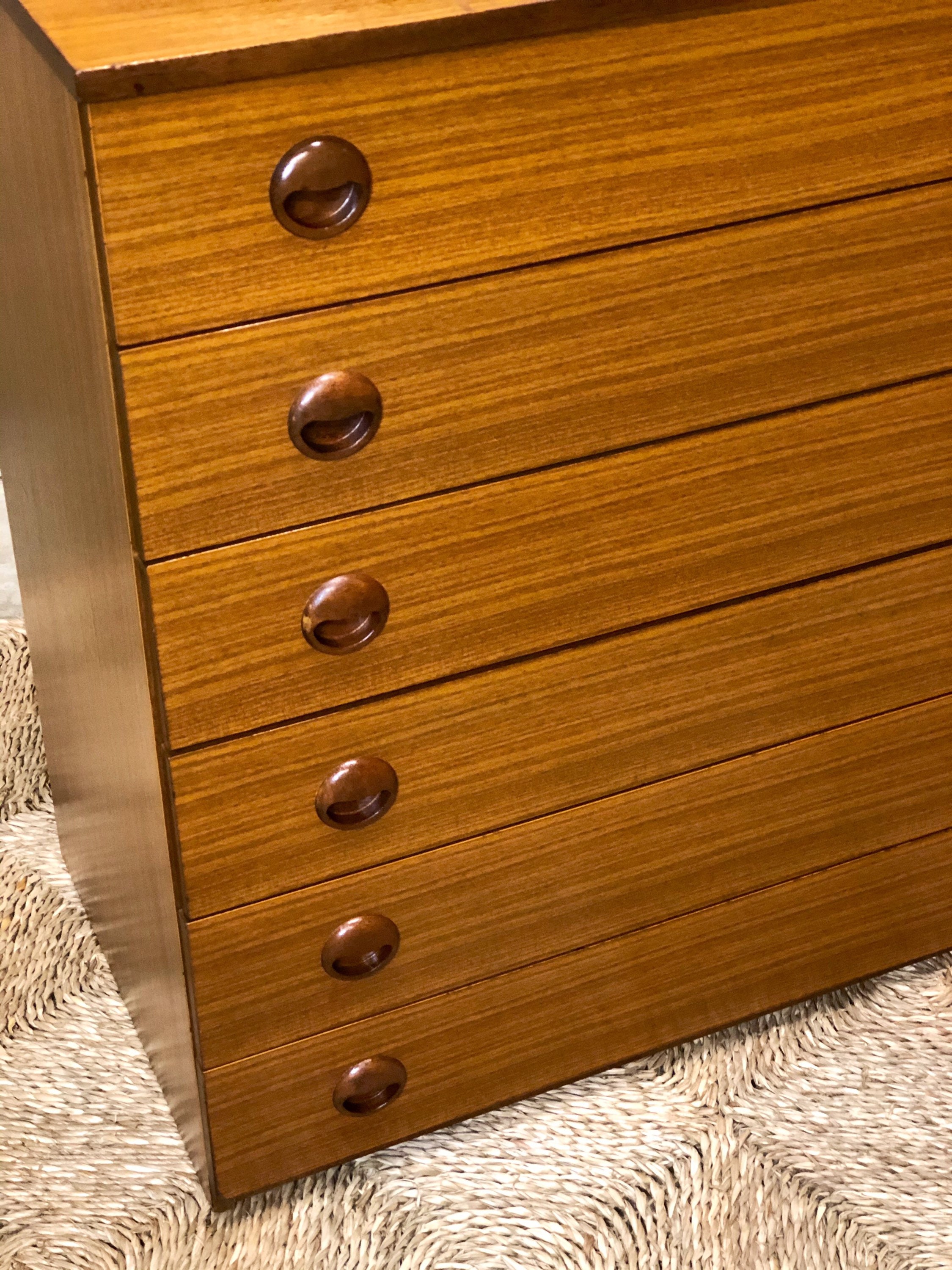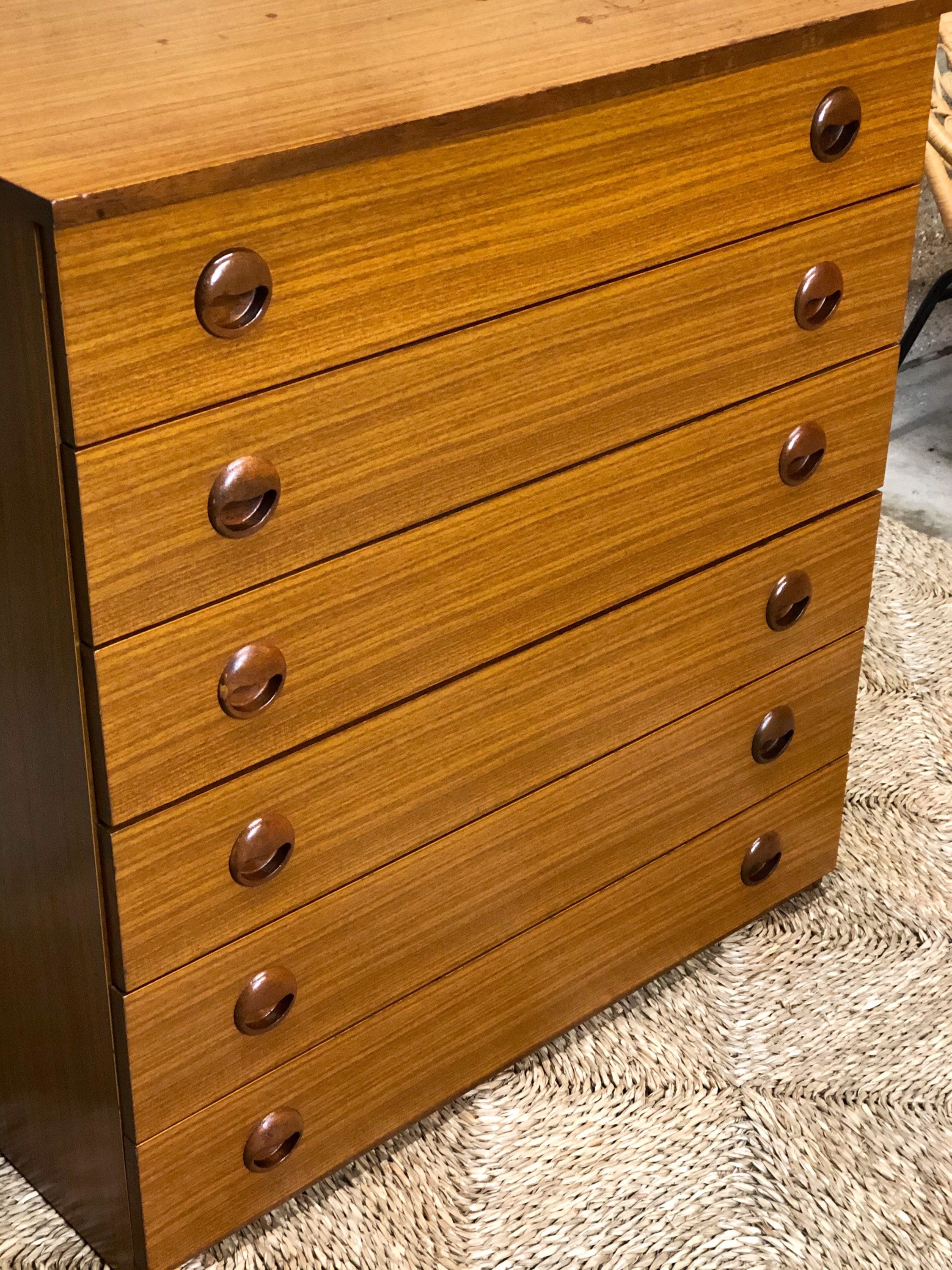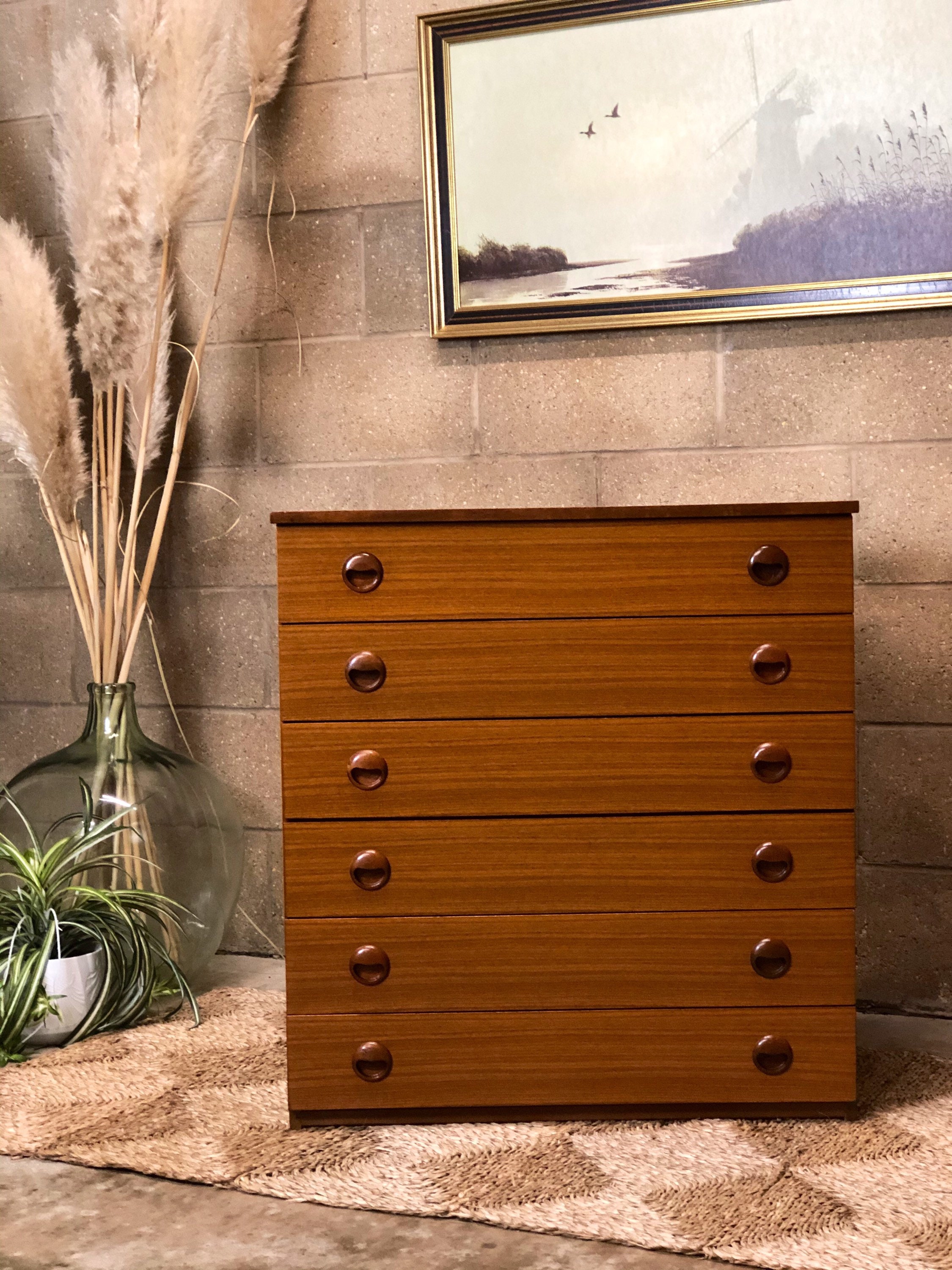 This is a great set of drawers, large but compact and versatile; a warm teak colouring to the veneers and fabulous wooden recessed retro draw handles. With six clean drawers, inside each drawer is the Schreiber stamp and all run smoothly.