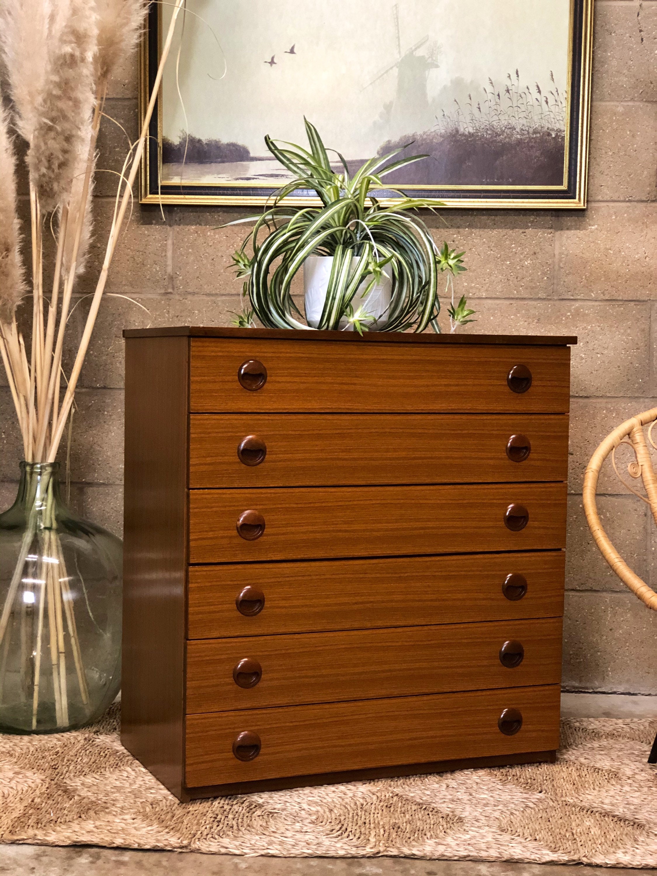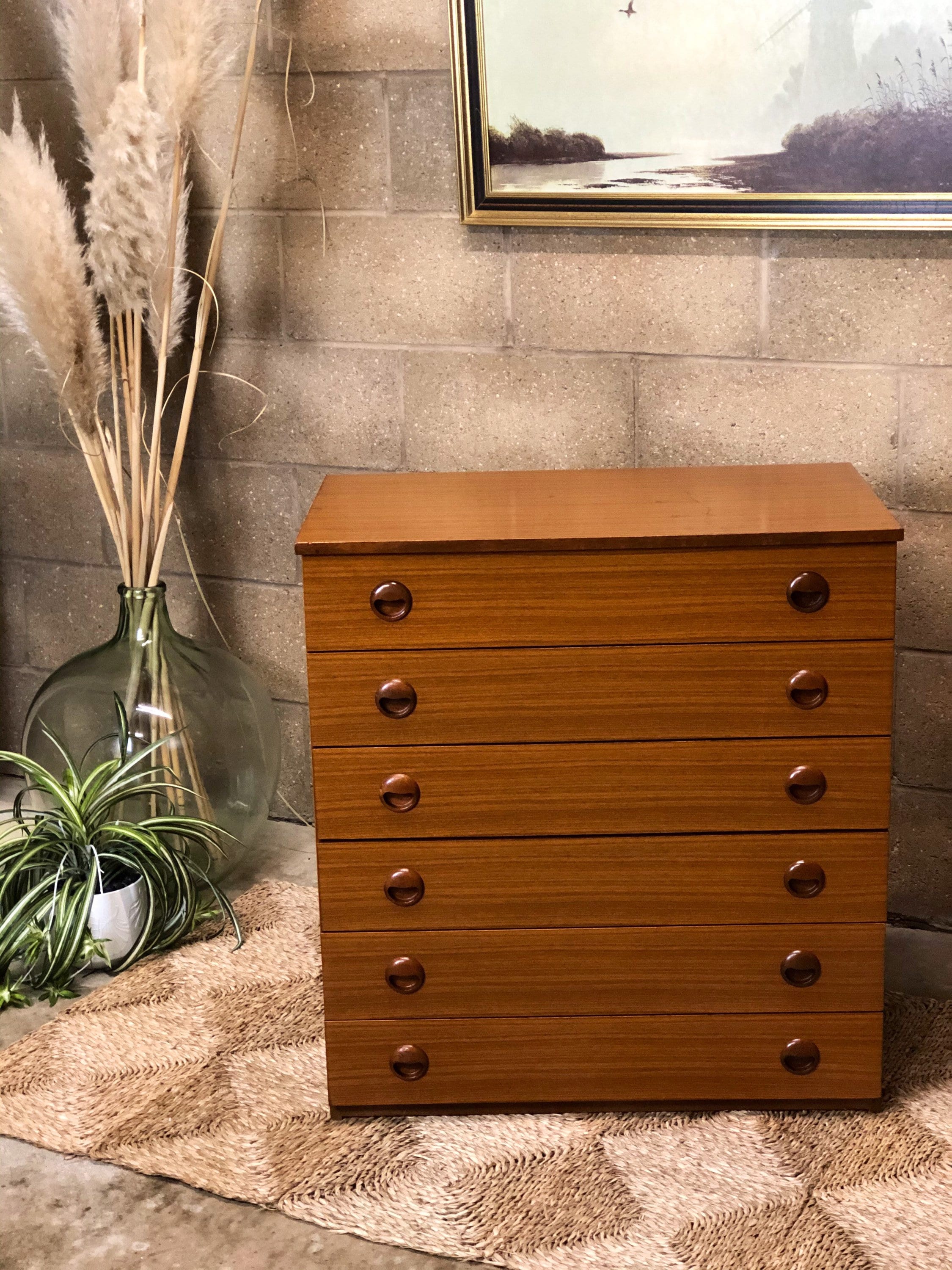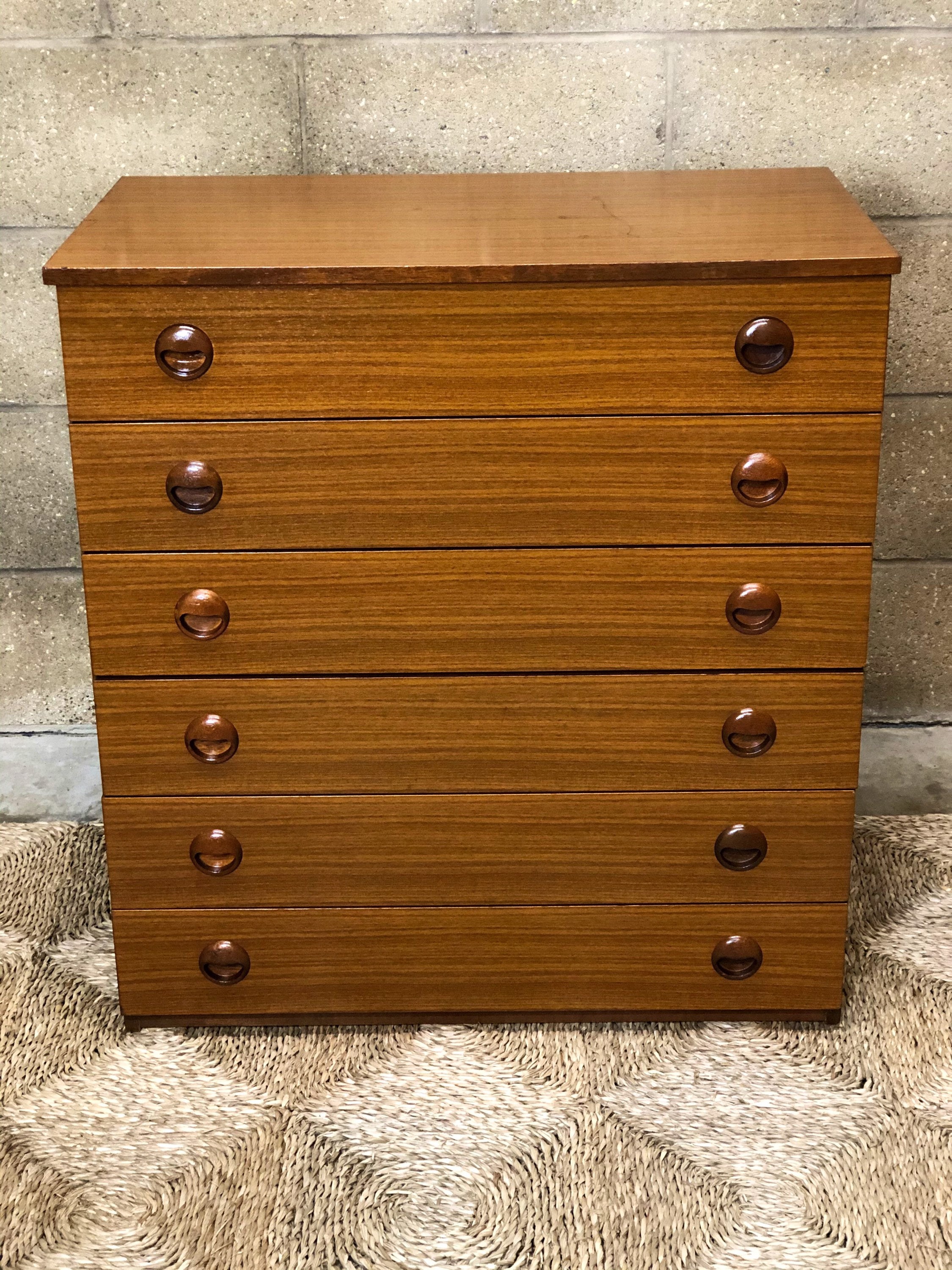 This is a great set of drawers, large but compact and versatile; a warm teak colouring to the veneers and fabulous wooden recessed retro draw handles. With six clean drawers, inside each drawer is the Schreiber stamp and all run smoothly.